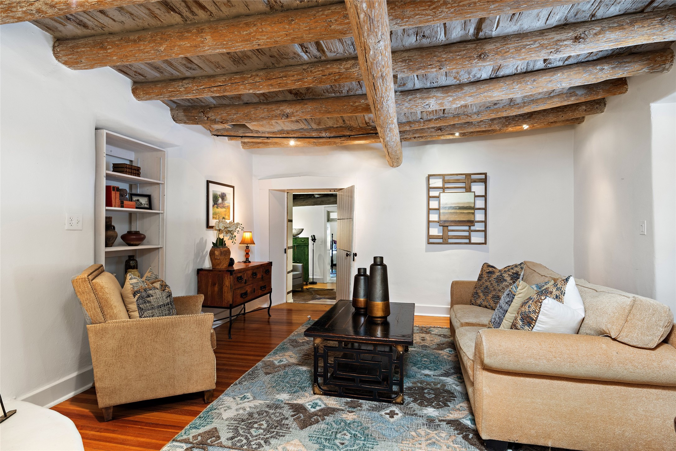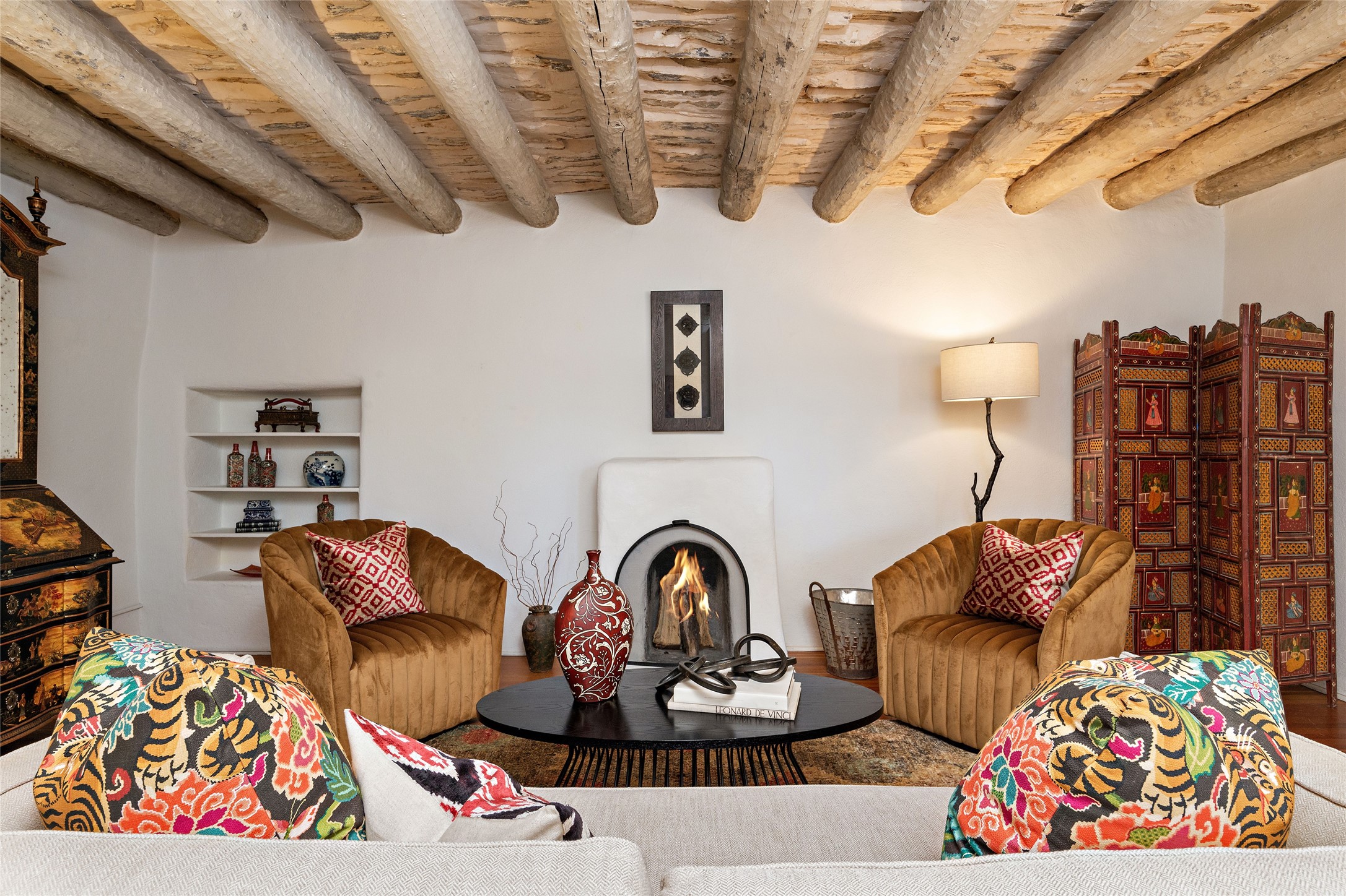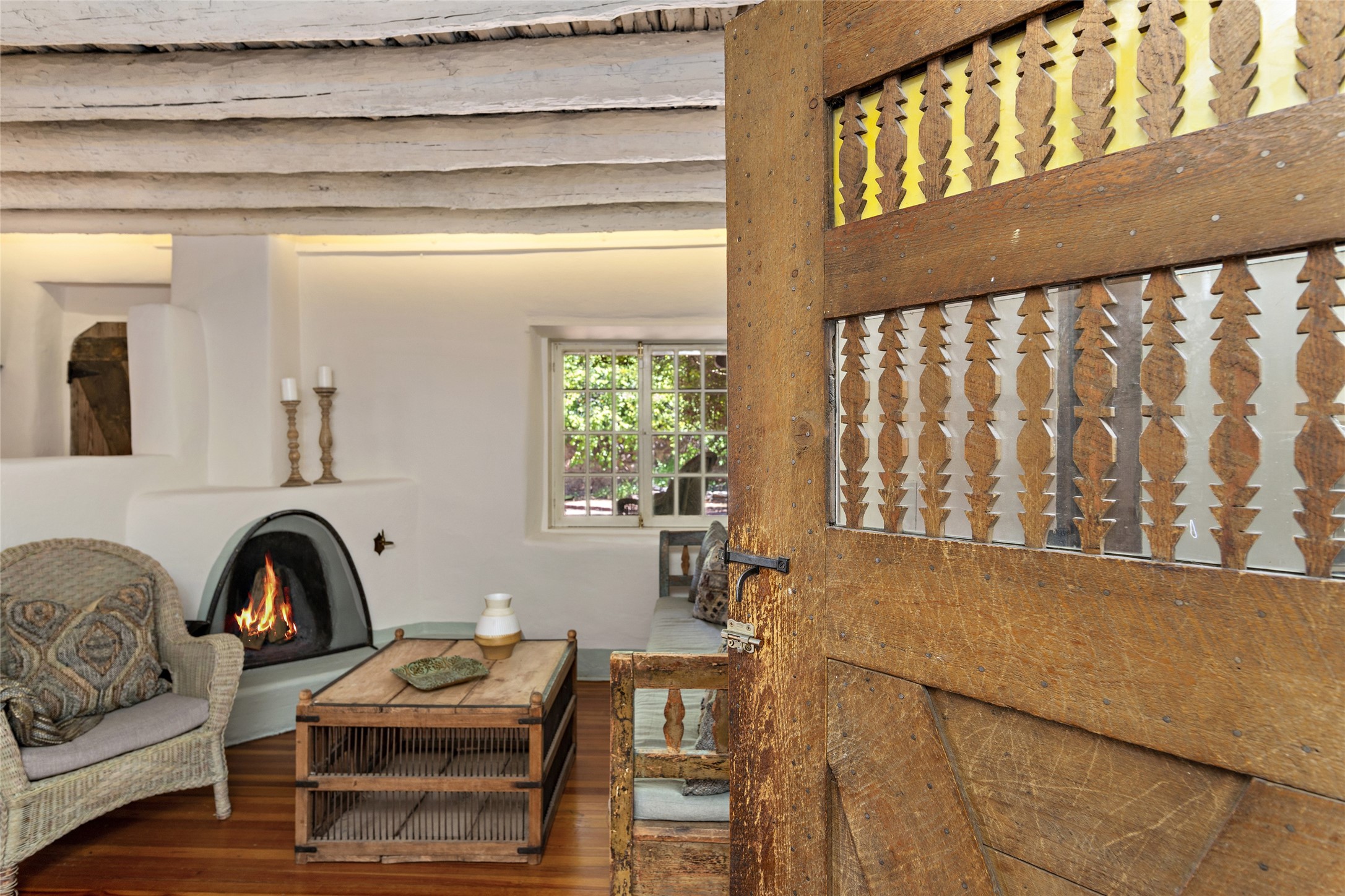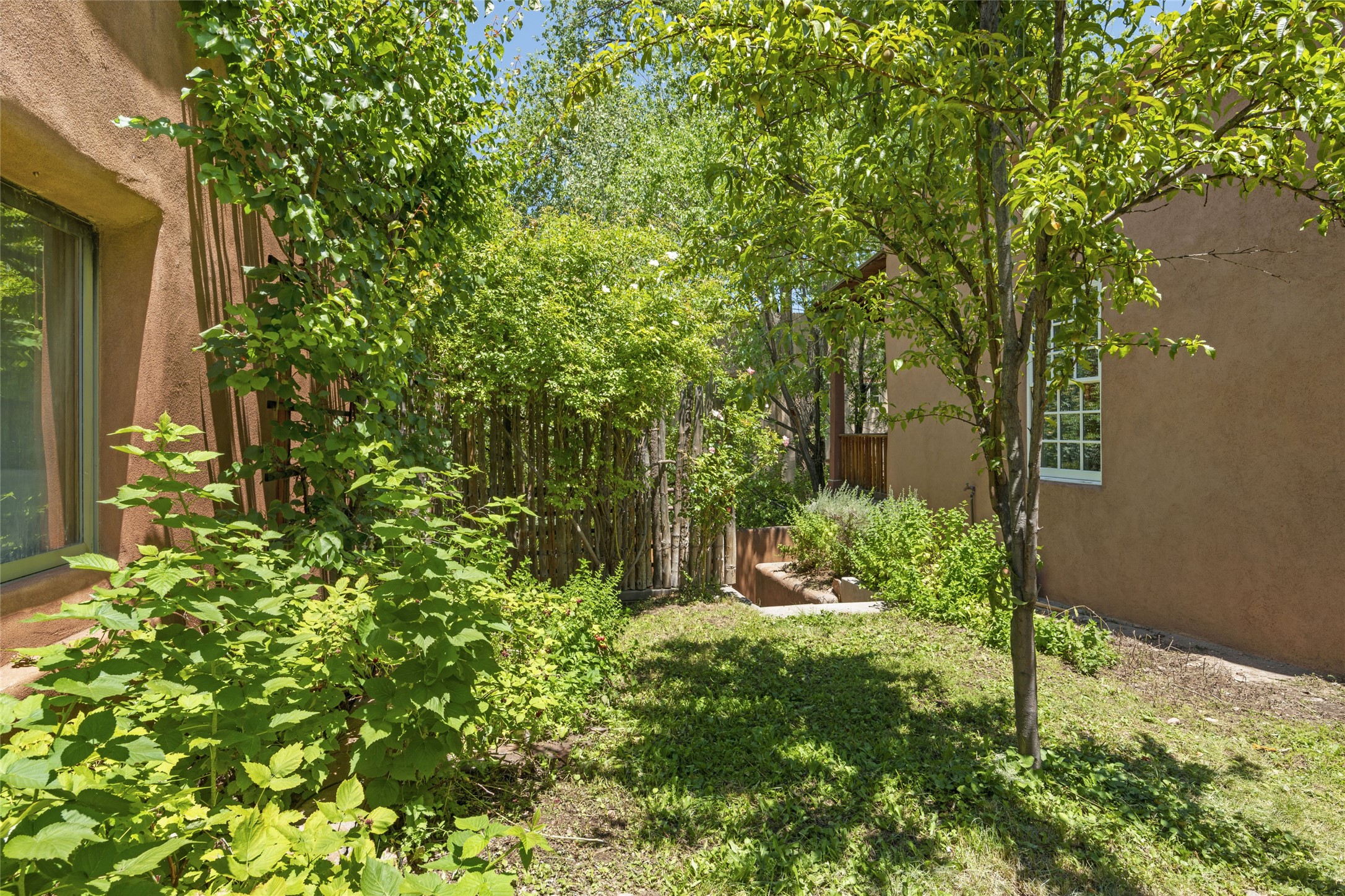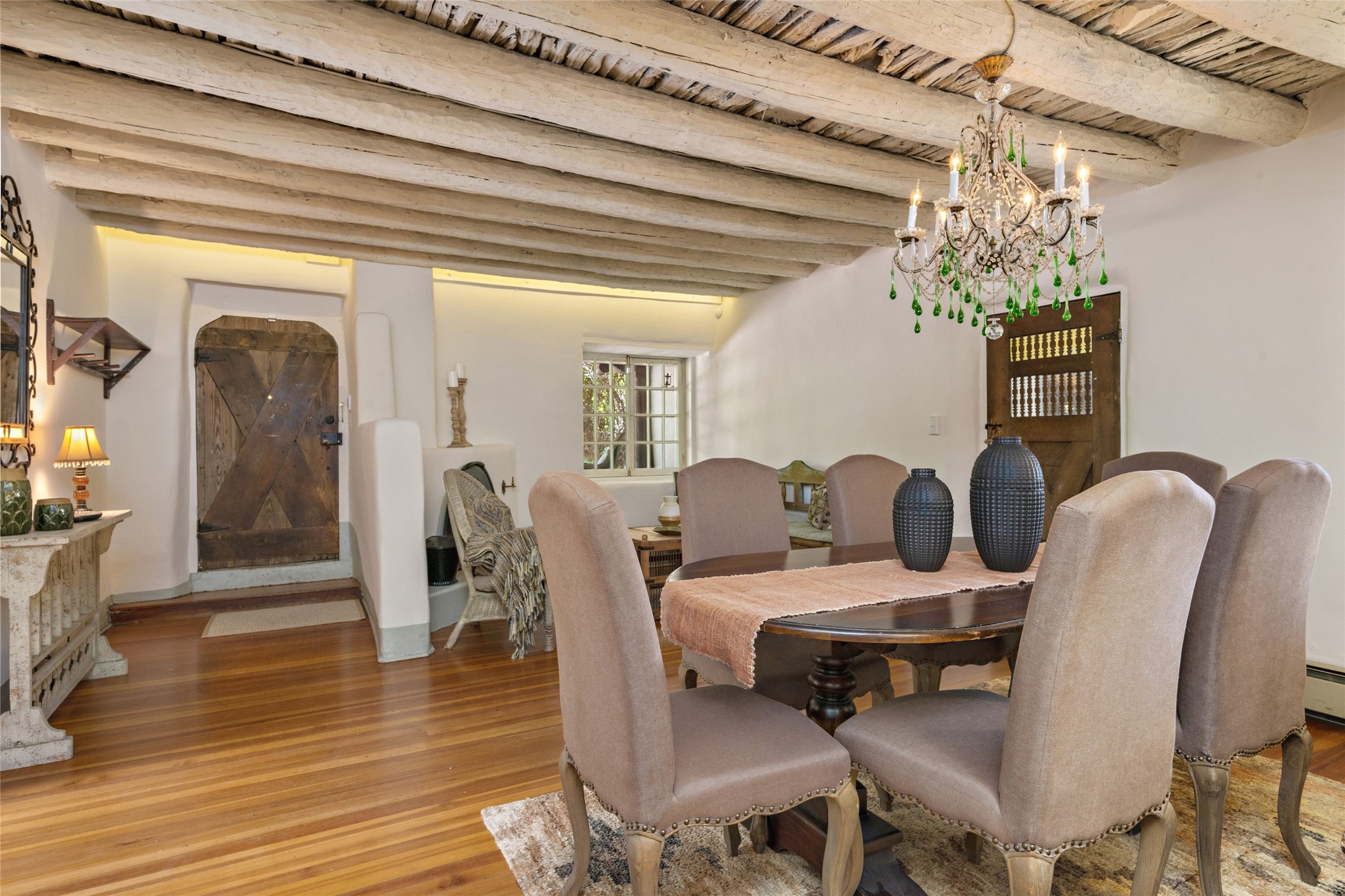The Historically Significant "Boyle House", listed on the National Register of Historic Places as part of the Barrio de Analco historic district, appears on the earliest known map of Santa Fe, the Urrutia Map of 1767. Its charm features three foot thick adobe walls, hand peeled vigas dating to the 1720's covered with split cedar rajas and hand planed territorial style vigas, all carefully preserved over the centuries. The property is a quick walk to the Plaza, Canyon Road, and the Railyard. A private well provides irrigation for lush outdoor landscaping and patio areas, including fruit trees. The main house features two portals, three bedrooms, each with en-suite bathrooms, a spacious living room, an updated "farm kitchen" with new appliances, laundry room, and a garage. Included is an attached 2-bedroom, 1 bath apartment with garage and an additional two story, 1 bedroom, 1 bath studio. BCD zoning and separate metering of all three units allows for greater flexibility. The current owners were given an award for historic stewardship by the Historic Santa Fe Foundation in 2019. New research suggests the house belonged to Bernadino Sena, a renowned blacksmith, landowner, and fundraiser for San Miguel church in the 1700's. Based upon archeological findings, some portions of the house may possibly date before the Pueblo Revolt of 1680. For the historical purist this is a unique opportunity to become a steward of an early part of Santa Fe's history, and to sustain and preserve this historic house now and into the future..