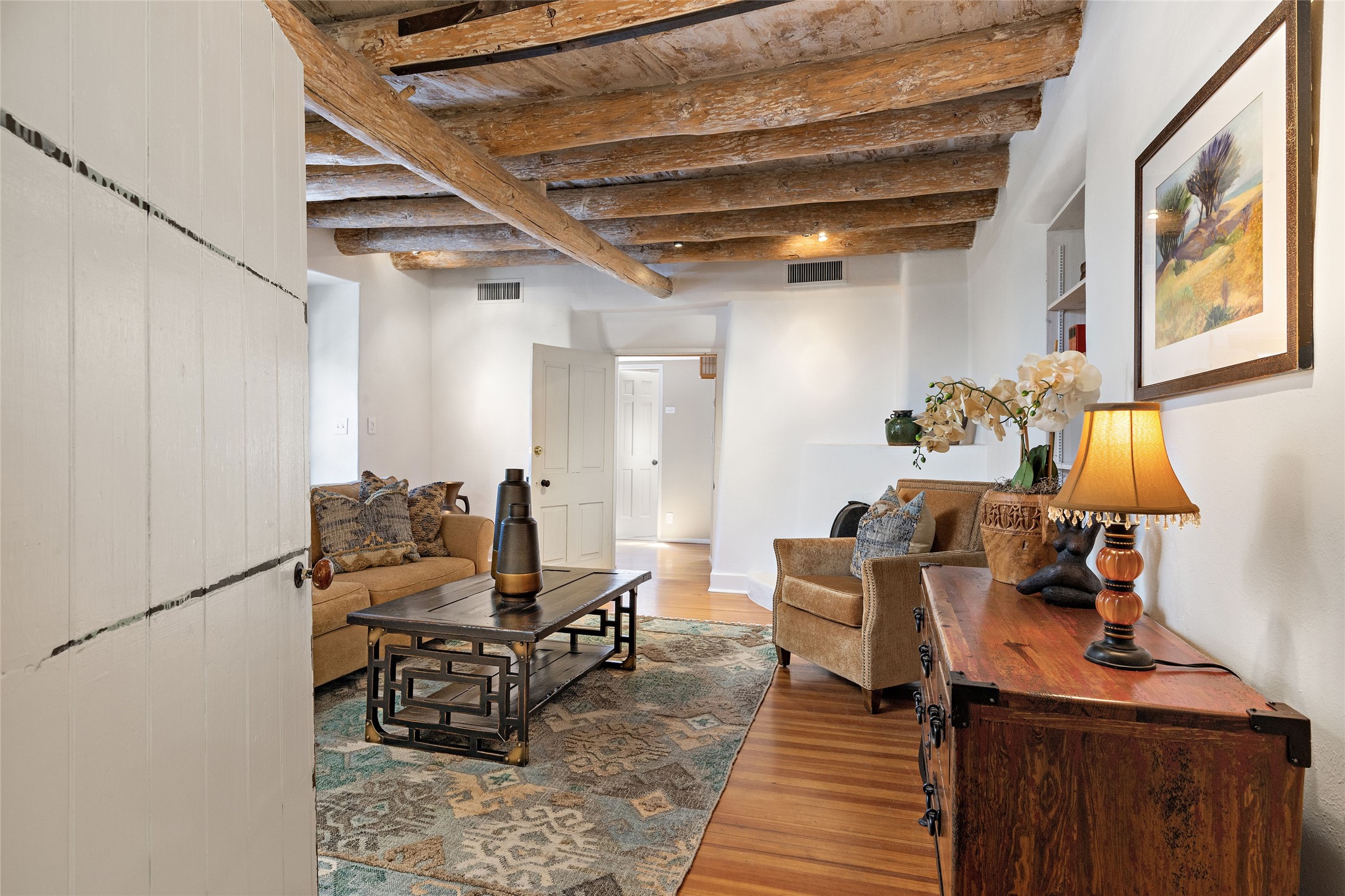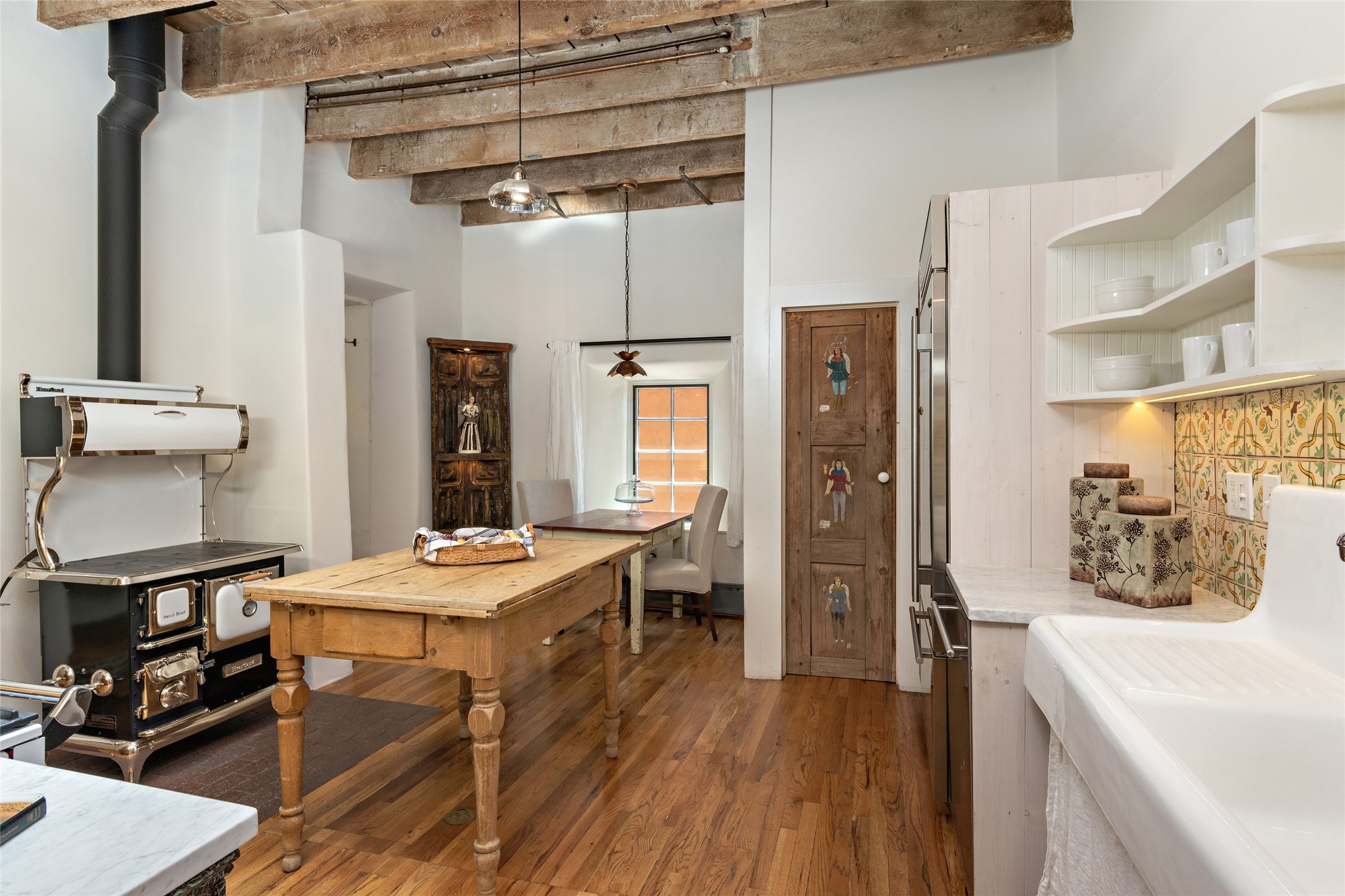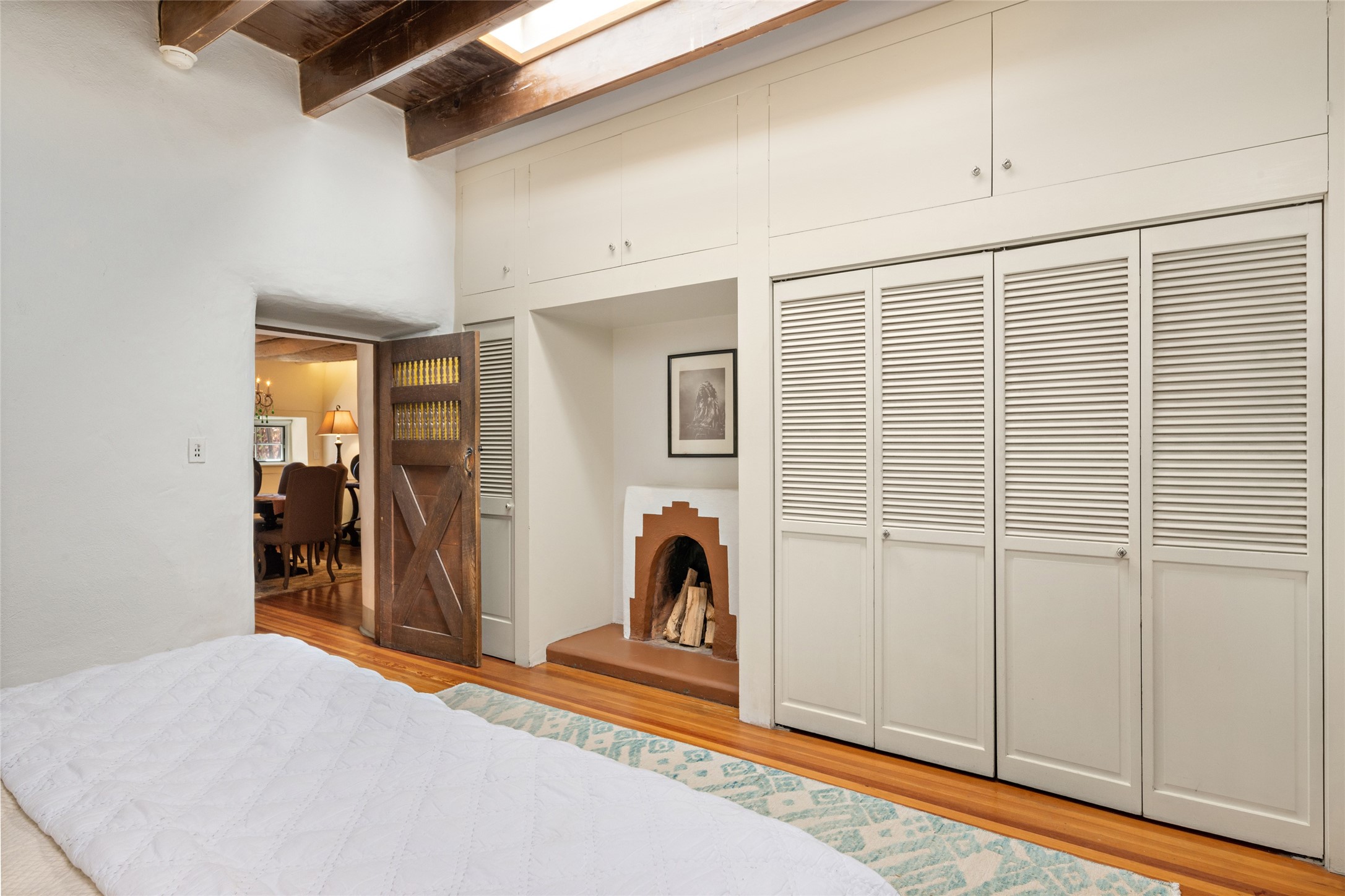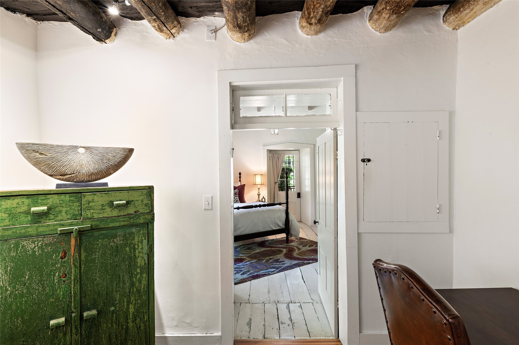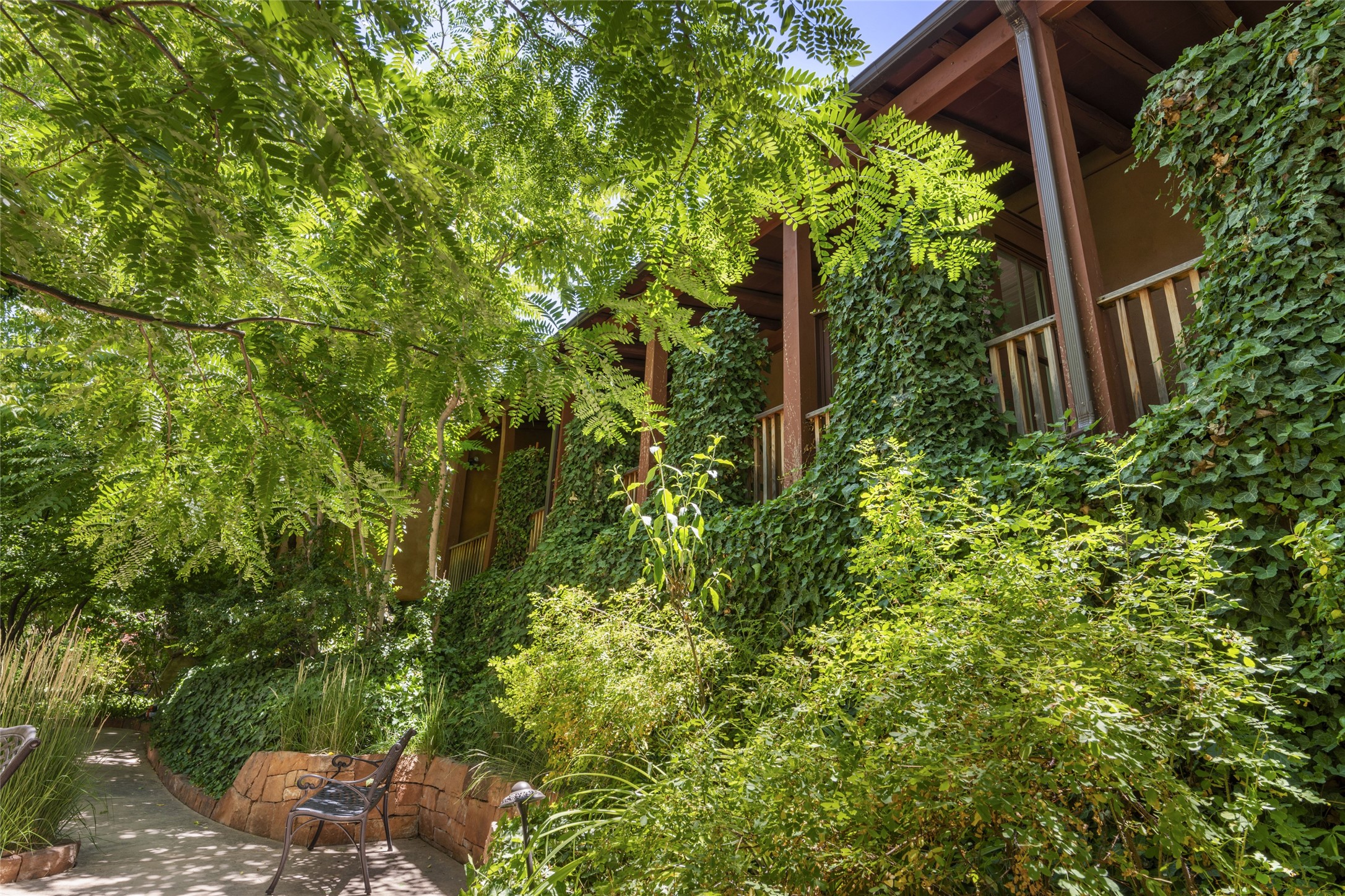 The Historically Significant "Boyle House", listed on the National Register of Historic Places as part of the Barrio de Analco historic district, appears on the earliest known map of Santa Fe, the Urrutia Map of 1767. Its charm features three foot thick adobe walls, hand peeled vigas dating to the 1720's covered with split cedar rajas and hand planed territorial style vigas, all carefully preserved over the centuries. The property is a quick walk to the Plaza, Canyon Road, and the Railyard. A private well provides irrigation for lush outdoor landscaping and patio areas, including fruit trees. The main house features two portals, three bedrooms, each with en-suite bathrooms, a spacious living room, an updated "farm kitchen" with new appliances, laundry room, and a garage. Included is an attached 2-bedroom, 1 bath apartment with garage and an additional two story, 1 bedroom, 1 bath studio. BCD zoning and separate metering of all three units allows for greater flexibility. The current owners were given an award for historic stewardship by the Historic Santa Fe Foundation in 2019. New research suggests the house belonged to Bernadino Sena, a renowned blacksmith, landowner, and fundraiser for San Miguel church in the 1700's. Based upon archeological findings, some portions of the house may possibly date before the Pueblo Revolt of 1680. For the historical purist this is a unique opportunity to become a steward of an early part of Santa Fe's history, and to sustain and preserve this historic house now and into the future..