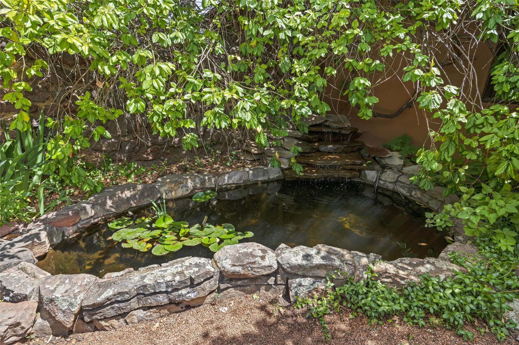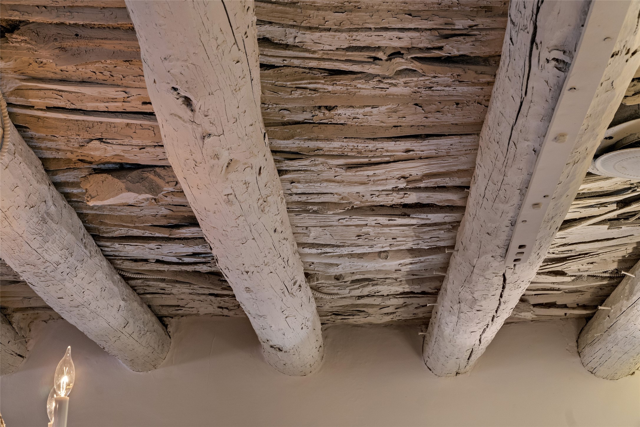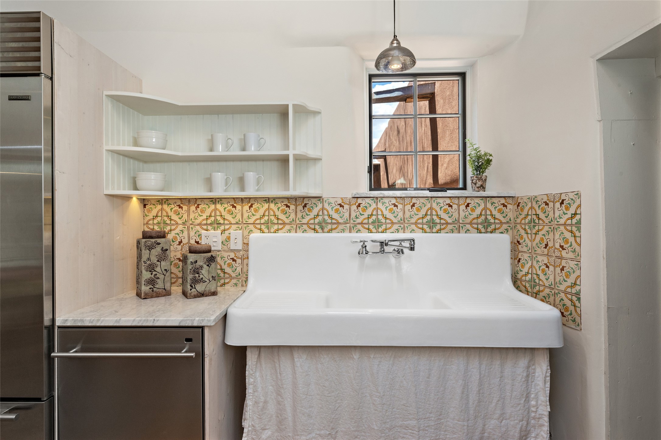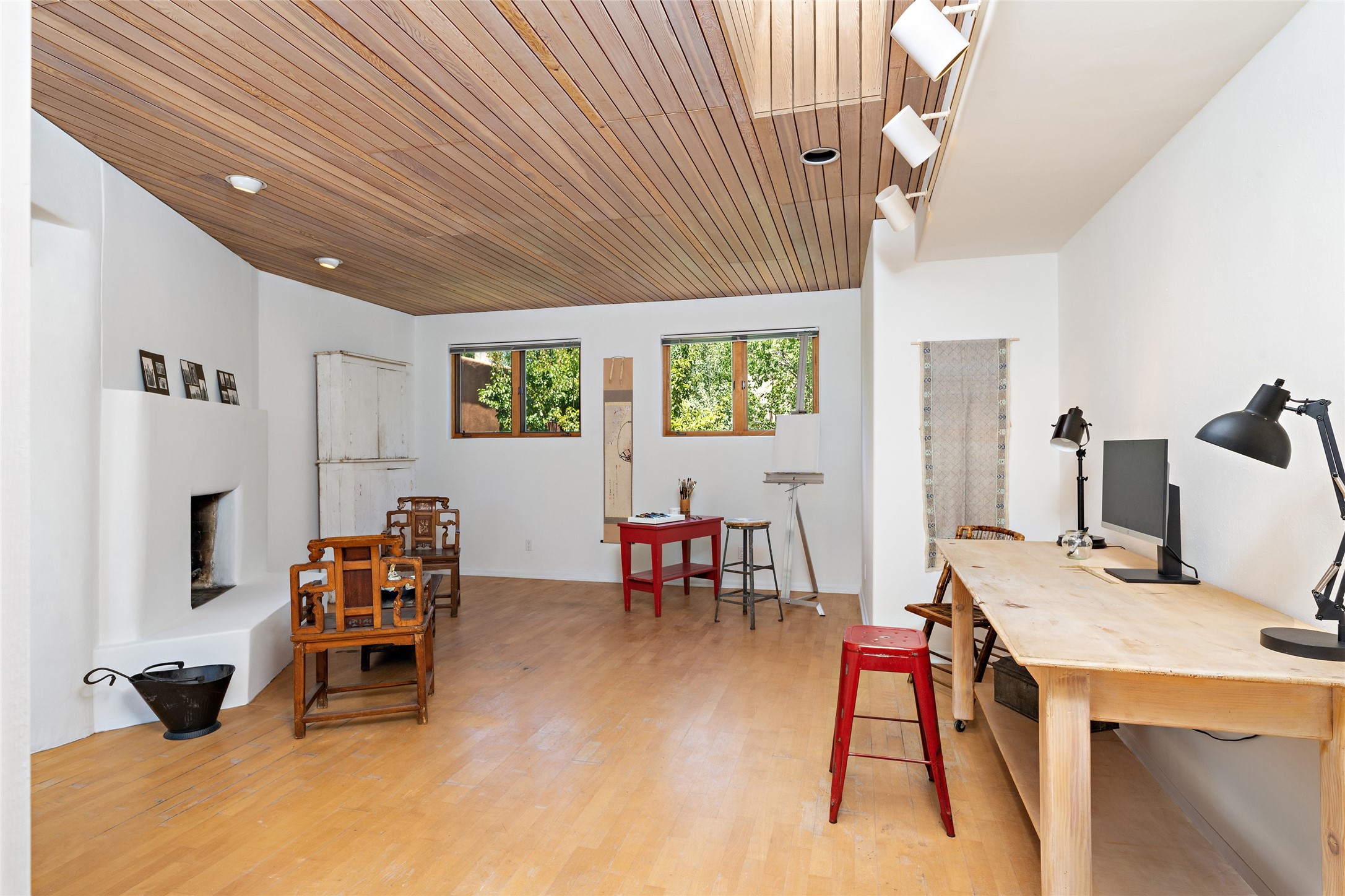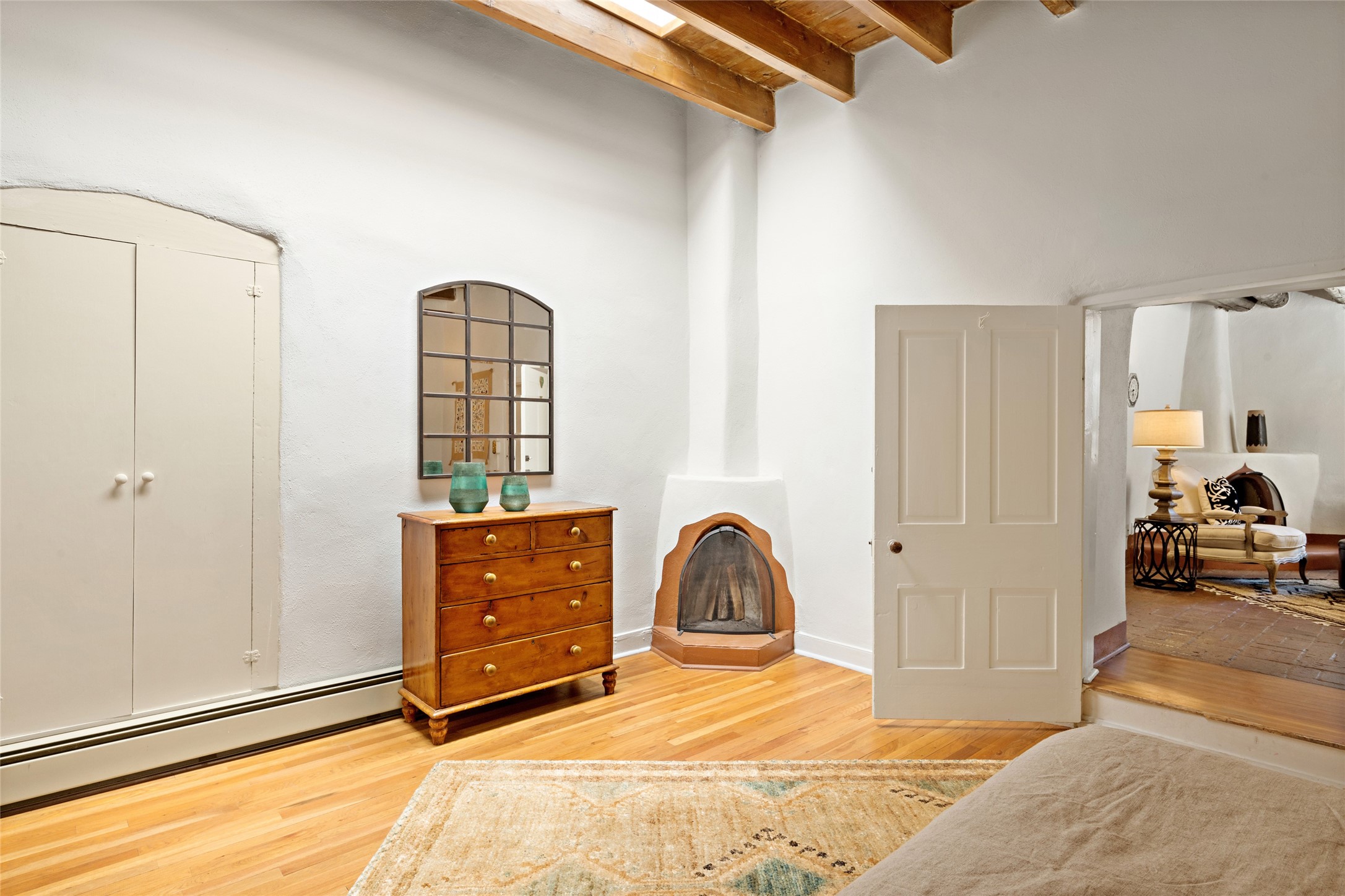 The Historically Significant "Boyle House", listed on the National Register of Historic Places as part of the Barrio de Analco historic district, appears on the earliest known map of Santa Fe, the Urrutia Map of 1767. Its charm features three foot thick adobe walls, hand peeled vigas dating to the 1720's covered with split cedar rajas and hand planed territorial style vigas, all carefully preserved over the centuries. The property is a quick walk to the Plaza, Canyon Road, and the Railyard. A private well provides irrigation for lush outdoor landscaping and patio areas, including fruit trees. The main house features two portals, three bedrooms, each with en-suite bathrooms, a spacious living room, an updated "farm kitchen" with new appliances, laundry room, and a garage. Included is an attached 2-bedroom, 1 bath apartment with garage and an additional two story, 1 bedroom, 1 bath studio. BCD zoning and separate metering of all three units allows for greater flexibility. The current owners were given an award for historic stewardship by the Historic Santa Fe Foundation in 2019. New research suggests the house belonged to Bernadino Sena, a renowned blacksmith, landowner, and fundraiser for San Miguel church in the 1700's. Based upon archeological findings, some portions of the house may possibly date before the Pueblo Revolt of 1680. For the historical purist this is a unique opportunity to become a steward of an early part of Santa Fe's history, and to sustain and preserve this historic house now and into the future..