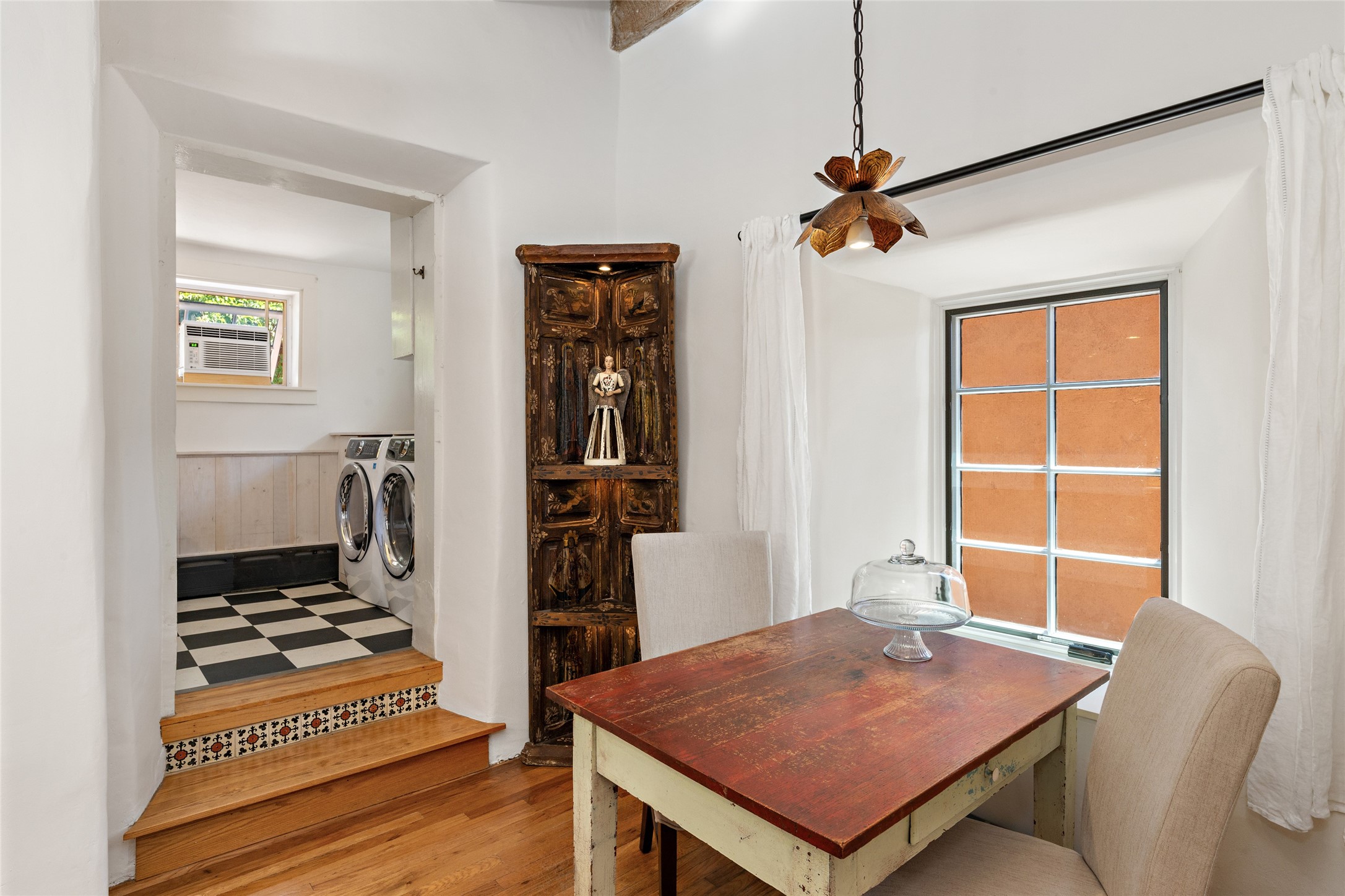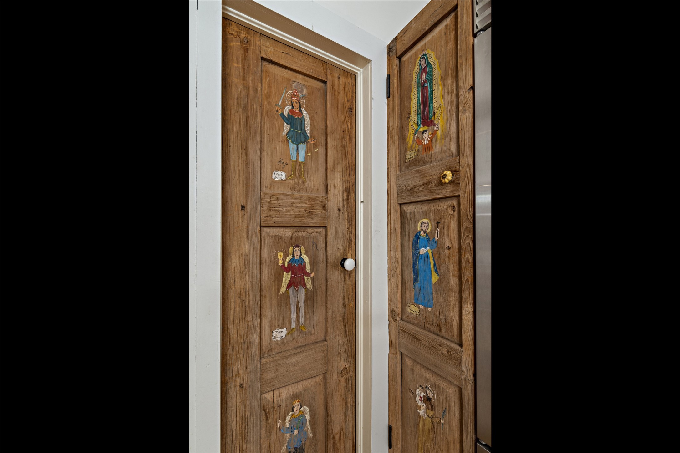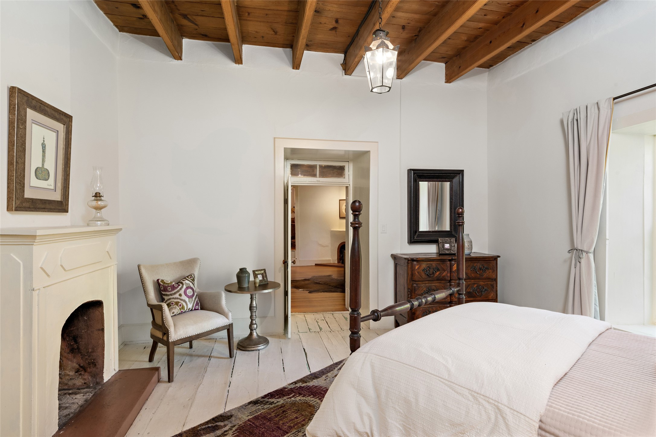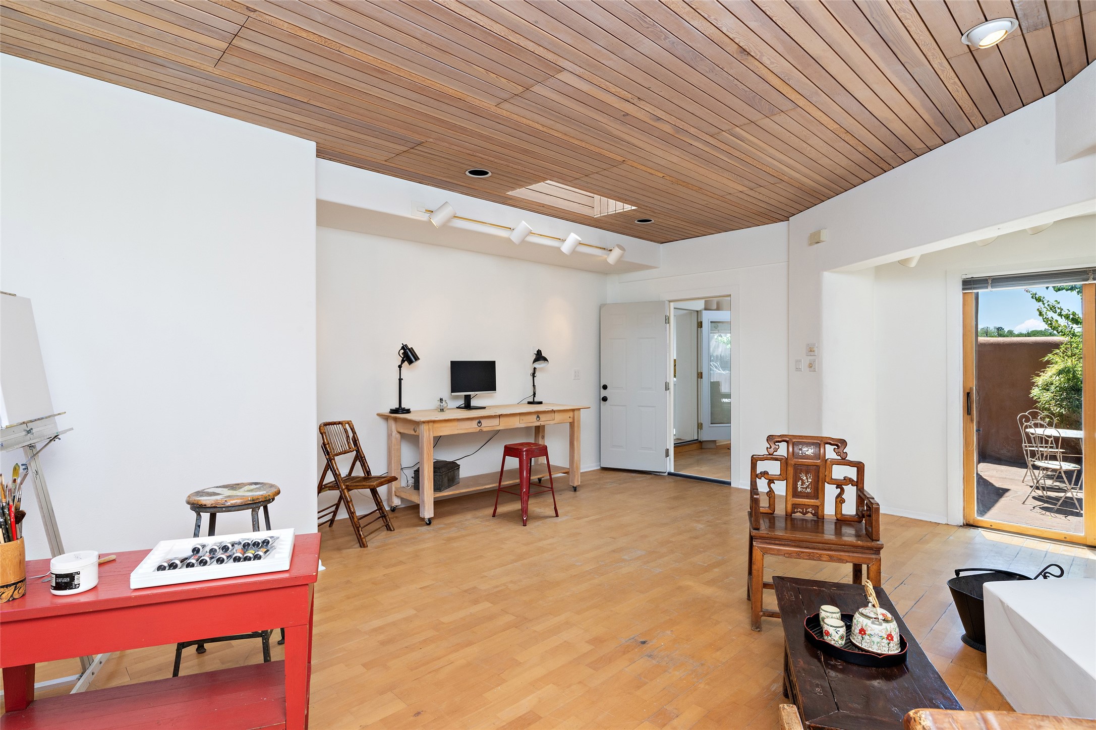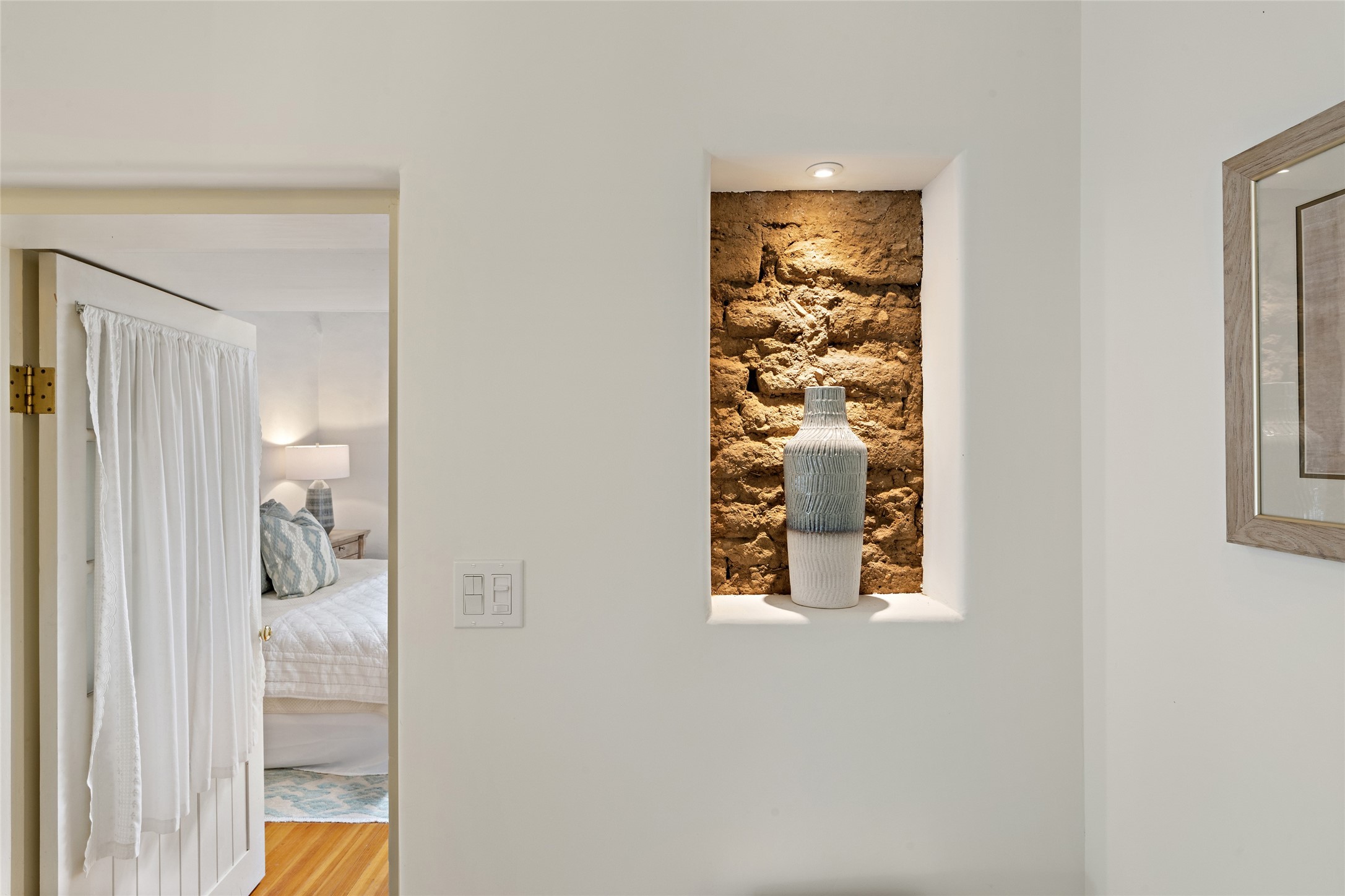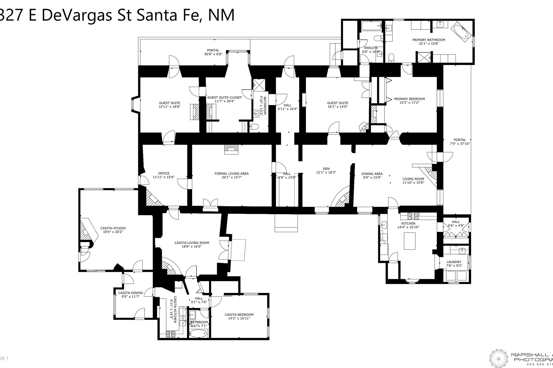 The Historically Significant "Boyle House", listed on the National Register of Historic Places as part of the Barrio de Analco historic district, appears on the earliest known map of Santa Fe, the Urrutia Map of 1767. Its charm features three foot thick adobe walls, hand peeled vigas dating to the 1720's covered with split cedar rajas and hand planed territorial style vigas, all carefully preserved over the centuries. The property is a quick walk to the Plaza, Canyon Road, and the Railyard. A private well provides irrigation for lush outdoor landscaping and patio areas, including fruit trees. The main house features two portals, three bedrooms, each with en-suite bathrooms, a spacious living room, an updated "farm kitchen" with new appliances, laundry room, and a garage. Included is an attached 2-bedroom, 1 bath apartment with garage and an additional two story, 1 bedroom, 1 bath studio. BCD zoning and separate metering of all three units allows for greater flexibility. The current owners were given an award for historic stewardship by the Historic Santa Fe Foundation in 2019. New research suggests the house belonged to Bernadino Sena, a renowned blacksmith, landowner, and fundraiser for San Miguel church in the 1700's. Based upon archeological findings, some portions of the house may possibly date before the Pueblo Revolt of 1680. For the historical purist this is a unique opportunity to become a steward of an early part of Santa Fe's history, and to sustain and preserve this historic house now and into the future..
