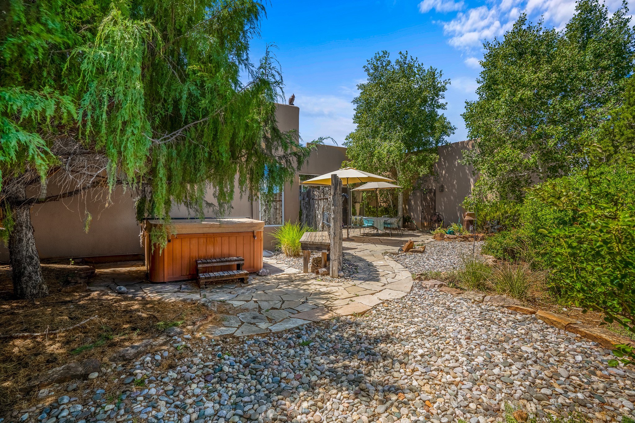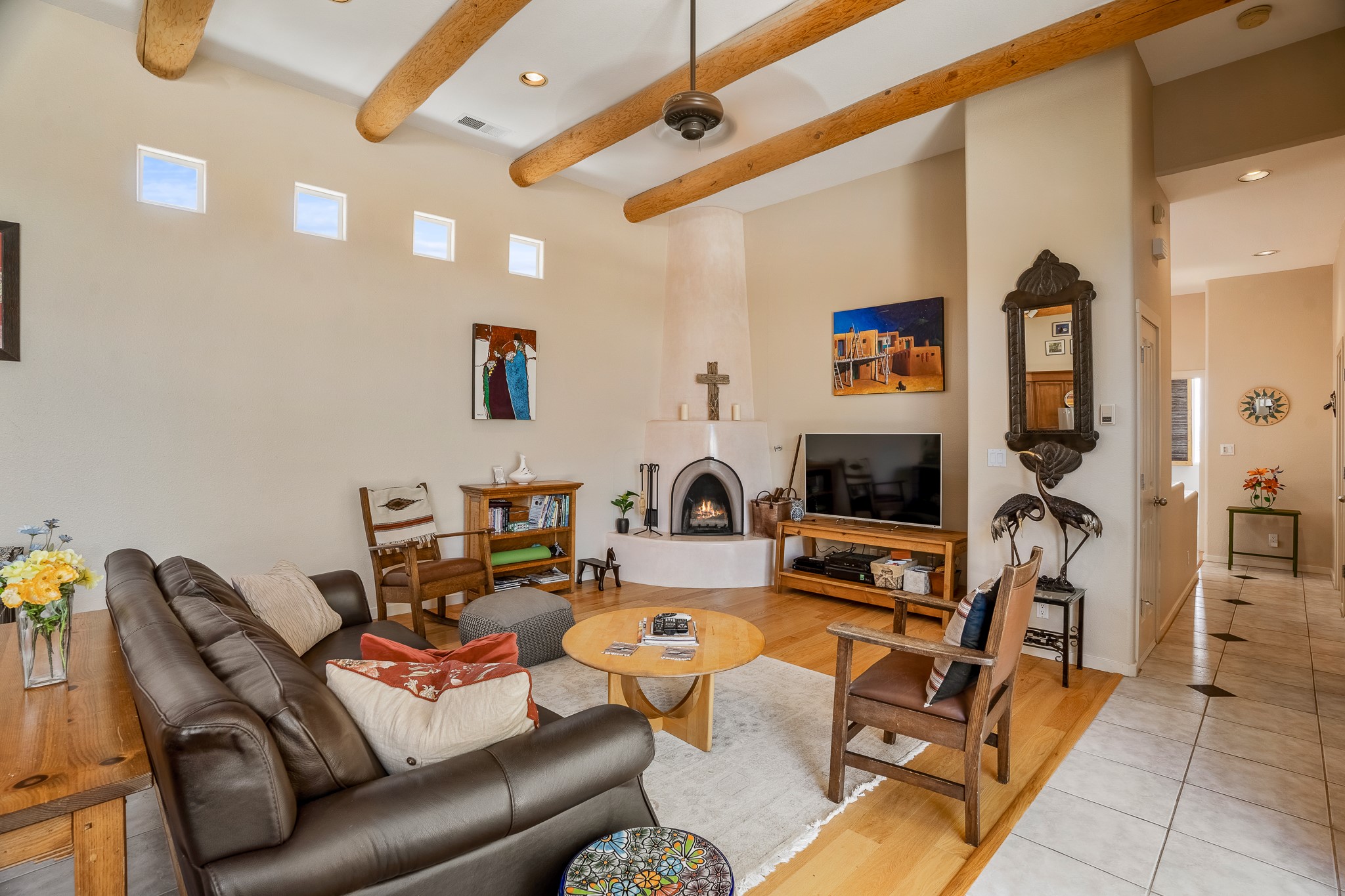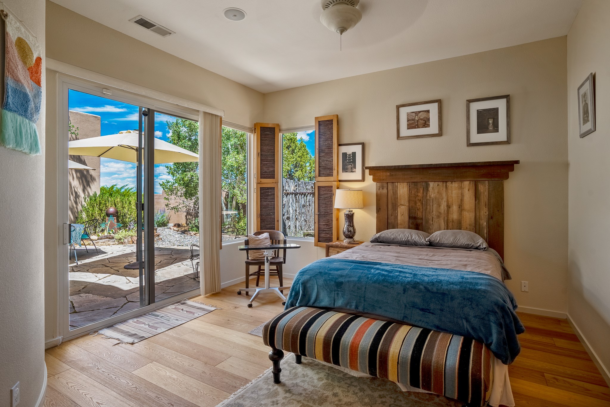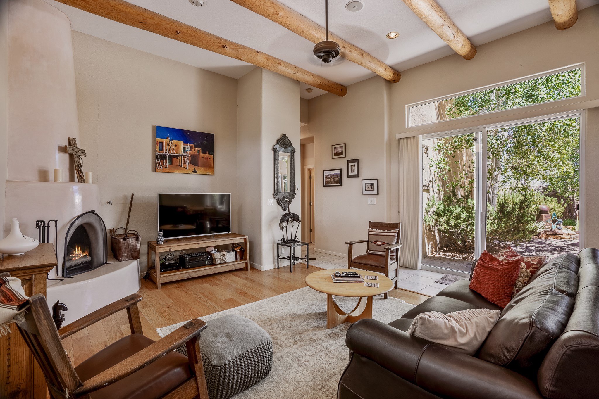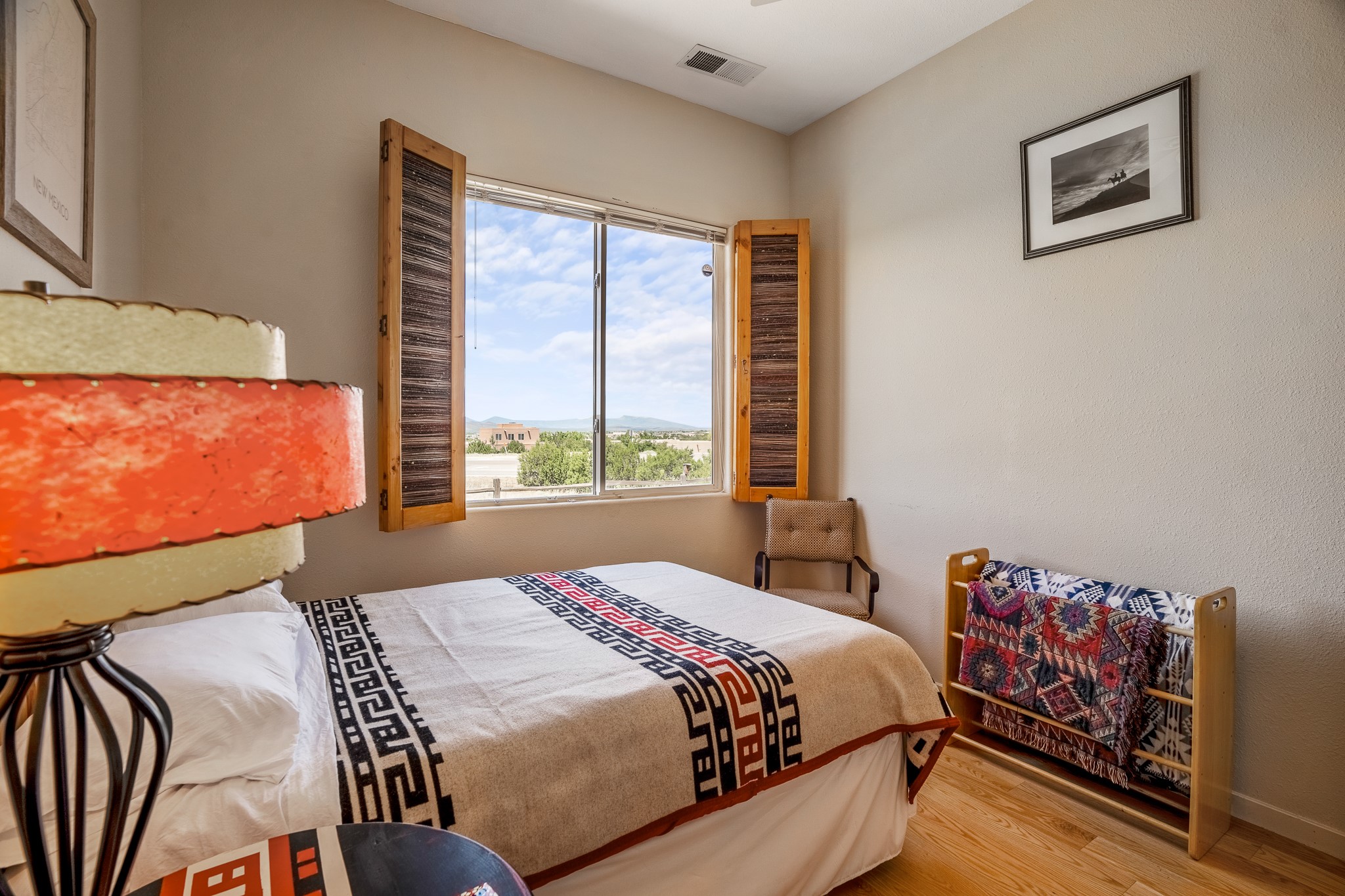 Sited in the highly sought after Rancho Viejo, this home is a gem in a great neighborhood. 3 bedrooms with 2 full bathrooms and an office area. Radiant heat with 2 Master Cool evaporative coolers. Laminate wood floors and tile. Light and bright with big windows. Willow wood shutters, new custom gates, and a 1800s Mexican barn door in the Primary Bedroom. The Primary bedroom has a large bathroom with separate bath tub and shower. Great views of the Jemez and Sangre de Cristo Mountain ranges. Dreamy sunsets from the Primary Bedroom. The enclosed backyard is landscaped with a private hot tub. This house is at the end of the of the street and is set in a very private part of the neighborhood. There is easy access to all of Santa Fe, I-25, 599 to get to Los Alamos, or to State Rd 14. Great schools are nearby with healthcare close too. Shopping, restaurants, and anything else you may want or need is minutes away. This is a great home priced to sell in a very hot market. Don't wait to schedule to see this one.