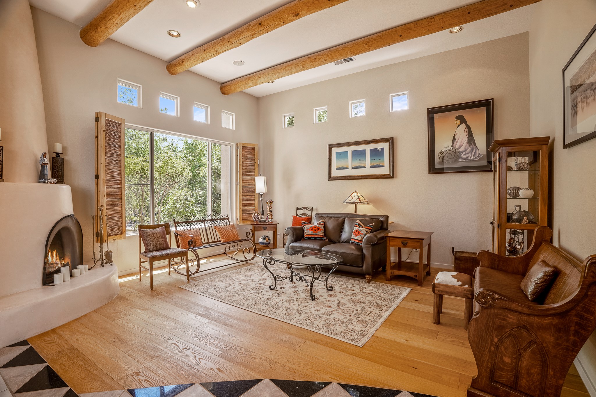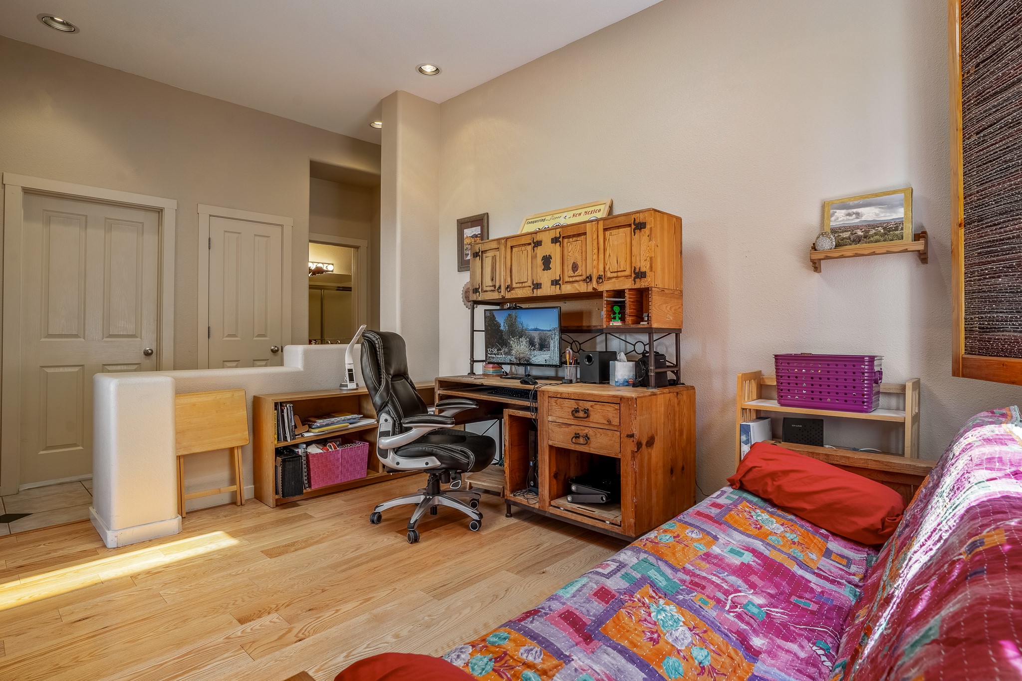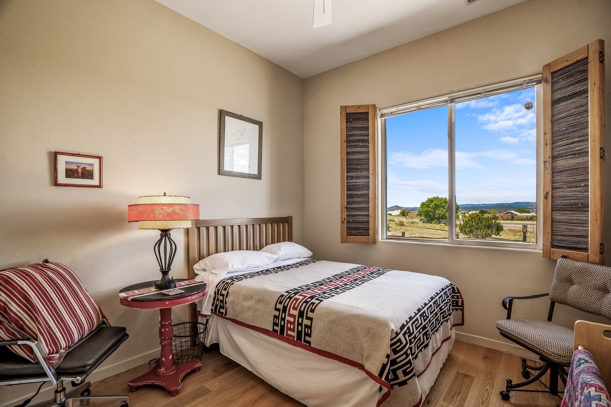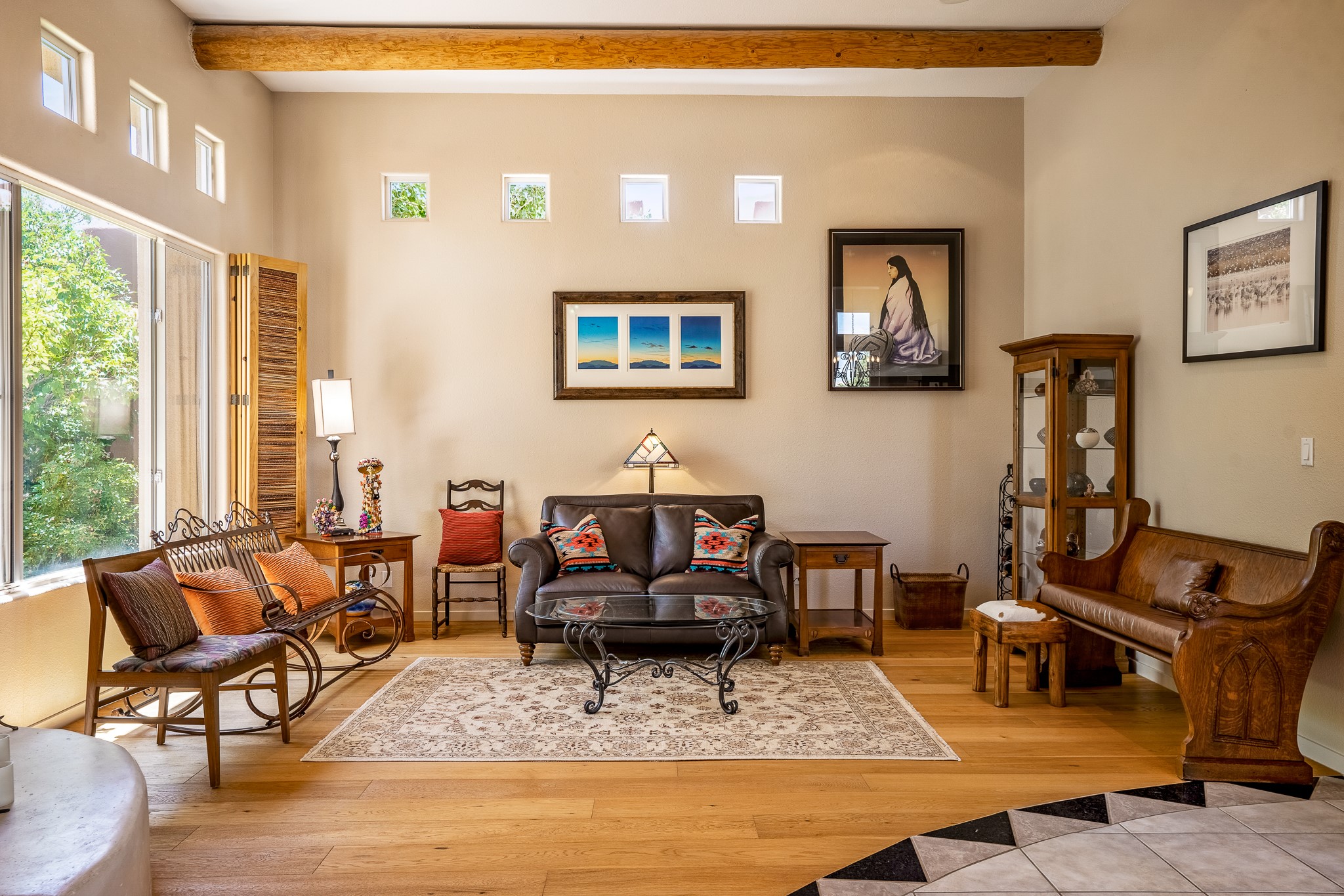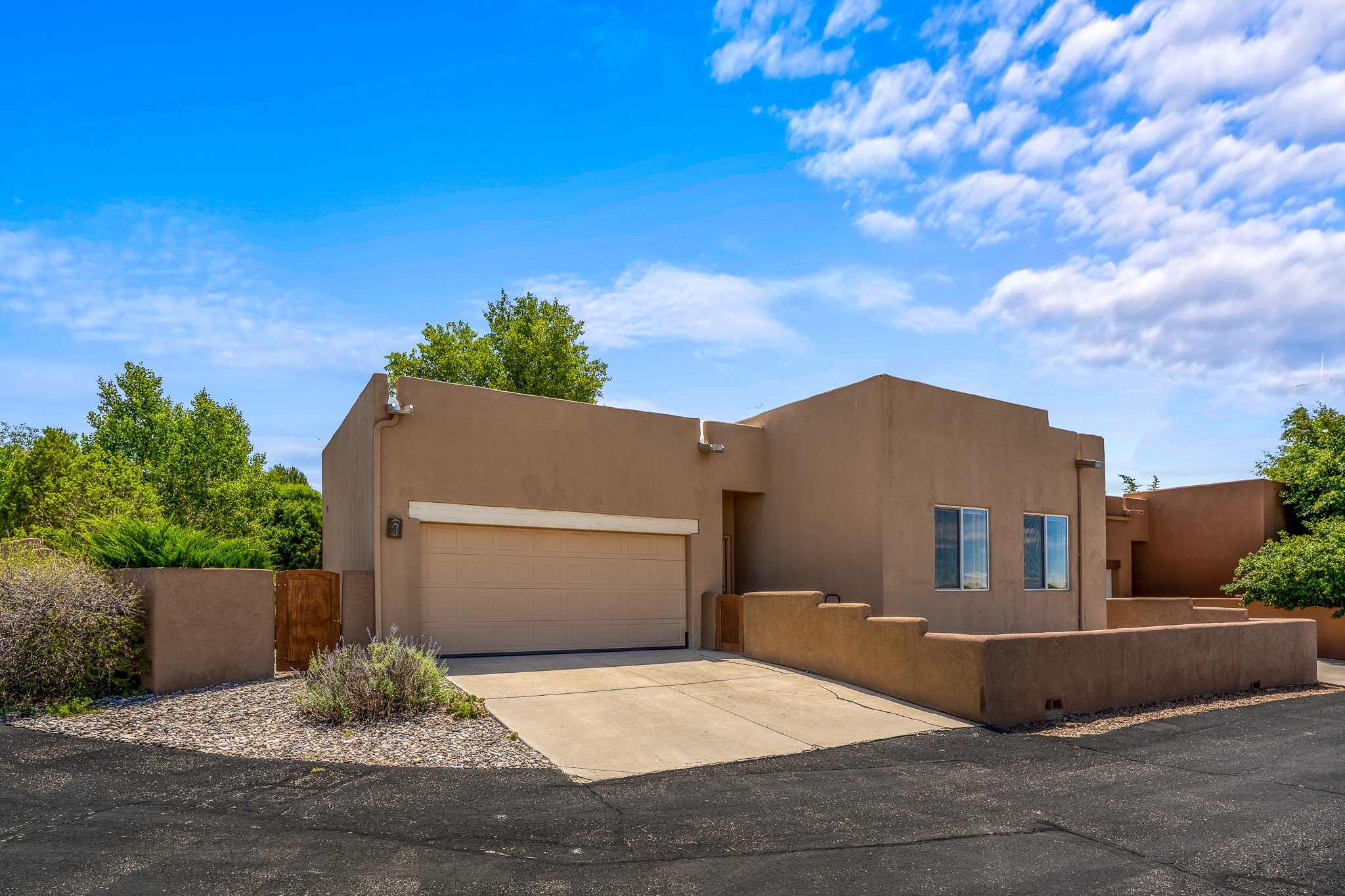Sited in the highly sought after Rancho Viejo, this home is a gem in a great neighborhood. 3 bedrooms with 2 full bathrooms and an office area. Radiant heat with 2 Master Cool evaporative coolers. Laminate wood floors and tile. Light and bright with big windows. Willow wood shutters, new custom gates, and a 1800s Mexican barn door in the Primary Bedroom. The Primary bedroom has a large bathroom with separate bath tub and shower. Great views of the Jemez and Sangre de Cristo Mountain ranges. Dreamy sunsets from the Primary Bedroom. The enclosed backyard is landscaped with a private hot tub. This house is at the end of the of the street and is set in a very private part of the neighborhood. There is easy access to all of Santa Fe, I-25, 599 to get to Los Alamos, or to State Rd 14. Great schools are nearby with healthcare close too. Shopping, restaurants, and anything else you may want or need is minutes away. This is a great home priced to sell in a very hot market. Don't wait to schedule to see this one.