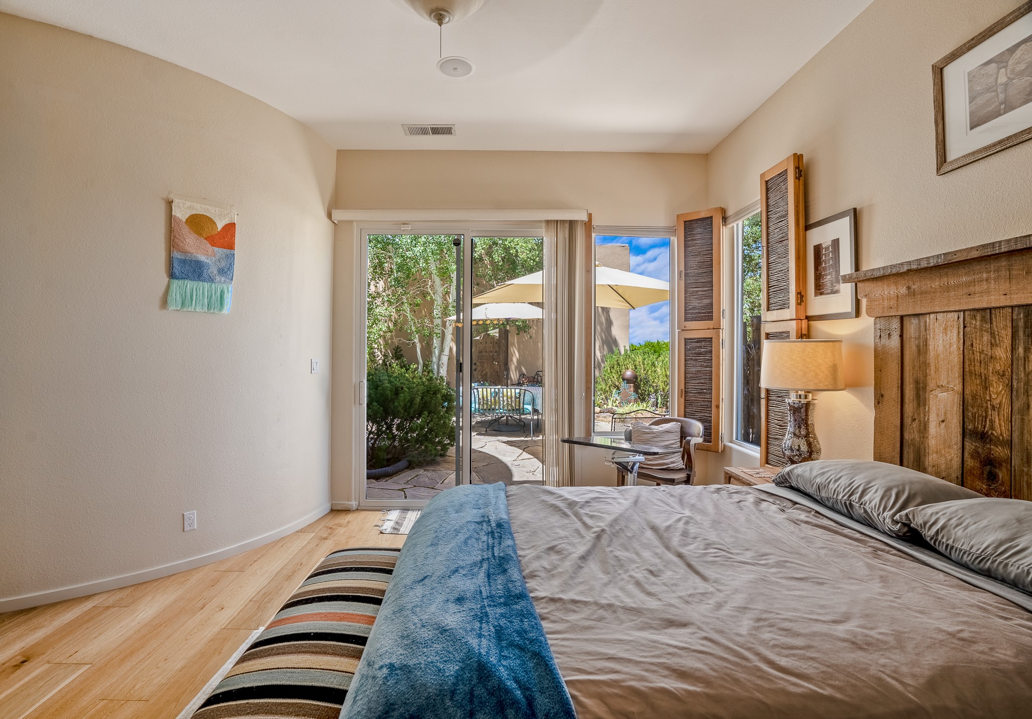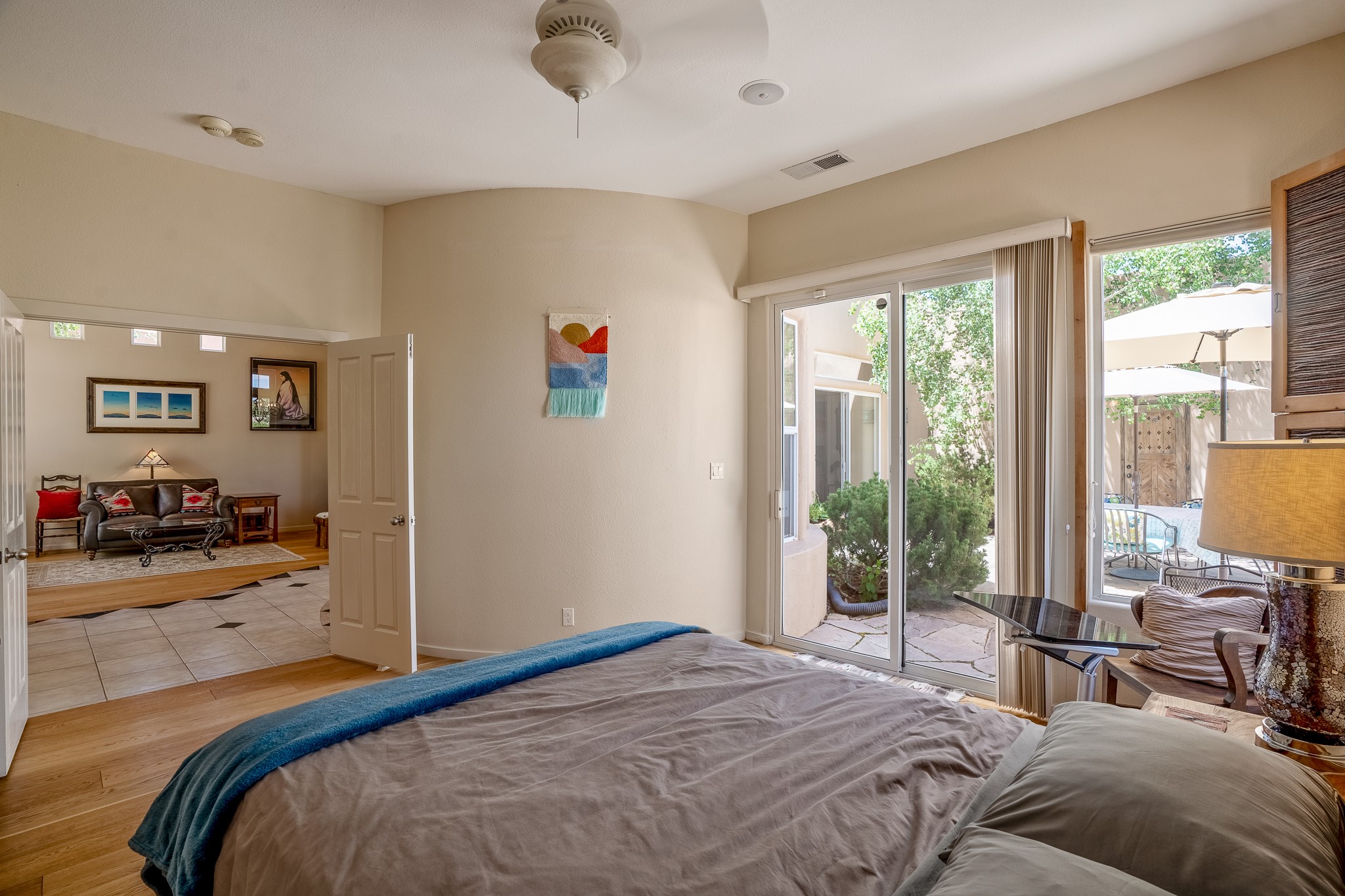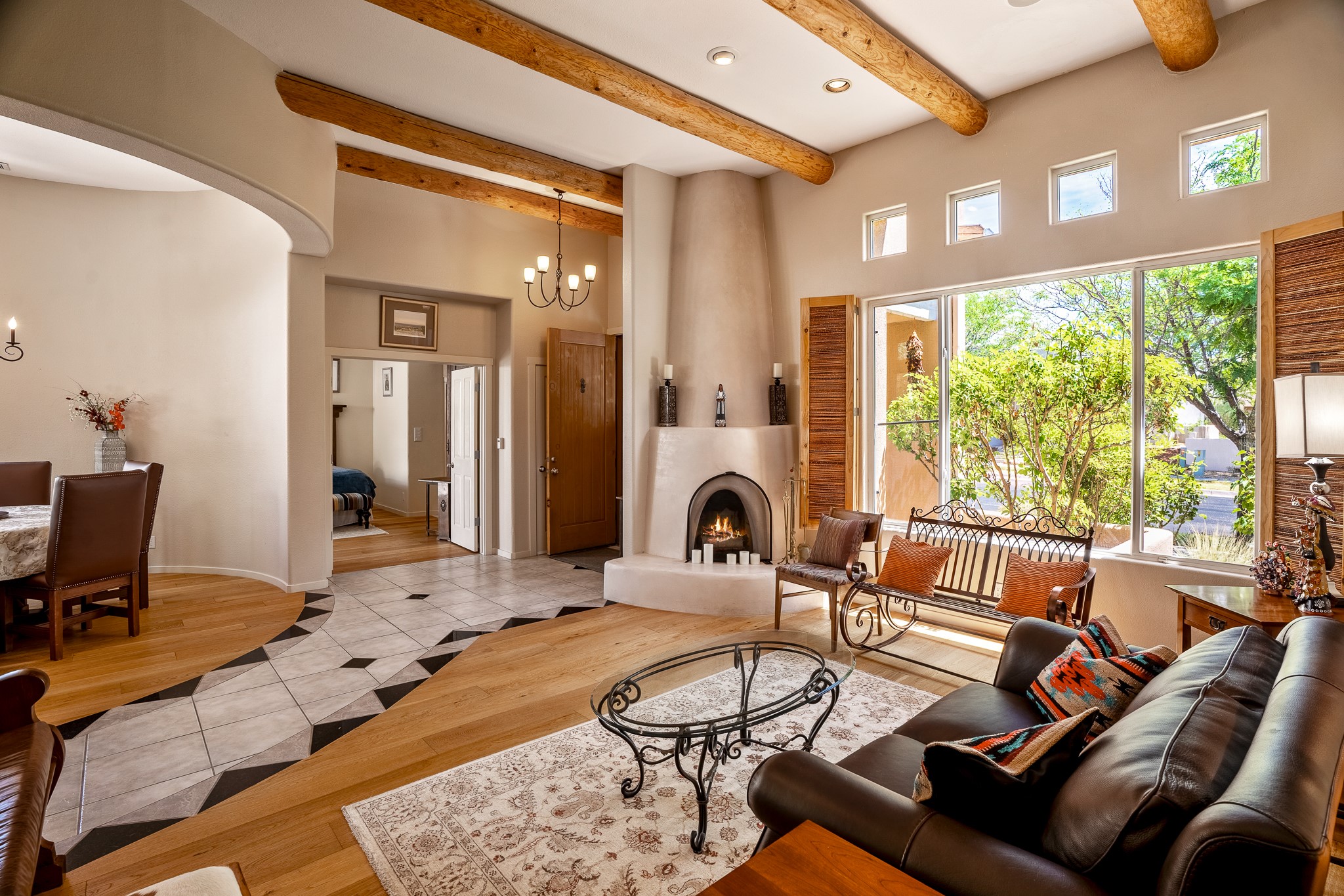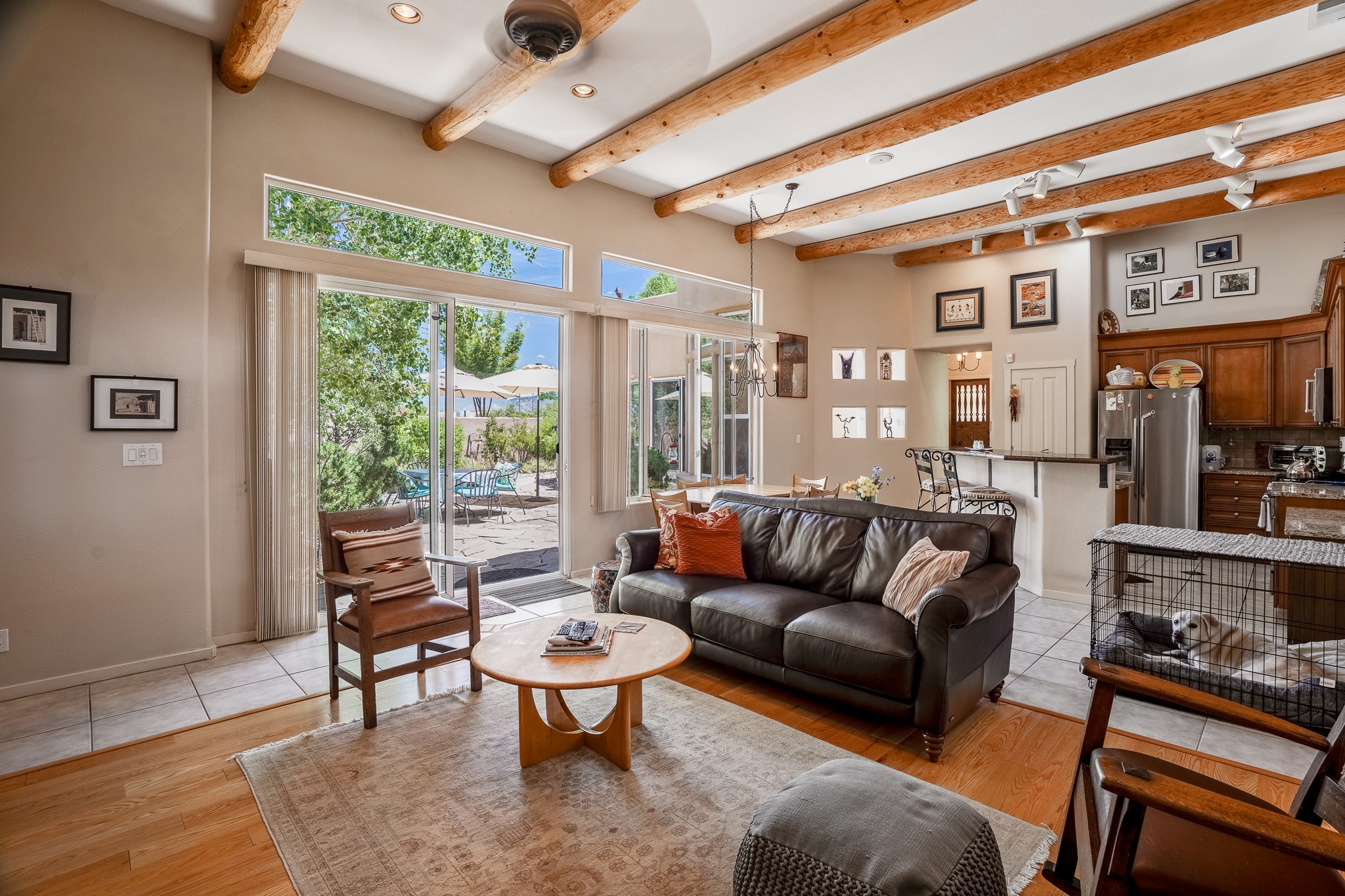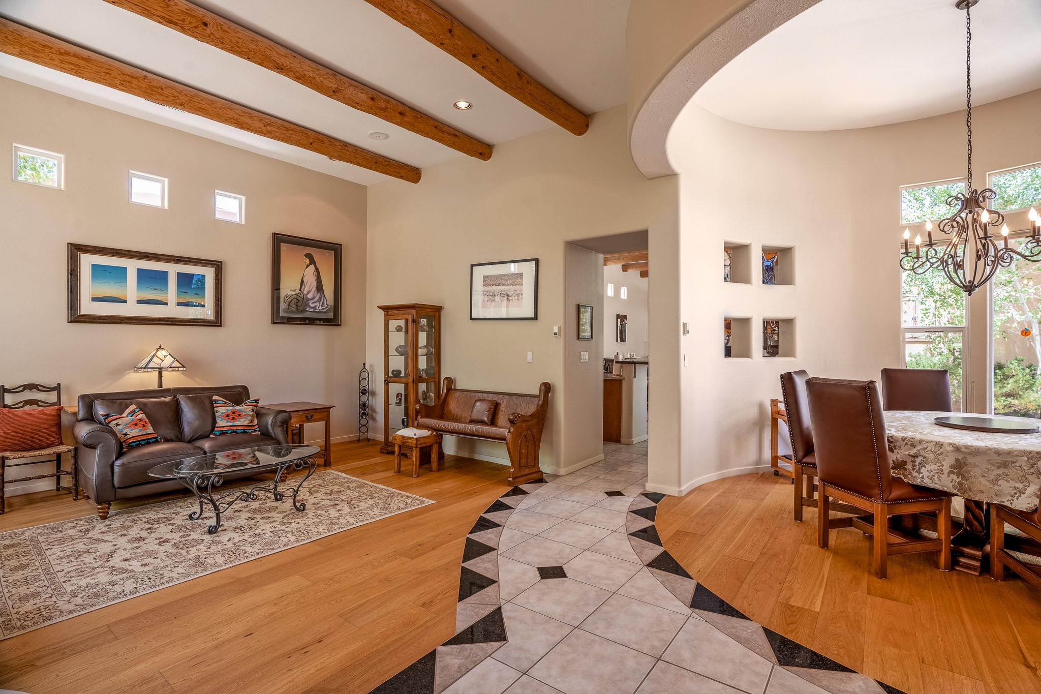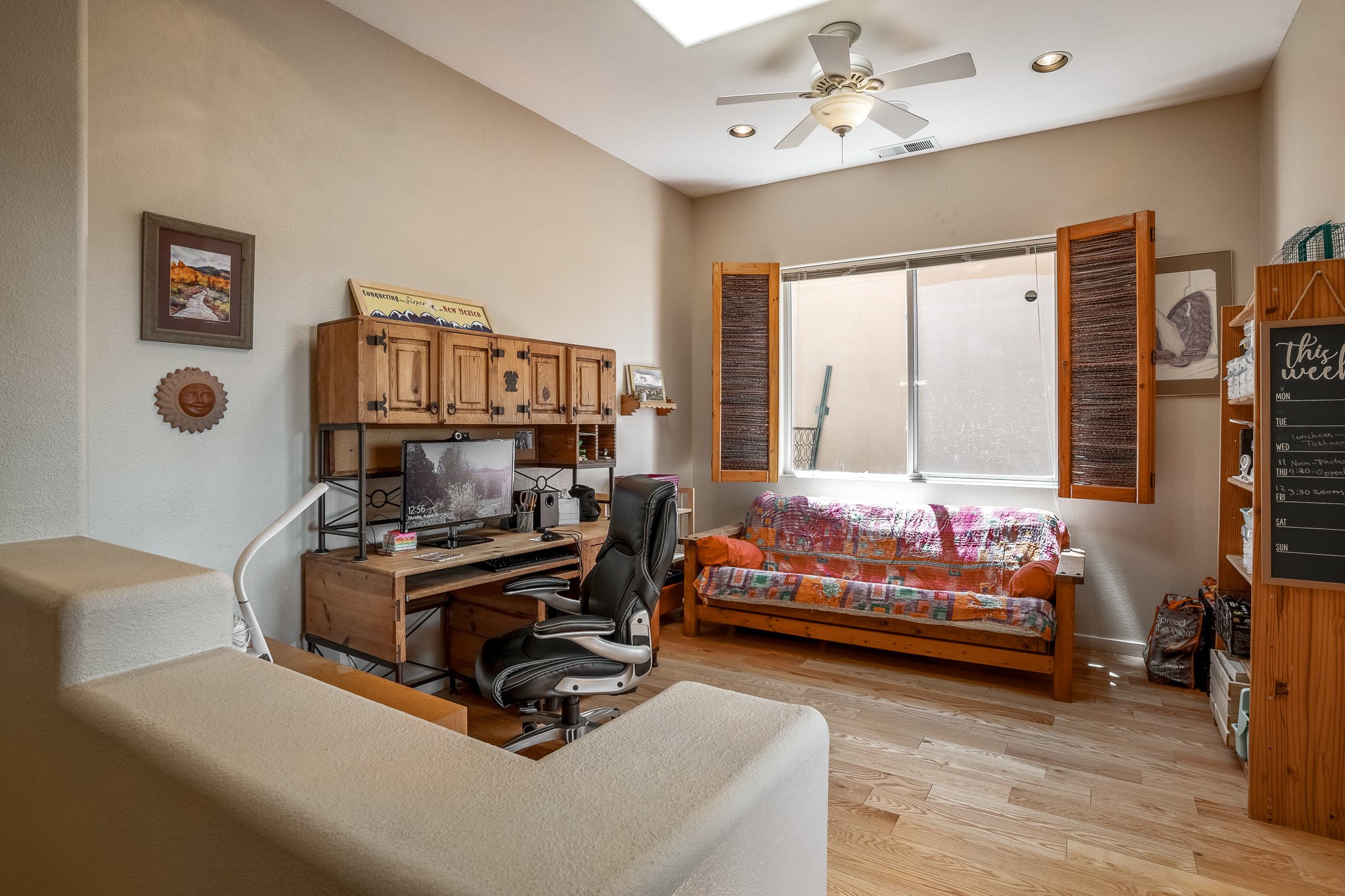 Sited in the highly sought after Rancho Viejo, this home is a gem in a great neighborhood. 3 bedrooms with 2 full bathrooms and an office area. Radiant heat with 2 Master Cool evaporative coolers. Laminate wood floors and tile. Light and bright with big windows. Willow wood shutters, new custom gates, and a 1800s Mexican barn door in the Primary Bedroom. The Primary bedroom has a large bathroom with separate bath tub and shower. Great views of the Jemez and Sangre de Cristo Mountain ranges. Dreamy sunsets from the Primary Bedroom. The enclosed backyard is landscaped with a private hot tub. This house is at the end of the of the street and is set in a very private part of the neighborhood. There is easy access to all of Santa Fe, I-25, 599 to get to Los Alamos, or to State Rd 14. Great schools are nearby with healthcare close too. Shopping, restaurants, and anything else you may want or need is minutes away. This is a great home priced to sell in a very hot market. Don't wait to schedule to see this one.