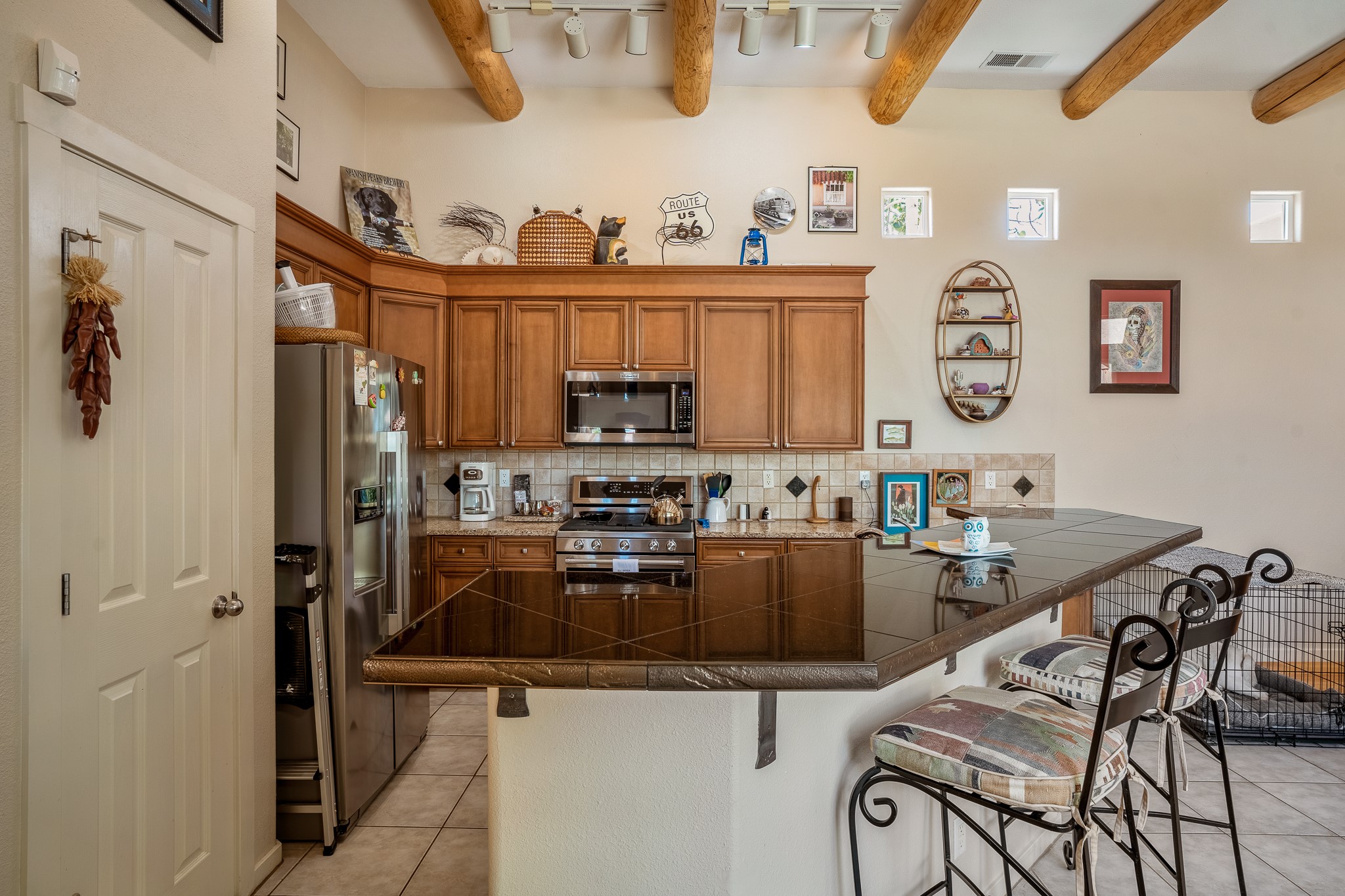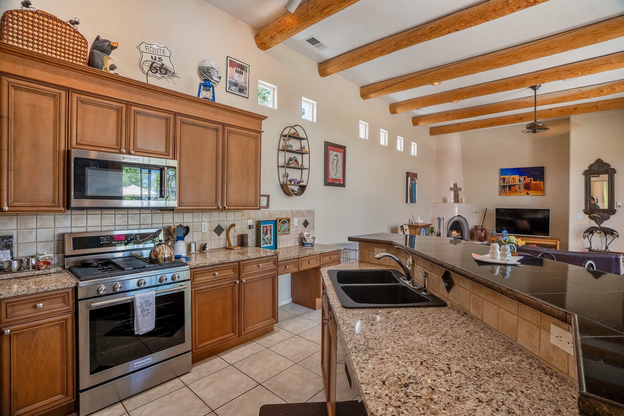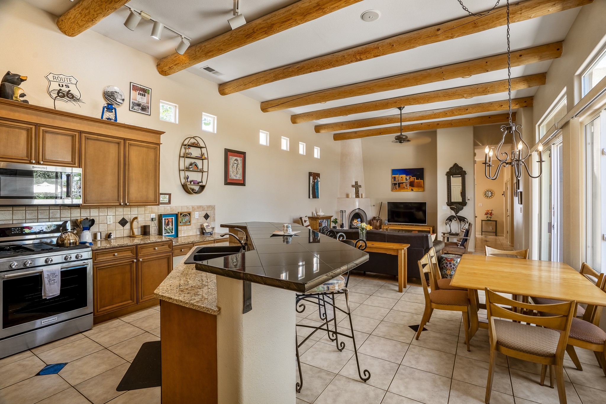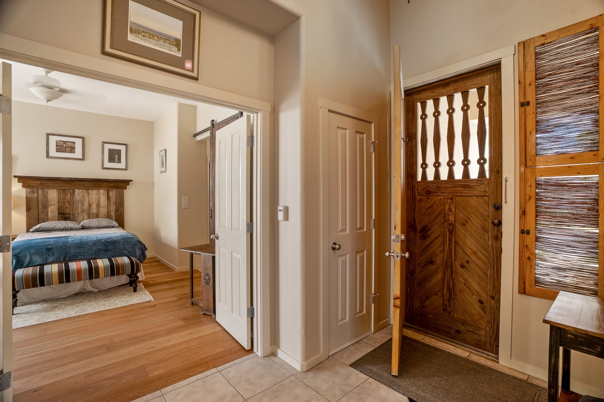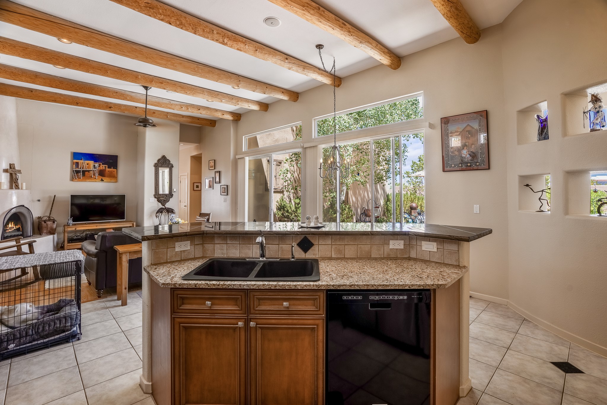 Sited in the highly sought after Rancho Viejo, this home is a gem in a great neighborhood. 3 bedrooms with 2 full bathrooms and an office area. Radiant heat with 2 Master Cool evaporative coolers. Laminate wood floors and tile. Light and bright with big windows. Willow wood shutters, new custom gates, and a 1800s Mexican barn door in the Primary Bedroom. The Primary bedroom has a large bathroom with separate bath tub and shower. Great views of the Jemez and Sangre de Cristo Mountain ranges. Dreamy sunsets from the Primary Bedroom. The enclosed backyard is landscaped with a private hot tub. This house is at the end of the of the street and is set in a very private part of the neighborhood. There is easy access to all of Santa Fe, I-25, 599 to get to Los Alamos, or to State Rd 14. Great schools are nearby with healthcare close too. Shopping, restaurants, and anything else you may want or need is minutes away. This is a great home priced to sell in a very hot market. Don't wait to schedule to see this one.