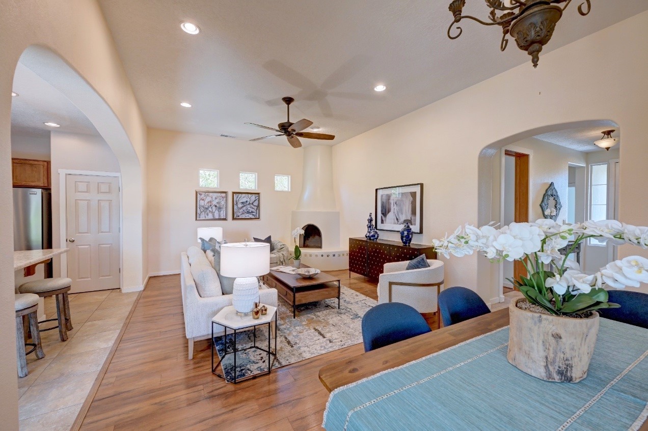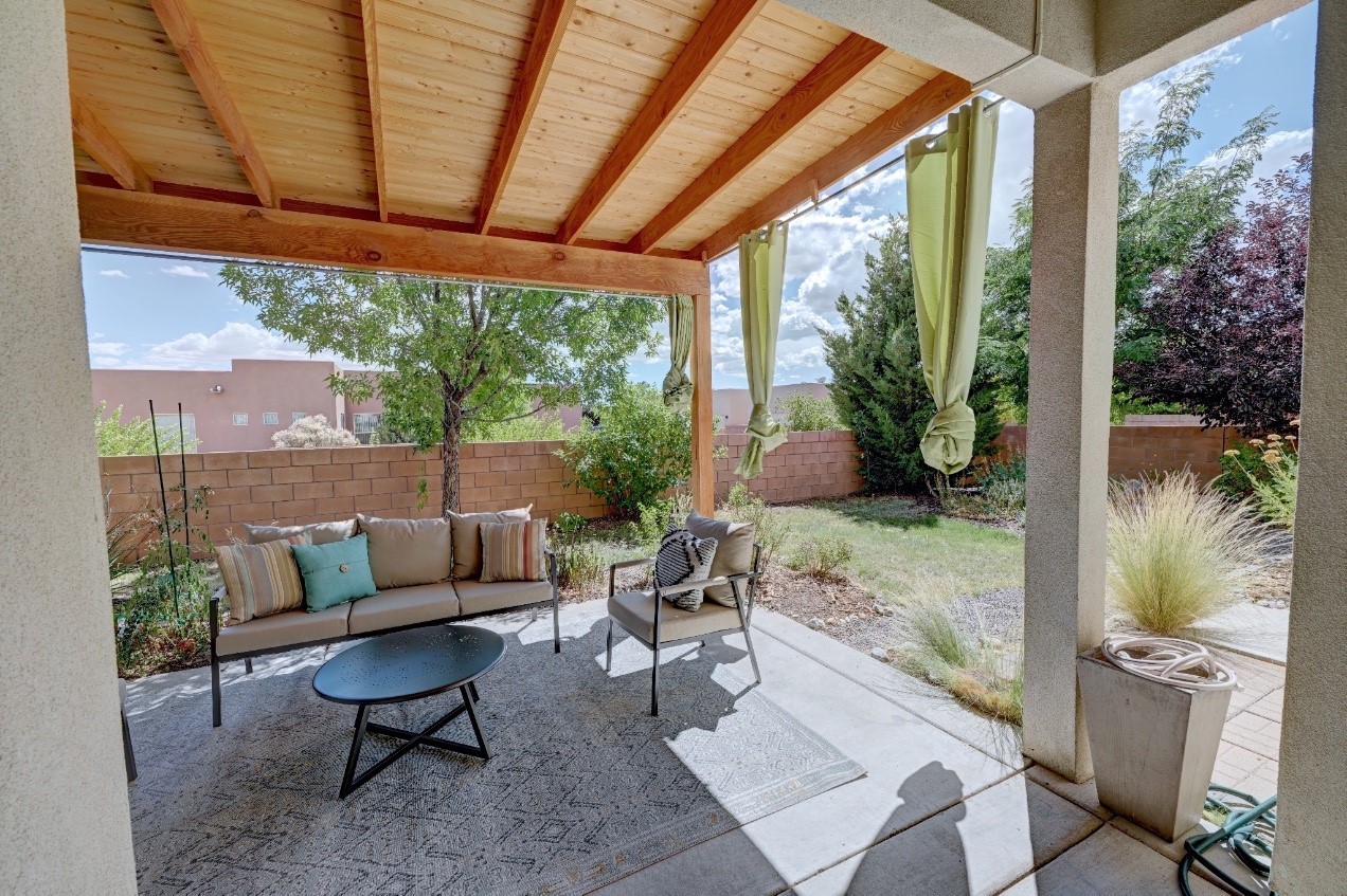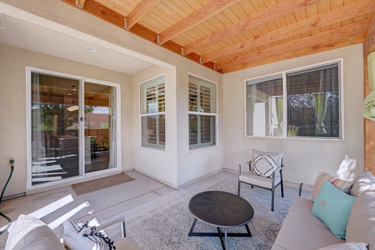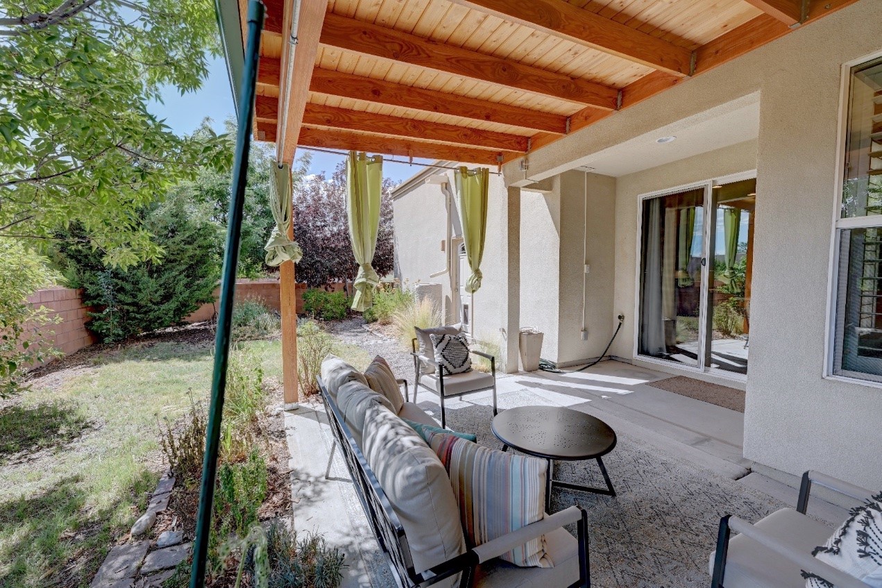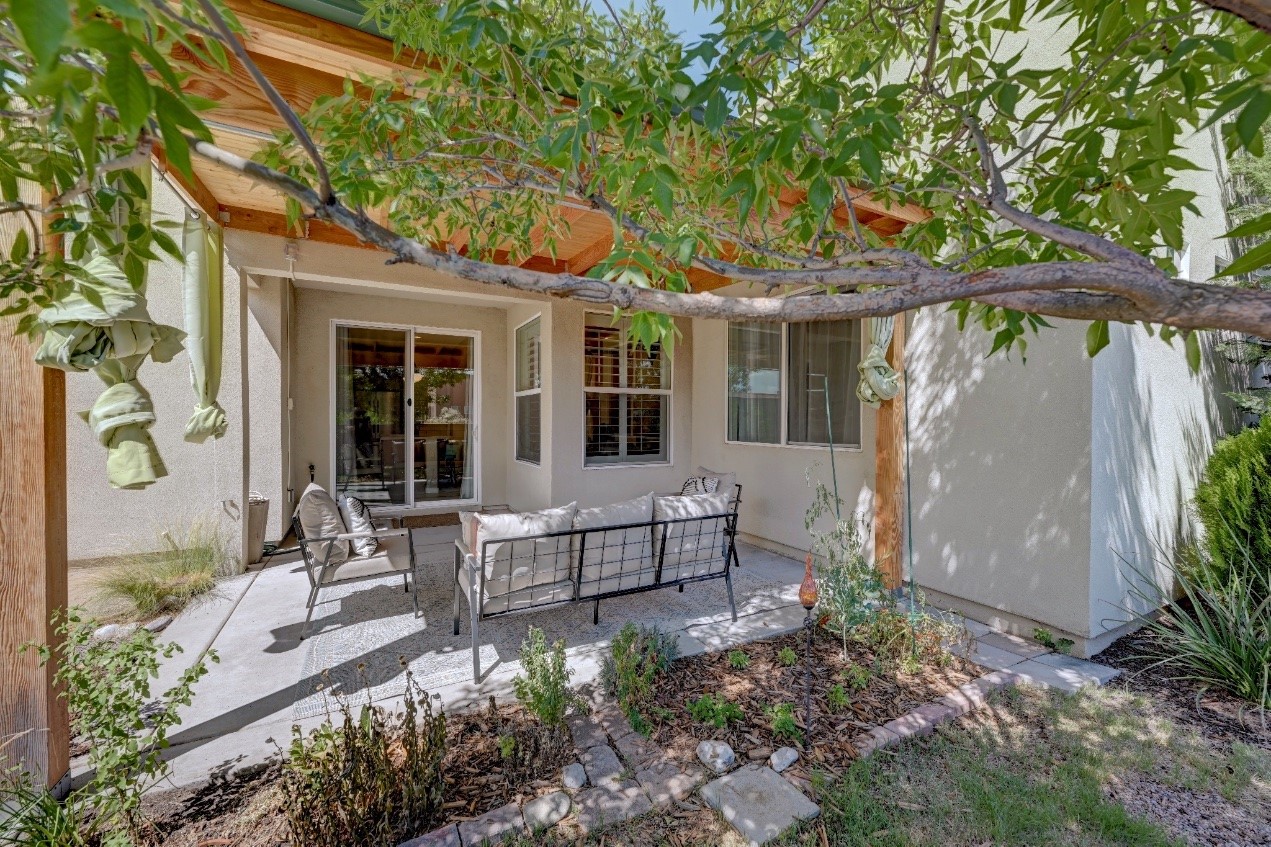 Beautifully upgraded single level home in the highly sought after Rancho Viejo. This stunning 3 bedroom, 2 bath home has an open and spacious floor plan with great natural light. Plantation shutters adorn the dining room's corner windows and a wood burning kiva fireplace is the living room's key feature. The open concept kitchen includes stainless steel appliances, custom cabinets and tile floors. There is forced air heat and refrigerated air conditioning. The spacious Primary Suite has a large walk-in closet and large bathroom with custom double sinks. This home is move-in ready. The outside features a generous portal for dining and fully landscaped and walled private yard. The house sits adjacent to a path creating additional privacy and space from neighbors. The community of Rancho Viejo was thoughtfully planned to preserve open spaces while providing a sense of community. Rancho Viejo is known for its miles of greenbelts and over 12 miles of paved trails for walking, biking and jogging. Come see this warm and inviting home situated in the lovely surroundings of Rancho Viejo. Please see the virtual tour in the listing!
