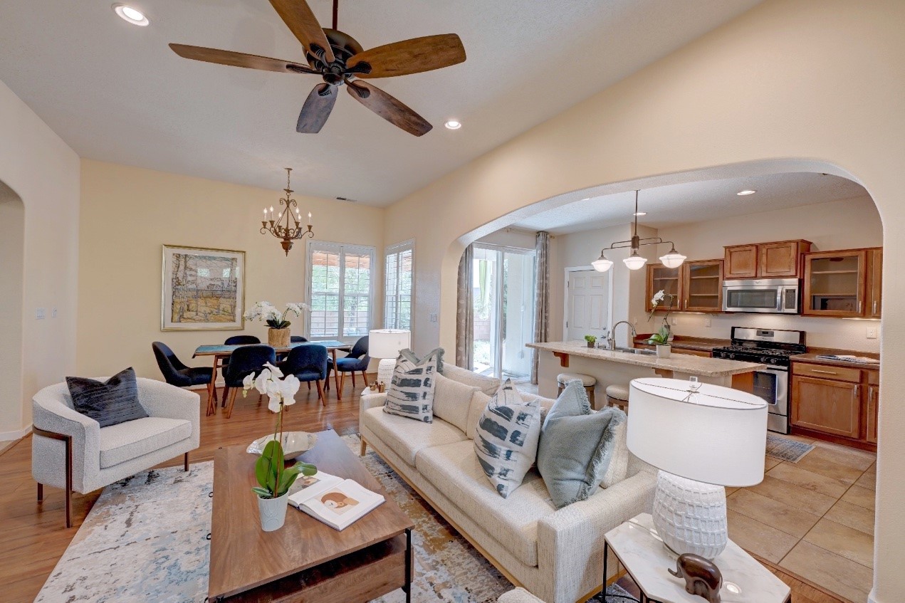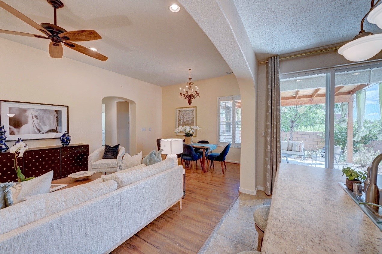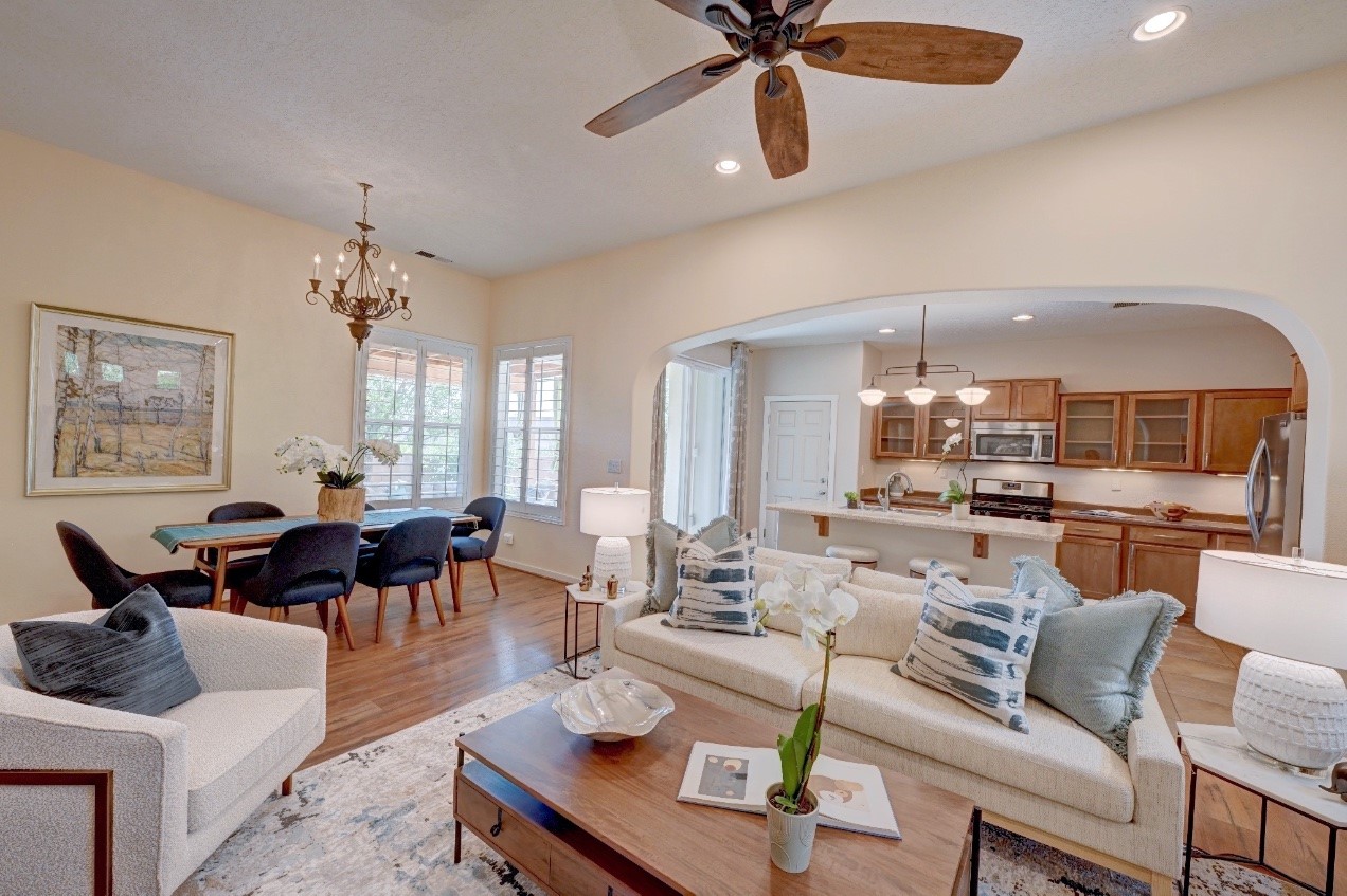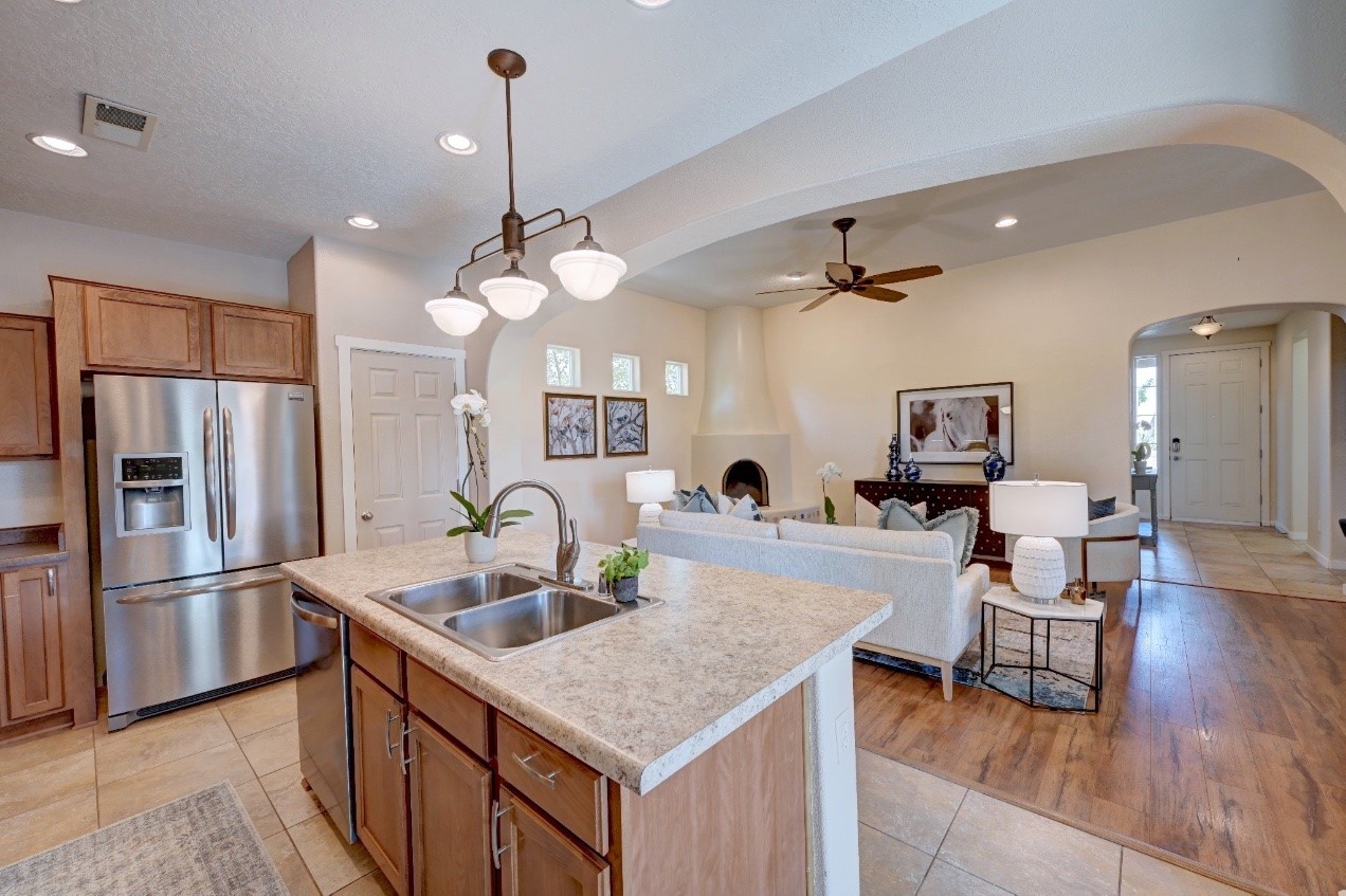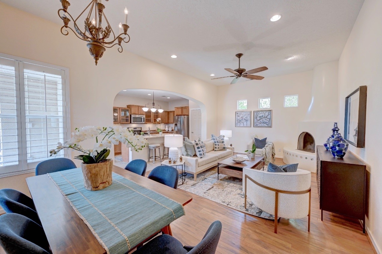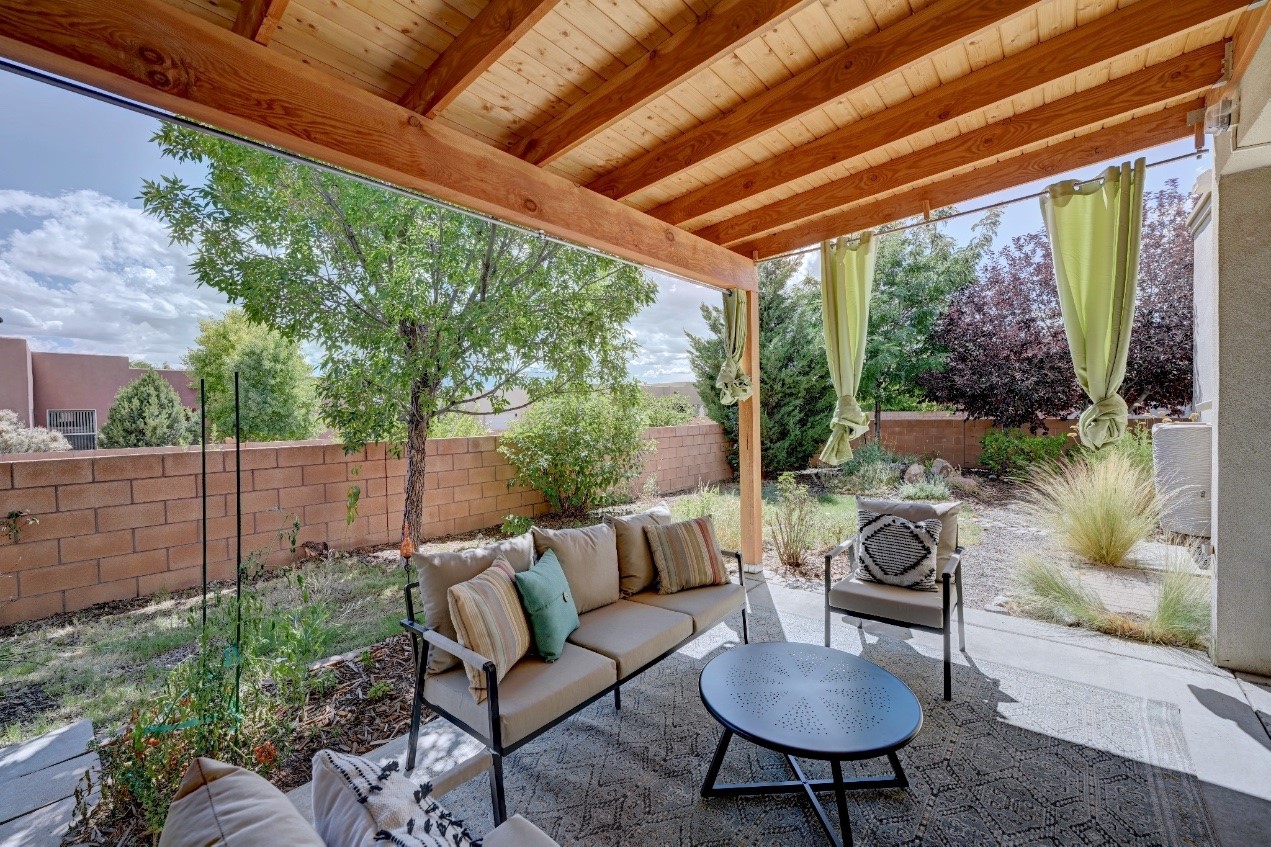 Beautifully upgraded single level home in the highly sought after Rancho Viejo. This stunning 3 bedroom, 2 bath home has an open and spacious floor plan with great natural light. Plantation shutters adorn the dining room's corner windows and a wood burning kiva fireplace is the living room's key feature. The open concept kitchen includes stainless steel appliances, custom cabinets and tile floors. There is forced air heat and refrigerated air conditioning. The spacious Primary Suite has a large walk-in closet and large bathroom with custom double sinks. This home is move-in ready. The outside features a generous portal for dining and fully landscaped and walled private yard. The house sits adjacent to a path creating additional privacy and space from neighbors. The community of Rancho Viejo was thoughtfully planned to preserve open spaces while providing a sense of community. Rancho Viejo is known for its miles of greenbelts and over 12 miles of paved trails for walking, biking and jogging. Come see this warm and inviting home situated in the lovely surroundings of Rancho Viejo. Please see the virtual tour in the listing!