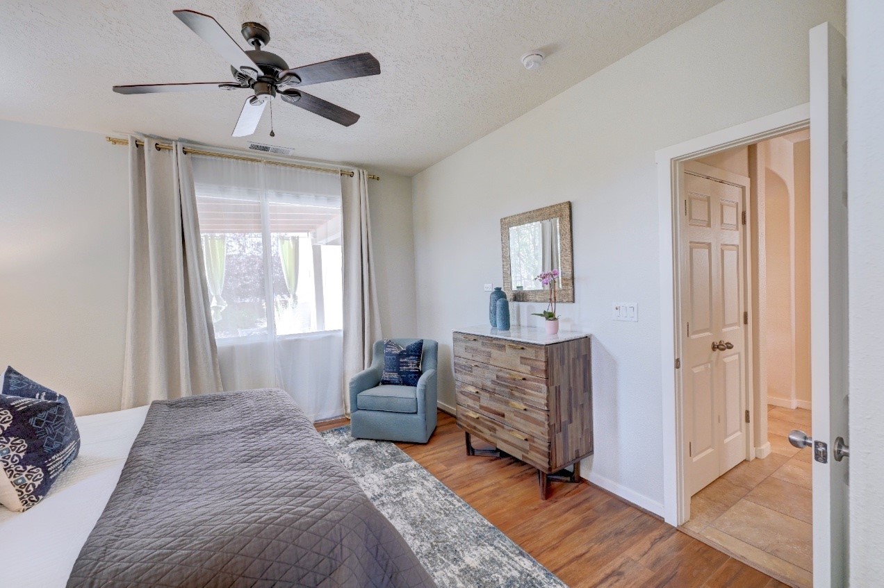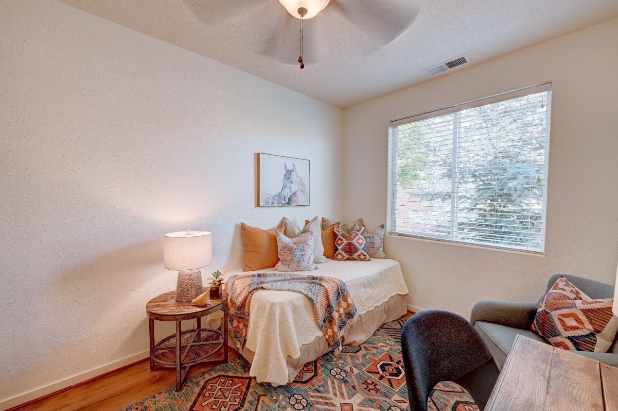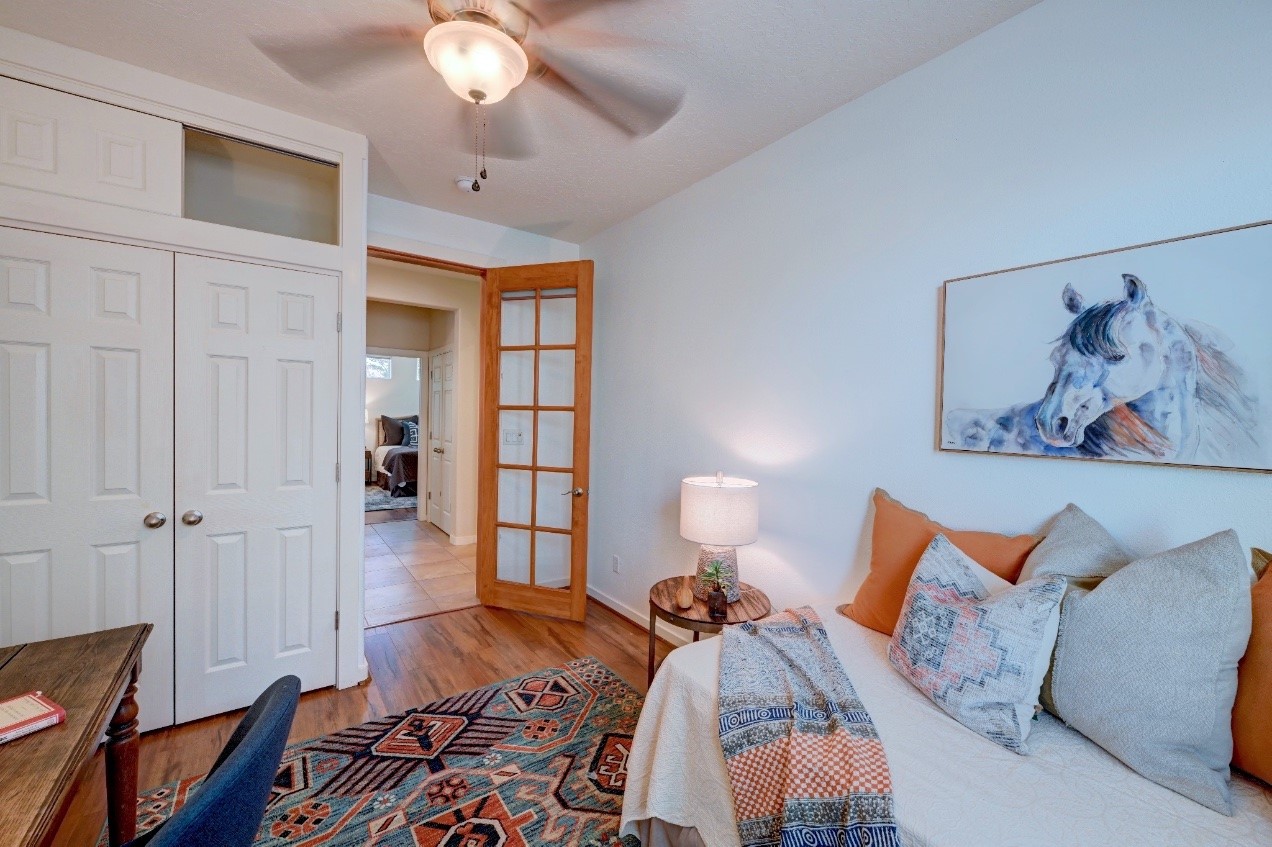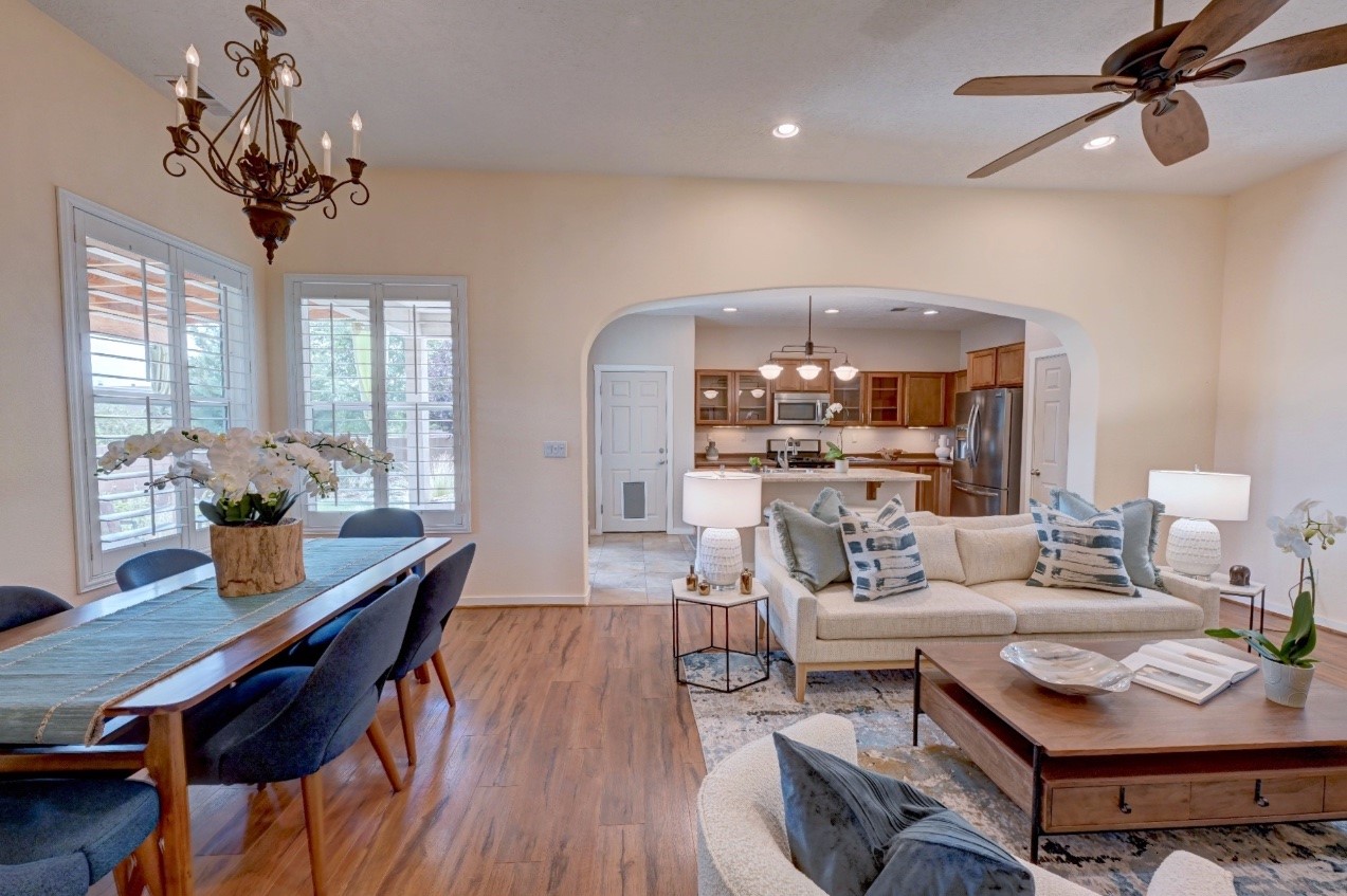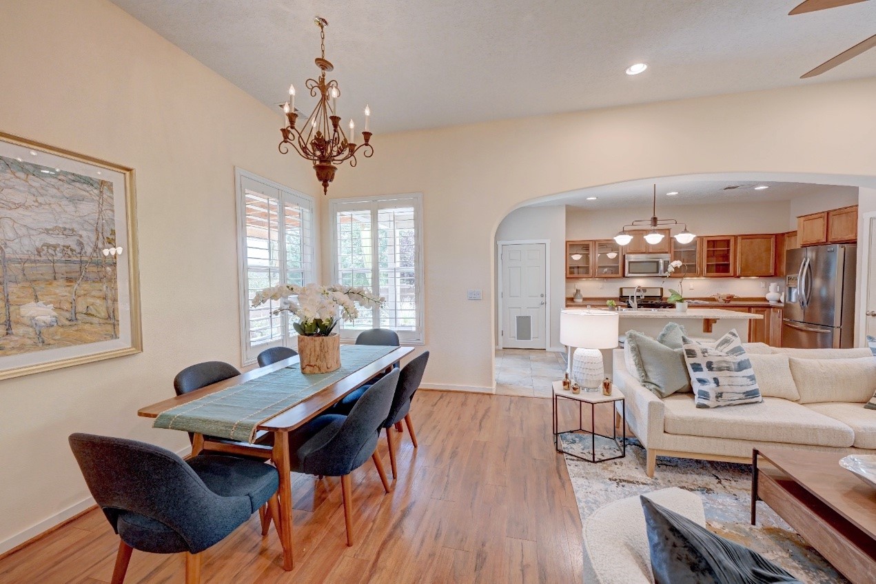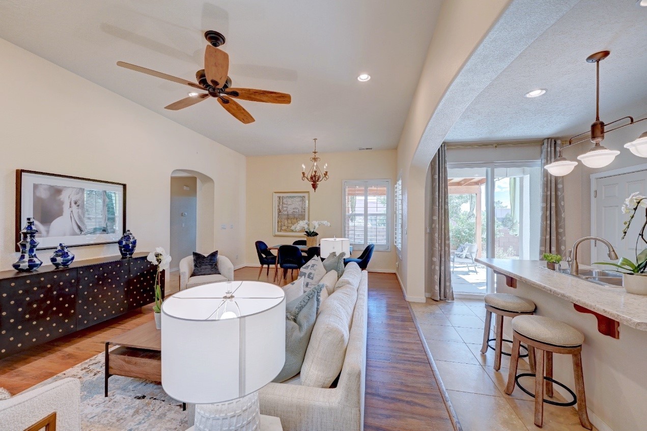 Beautifully upgraded single level home in the highly sought after Rancho Viejo. This stunning 3 bedroom, 2 bath home has an open and spacious floor plan with great natural light. Plantation shutters adorn the dining room's corner windows and a wood burning kiva fireplace is the living room's key feature. The open concept kitchen includes stainless steel appliances, custom cabinets and tile floors. There is forced air heat and refrigerated air conditioning. The spacious Primary Suite has a large walk-in closet and large bathroom with custom double sinks. This home is move-in ready. The outside features a generous portal for dining and fully landscaped and walled private yard. The house sits adjacent to a path creating additional privacy and space from neighbors. The community of Rancho Viejo was thoughtfully planned to preserve open spaces while providing a sense of community. Rancho Viejo is known for its miles of greenbelts and over 12 miles of paved trails for walking, biking and jogging. Come see this warm and inviting home situated in the lovely surroundings of Rancho Viejo. Please see the virtual tour in the listing!
