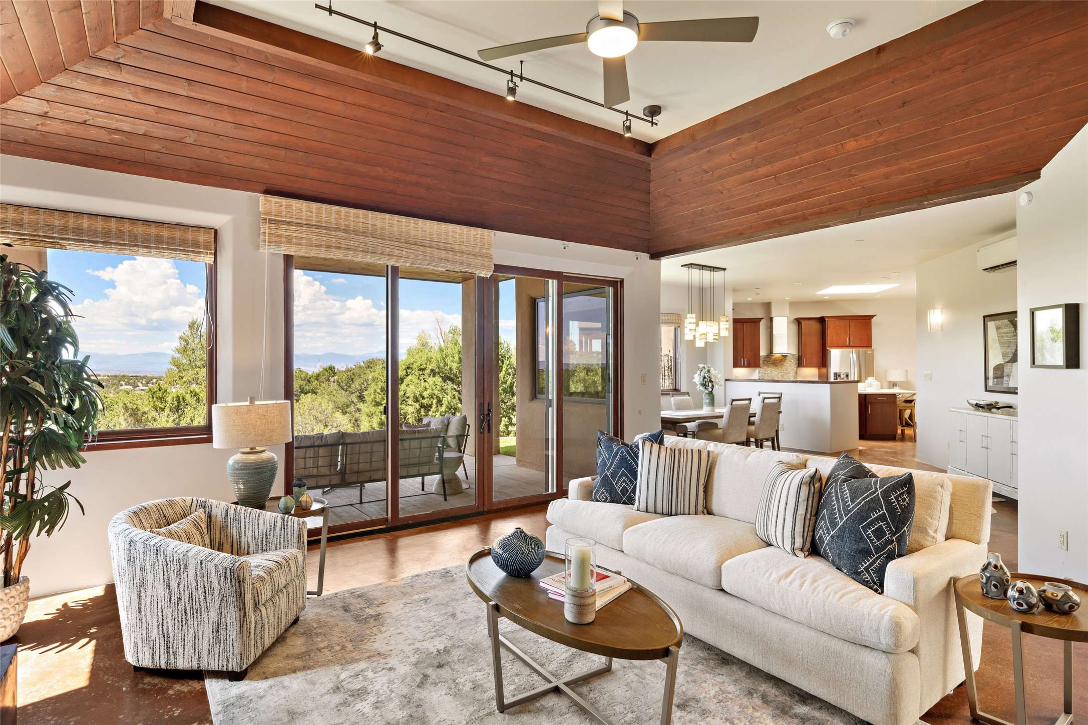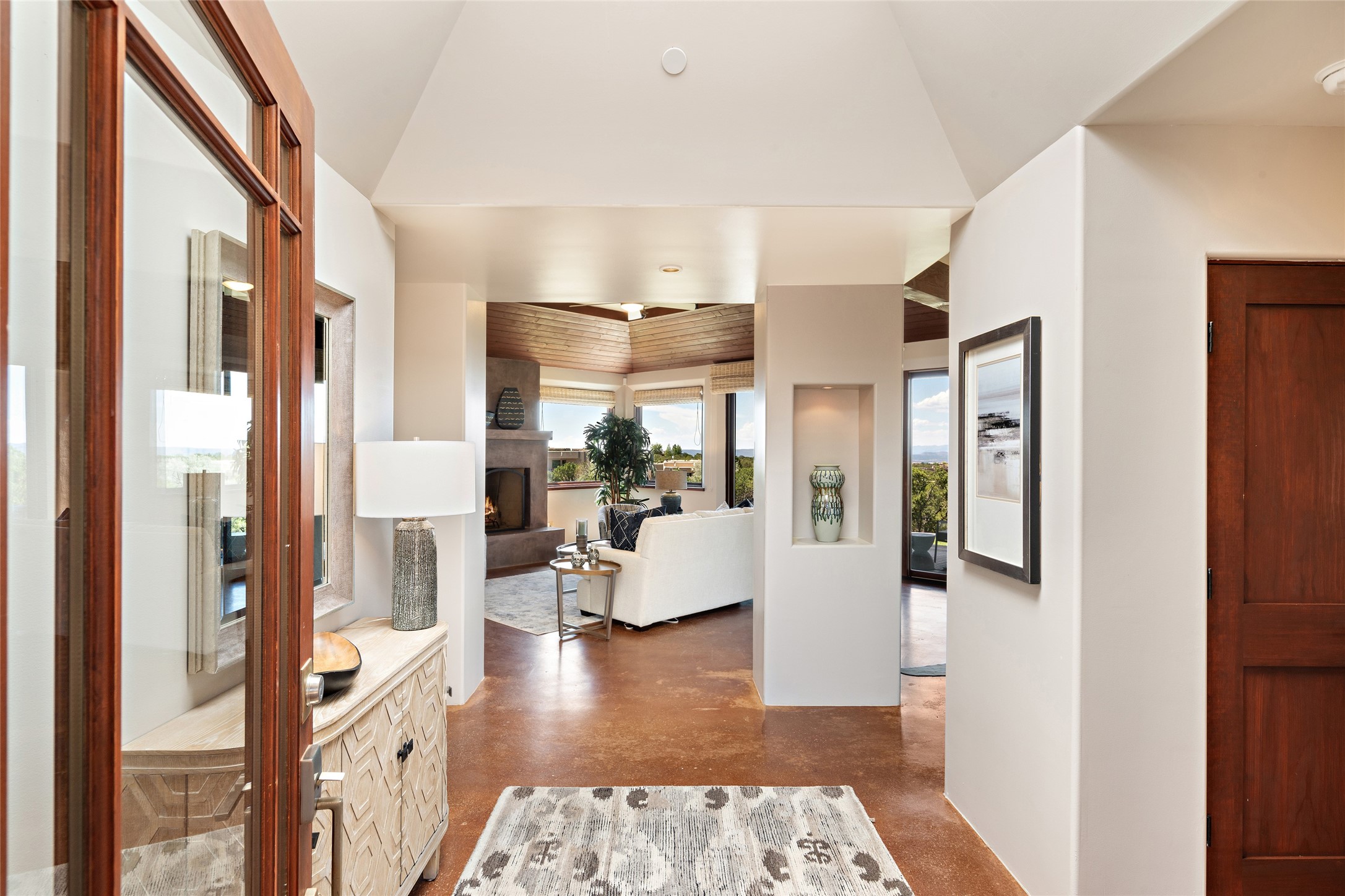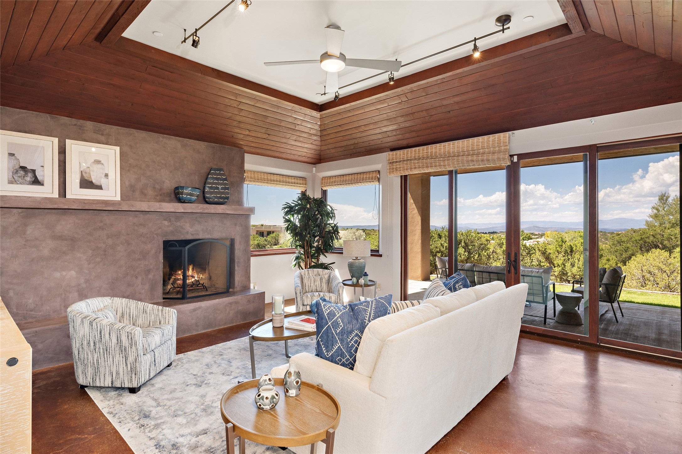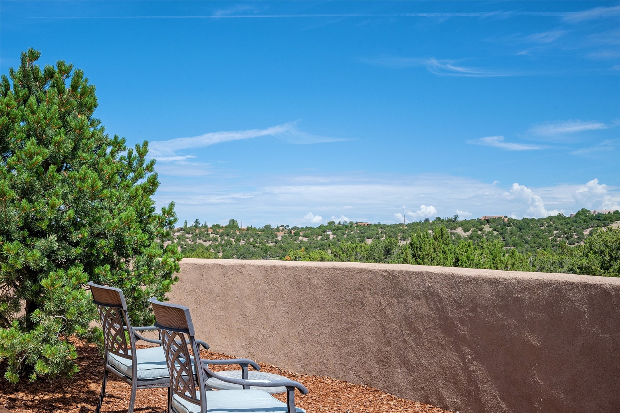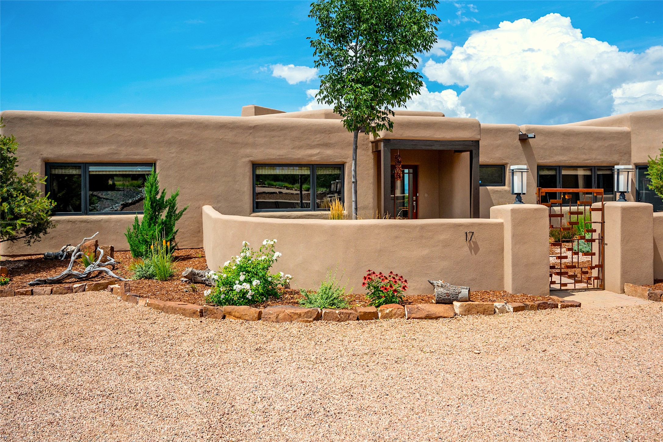 Spectacular views are enjoyed from this lovely home and casita located in the scenic Tano Road area. The main house with its warm colored concrete floors and picture windows offers two living areas, a dedicated office with built-in library shelving, and 3 bedrooms. The primary bedroom suite hosts a fireplace, walk-in closet and spa bathroom with soaking tub and double vanities. Beautiful landscaping enhances three separate outdoor areas, including a living portal perfectly framing the Jemez Mountains and glorious sunset views. A spacious, multi-purpose casita with new kitchen, full bathroom and views of the Sangre de Cristo Mountains has a separate entrance for guests and can also be accessed directly from the oversized 2-car garage. Surrounded by dedicated open space, the desirable Heartstone community includes a clubhouse with a gym and guest quarters which can be reserved at no charge to homeowners. The property is conveniently located for Los Alamos commuters, hiking and biking in the La Tierra Trails, and a quick trip to the amenities in the DeVargas Center. As an added bonus, qualified buyers may assume the existing mortgage at 2.25%, subject to lender approvals.