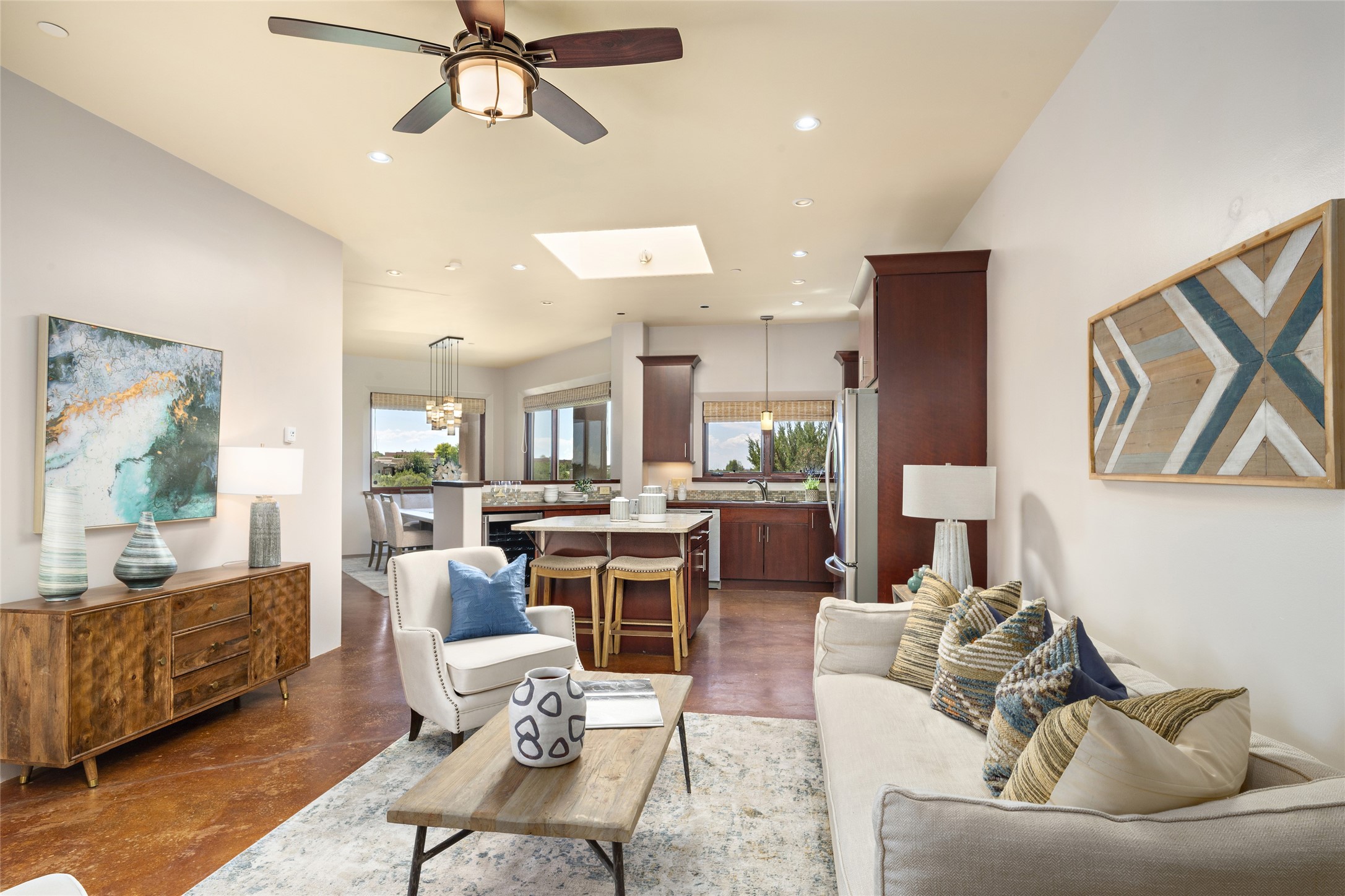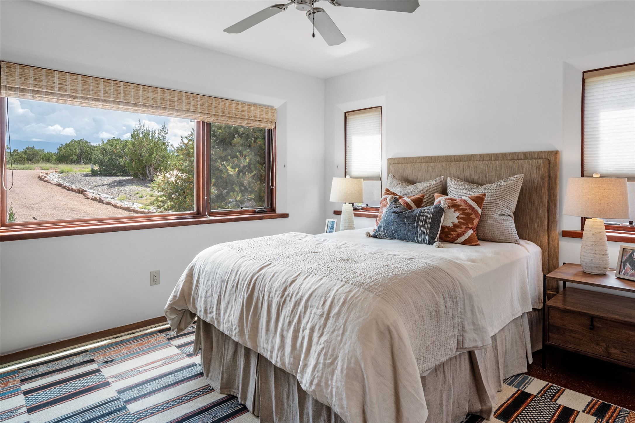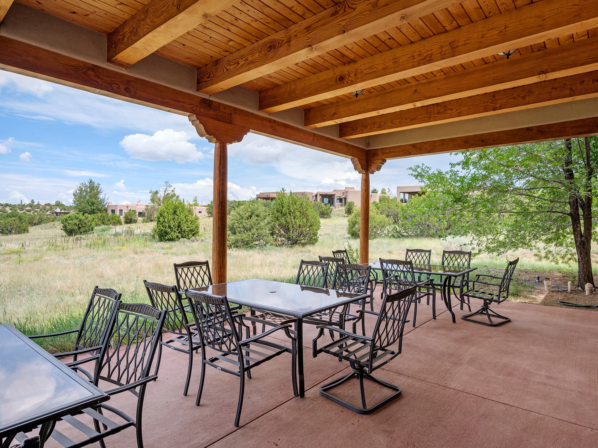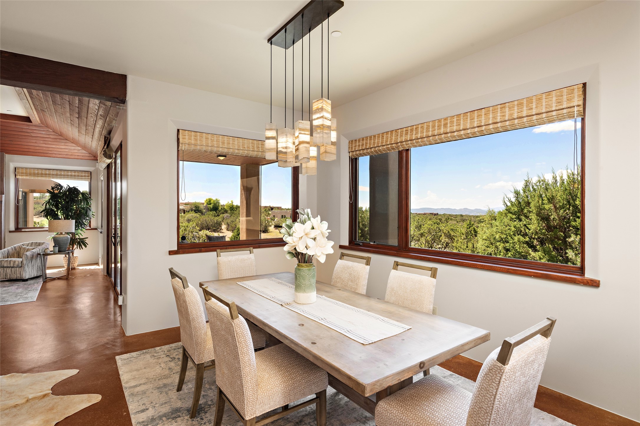 Spectacular views are enjoyed from this lovely home and casita located in the scenic Tano Road area. The main house with its warm colored concrete floors and picture windows offers two living areas, a dedicated office with built-in library shelving, and 3 bedrooms. The primary bedroom suite hosts a fireplace, walk-in closet and spa bathroom with soaking tub and double vanities. Beautiful landscaping enhances three separate outdoor areas, including a living portal perfectly framing the Jemez Mountains and glorious sunset views. A spacious, multi-purpose casita with new kitchen, full bathroom and views of the Sangre de Cristo Mountains has a separate entrance for guests and can also be accessed directly from the oversized 2-car garage. Surrounded by dedicated open space, the desirable Heartstone community includes a clubhouse with a gym and guest quarters which can be reserved at no charge to homeowners. The property is conveniently located for Los Alamos commuters, hiking and biking in the La Tierra Trails, and a quick trip to the amenities in the DeVargas Center. As an added bonus, qualified buyers may assume the existing mortgage at 2.25%, subject to lender approvals.