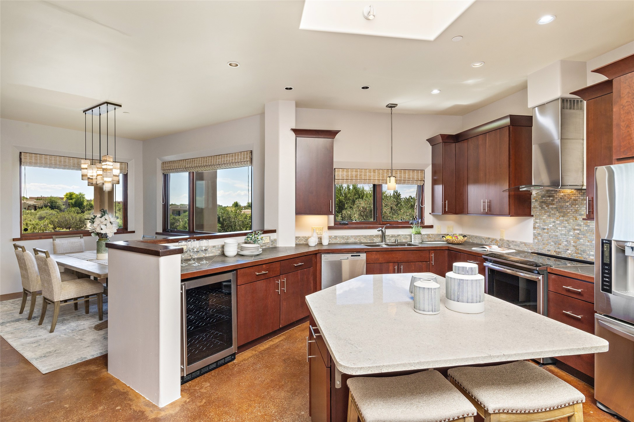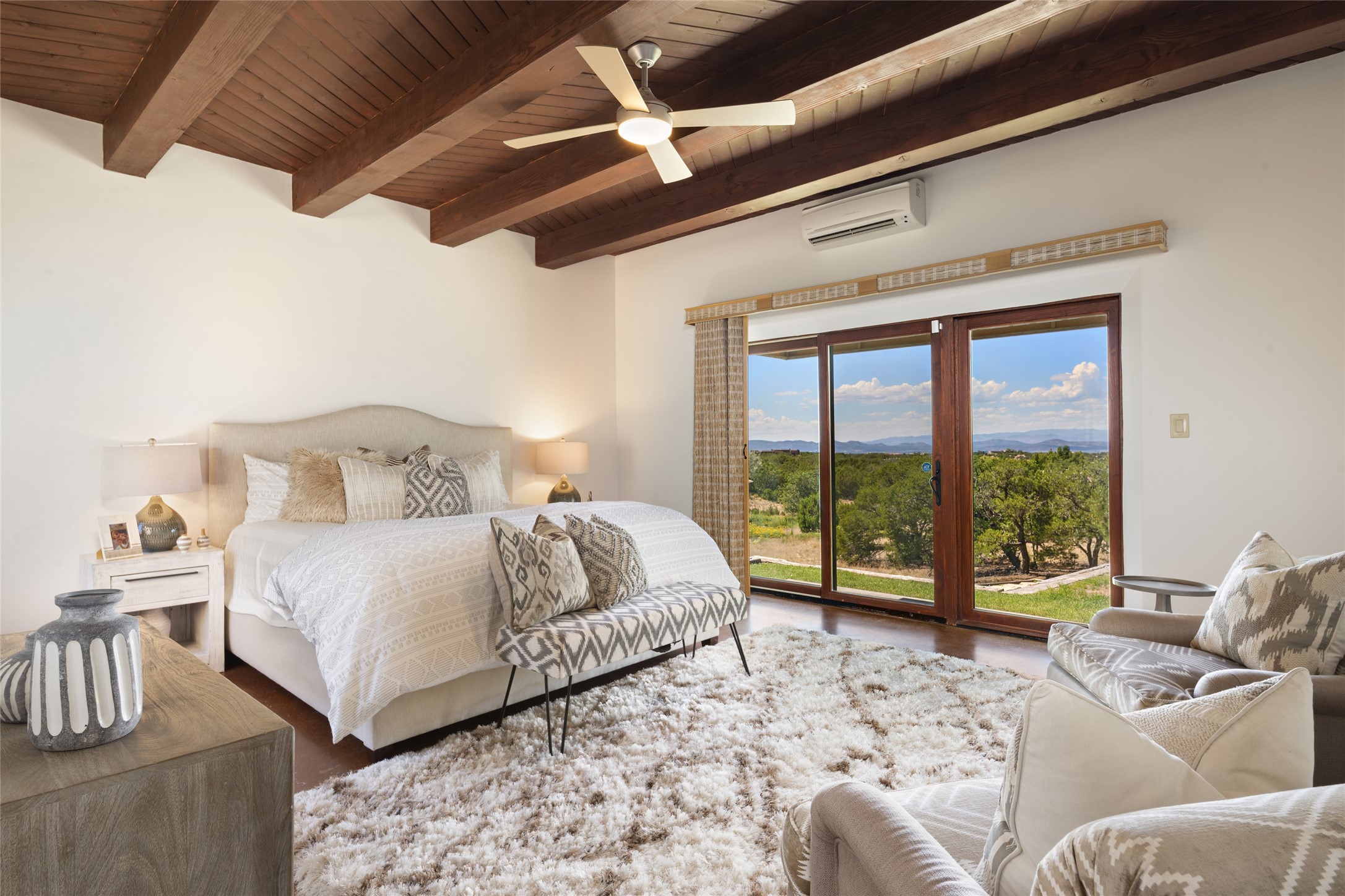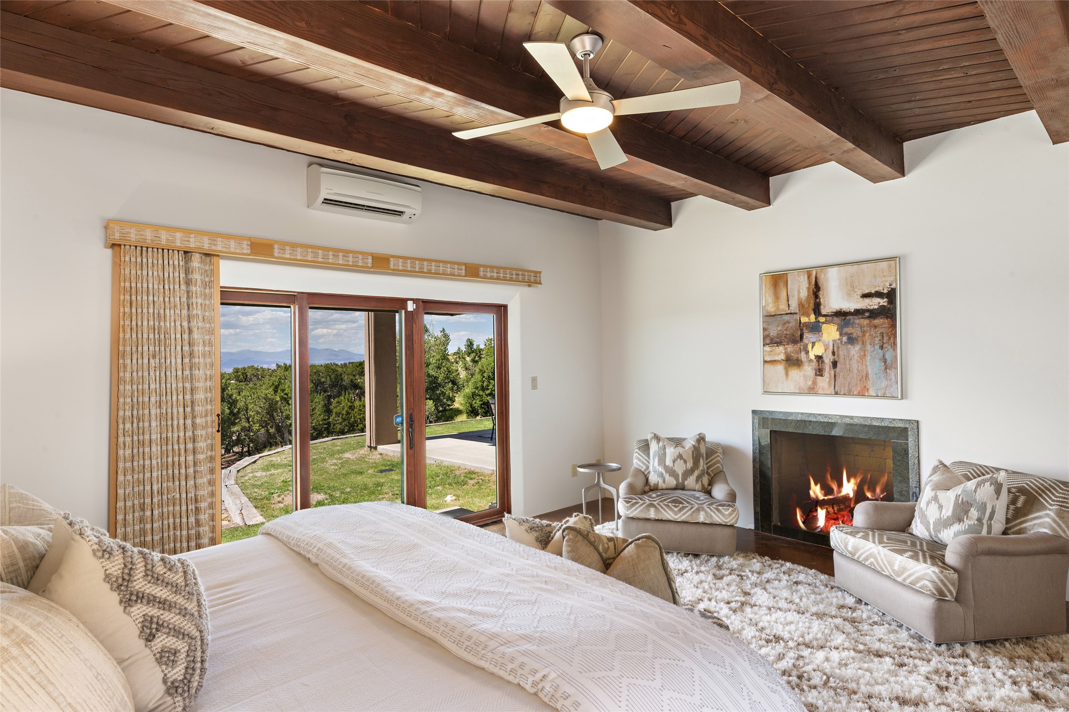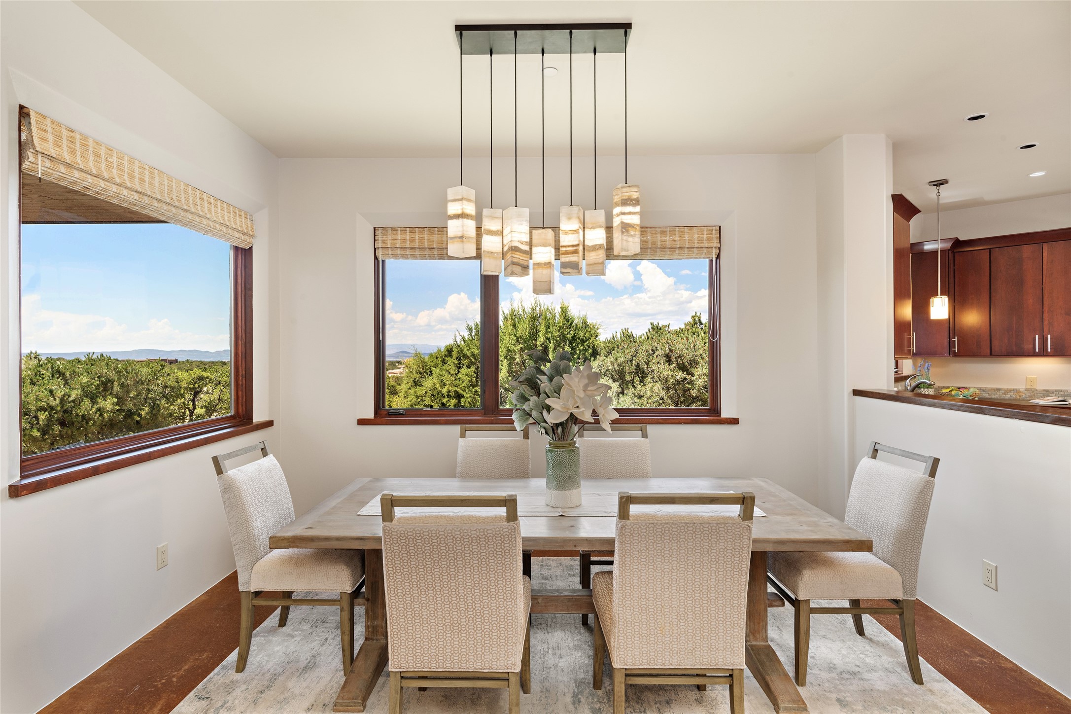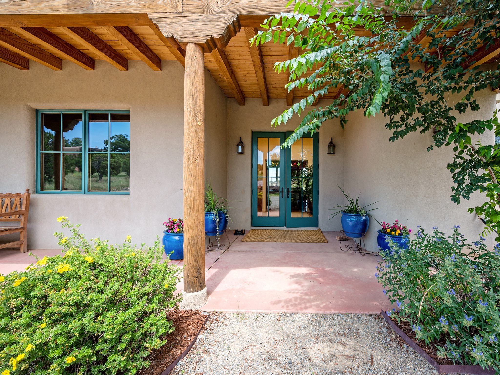 Spectacular views are enjoyed from this lovely home and casita located in the scenic Tano Road area. The main house with its warm colored concrete floors and picture windows offers two living areas, a dedicated office with built-in library shelving, and 3 bedrooms. The primary bedroom suite hosts a fireplace, walk-in closet and spa bathroom with soaking tub and double vanities. Beautiful landscaping enhances three separate outdoor areas, including a living portal perfectly framing the Jemez Mountains and glorious sunset views. A spacious, multi-purpose casita with new kitchen, full bathroom and views of the Sangre de Cristo Mountains has a separate entrance for guests and can also be accessed directly from the oversized 2-car garage. Surrounded by dedicated open space, the desirable Heartstone community includes a clubhouse with a gym and guest quarters which can be reserved at no charge to homeowners. The property is conveniently located for Los Alamos commuters, hiking and biking in the La Tierra Trails, and a quick trip to the amenities in the DeVargas Center. As an added bonus, qualified buyers may assume the existing mortgage at 2.25%, subject to lender approvals.