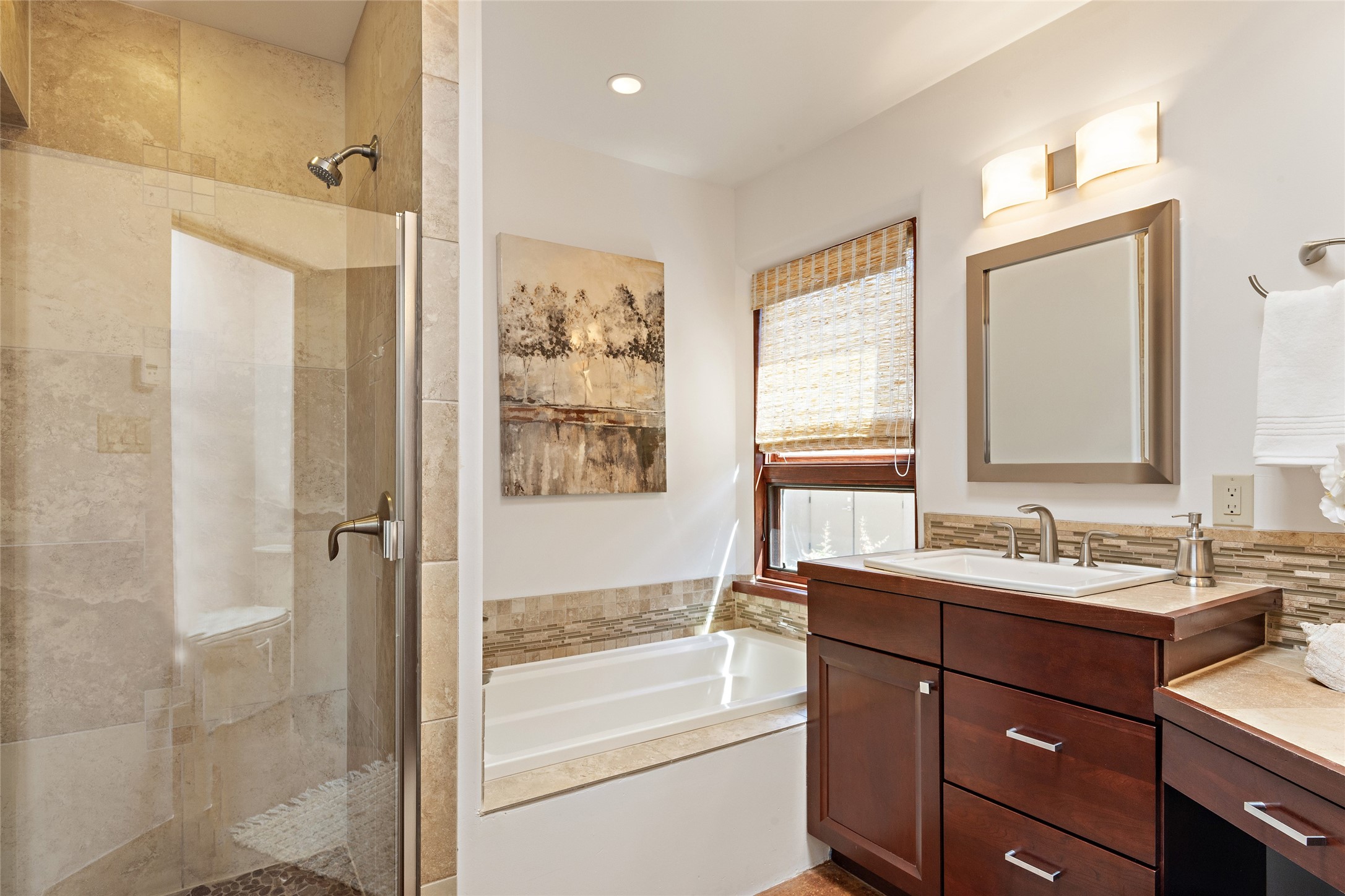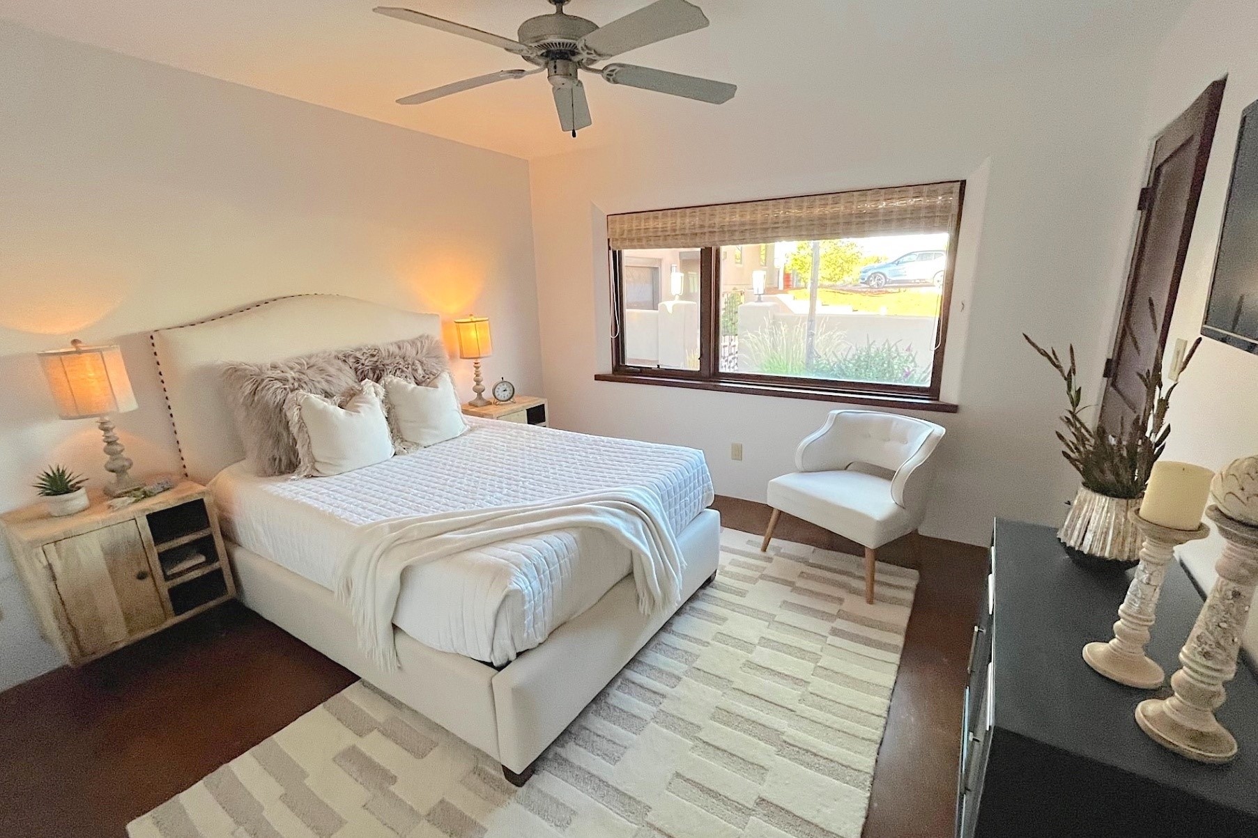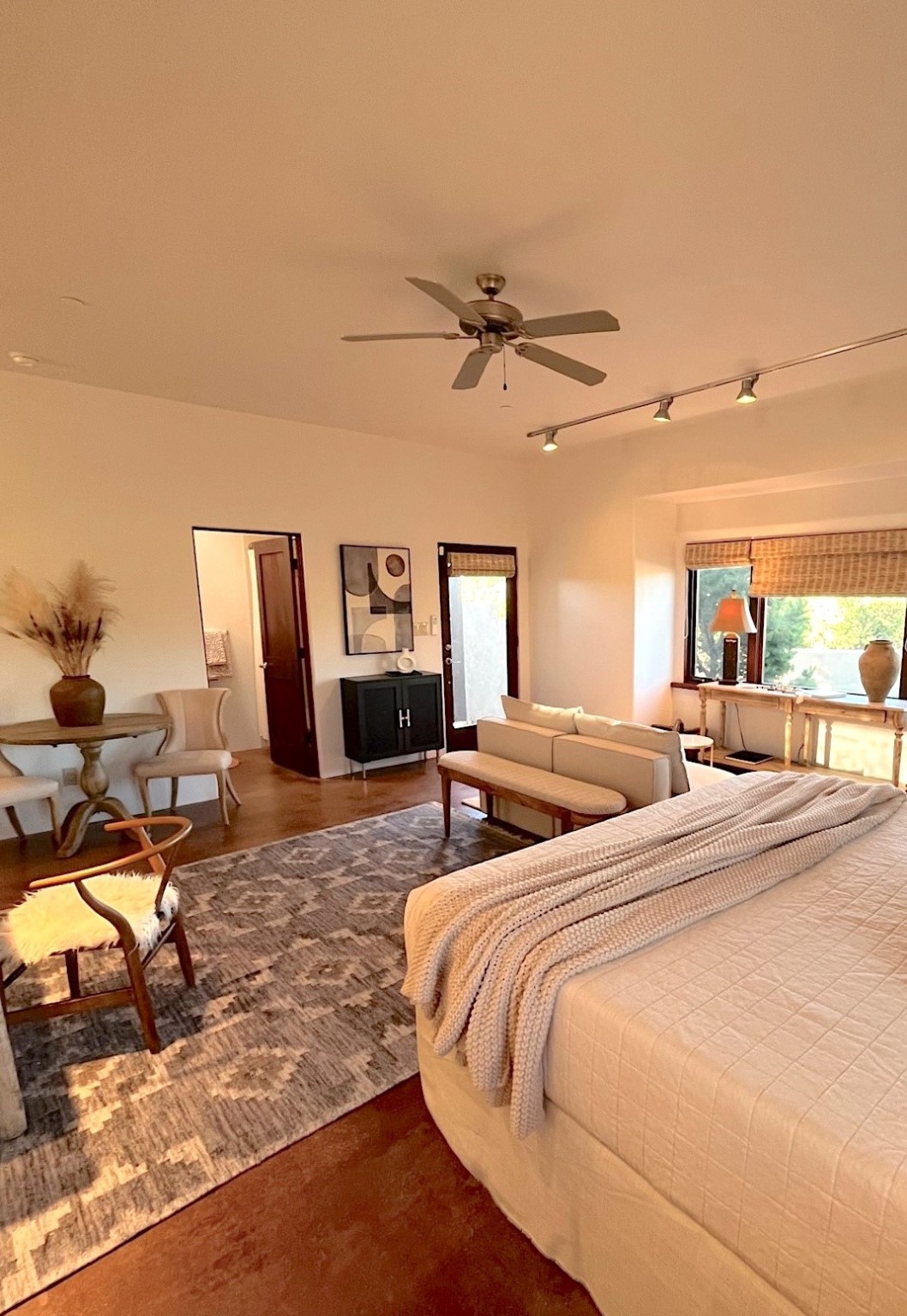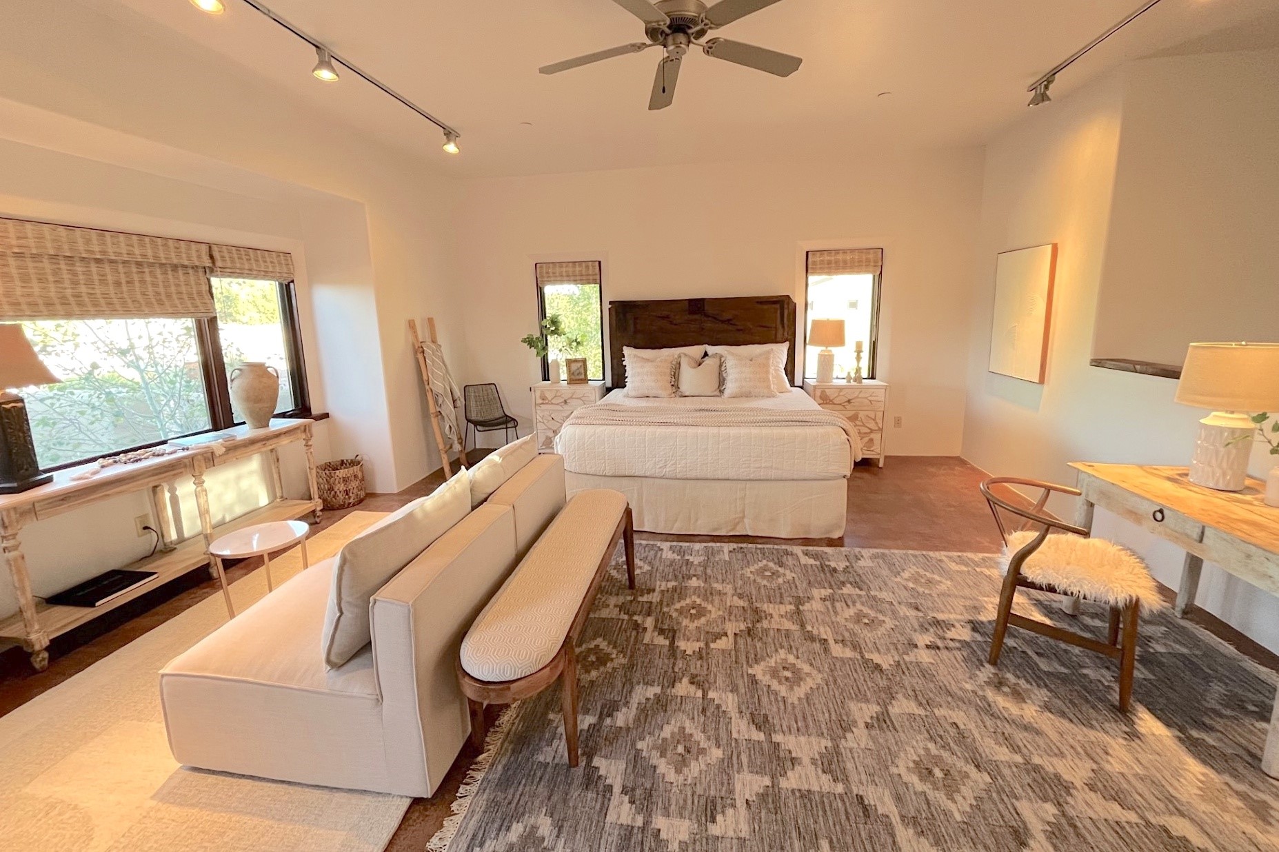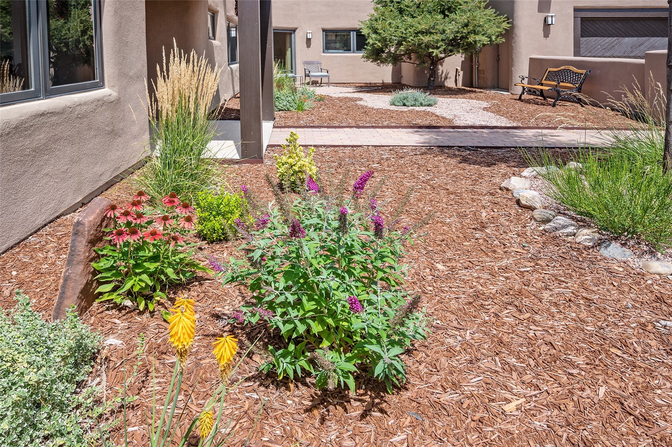 Spectacular views are enjoyed from this lovely home and casita located in the scenic Tano Road area. The main house with its warm colored concrete floors and picture windows offers two living areas, a dedicated office with built-in library shelving, and 3 bedrooms. The primary bedroom suite hosts a fireplace, walk-in closet and spa bathroom with soaking tub and double vanities. Beautiful landscaping enhances three separate outdoor areas, including a living portal perfectly framing the Jemez Mountains and glorious sunset views. A spacious, multi-purpose casita with new kitchen, full bathroom and views of the Sangre de Cristo Mountains has a separate entrance for guests and can also be accessed directly from the oversized 2-car garage. Surrounded by dedicated open space, the desirable Heartstone community includes a clubhouse with a gym and guest quarters which can be reserved at no charge to homeowners. The property is conveniently located for Los Alamos commuters, hiking and biking in the La Tierra Trails, and a quick trip to the amenities in the DeVargas Center. As an added bonus, qualified buyers may assume the existing mortgage at 2.25%, subject to lender approvals.