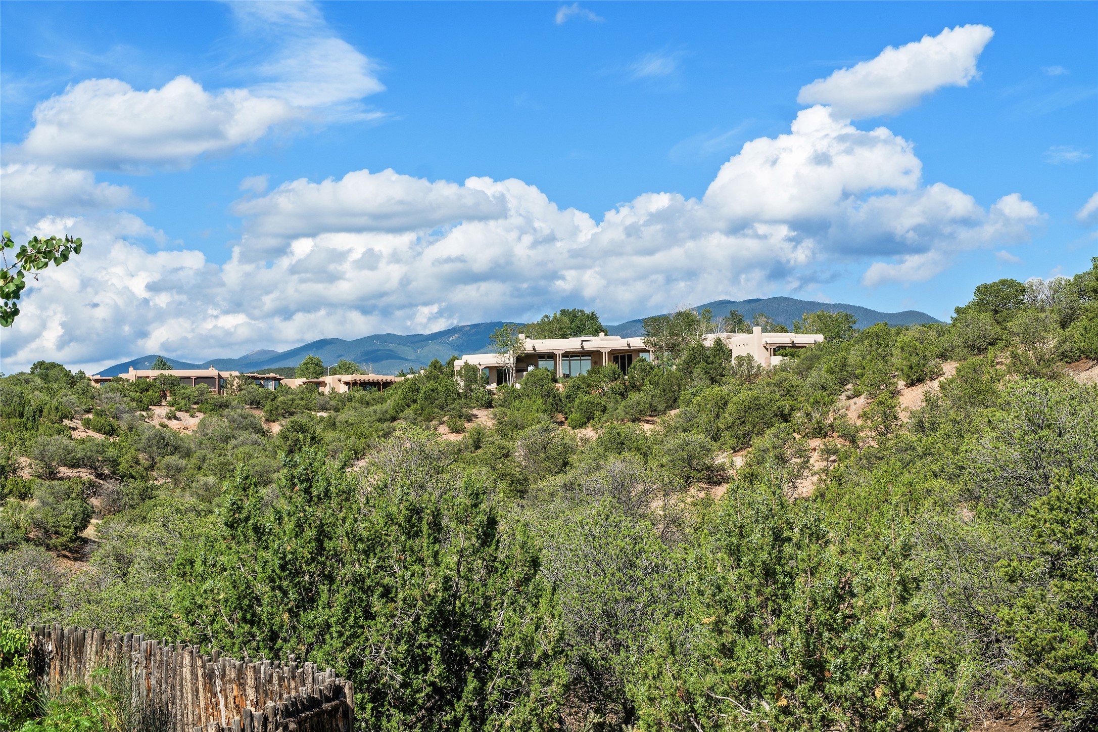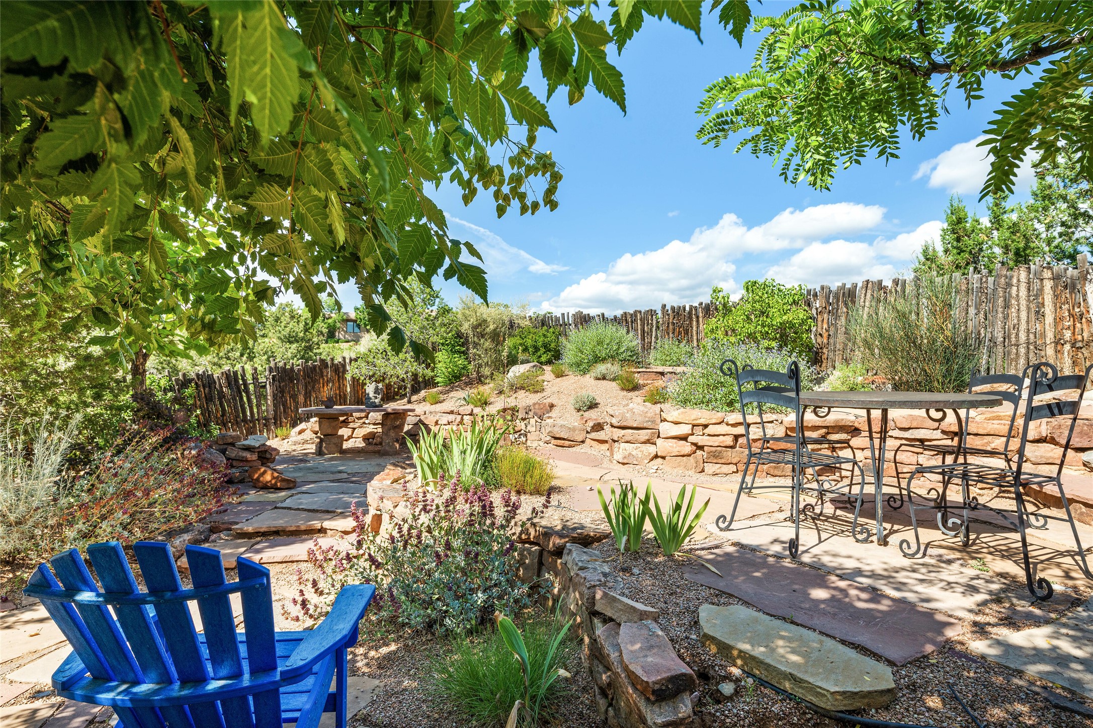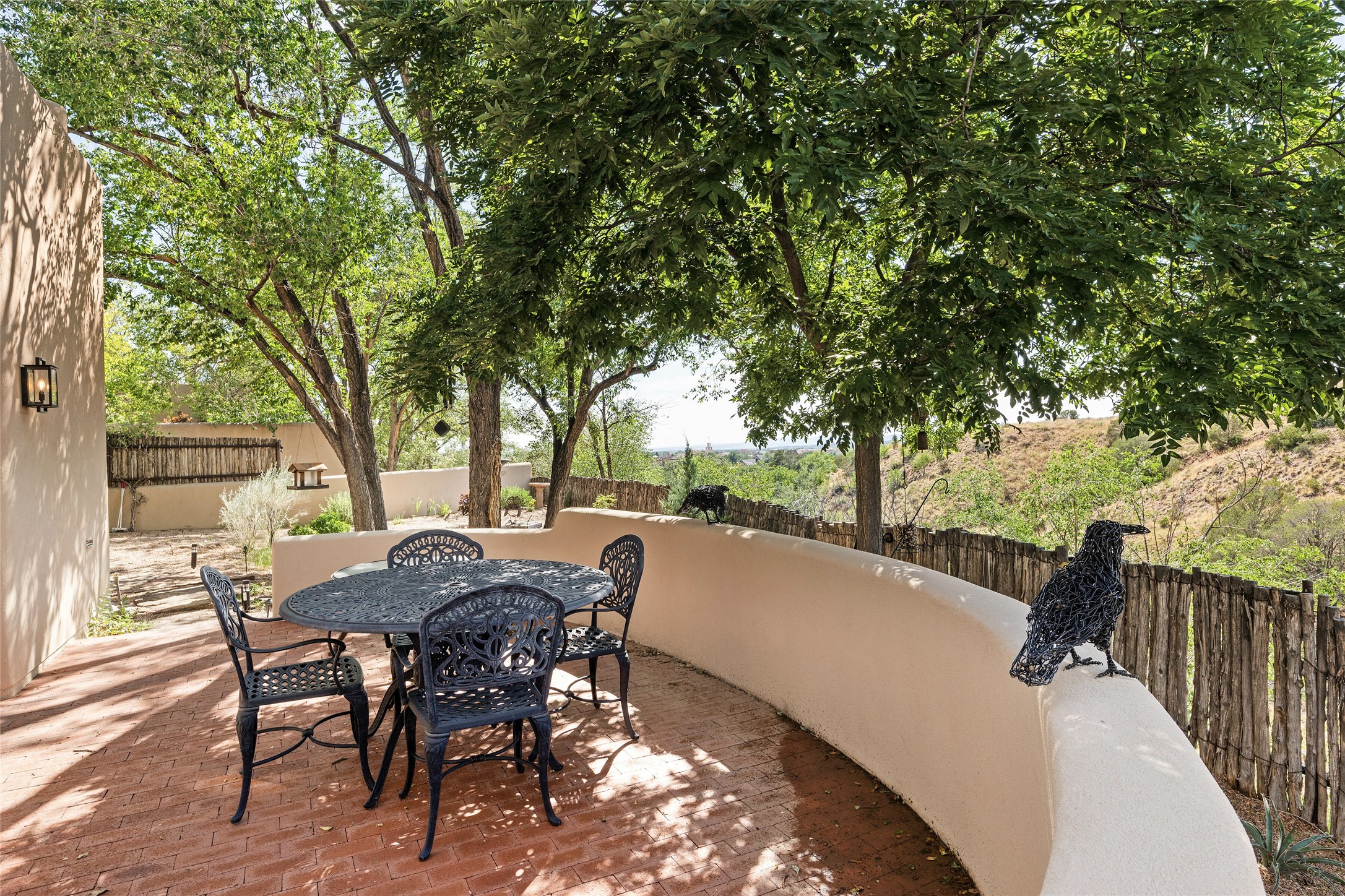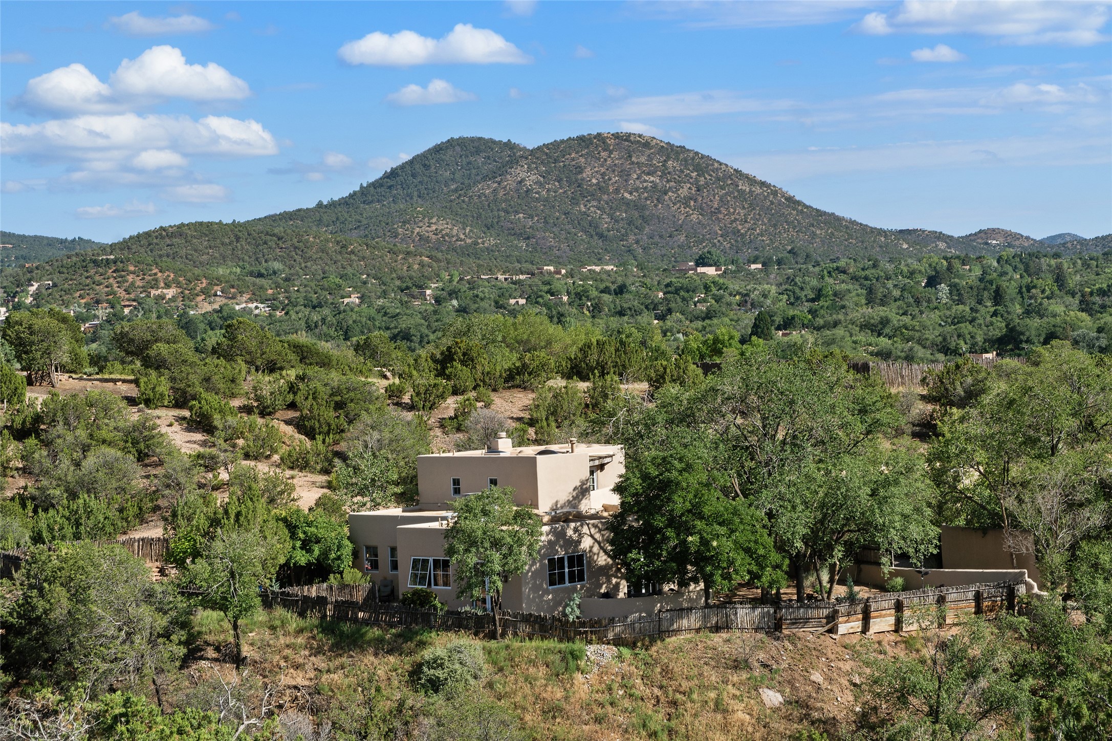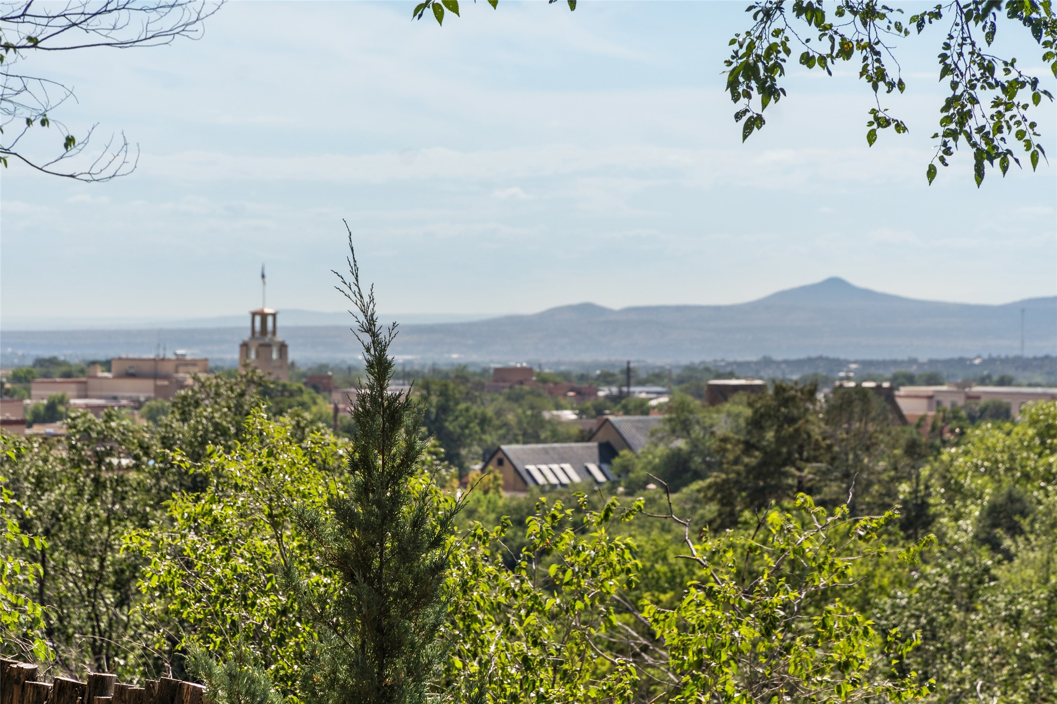 This 3 bedroom, 3 bath property offers a rare opportunity to own a classic Santa Fe style home at the end of one of many charming side streets on Santa Fe's Eastside. Not only does this location offer extreme privacy but perched on the edge of a hill, it was sited to enjoy exclusive views of some of the City Different's most iconic landmarks. With Saltillo tile floors, thick diamond plaster walls, a liberal use of artisan tiles, corbel flourishes and distressed wood kitchen cabinetry, there is no shortage of regional motifs translating traditional New Mexico style into a relaxed and comfortable environment. The main floor features a generously sized kitchen opening to an expansive dining and living room area. From these living spaces, glass doors lead to a patio area for outdoor leisure and entertaining. A large fireplace with its curved hearth and carved wooden mantel is the focal point of the living room. Off the central living area are additional accommodations for family or guests: an office and two bedroom suites. A curved wooden staircase with iron balustrade leads to the upstairs primary suite. Glass doors on opposite walls of the bedroom bathe the room in natural light and allow for access to a balcony on one side and to an outside staircase on the other. Other features include a fully fenced yard, a two car attached garage, and a neighborhood rich in all things Santa Fe.