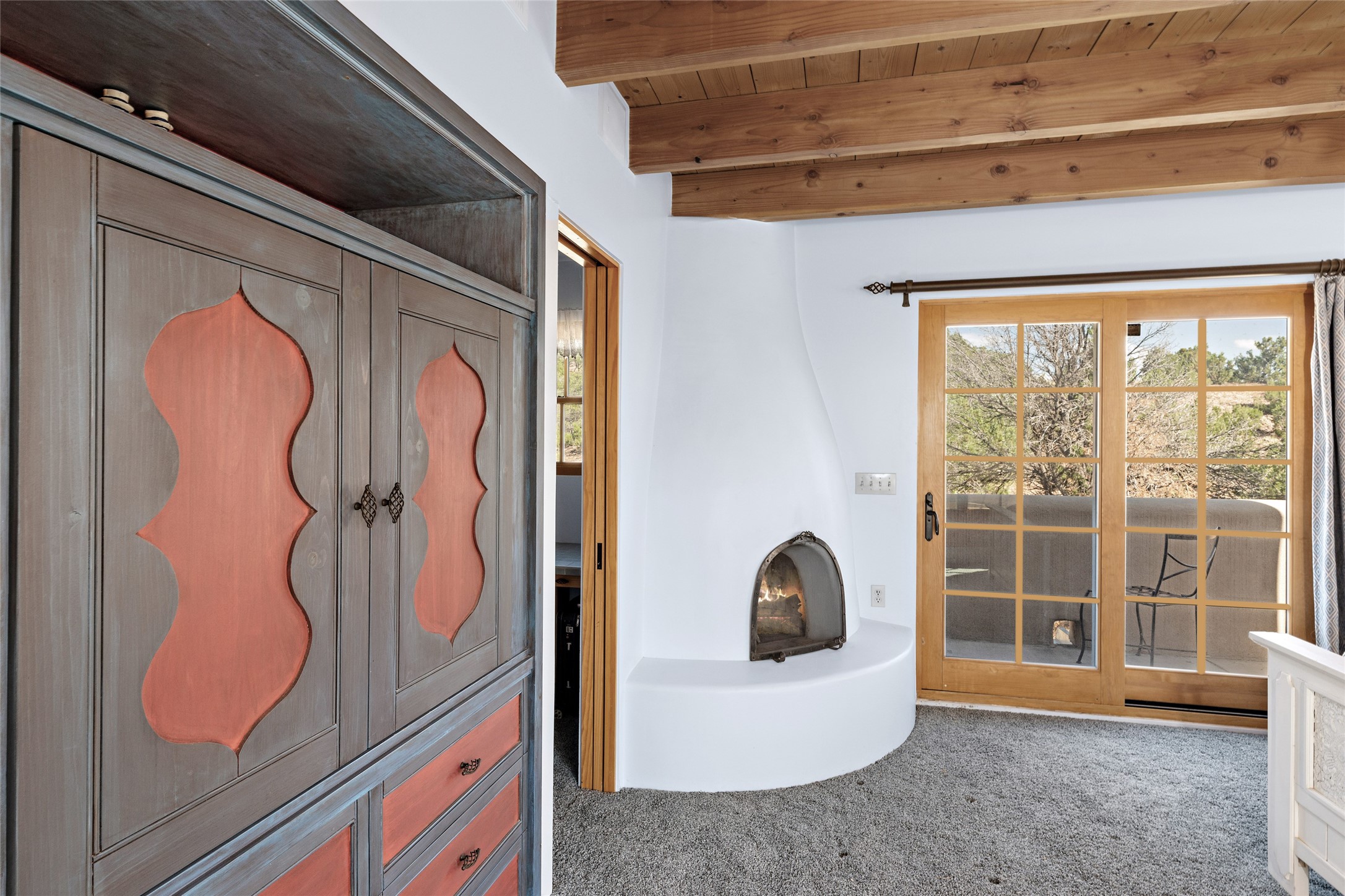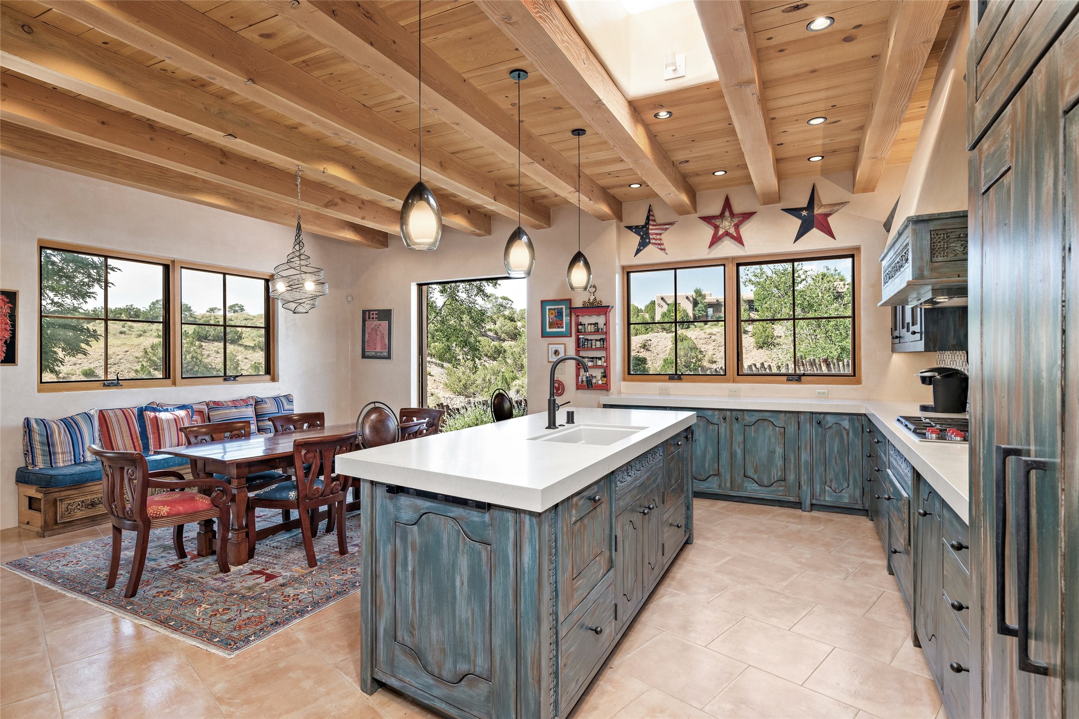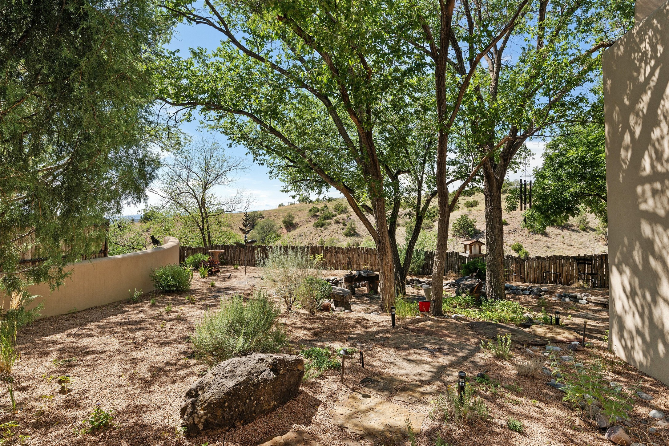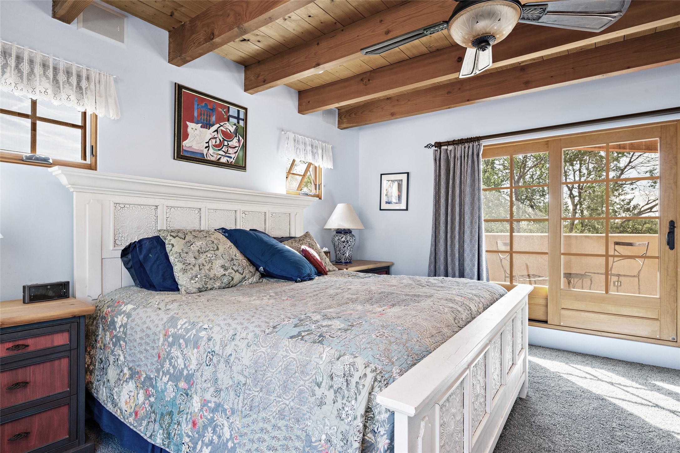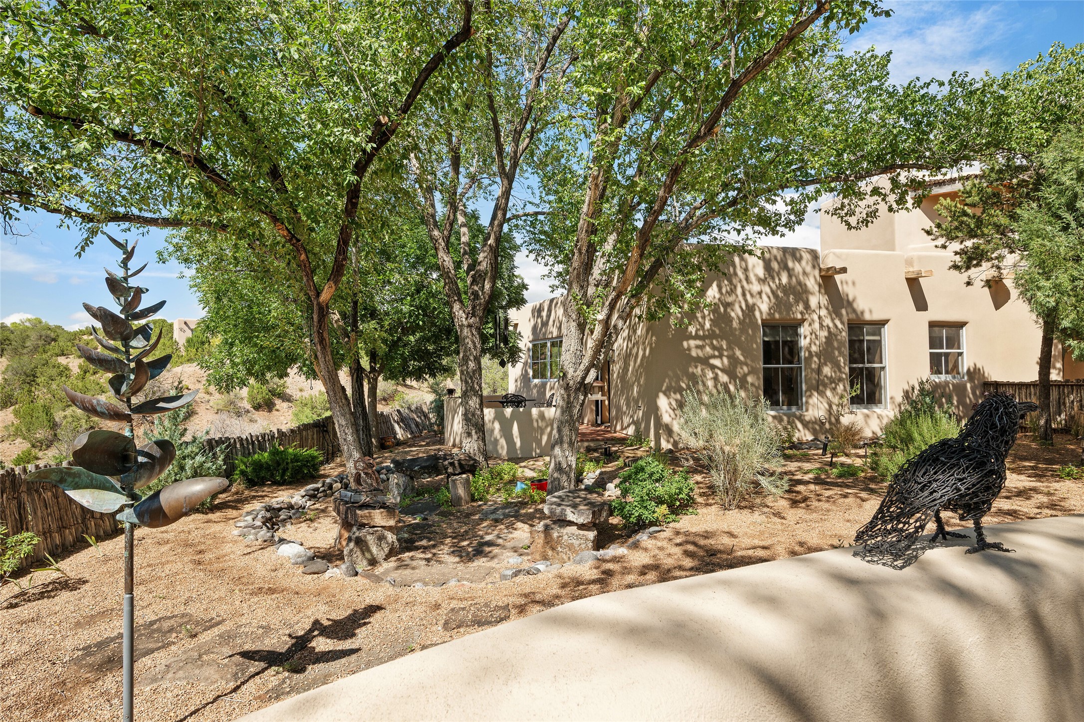 This 3 bedroom, 3 bath property offers a rare opportunity to own a classic Santa Fe style home at the end of one of many charming side streets on Santa Fe's Eastside. Not only does this location offer extreme privacy but perched on the edge of a hill, it was sited to enjoy exclusive views of some of the City Different's most iconic landmarks. With Saltillo tile floors, thick diamond plaster walls, a liberal use of artisan tiles, corbel flourishes and distressed wood kitchen cabinetry, there is no shortage of regional motifs translating traditional New Mexico style into a relaxed and comfortable environment. The main floor features a generously sized kitchen opening to an expansive dining and living room area. From these living spaces, glass doors lead to a patio area for outdoor leisure and entertaining. A large fireplace with its curved hearth and carved wooden mantel is the focal point of the living room. Off the central living area are additional accommodations for family or guests: an office and two bedroom suites. A curved wooden staircase with iron balustrade leads to the upstairs primary suite. Glass doors on opposite walls of the bedroom bathe the room in natural light and allow for access to a balcony on one side and to an outside staircase on the other. Other features include a fully fenced yard, a two car attached garage, and a neighborhood rich in all things Santa Fe.