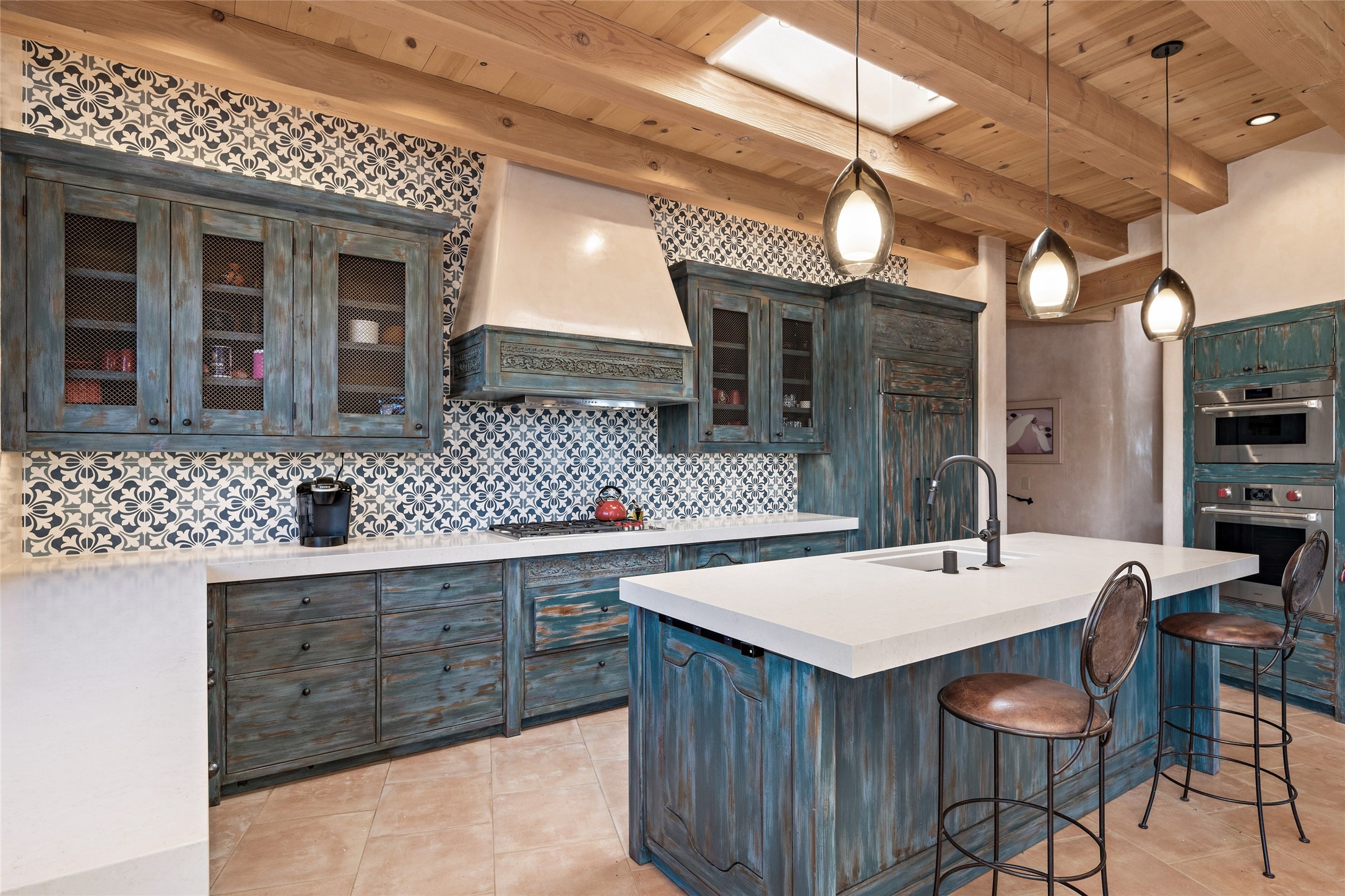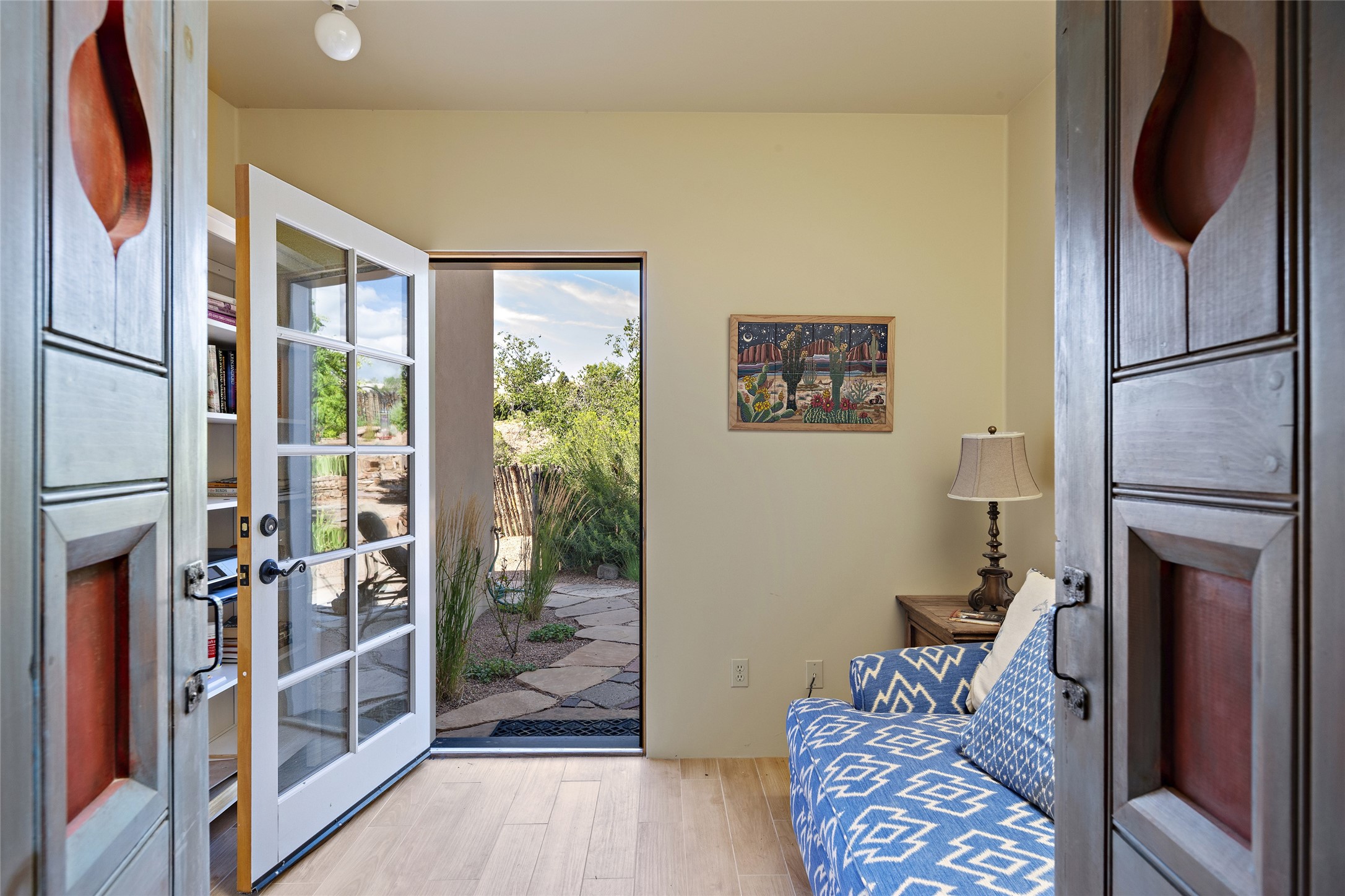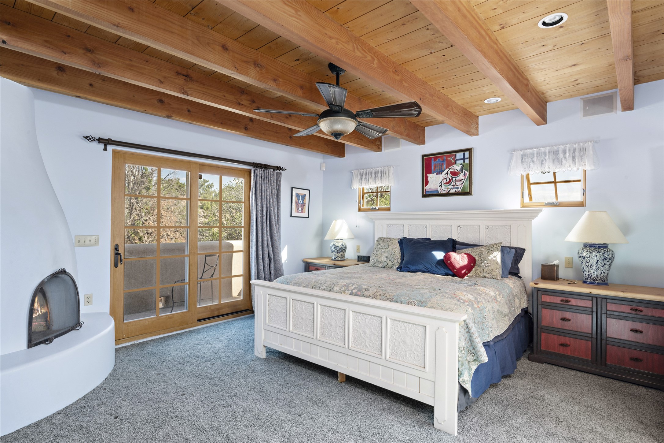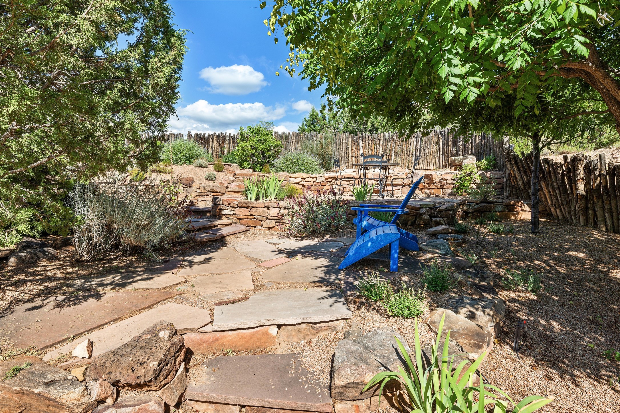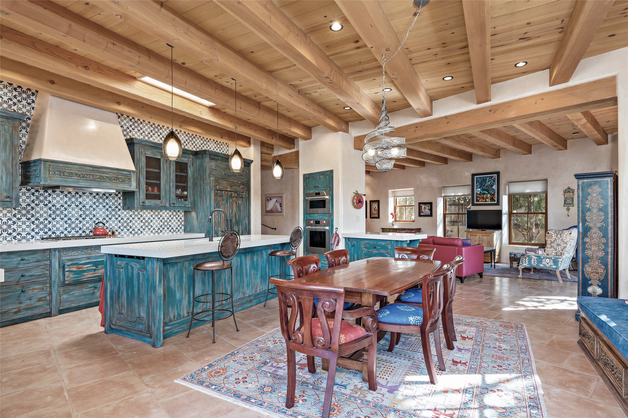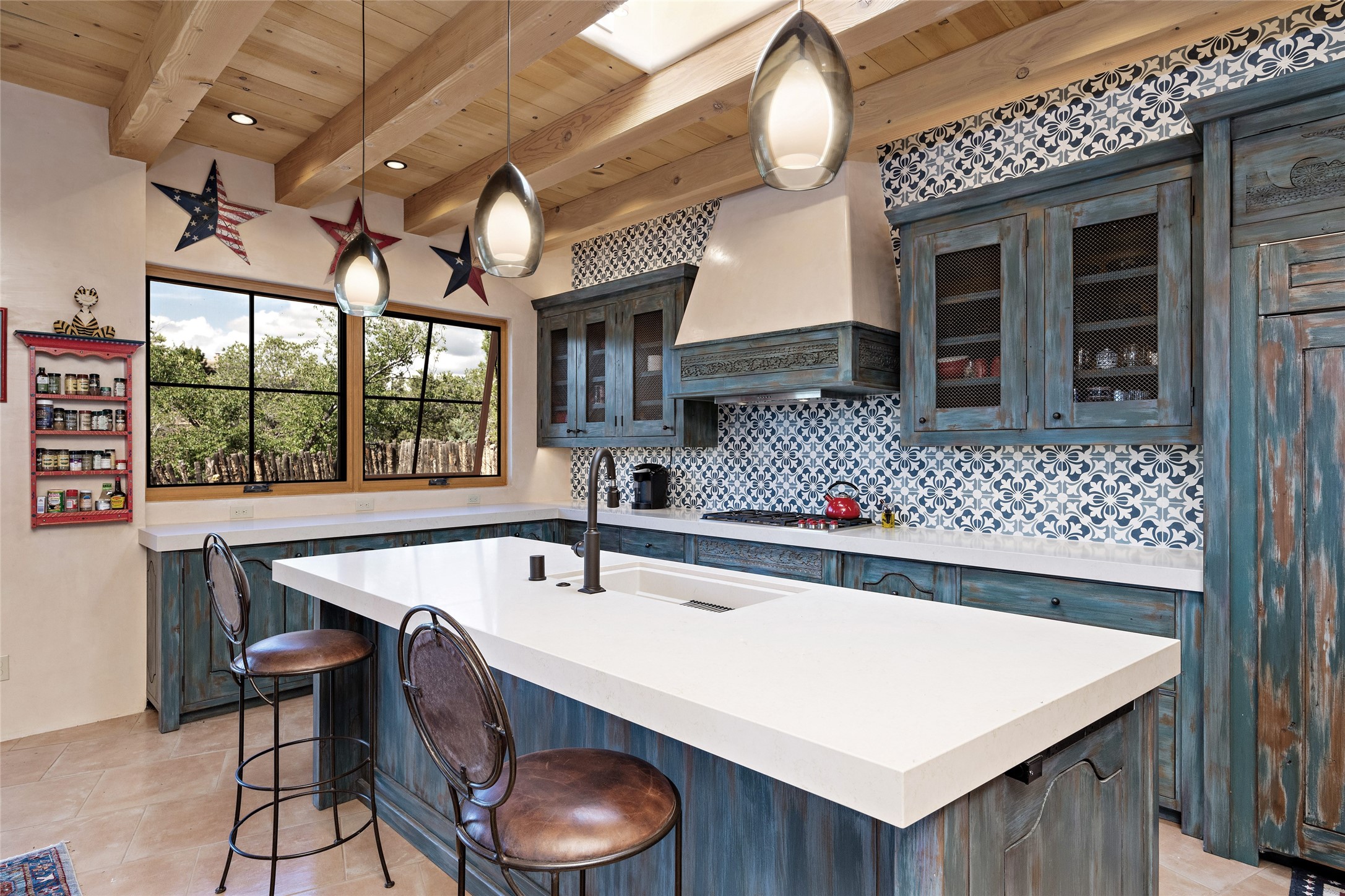 This 3 bedroom, 3 bath property offers a rare opportunity to own a classic Santa Fe style home at the end of one of many charming side streets on Santa Fe's Eastside. Not only does this location offer extreme privacy but perched on the edge of a hill, it was sited to enjoy exclusive views of some of the City Different's most iconic landmarks. With Saltillo tile floors, thick diamond plaster walls, a liberal use of artisan tiles, corbel flourishes and distressed wood kitchen cabinetry, there is no shortage of regional motifs translating traditional New Mexico style into a relaxed and comfortable environment. The main floor features a generously sized kitchen opening to an expansive dining and living room area. From these living spaces, glass doors lead to a patio area for outdoor leisure and entertaining. A large fireplace with its curved hearth and carved wooden mantel is the focal point of the living room. Off the central living area are additional accommodations for family or guests: an office and two bedroom suites. A curved wooden staircase with iron balustrade leads to the upstairs primary suite. Glass doors on opposite walls of the bedroom bathe the room in natural light and allow for access to a balcony on one side and to an outside staircase on the other. Other features include a fully fenced yard, a two car attached garage, and a neighborhood rich in all things Santa Fe.