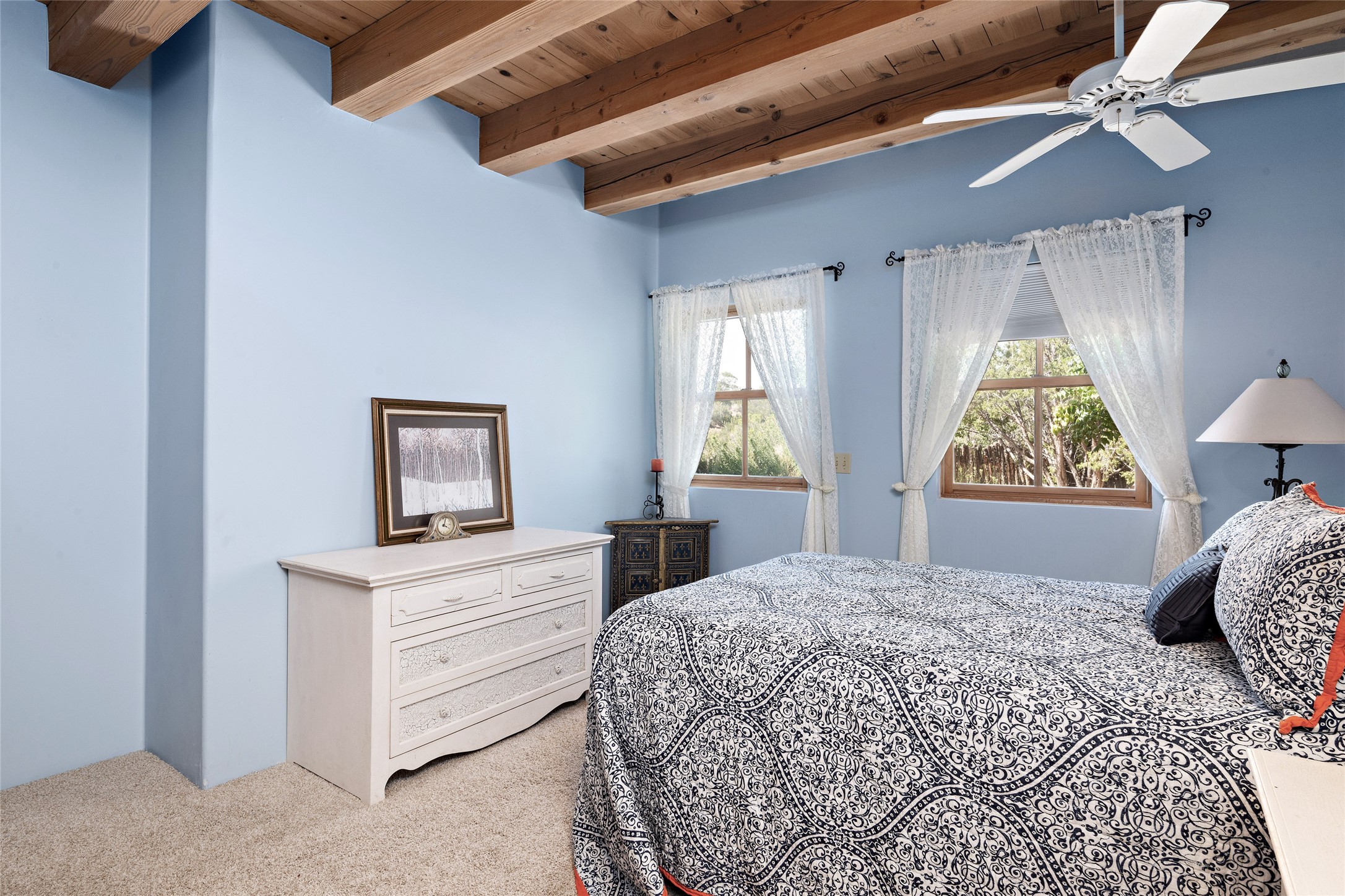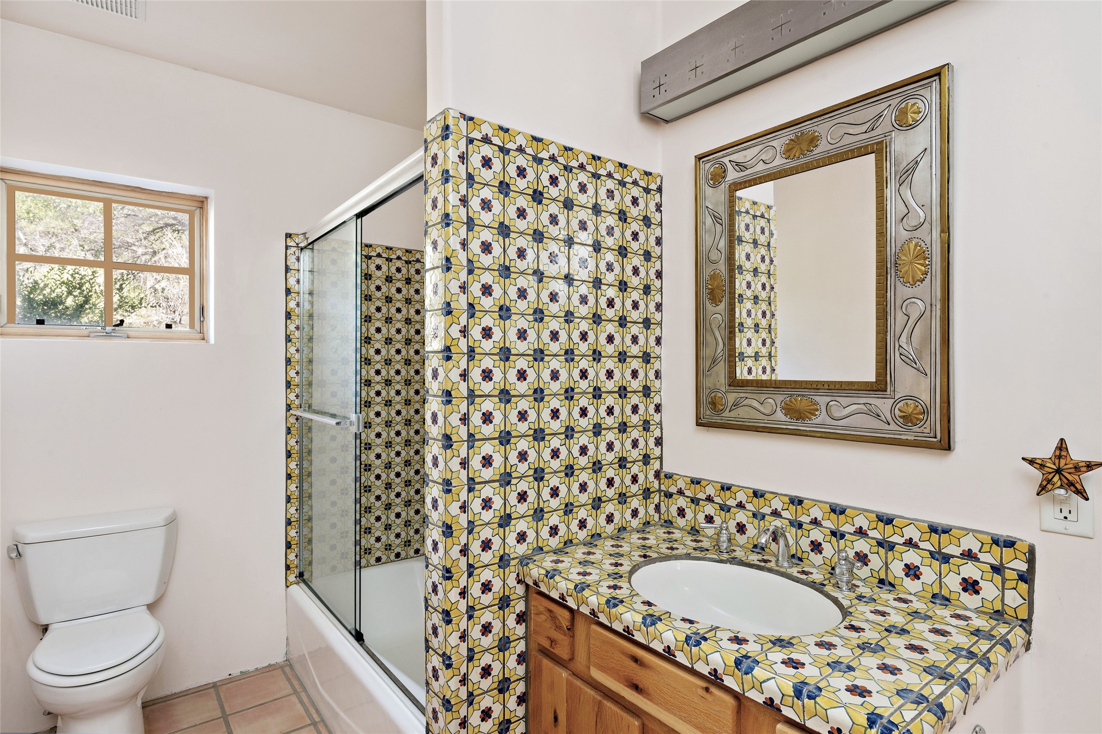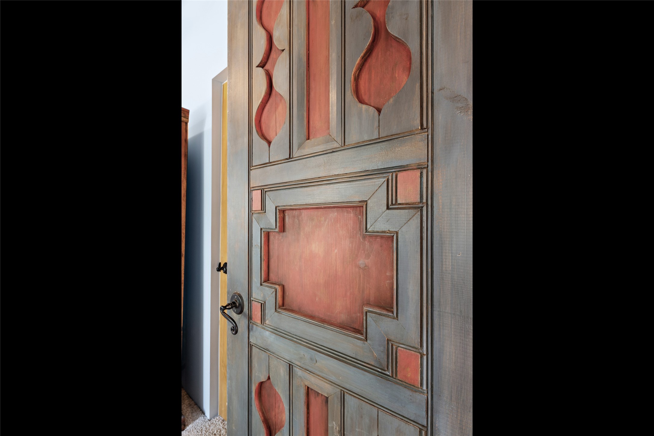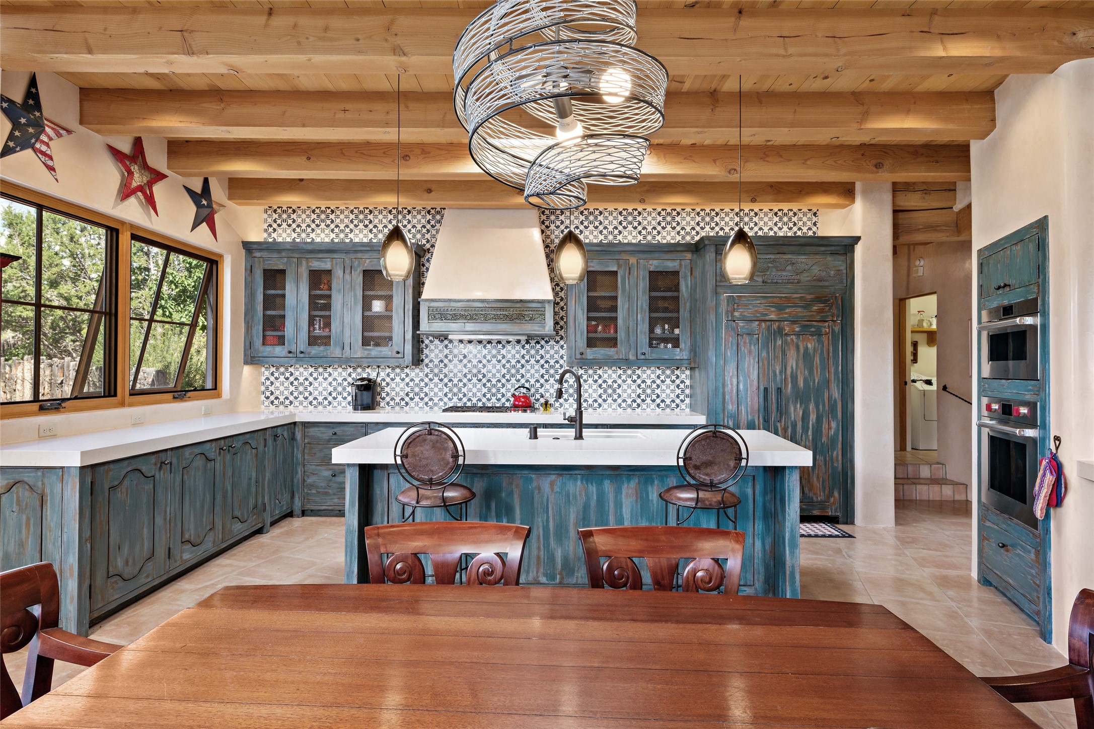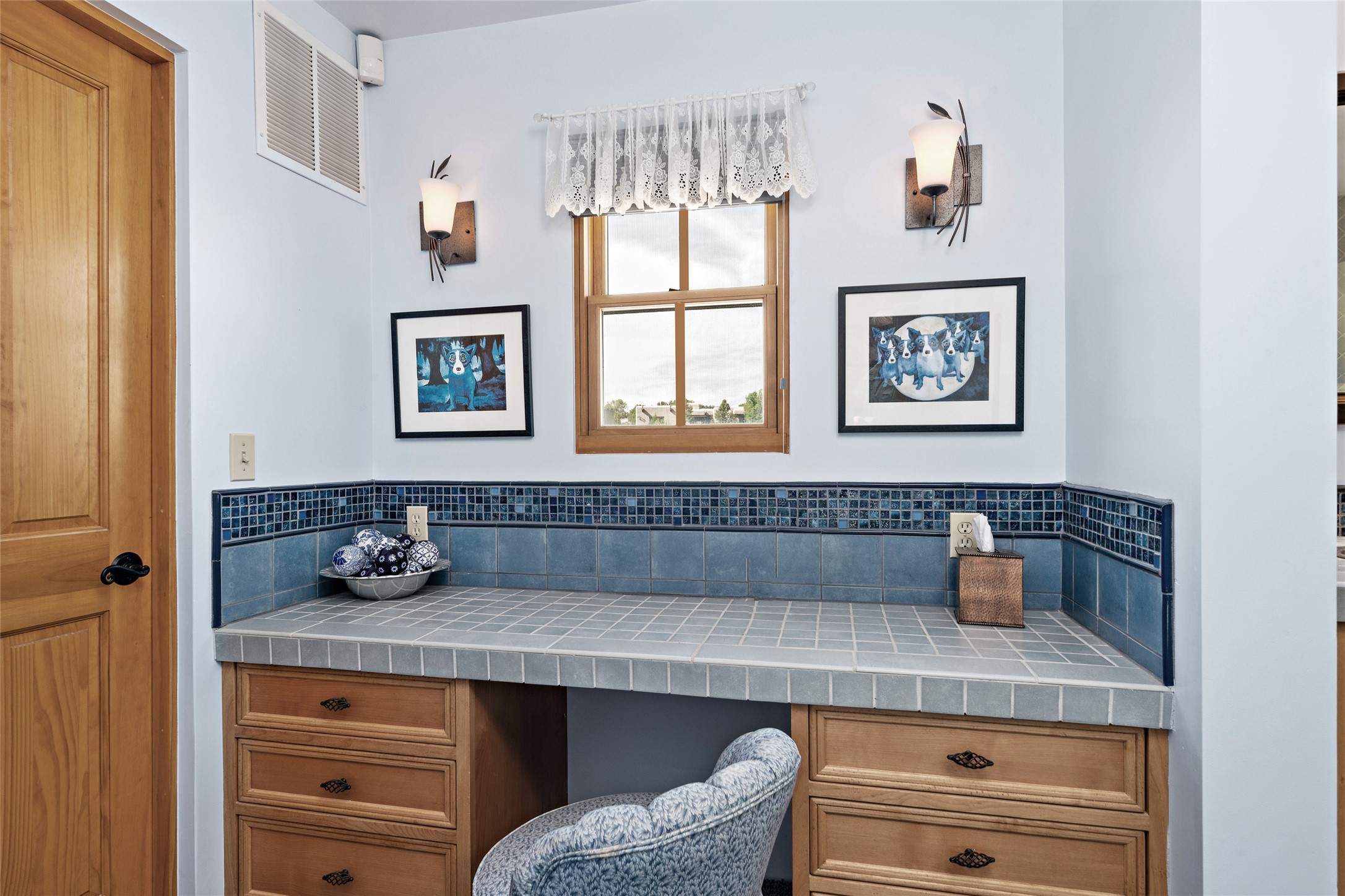 This 3 bedroom, 3 bath property offers a rare opportunity to own a classic Santa Fe style home at the end of one of many charming side streets on Santa Fe's Eastside. Not only does this location offer extreme privacy but perched on the edge of a hill, it was sited to enjoy exclusive views of some of the City Different's most iconic landmarks. With Saltillo tile floors, thick diamond plaster walls, a liberal use of artisan tiles, corbel flourishes and distressed wood kitchen cabinetry, there is no shortage of regional motifs translating traditional New Mexico style into a relaxed and comfortable environment. The main floor features a generously sized kitchen opening to an expansive dining and living room area. From these living spaces, glass doors lead to a patio area for outdoor leisure and entertaining. A large fireplace with its curved hearth and carved wooden mantel is the focal point of the living room. Off the central living area are additional accommodations for family or guests: an office and two bedroom suites. A curved wooden staircase with iron balustrade leads to the upstairs primary suite. Glass doors on opposite walls of the bedroom bathe the room in natural light and allow for access to a balcony on one side and to an outside staircase on the other. Other features include a fully fenced yard, a two car attached garage, and a neighborhood rich in all things Santa Fe.