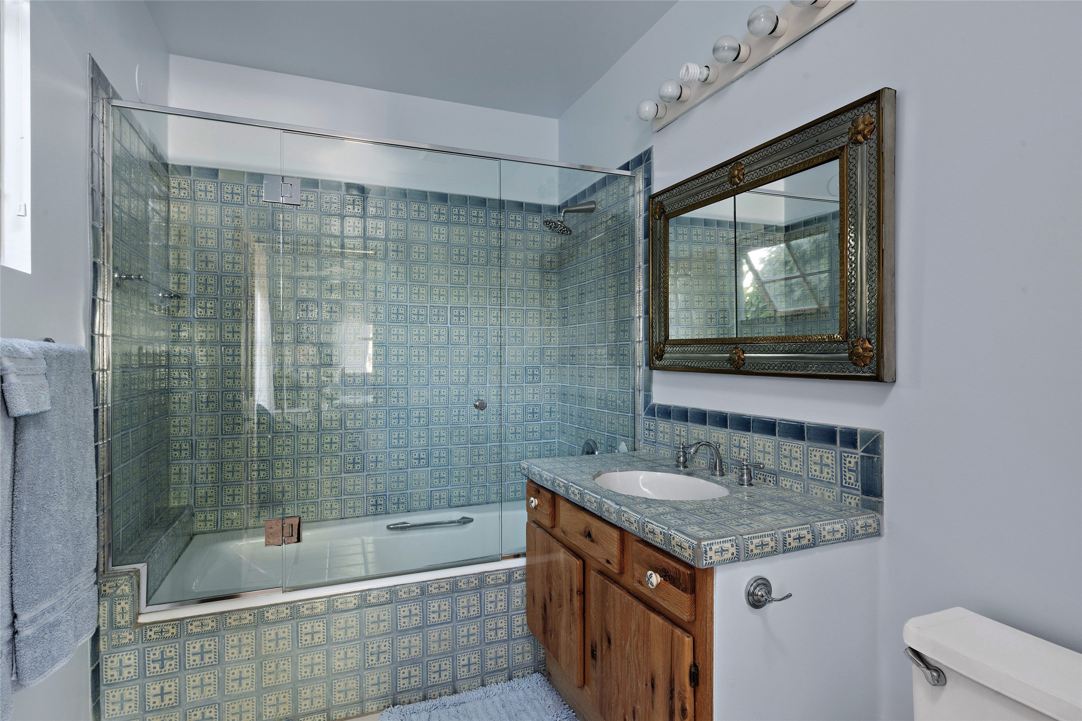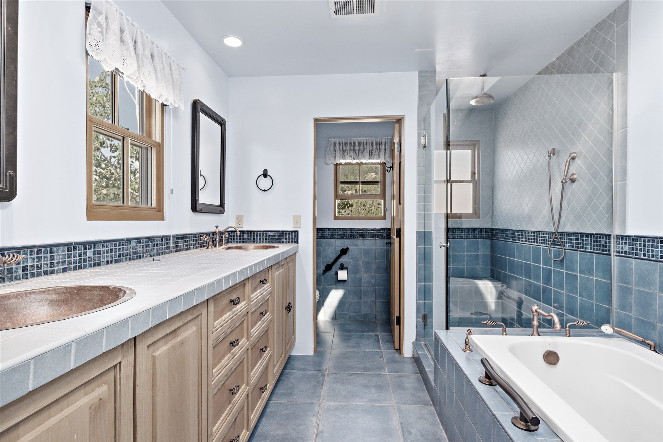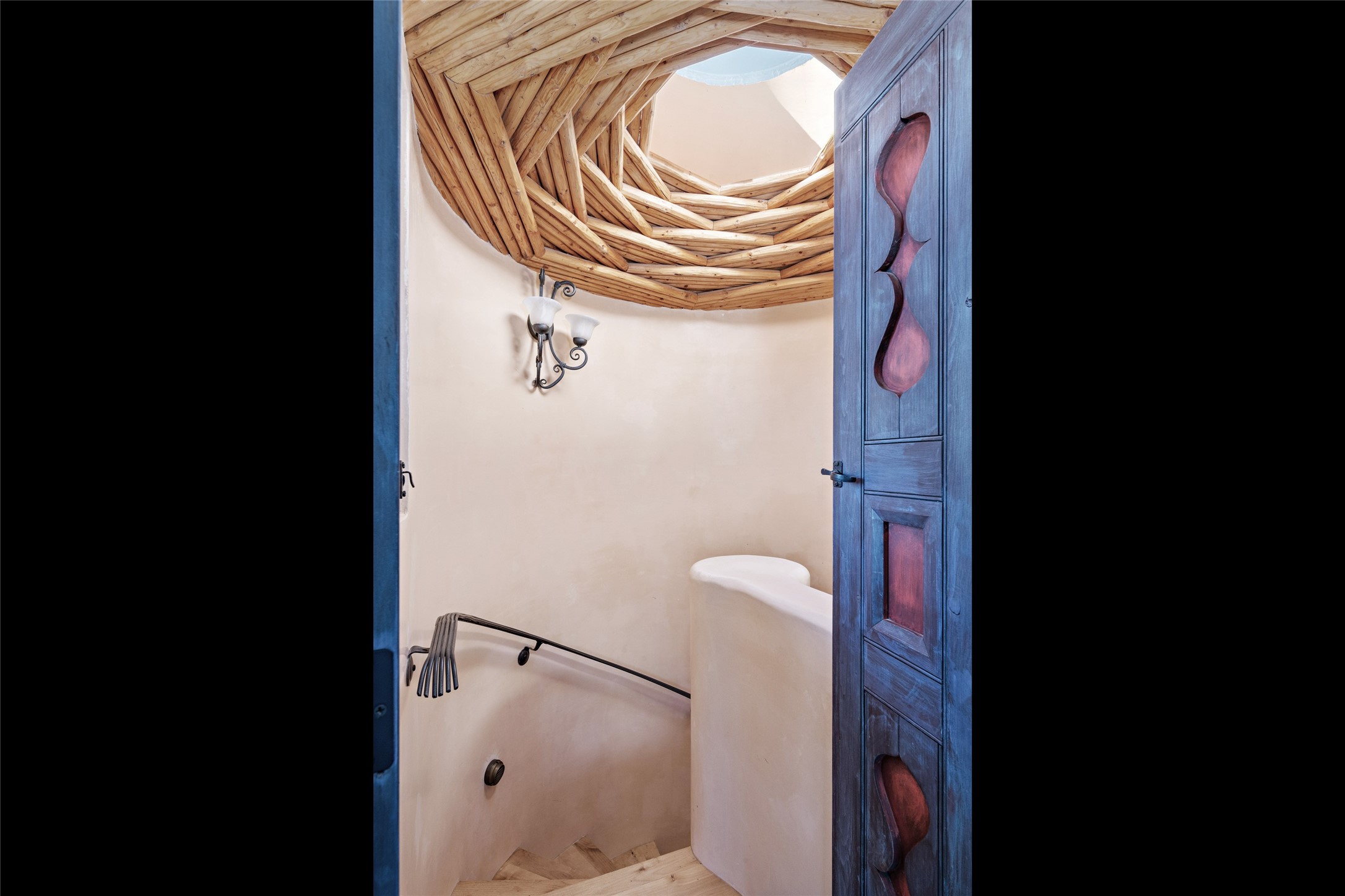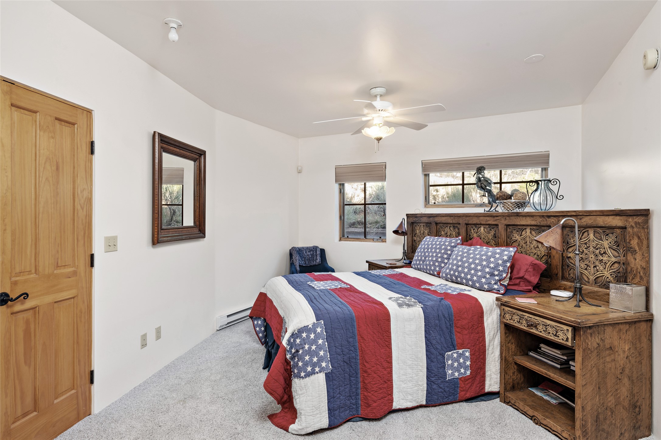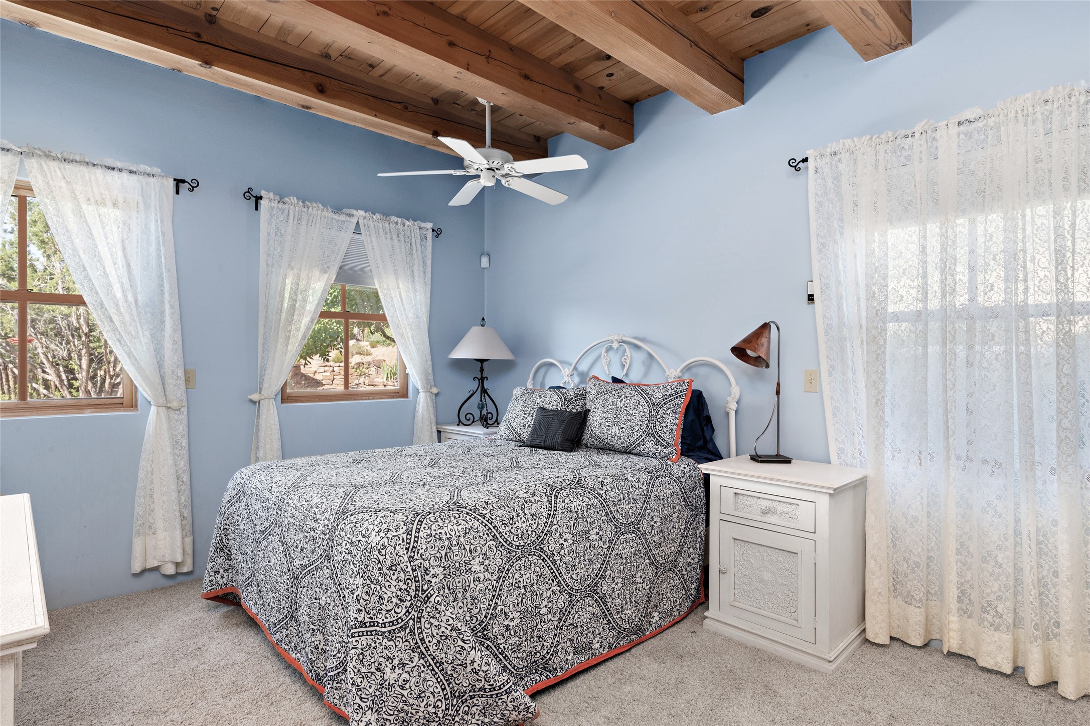 This 3 bedroom, 3 bath property offers a rare opportunity to own a classic Santa Fe style home at the end of one of many charming side streets on Santa Fe's Eastside. Not only does this location offer extreme privacy but perched on the edge of a hill, it was sited to enjoy exclusive views of some of the City Different's most iconic landmarks. With Saltillo tile floors, thick diamond plaster walls, a liberal use of artisan tiles, corbel flourishes and distressed wood kitchen cabinetry, there is no shortage of regional motifs translating traditional New Mexico style into a relaxed and comfortable environment. The main floor features a generously sized kitchen opening to an expansive dining and living room area. From these living spaces, glass doors lead to a patio area for outdoor leisure and entertaining. A large fireplace with its curved hearth and carved wooden mantel is the focal point of the living room. Off the central living area are additional accommodations for family or guests: an office and two bedroom suites. A curved wooden staircase with iron balustrade leads to the upstairs primary suite. Glass doors on opposite walls of the bedroom bathe the room in natural light and allow for access to a balcony on one side and to an outside staircase on the other. Other features include a fully fenced yard, a two car attached garage, and a neighborhood rich in all things Santa Fe.