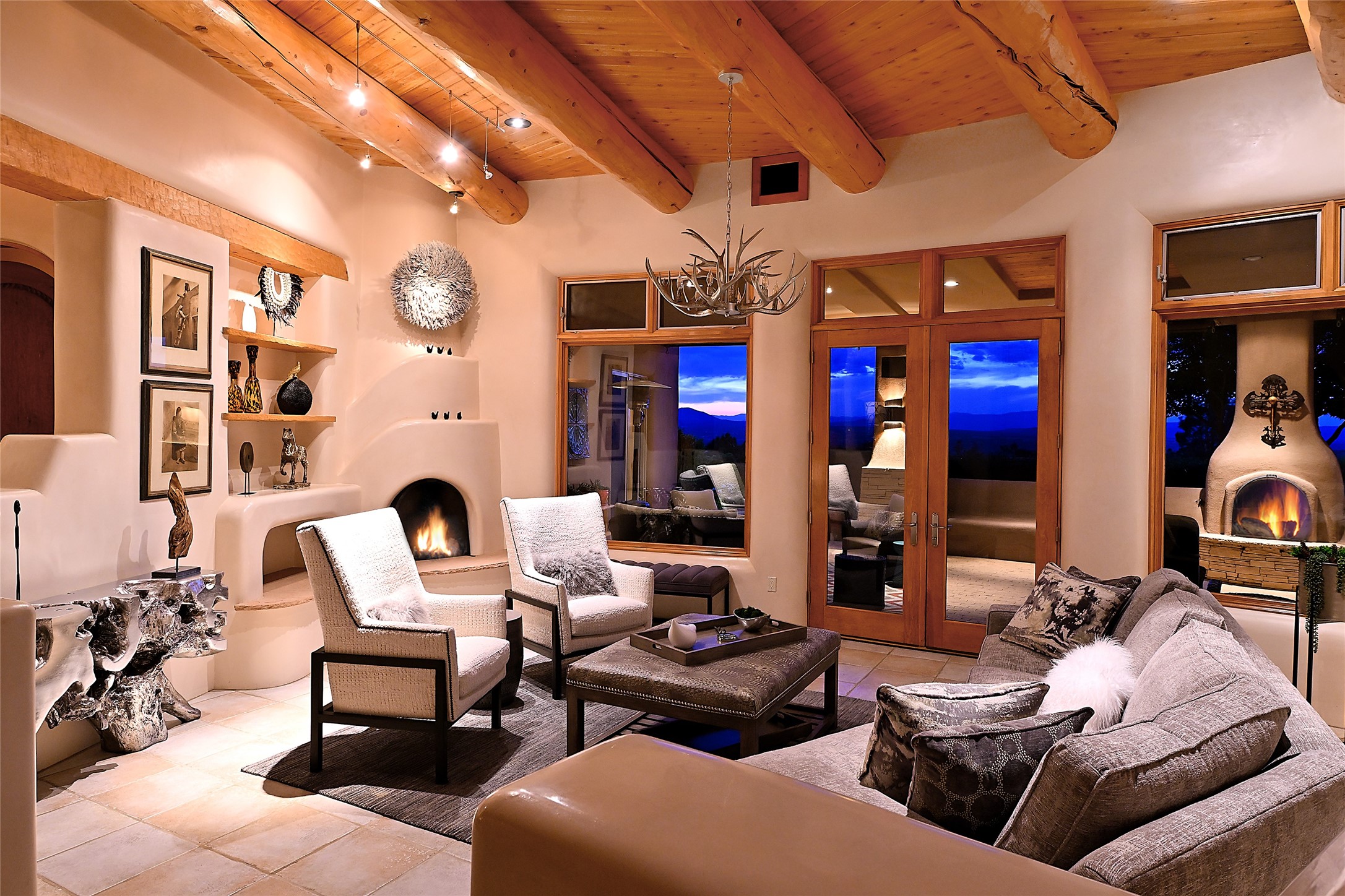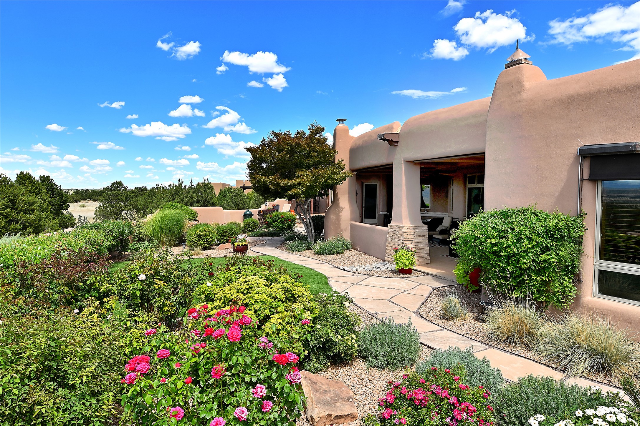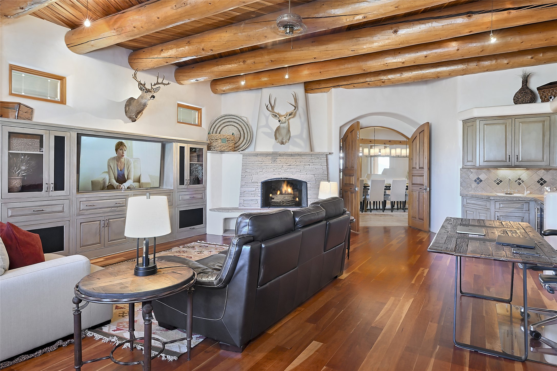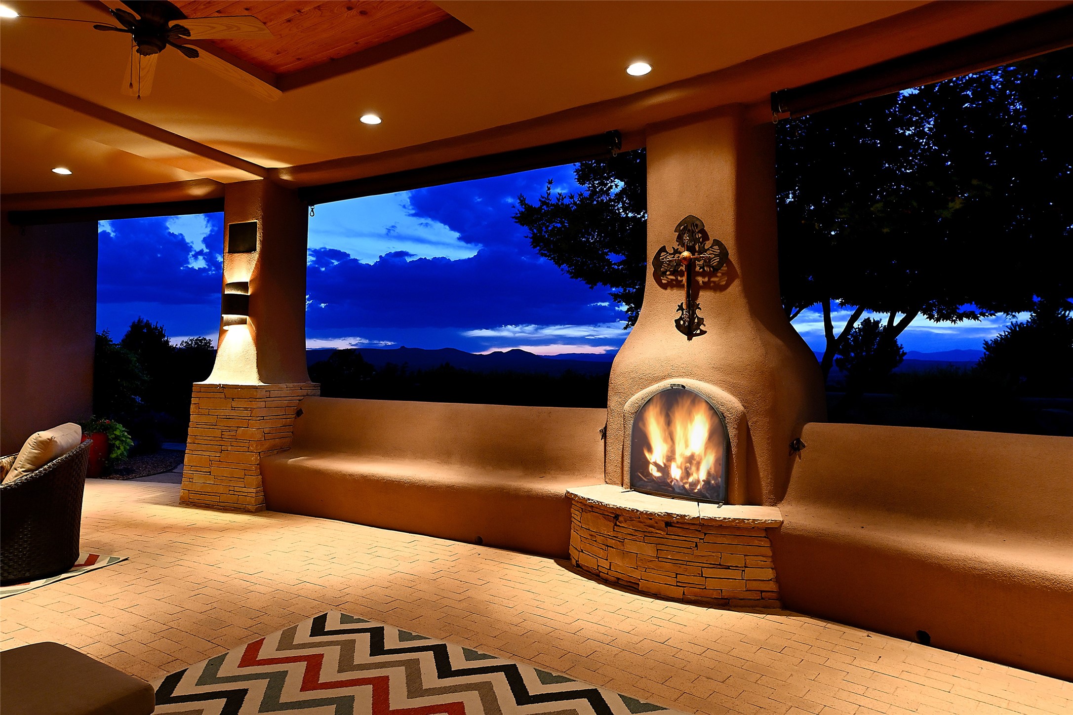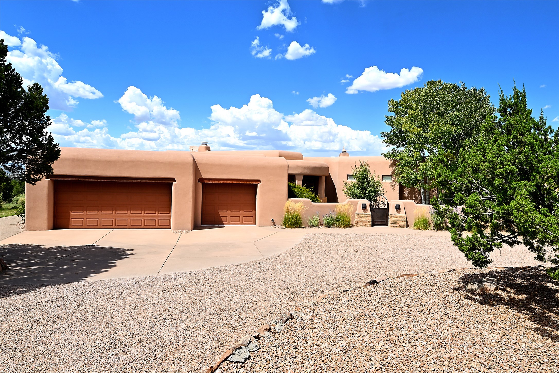 This elegant home epitomizes soft contemporary luxury, capturing sweeping Jemez Mountain vistas and sunset hues, embodying relaxed yet refined living. Intricate plaster walls and rustic vigas grace high coved ceilings, showcasing meticulous craftsmanship. Custom cabinetry, stone counters, and delicate leaded glass windows add luminous charm. The heart is the meticulously designed kitchen with hardwood floors and a commanding center island. Cherry wood cabinetry exudes opulence, complementing top-tier appliances. A fireplace-graced breakfast nook and a thoughtful pantry , plus an integrated desk area blend practicality and elegance. Seamless indoor-outdoor access harmonizes nature with daily life. Explore the versatile library/media room with hard wood floors, a tasteful bar, and an Anasazi stacked stone fireplace. Living and dining rooms seamlessly merge, united by their appreciation for panoramic views. A fireplace graces the living room, while French doors open to the grand portal--an open-air sanctuary featuring a prominent fireplace and banco seating--a canvas for al fresco dining, conversations, and immersive views. The master suite is a relaxation haven, with a fireplace-adorned sitting area framing inspiring views. Dual vanities, a built-in dressing table, deep jetted tub, expansive shower, and beautifully fitted walk-in closet define the master bath. Outdoor access enhances the experience. Completing the home are two guest bedrooms, each an oasis of comfort with ensuite baths and a 3 car garage with copious storage and this could be your forever haven.