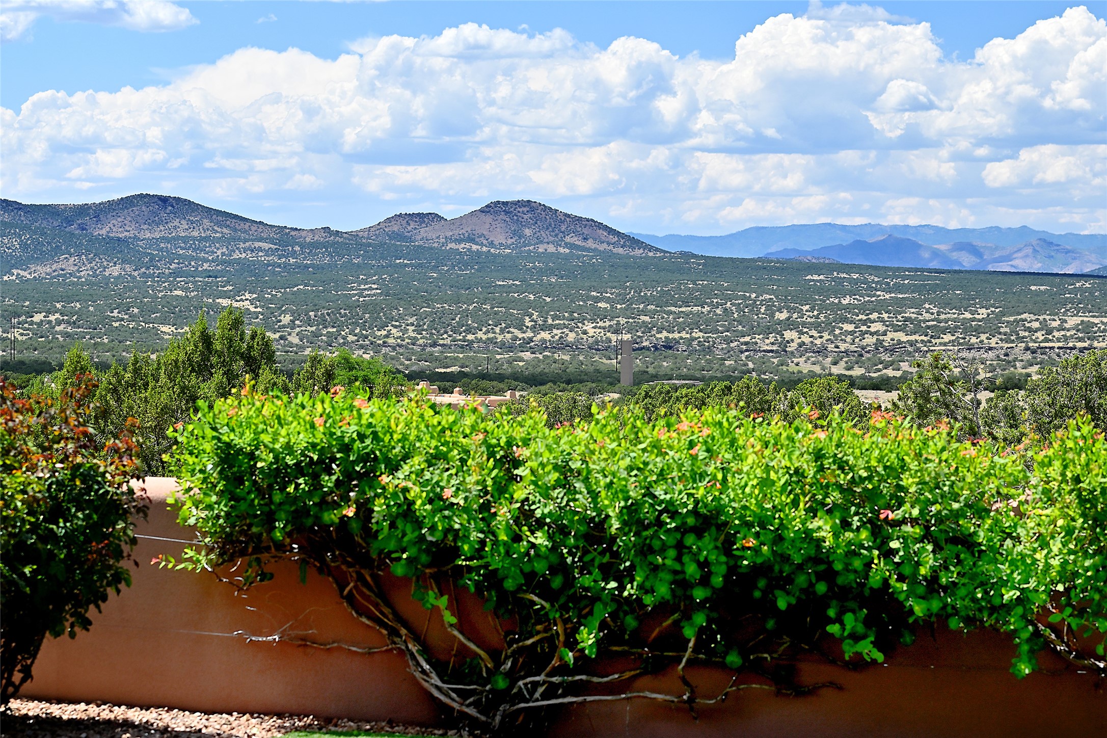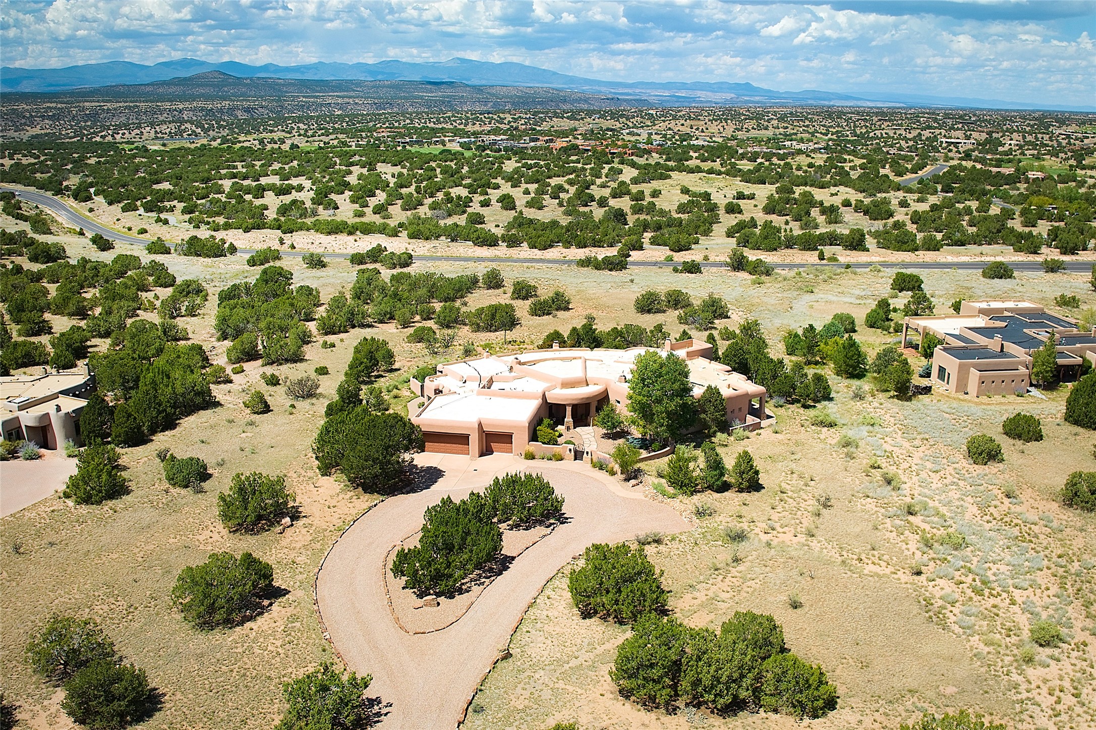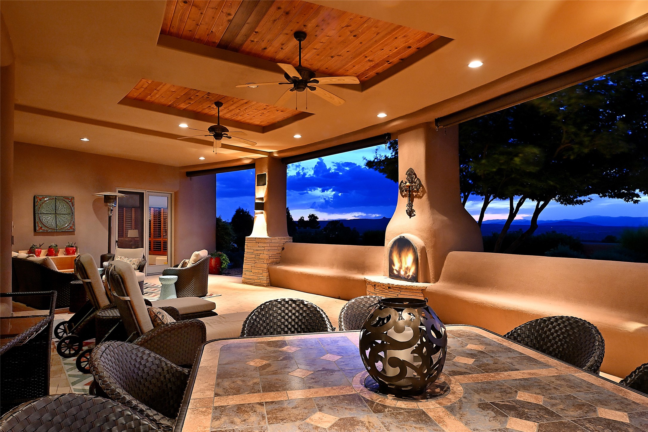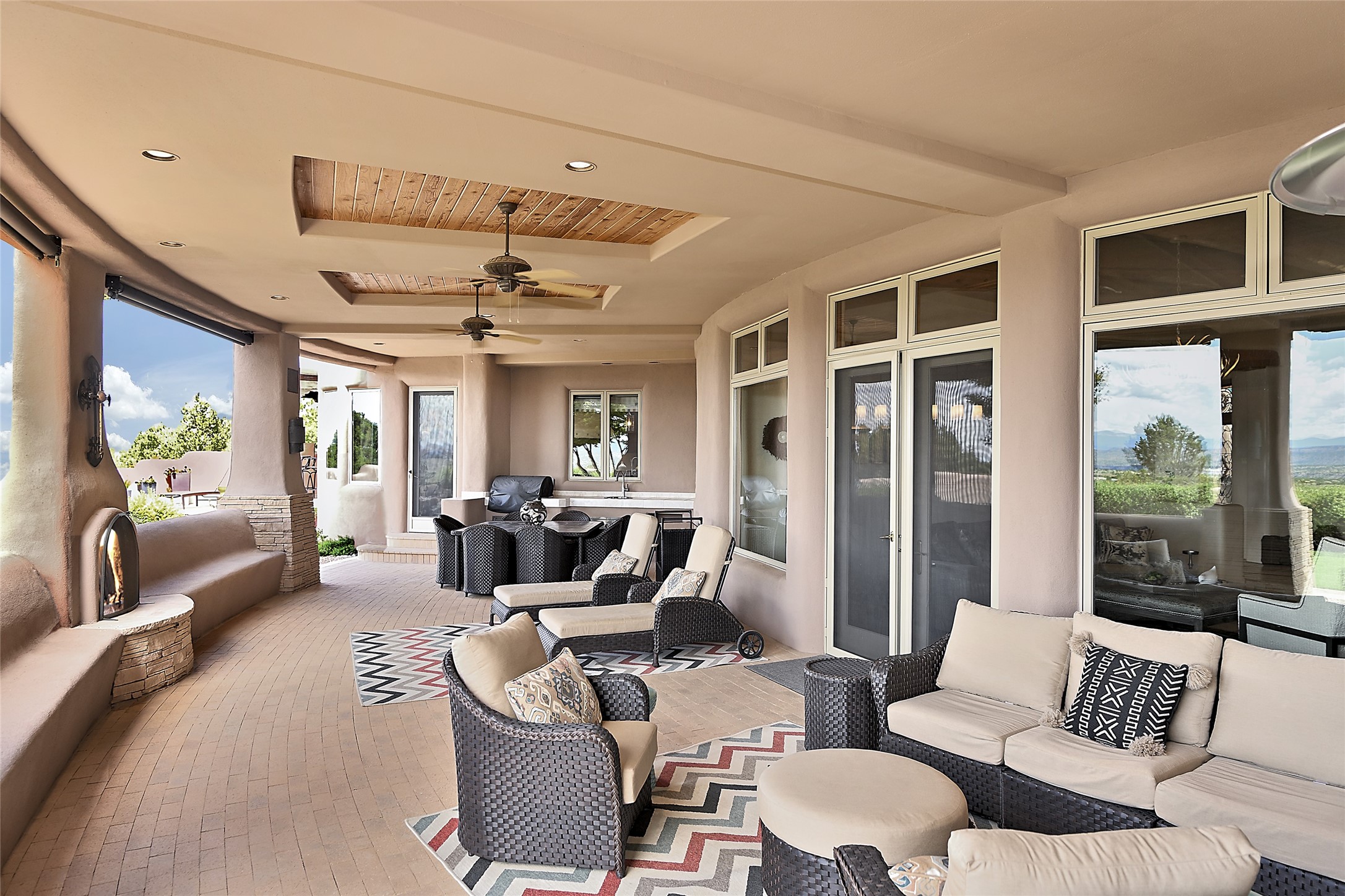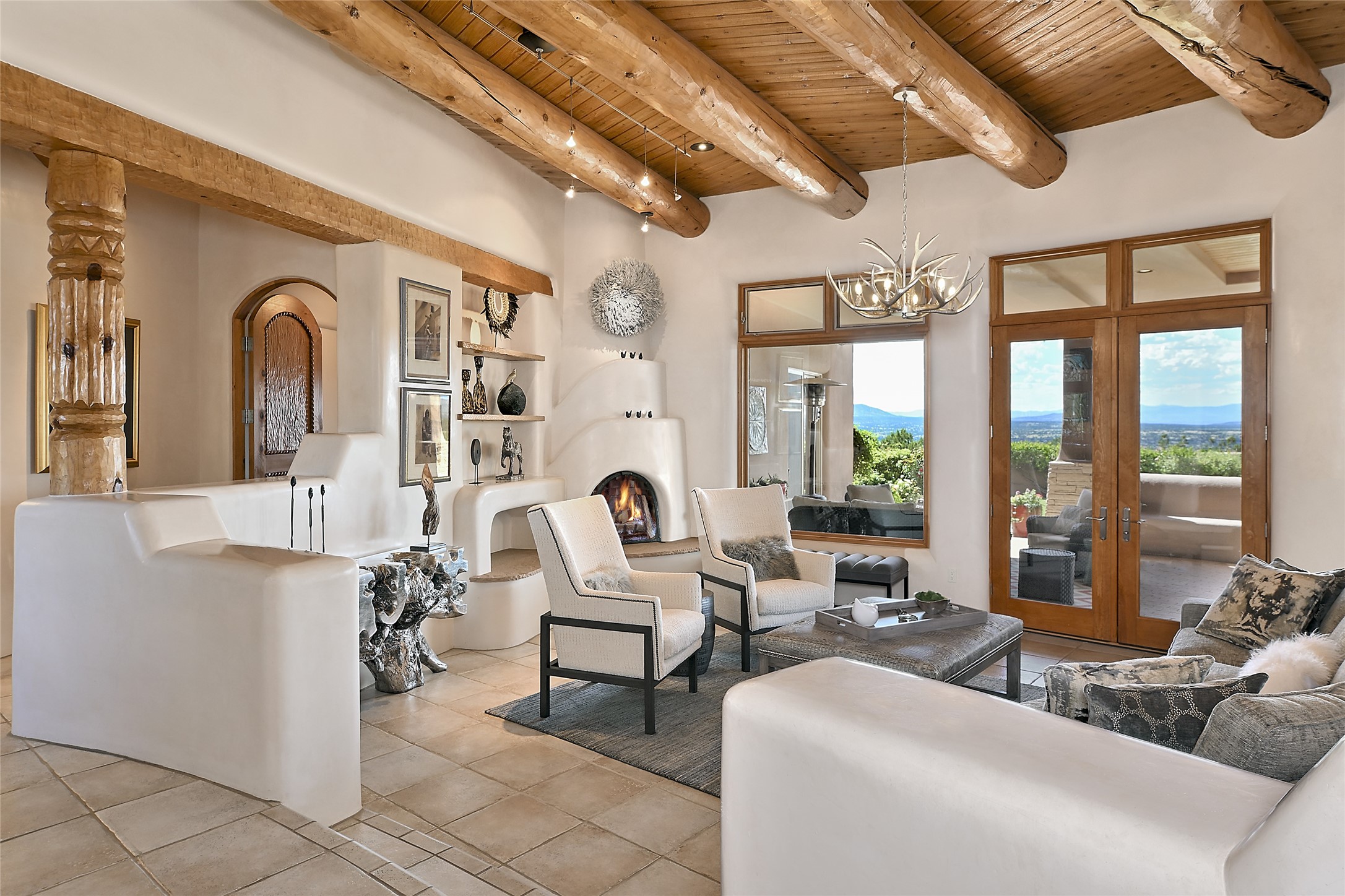 This elegant home epitomizes soft contemporary luxury, capturing sweeping Jemez Mountain vistas and sunset hues, embodying relaxed yet refined living. Intricate plaster walls and rustic vigas grace high coved ceilings, showcasing meticulous craftsmanship. Custom cabinetry, stone counters, and delicate leaded glass windows add luminous charm. The heart is the meticulously designed kitchen with hardwood floors and a commanding center island. Cherry wood cabinetry exudes opulence, complementing top-tier appliances. A fireplace-graced breakfast nook and a thoughtful pantry , plus an integrated desk area blend practicality and elegance. Seamless indoor-outdoor access harmonizes nature with daily life. Explore the versatile library/media room with hard wood floors, a tasteful bar, and an Anasazi stacked stone fireplace. Living and dining rooms seamlessly merge, united by their appreciation for panoramic views. A fireplace graces the living room, while French doors open to the grand portal--an open-air sanctuary featuring a prominent fireplace and banco seating--a canvas for al fresco dining, conversations, and immersive views. The master suite is a relaxation haven, with a fireplace-adorned sitting area framing inspiring views. Dual vanities, a built-in dressing table, deep jetted tub, expansive shower, and beautifully fitted walk-in closet define the master bath. Outdoor access enhances the experience. Completing the home are two guest bedrooms, each an oasis of comfort with ensuite baths and a 3 car garage with copious storage and this could be your forever haven.
