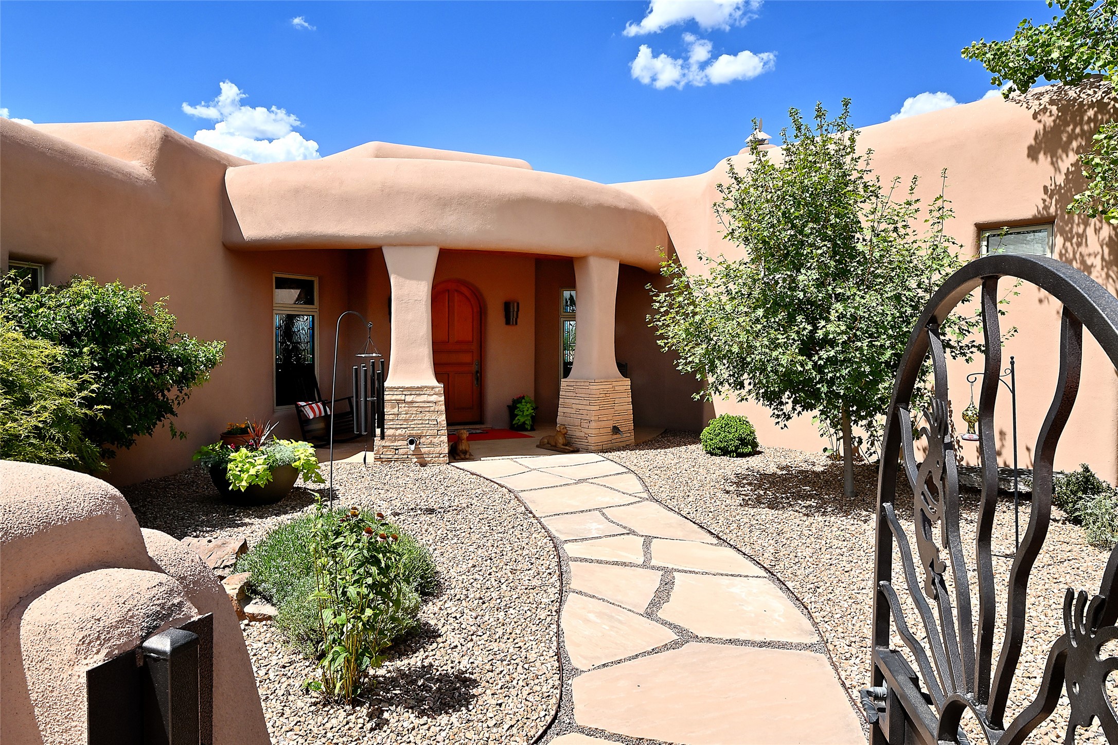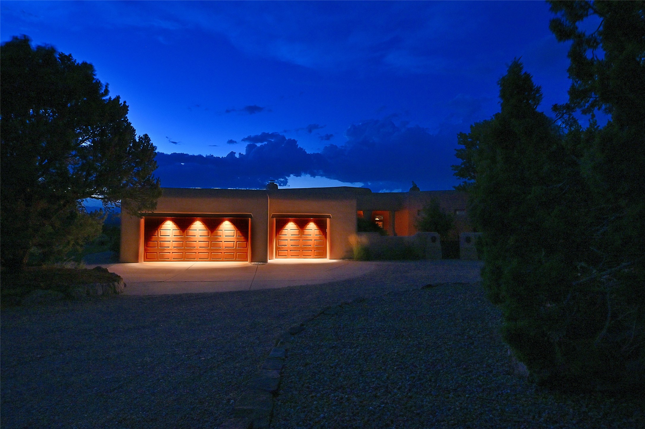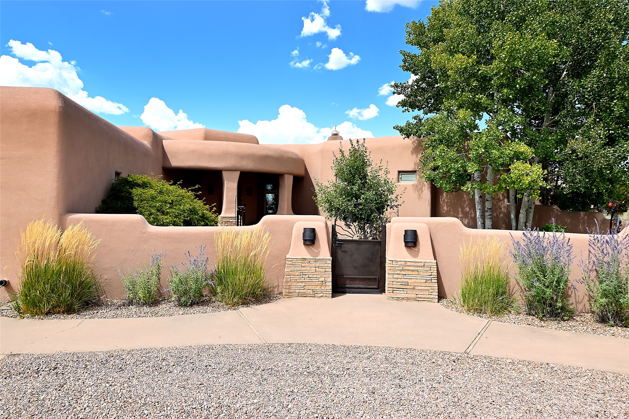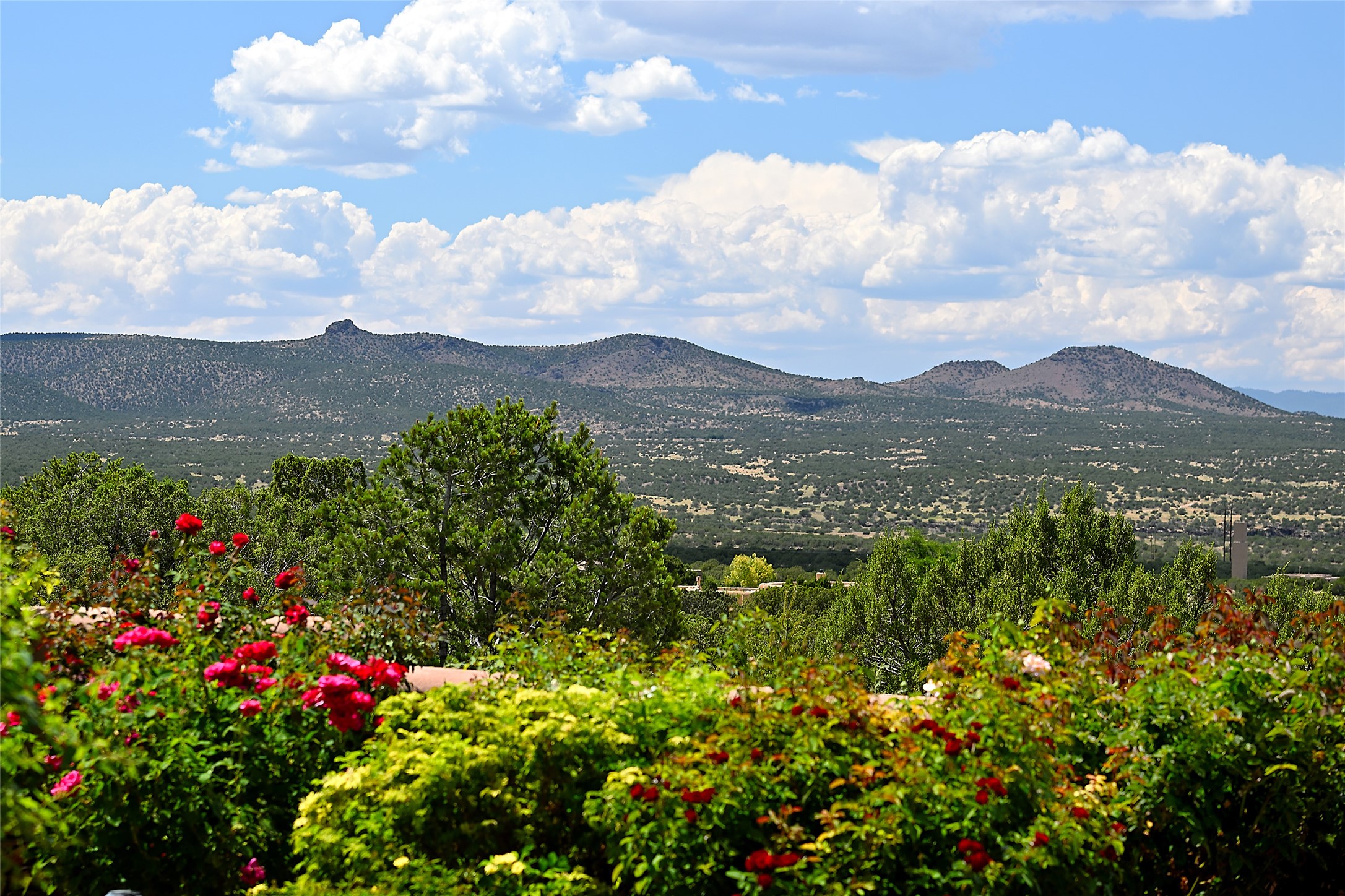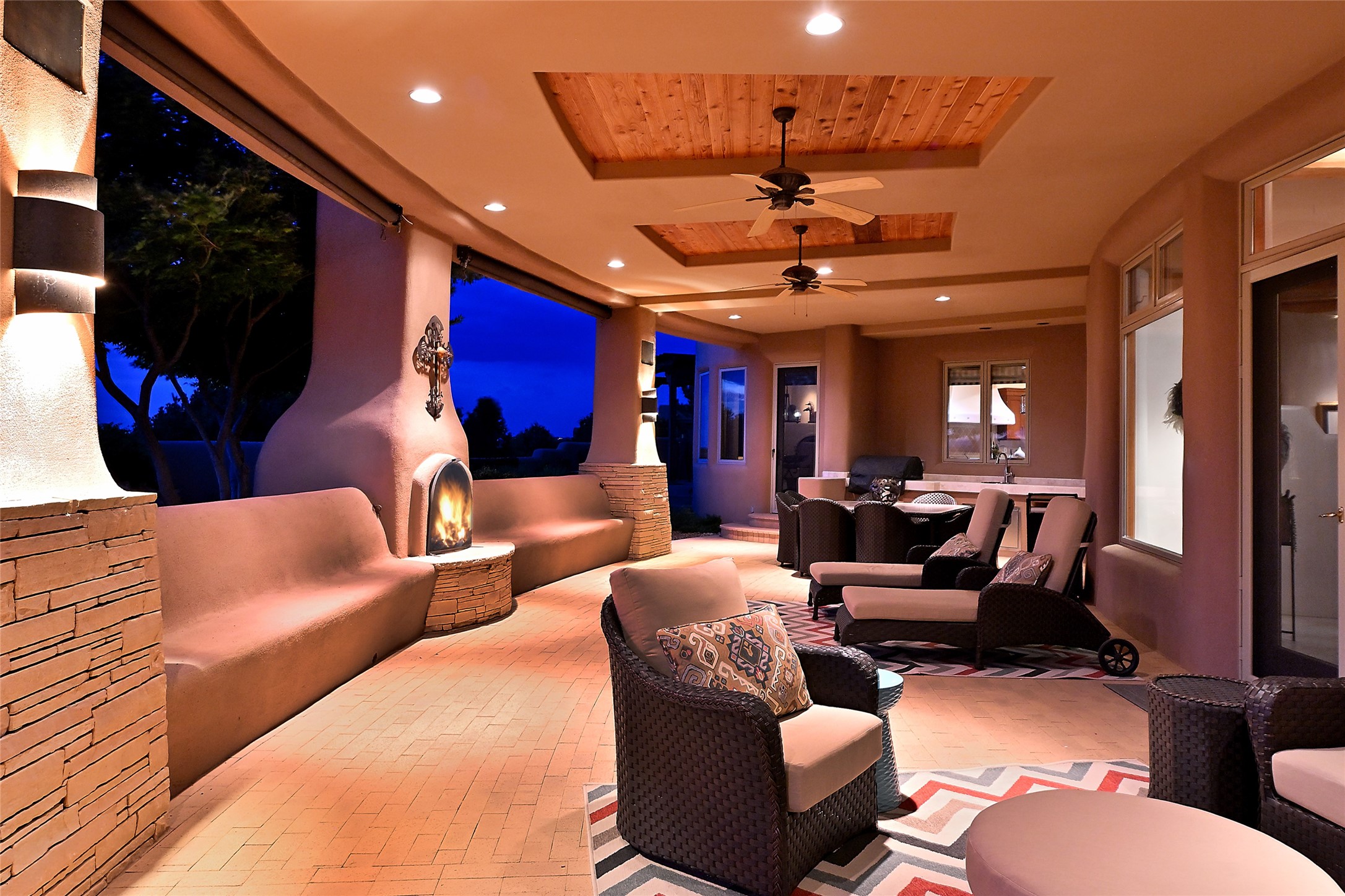 This elegant home epitomizes soft contemporary luxury, capturing sweeping Jemez Mountain vistas and sunset hues, embodying relaxed yet refined living. Intricate plaster walls and rustic vigas grace high coved ceilings, showcasing meticulous craftsmanship. Custom cabinetry, stone counters, and delicate leaded glass windows add luminous charm. The heart is the meticulously designed kitchen with hardwood floors and a commanding center island. Cherry wood cabinetry exudes opulence, complementing top-tier appliances. A fireplace-graced breakfast nook and a thoughtful pantry , plus an integrated desk area blend practicality and elegance. Seamless indoor-outdoor access harmonizes nature with daily life. Explore the versatile library/media room with hard wood floors, a tasteful bar, and an Anasazi stacked stone fireplace. Living and dining rooms seamlessly merge, united by their appreciation for panoramic views. A fireplace graces the living room, while French doors open to the grand portal--an open-air sanctuary featuring a prominent fireplace and banco seating--a canvas for al fresco dining, conversations, and immersive views. The master suite is a relaxation haven, with a fireplace-adorned sitting area framing inspiring views. Dual vanities, a built-in dressing table, deep jetted tub, expansive shower, and beautifully fitted walk-in closet define the master bath. Outdoor access enhances the experience. Completing the home are two guest bedrooms, each an oasis of comfort with ensuite baths and a 3 car garage with copious storage and this could be your forever haven.