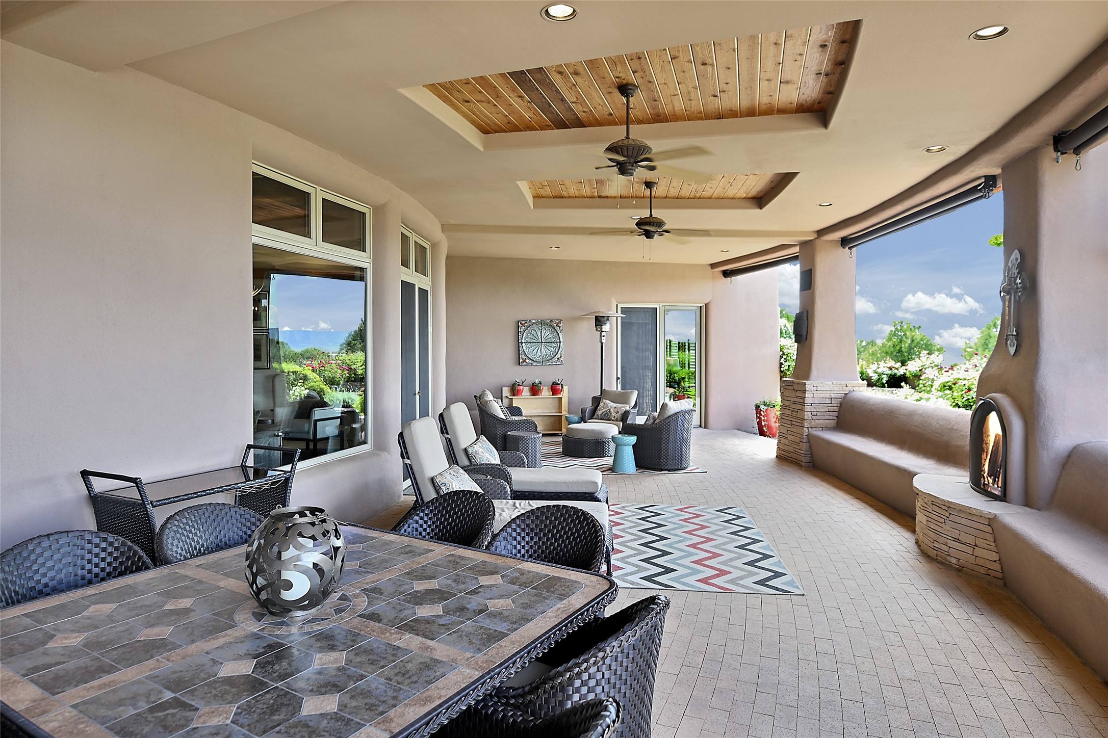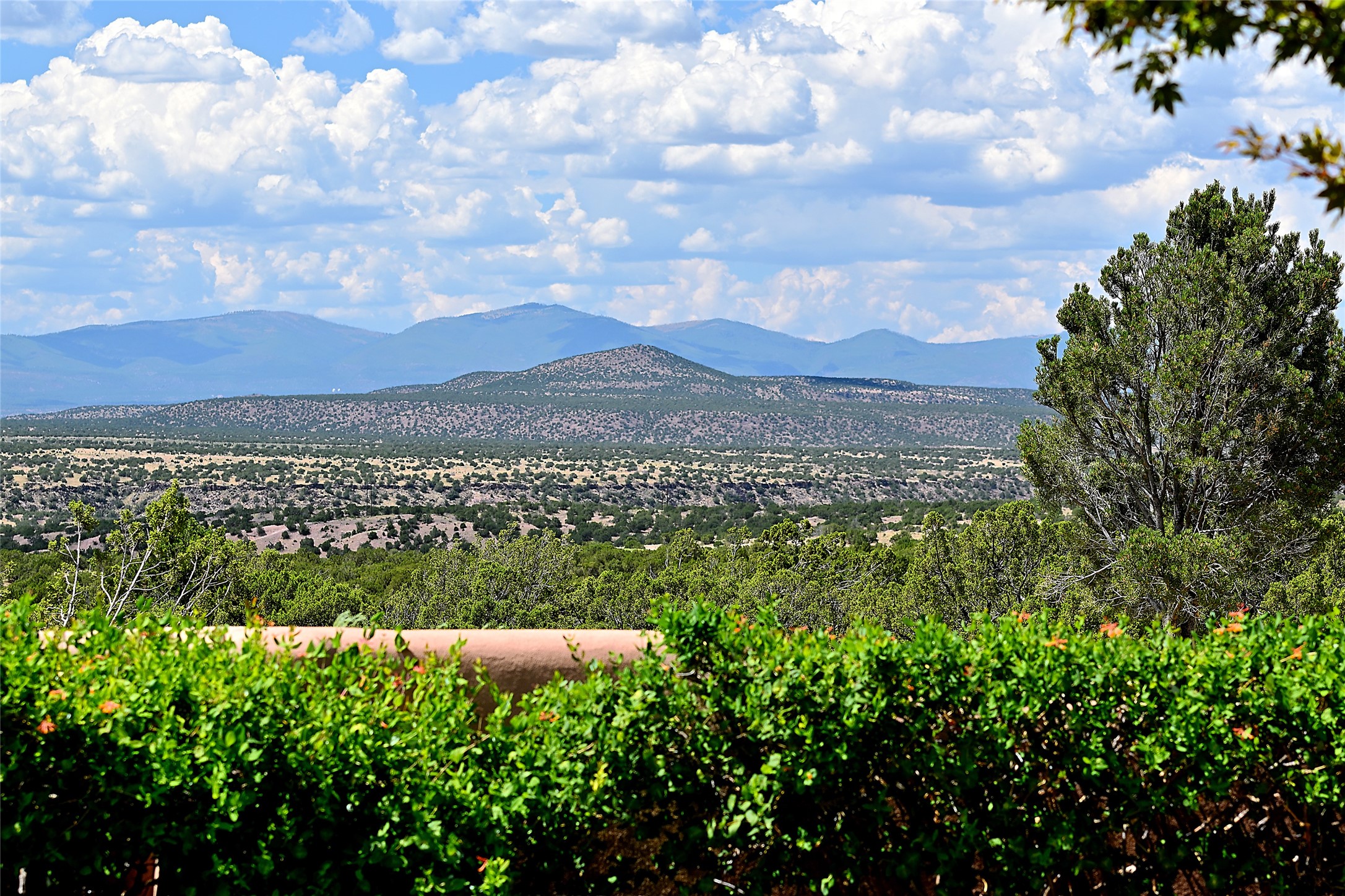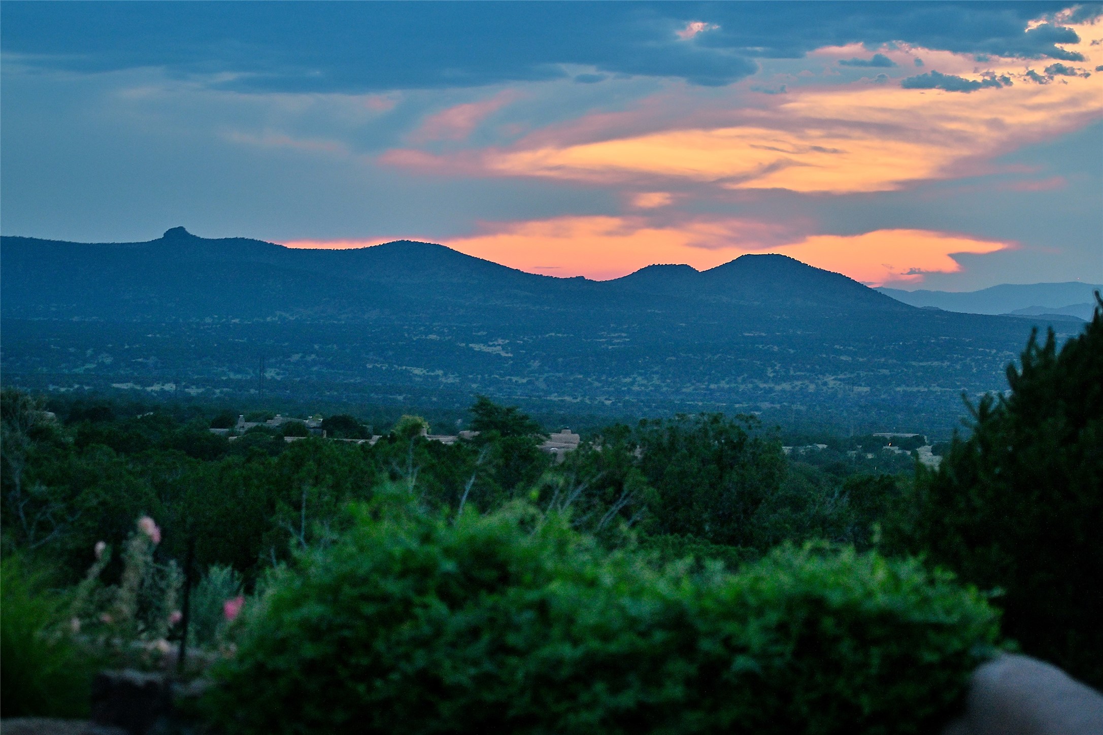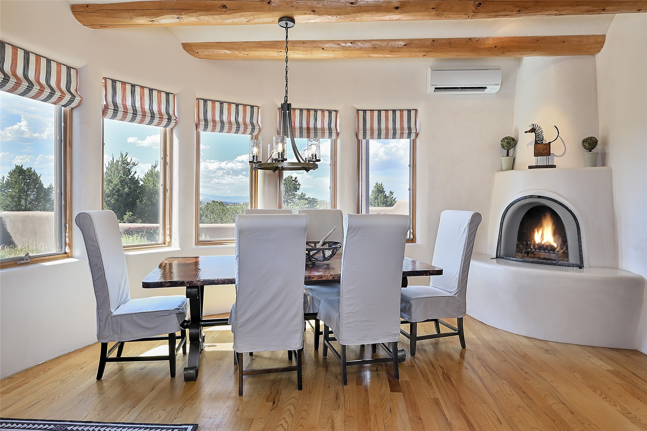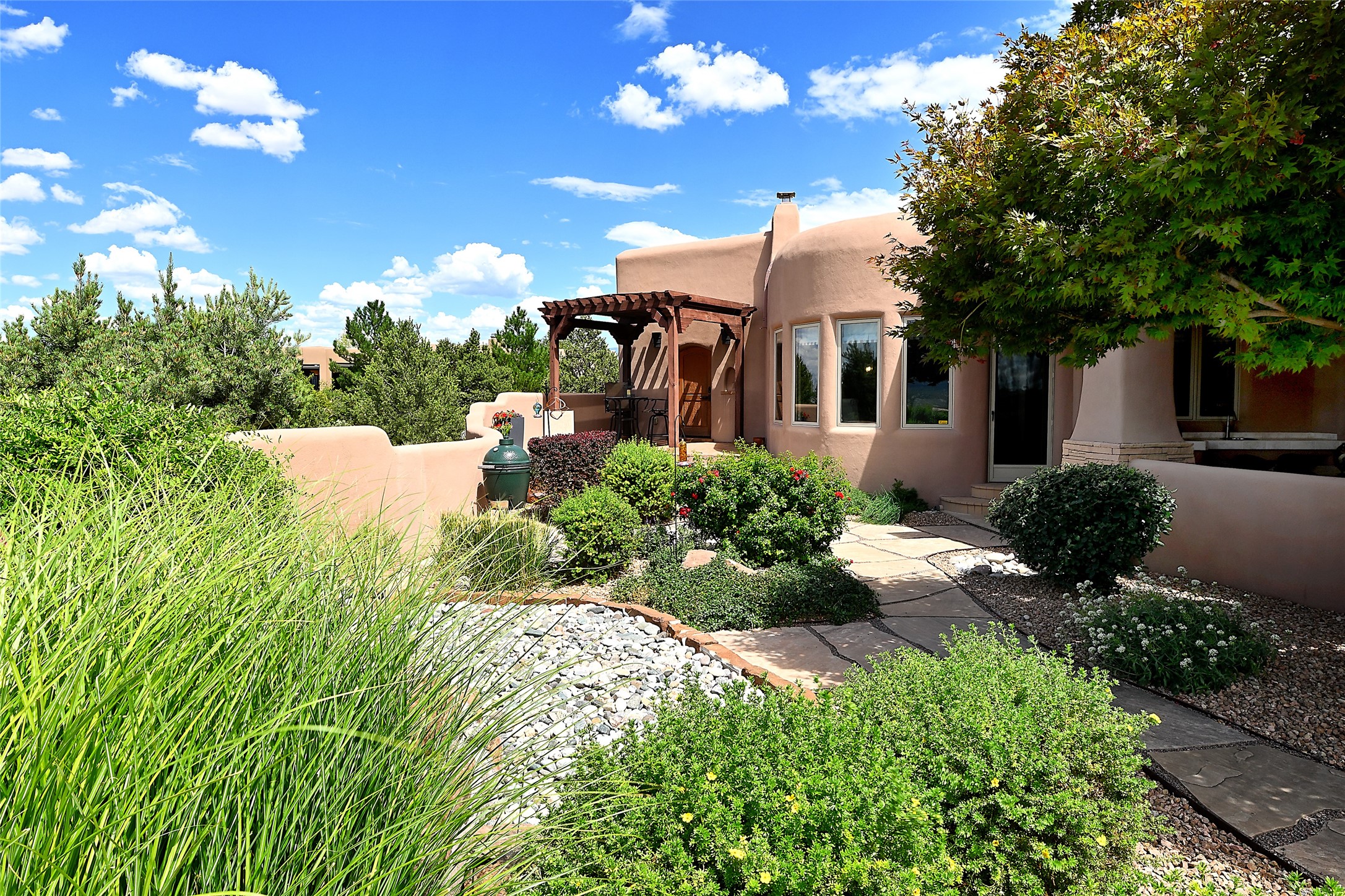 This elegant home epitomizes soft contemporary luxury, capturing sweeping Jemez Mountain vistas and sunset hues, embodying relaxed yet refined living. Intricate plaster walls and rustic vigas grace high coved ceilings, showcasing meticulous craftsmanship. Custom cabinetry, stone counters, and delicate leaded glass windows add luminous charm. The heart is the meticulously designed kitchen with hardwood floors and a commanding center island. Cherry wood cabinetry exudes opulence, complementing top-tier appliances. A fireplace-graced breakfast nook and a thoughtful pantry , plus an integrated desk area blend practicality and elegance. Seamless indoor-outdoor access harmonizes nature with daily life. Explore the versatile library/media room with hard wood floors, a tasteful bar, and an Anasazi stacked stone fireplace. Living and dining rooms seamlessly merge, united by their appreciation for panoramic views. A fireplace graces the living room, while French doors open to the grand portal--an open-air sanctuary featuring a prominent fireplace and banco seating--a canvas for al fresco dining, conversations, and immersive views. The master suite is a relaxation haven, with a fireplace-adorned sitting area framing inspiring views. Dual vanities, a built-in dressing table, deep jetted tub, expansive shower, and beautifully fitted walk-in closet define the master bath. Outdoor access enhances the experience. Completing the home are two guest bedrooms, each an oasis of comfort with ensuite baths and a 3 car garage with copious storage and this could be your forever haven.