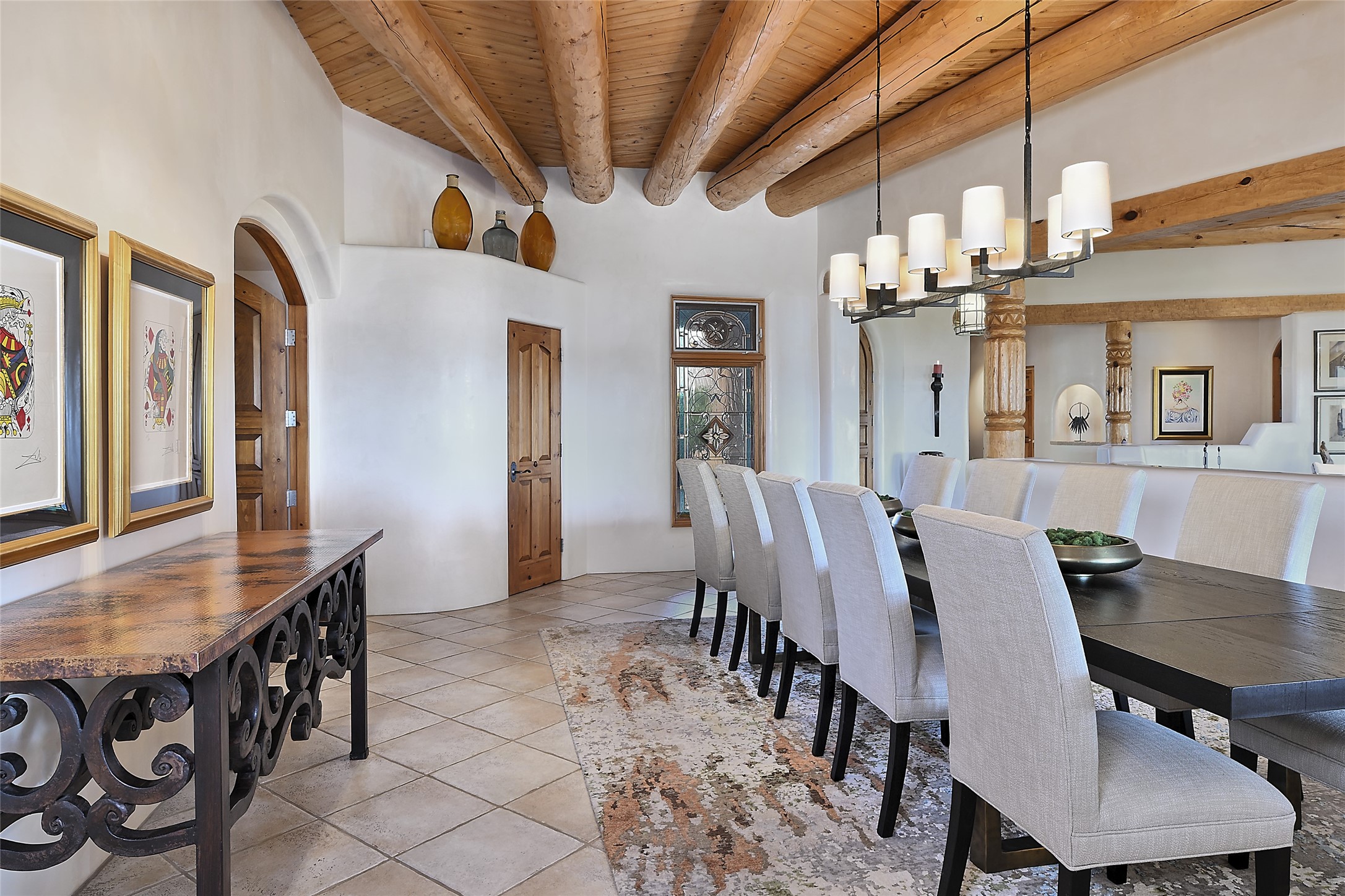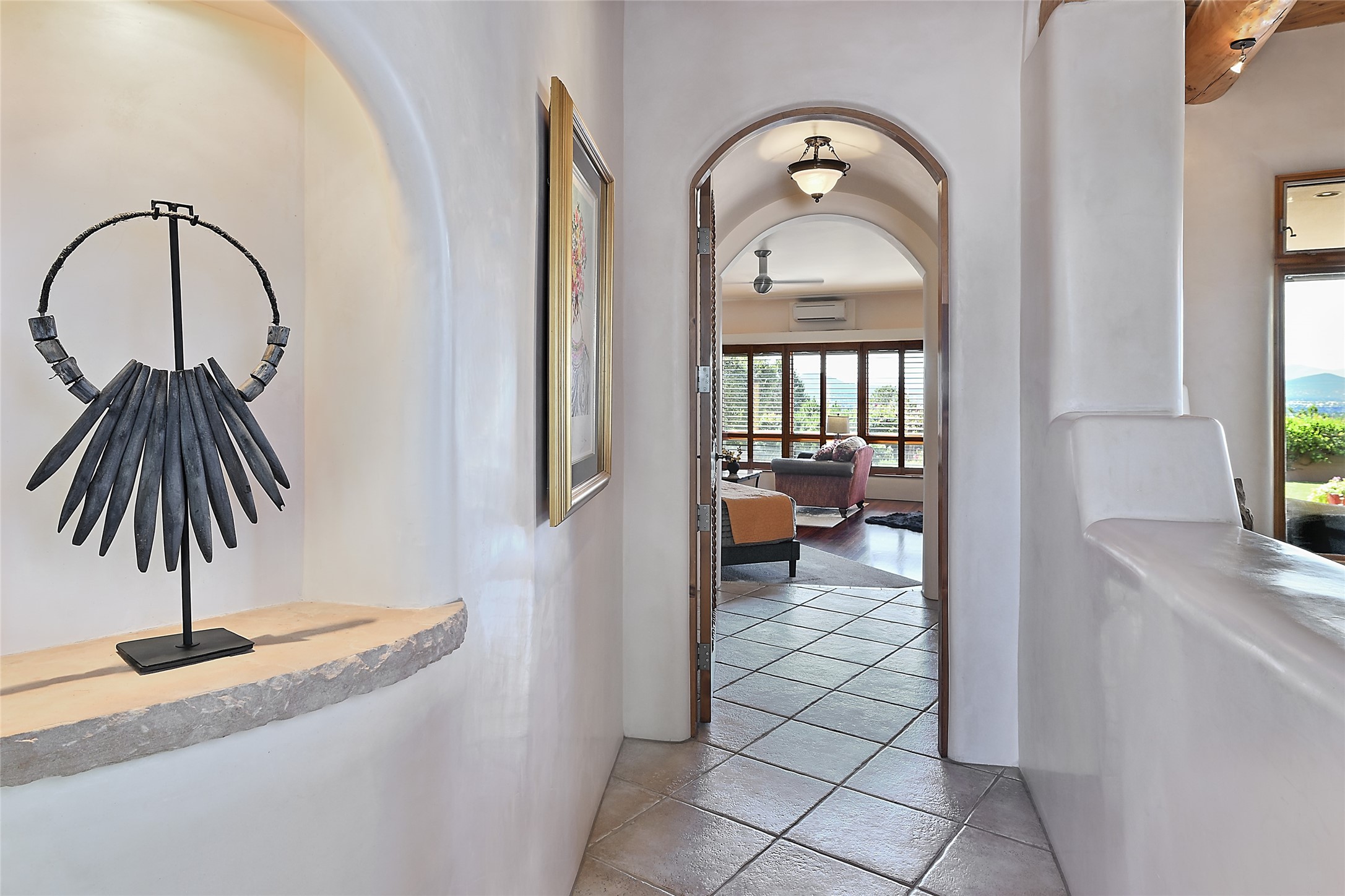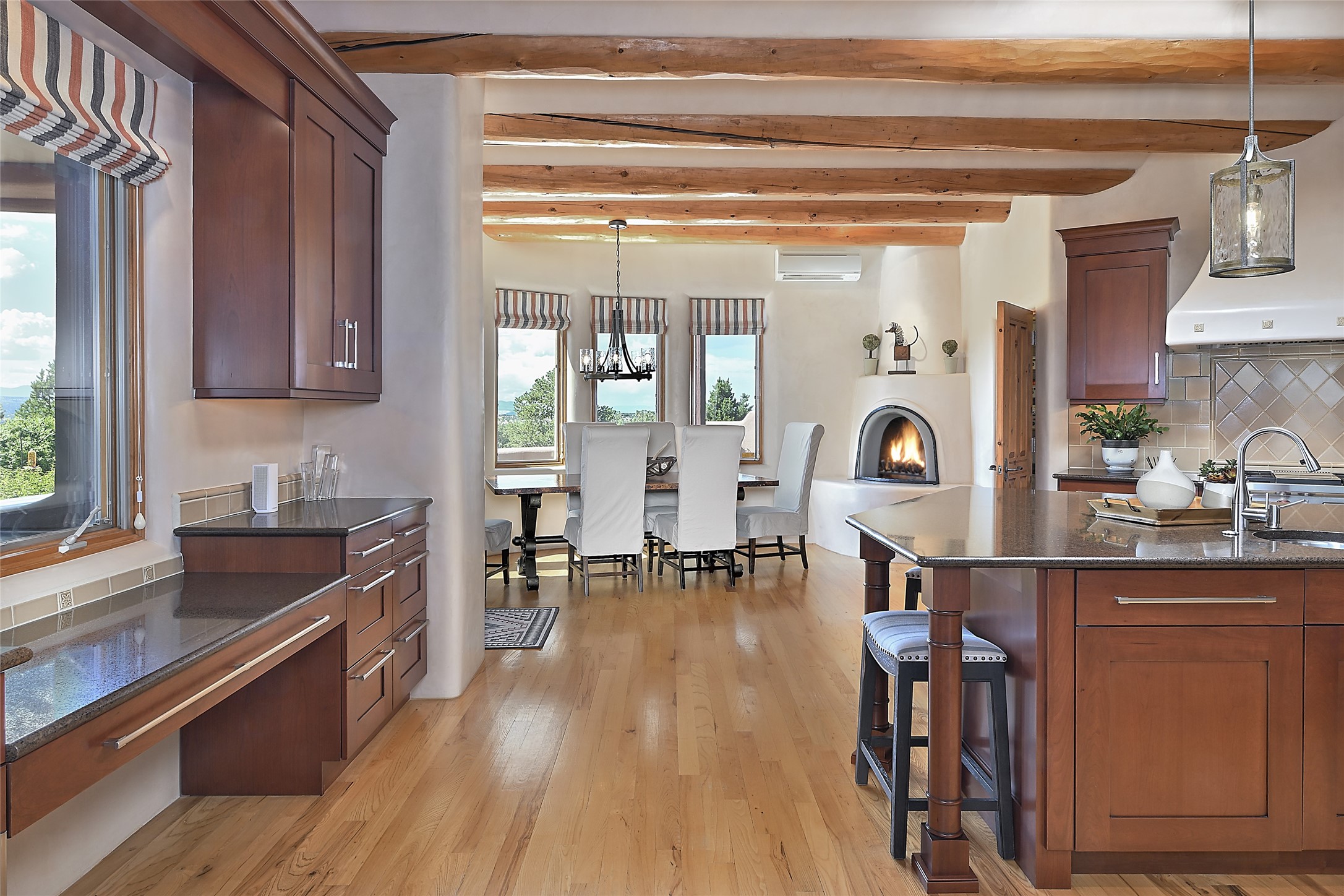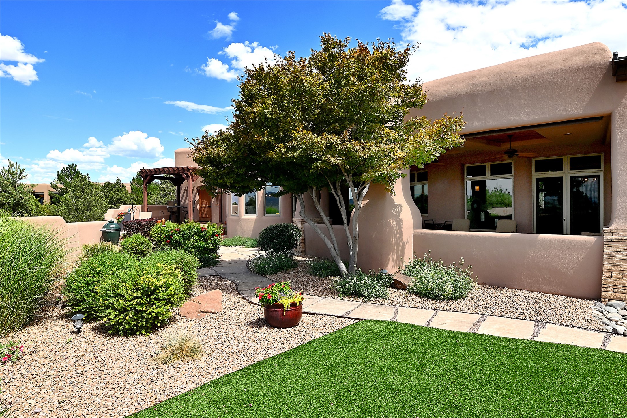 This elegant home epitomizes soft contemporary luxury, capturing sweeping Jemez Mountain vistas and sunset hues, embodying relaxed yet refined living. Intricate plaster walls and rustic vigas grace high coved ceilings, showcasing meticulous craftsmanship. Custom cabinetry, stone counters, and delicate leaded glass windows add luminous charm. The heart is the meticulously designed kitchen with hardwood floors and a commanding center island. Cherry wood cabinetry exudes opulence, complementing top-tier appliances. A fireplace-graced breakfast nook and a thoughtful pantry , plus an integrated desk area blend practicality and elegance. Seamless indoor-outdoor access harmonizes nature with daily life. Explore the versatile library/media room with hard wood floors, a tasteful bar, and an Anasazi stacked stone fireplace. Living and dining rooms seamlessly merge, united by their appreciation for panoramic views. A fireplace graces the living room, while French doors open to the grand portal--an open-air sanctuary featuring a prominent fireplace and banco seating--a canvas for al fresco dining, conversations, and immersive views. The master suite is a relaxation haven, with a fireplace-adorned sitting area framing inspiring views. Dual vanities, a built-in dressing table, deep jetted tub, expansive shower, and beautifully fitted walk-in closet define the master bath. Outdoor access enhances the experience. Completing the home are two guest bedrooms, each an oasis of comfort with ensuite baths and a 3 car garage with copious storage and this could be your forever haven.