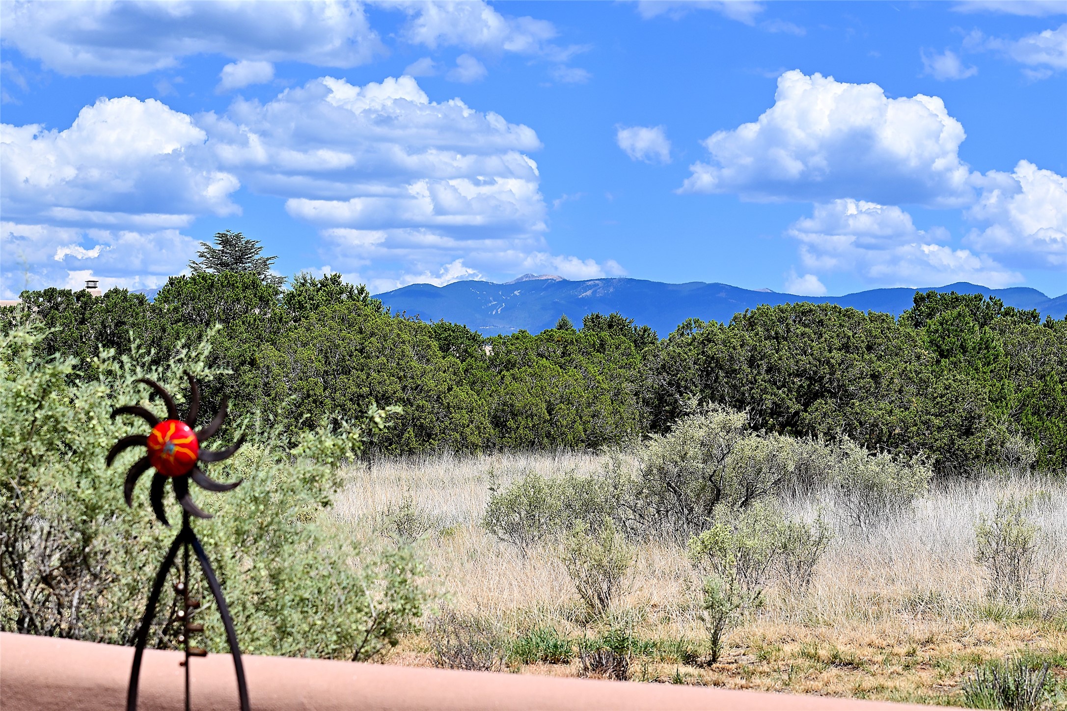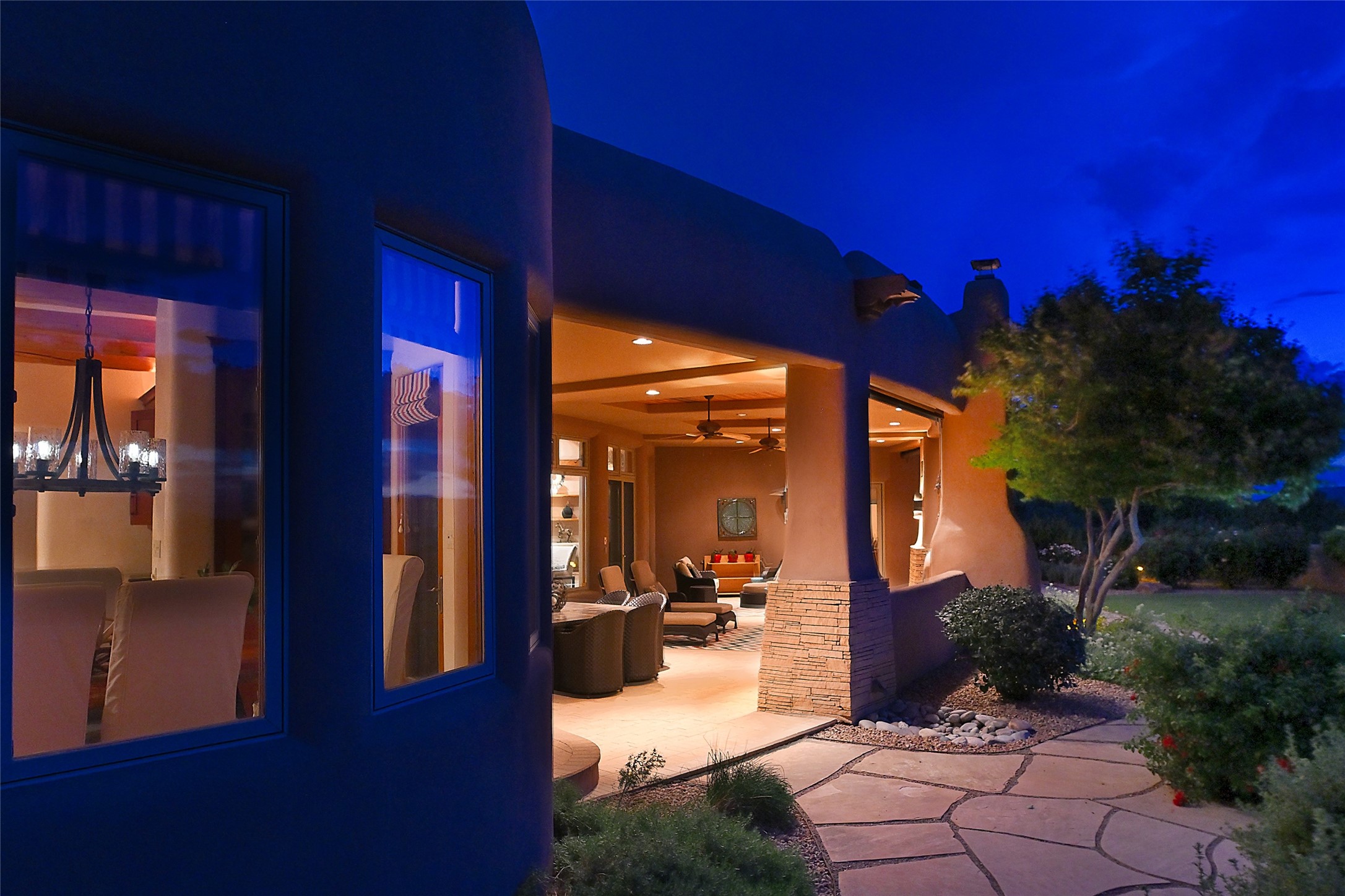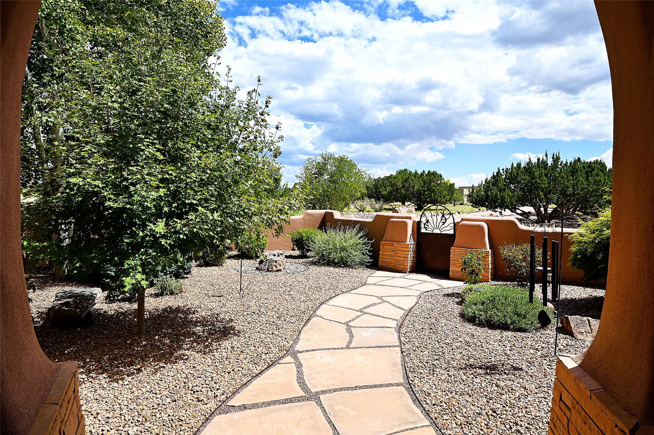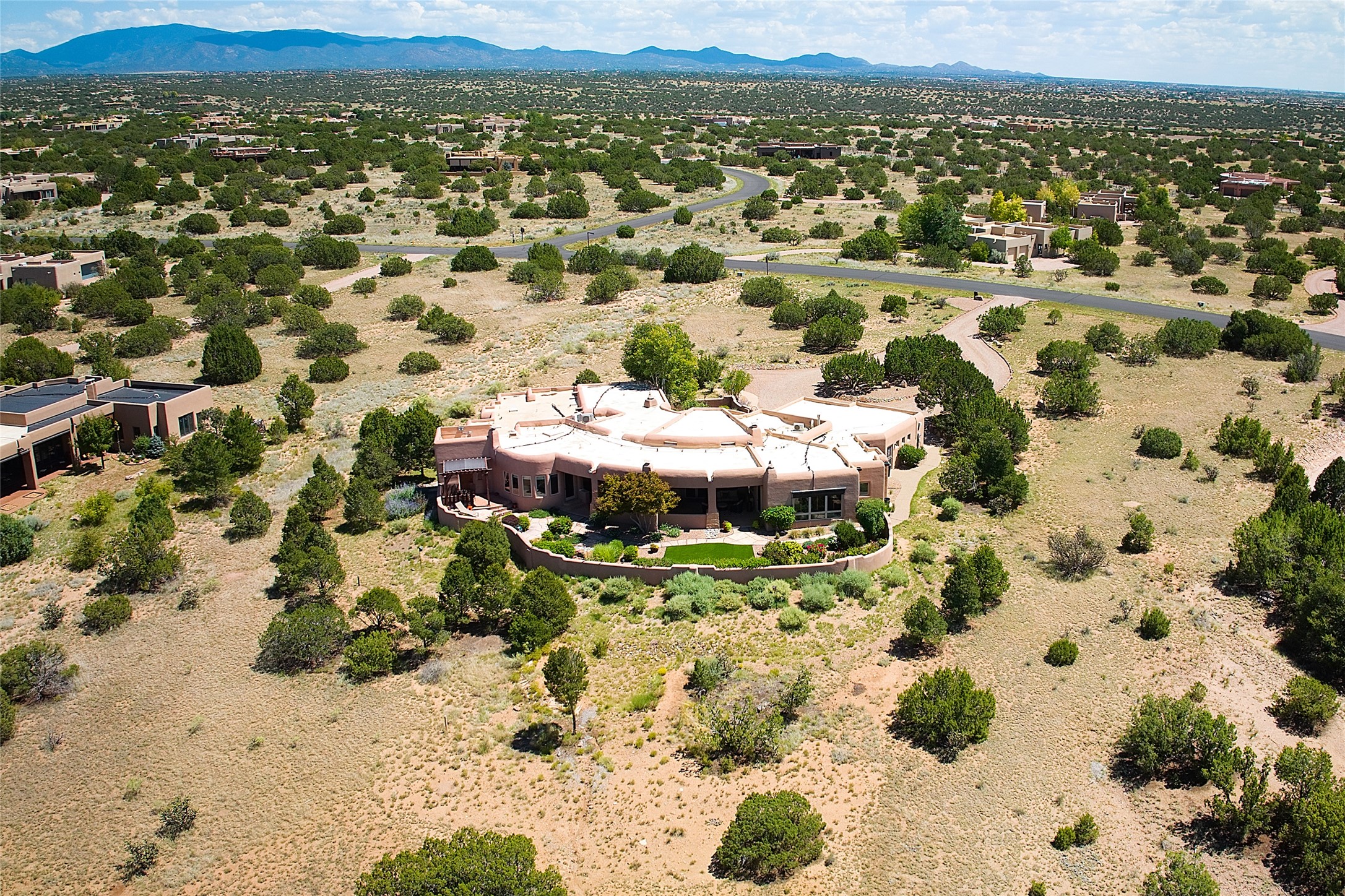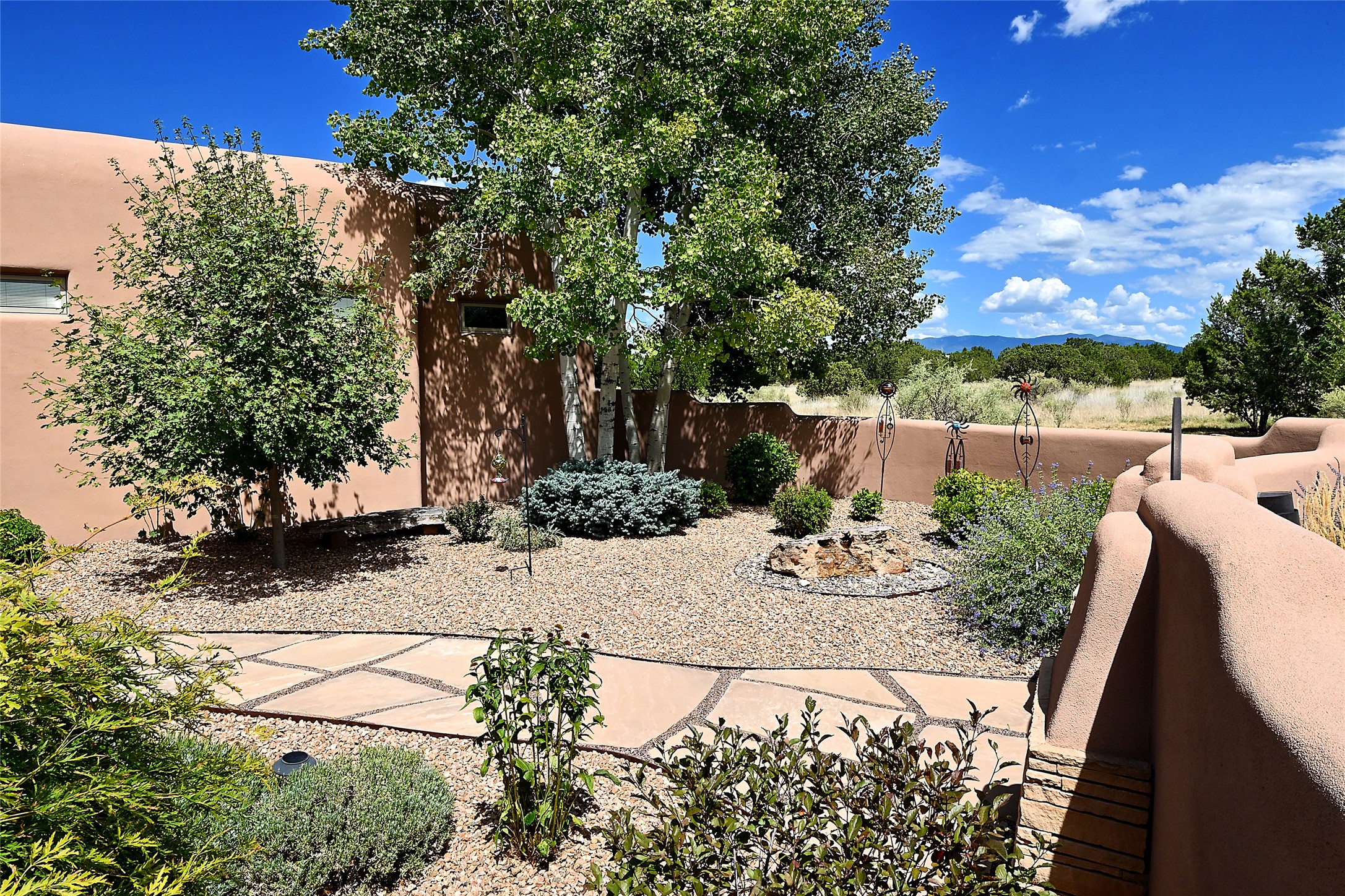 This elegant home epitomizes soft contemporary luxury, capturing sweeping Jemez Mountain vistas and sunset hues, embodying relaxed yet refined living. Intricate plaster walls and rustic vigas grace high coved ceilings, showcasing meticulous craftsmanship. Custom cabinetry, stone counters, and delicate leaded glass windows add luminous charm. The heart is the meticulously designed kitchen with hardwood floors and a commanding center island. Cherry wood cabinetry exudes opulence, complementing top-tier appliances. A fireplace-graced breakfast nook and a thoughtful pantry , plus an integrated desk area blend practicality and elegance. Seamless indoor-outdoor access harmonizes nature with daily life. Explore the versatile library/media room with hard wood floors, a tasteful bar, and an Anasazi stacked stone fireplace. Living and dining rooms seamlessly merge, united by their appreciation for panoramic views. A fireplace graces the living room, while French doors open to the grand portal--an open-air sanctuary featuring a prominent fireplace and banco seating--a canvas for al fresco dining, conversations, and immersive views. The master suite is a relaxation haven, with a fireplace-adorned sitting area framing inspiring views. Dual vanities, a built-in dressing table, deep jetted tub, expansive shower, and beautifully fitted walk-in closet define the master bath. Outdoor access enhances the experience. Completing the home are two guest bedrooms, each an oasis of comfort with ensuite baths and a 3 car garage with copious storage and this could be your forever haven.