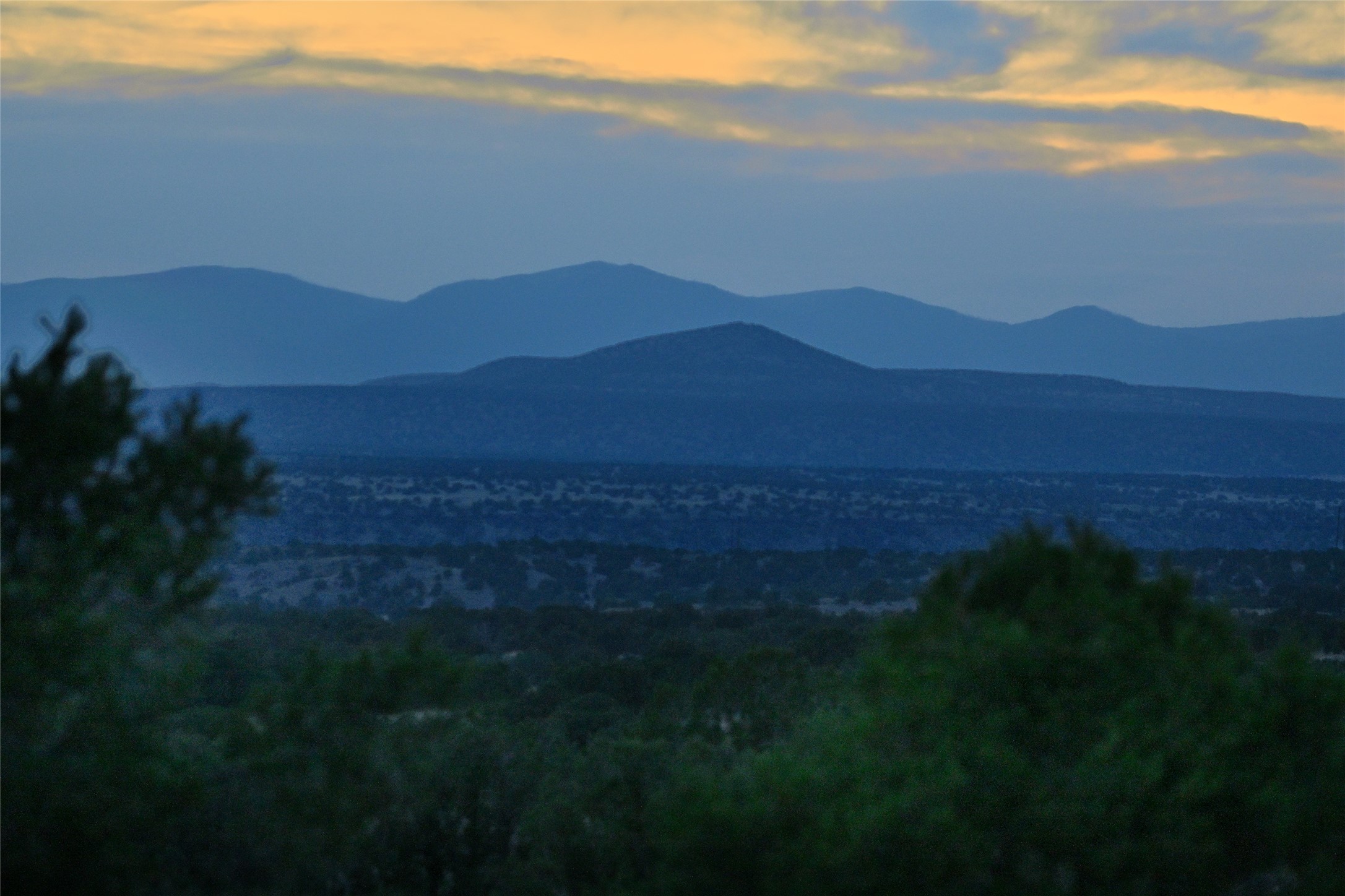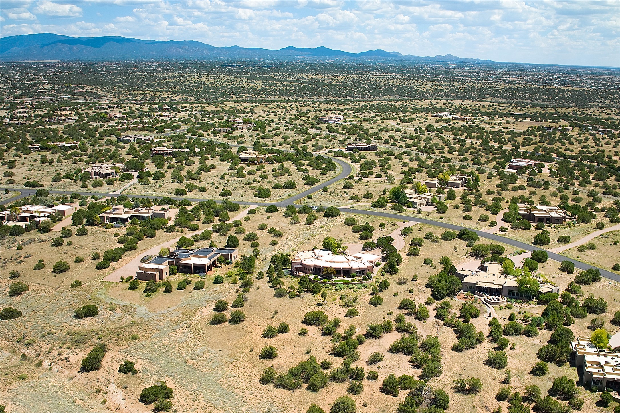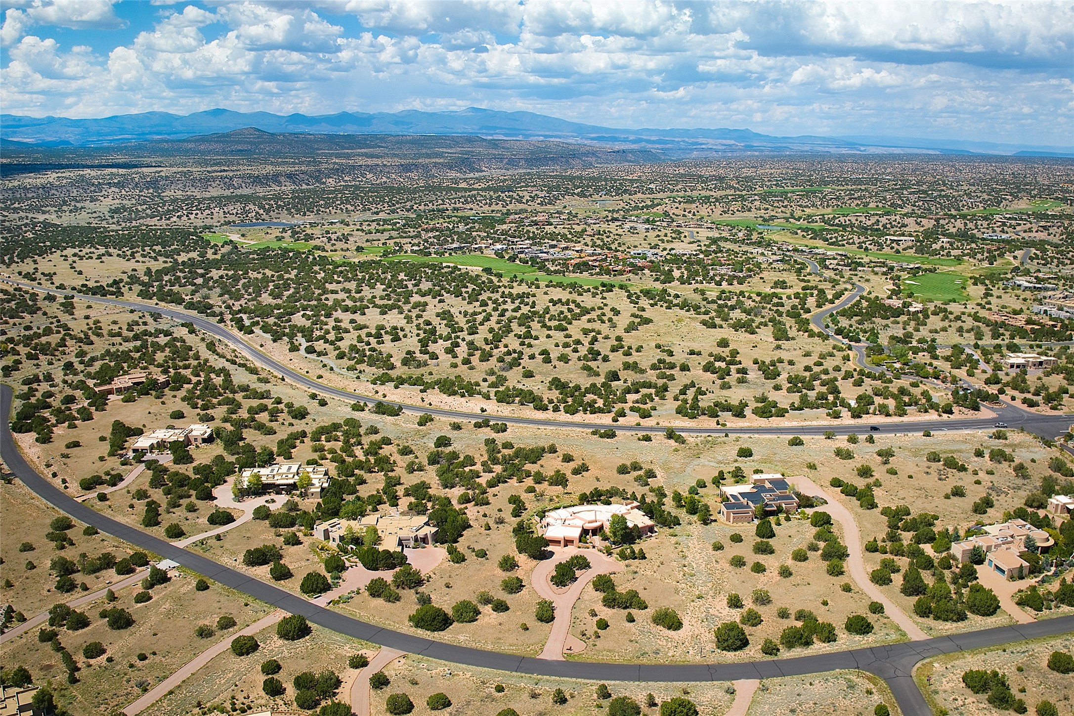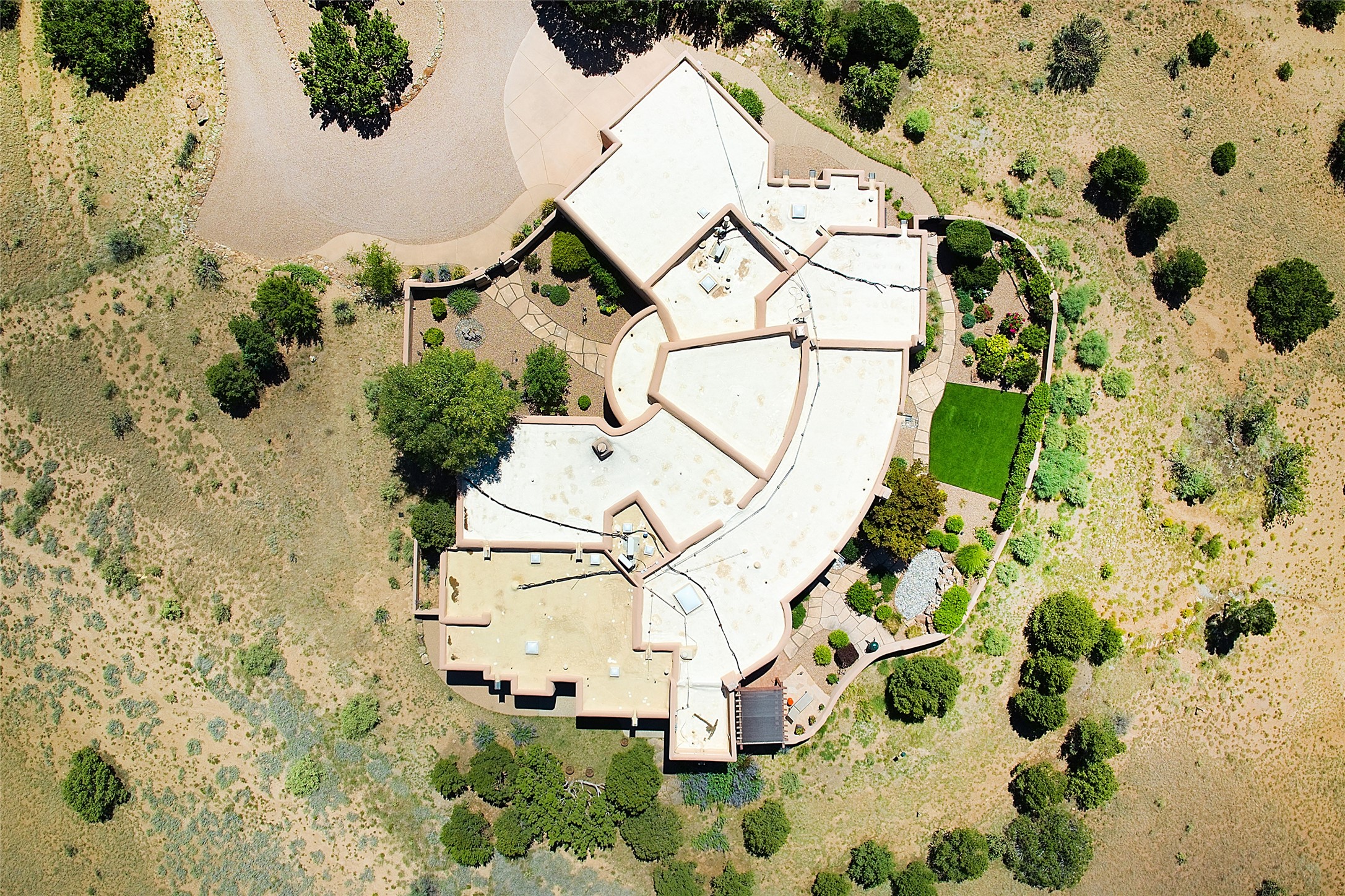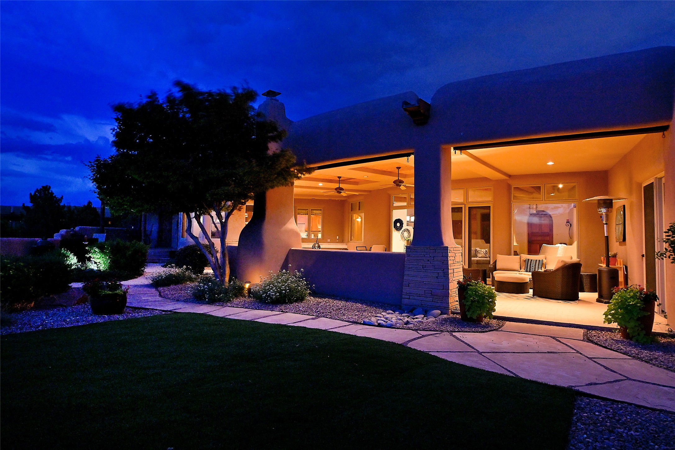 This elegant home epitomizes soft contemporary luxury, capturing sweeping Jemez Mountain vistas and sunset hues, embodying relaxed yet refined living. Intricate plaster walls and rustic vigas grace high coved ceilings, showcasing meticulous craftsmanship. Custom cabinetry, stone counters, and delicate leaded glass windows add luminous charm. The heart is the meticulously designed kitchen with hardwood floors and a commanding center island. Cherry wood cabinetry exudes opulence, complementing top-tier appliances. A fireplace-graced breakfast nook and a thoughtful pantry , plus an integrated desk area blend practicality and elegance. Seamless indoor-outdoor access harmonizes nature with daily life. Explore the versatile library/media room with hard wood floors, a tasteful bar, and an Anasazi stacked stone fireplace. Living and dining rooms seamlessly merge, united by their appreciation for panoramic views. A fireplace graces the living room, while French doors open to the grand portal--an open-air sanctuary featuring a prominent fireplace and banco seating--a canvas for al fresco dining, conversations, and immersive views. The master suite is a relaxation haven, with a fireplace-adorned sitting area framing inspiring views. Dual vanities, a built-in dressing table, deep jetted tub, expansive shower, and beautifully fitted walk-in closet define the master bath. Outdoor access enhances the experience. Completing the home are two guest bedrooms, each an oasis of comfort with ensuite baths and a 3 car garage with copious storage and this could be your forever haven.