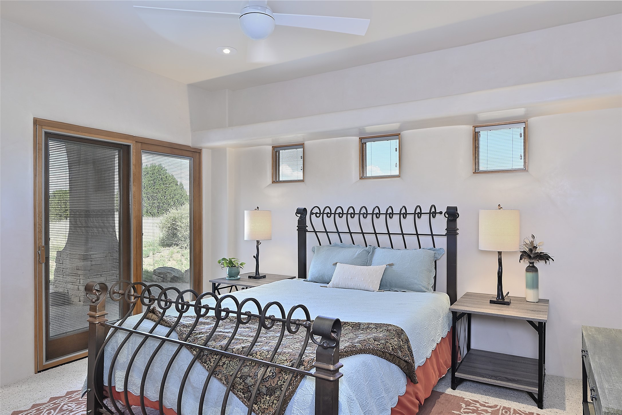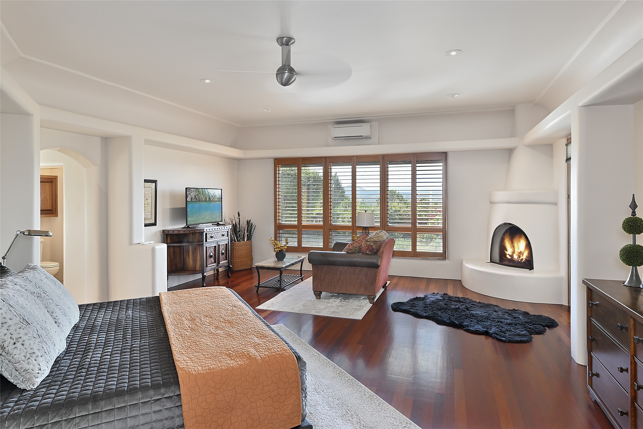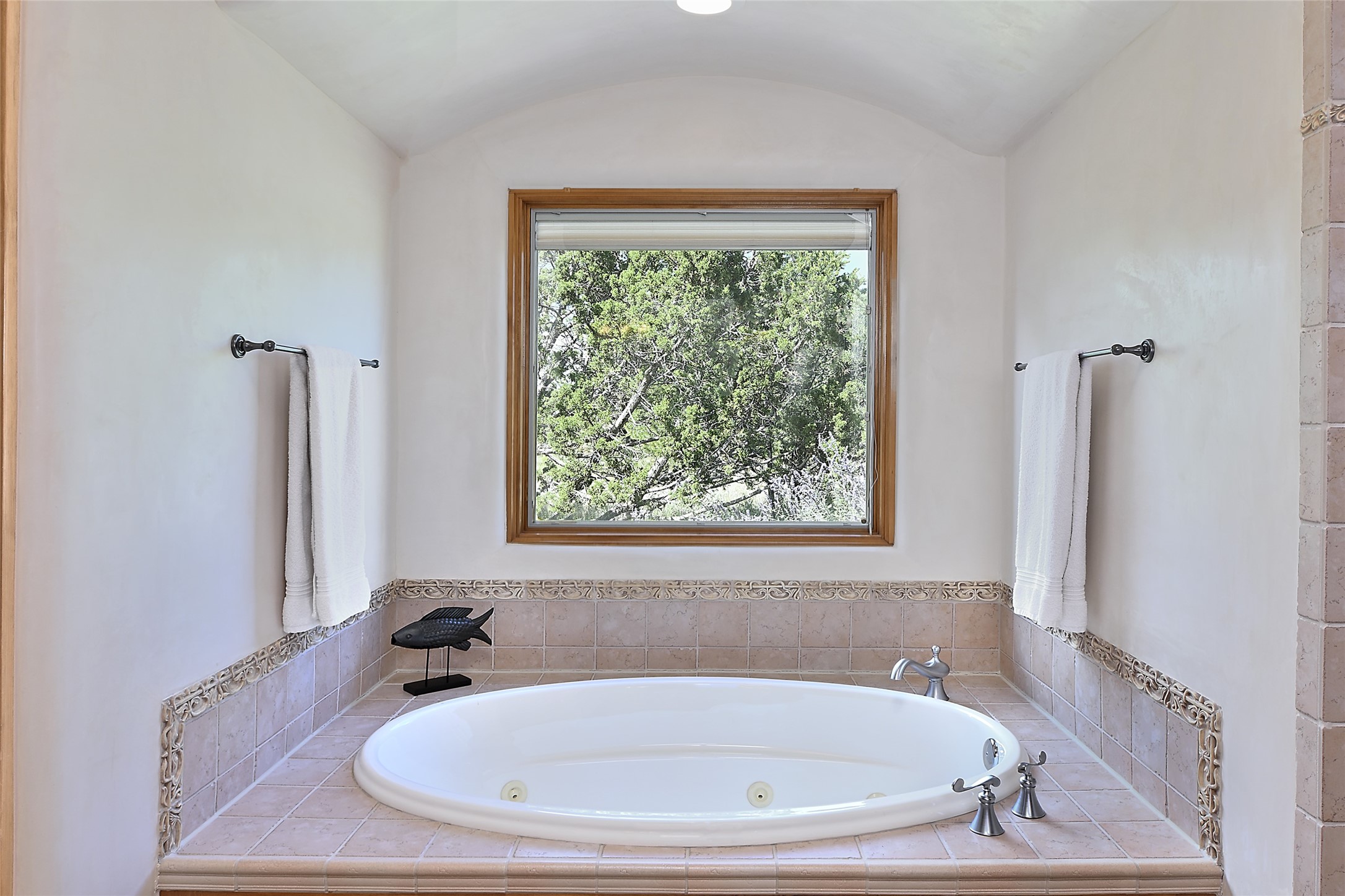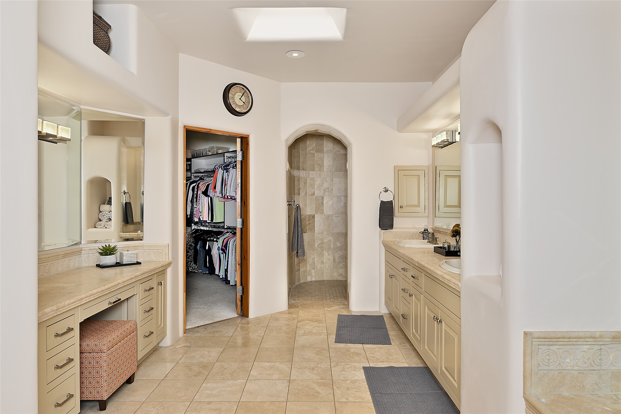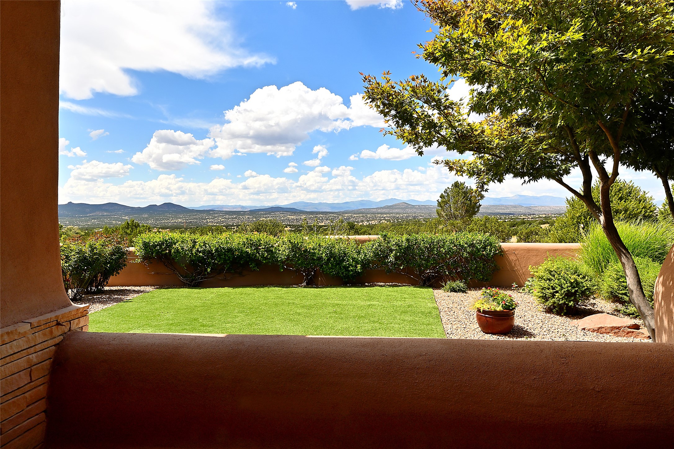 This elegant home epitomizes soft contemporary luxury, capturing sweeping Jemez Mountain vistas and sunset hues, embodying relaxed yet refined living. Intricate plaster walls and rustic vigas grace high coved ceilings, showcasing meticulous craftsmanship. Custom cabinetry, stone counters, and delicate leaded glass windows add luminous charm. The heart is the meticulously designed kitchen with hardwood floors and a commanding center island. Cherry wood cabinetry exudes opulence, complementing top-tier appliances. A fireplace-graced breakfast nook and a thoughtful pantry , plus an integrated desk area blend practicality and elegance. Seamless indoor-outdoor access harmonizes nature with daily life. Explore the versatile library/media room with hard wood floors, a tasteful bar, and an Anasazi stacked stone fireplace. Living and dining rooms seamlessly merge, united by their appreciation for panoramic views. A fireplace graces the living room, while French doors open to the grand portal--an open-air sanctuary featuring a prominent fireplace and banco seating--a canvas for al fresco dining, conversations, and immersive views. The master suite is a relaxation haven, with a fireplace-adorned sitting area framing inspiring views. Dual vanities, a built-in dressing table, deep jetted tub, expansive shower, and beautifully fitted walk-in closet define the master bath. Outdoor access enhances the experience. Completing the home are two guest bedrooms, each an oasis of comfort with ensuite baths and a 3 car garage with copious storage and this could be your forever haven.