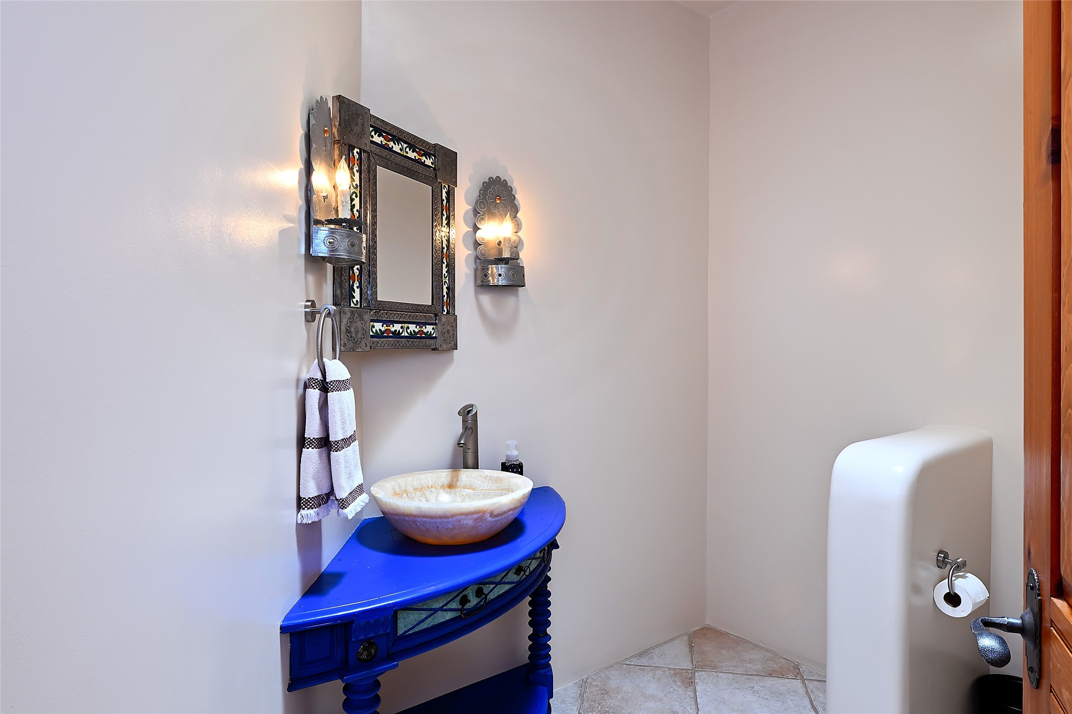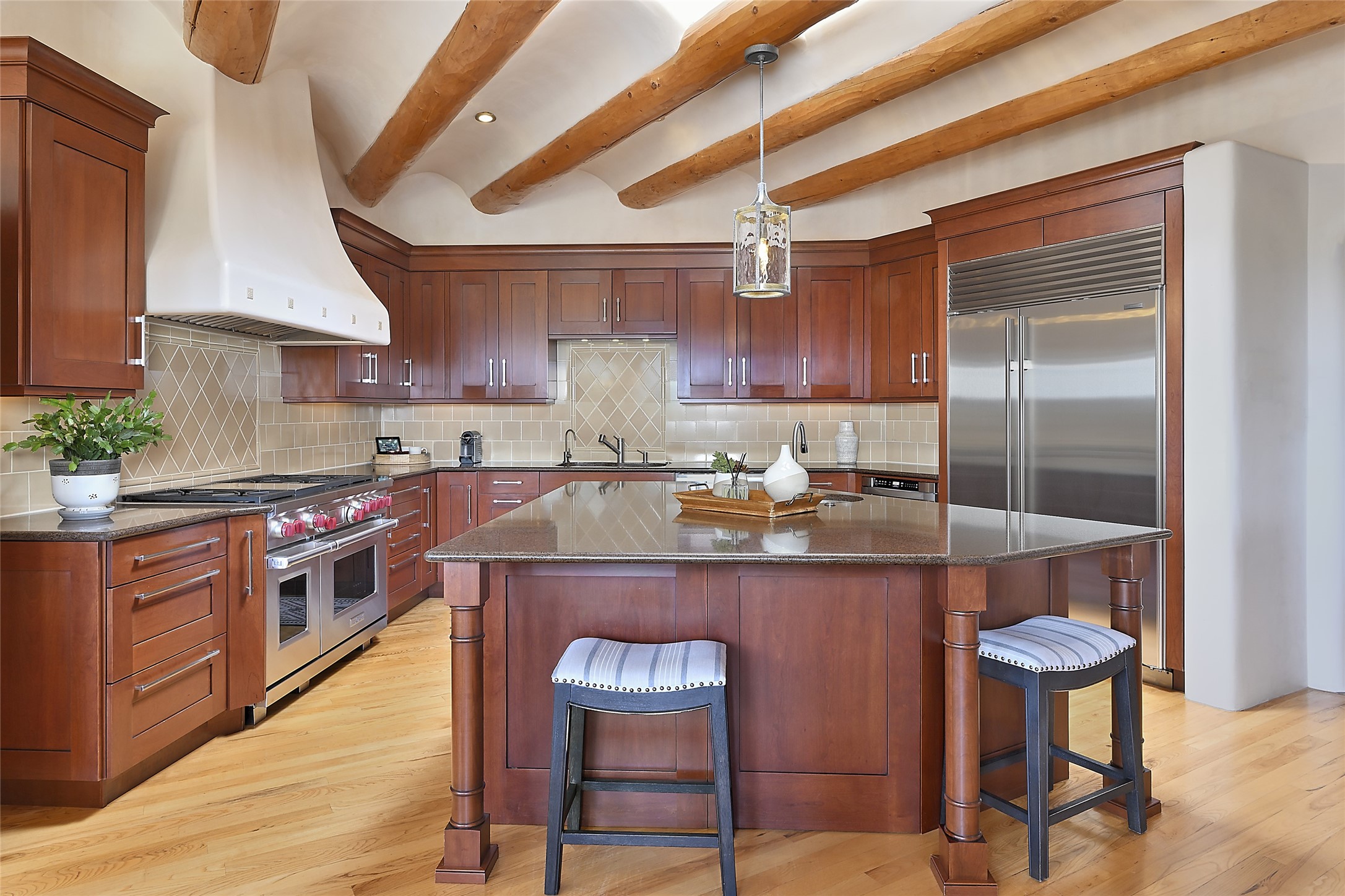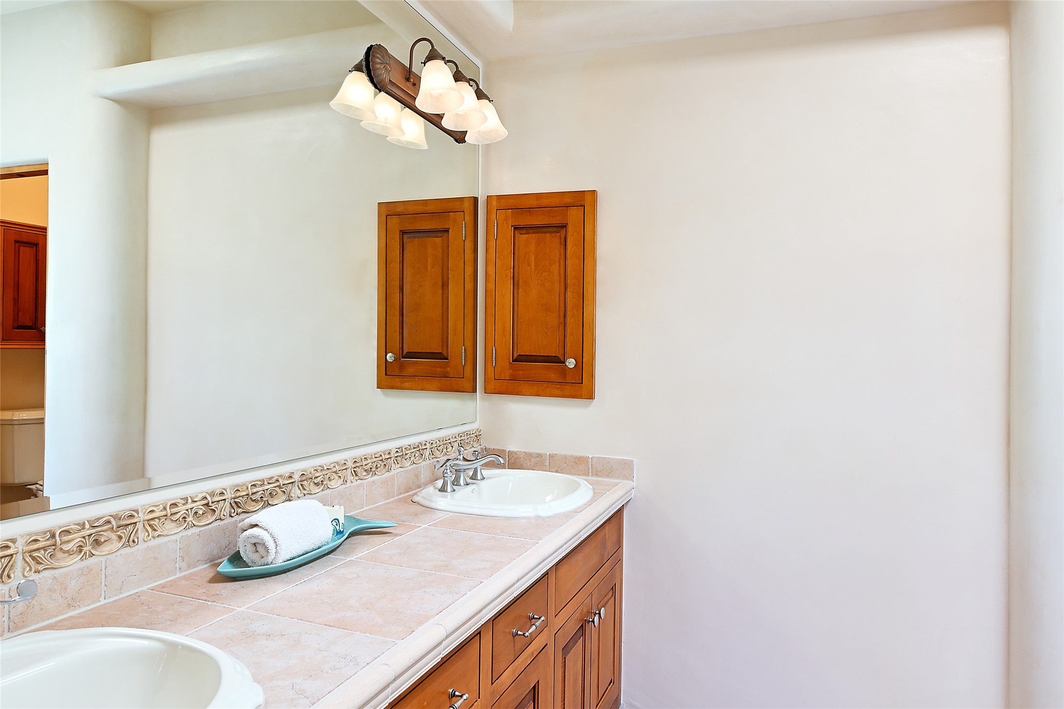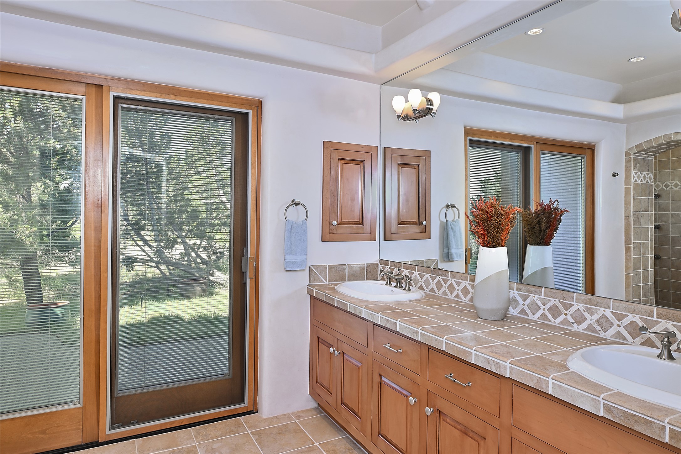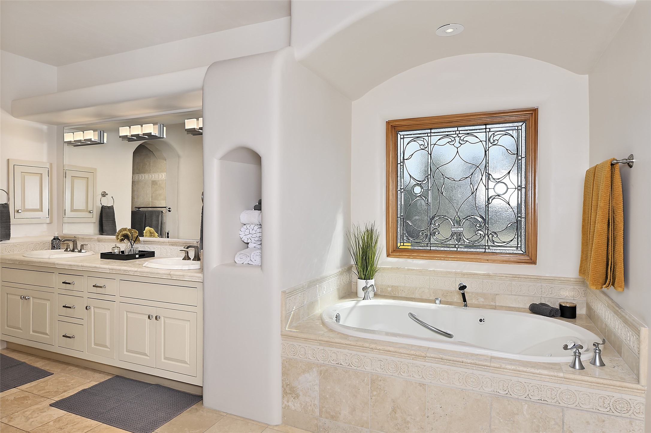 This elegant home epitomizes soft contemporary luxury, capturing sweeping Jemez Mountain vistas and sunset hues, embodying relaxed yet refined living. Intricate plaster walls and rustic vigas grace high coved ceilings, showcasing meticulous craftsmanship. Custom cabinetry, stone counters, and delicate leaded glass windows add luminous charm. The heart is the meticulously designed kitchen with hardwood floors and a commanding center island. Cherry wood cabinetry exudes opulence, complementing top-tier appliances. A fireplace-graced breakfast nook and a thoughtful pantry , plus an integrated desk area blend practicality and elegance. Seamless indoor-outdoor access harmonizes nature with daily life. Explore the versatile library/media room with hard wood floors, a tasteful bar, and an Anasazi stacked stone fireplace. Living and dining rooms seamlessly merge, united by their appreciation for panoramic views. A fireplace graces the living room, while French doors open to the grand portal--an open-air sanctuary featuring a prominent fireplace and banco seating--a canvas for al fresco dining, conversations, and immersive views. The master suite is a relaxation haven, with a fireplace-adorned sitting area framing inspiring views. Dual vanities, a built-in dressing table, deep jetted tub, expansive shower, and beautifully fitted walk-in closet define the master bath. Outdoor access enhances the experience. Completing the home are two guest bedrooms, each an oasis of comfort with ensuite baths and a 3 car garage with copious storage and this could be your forever haven.