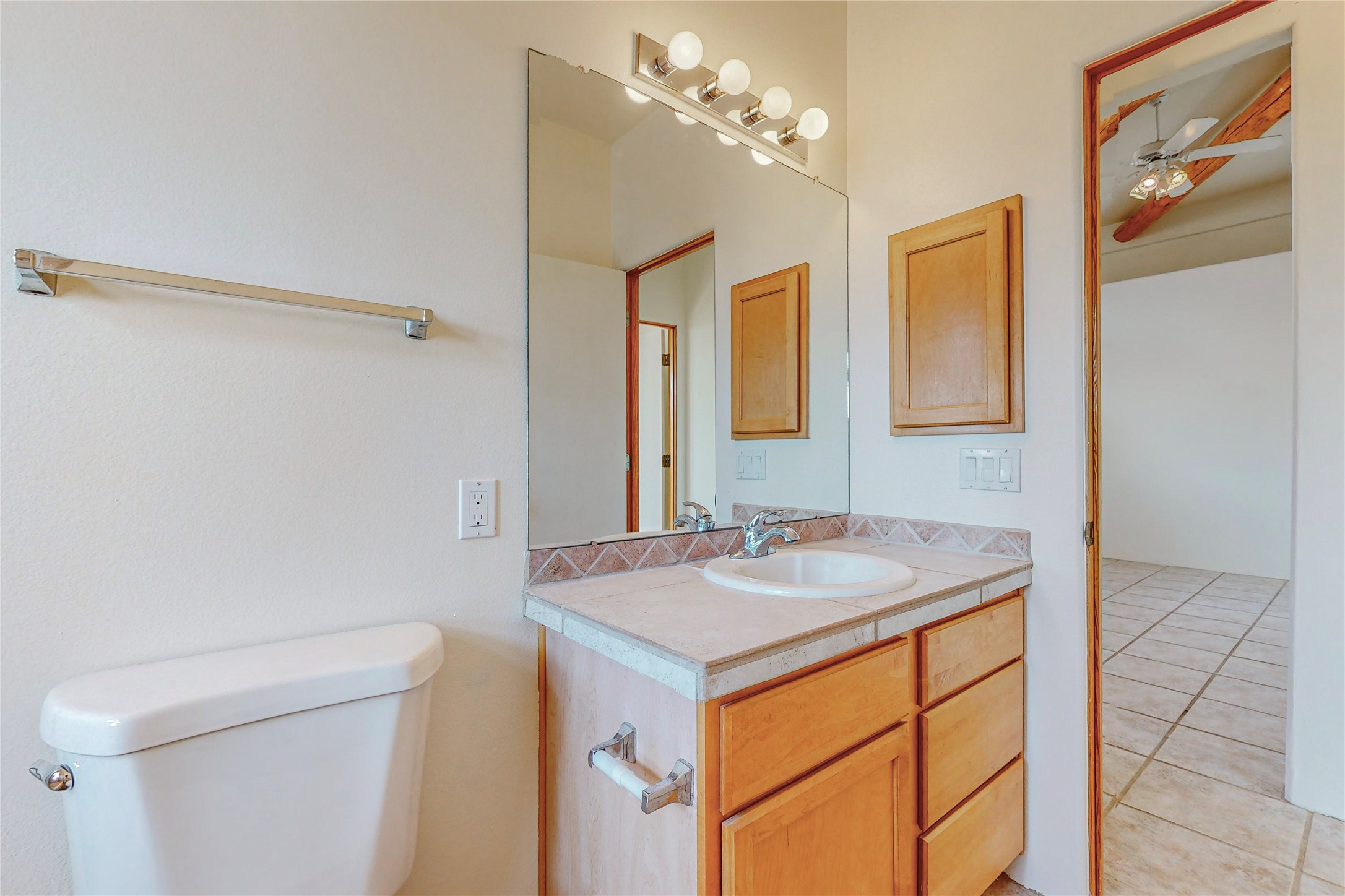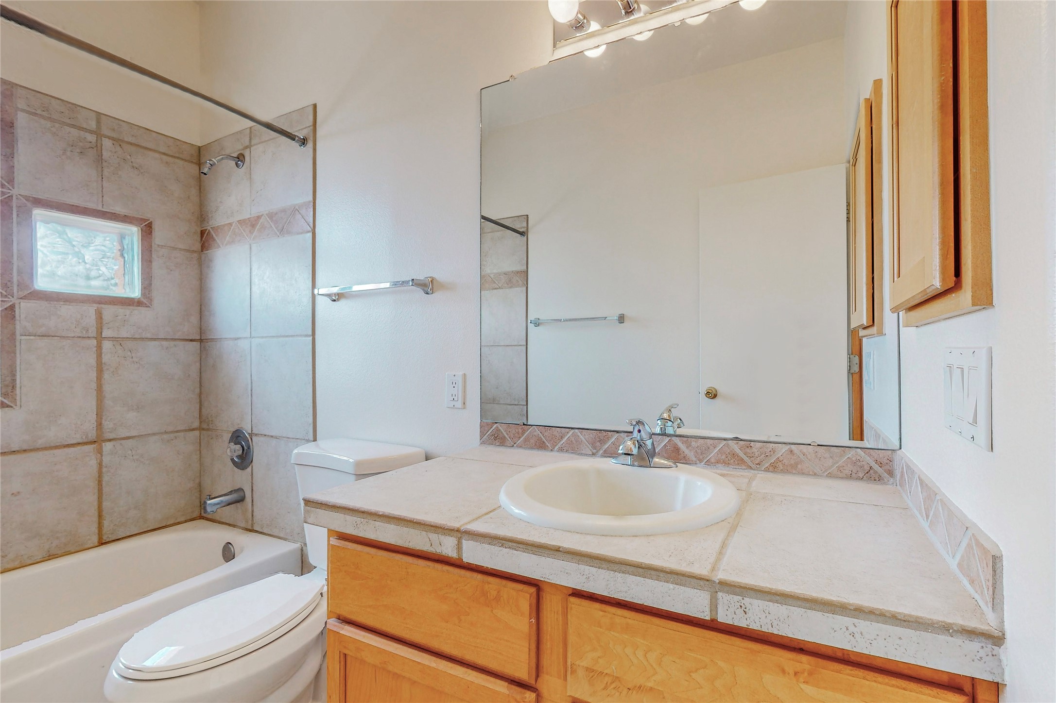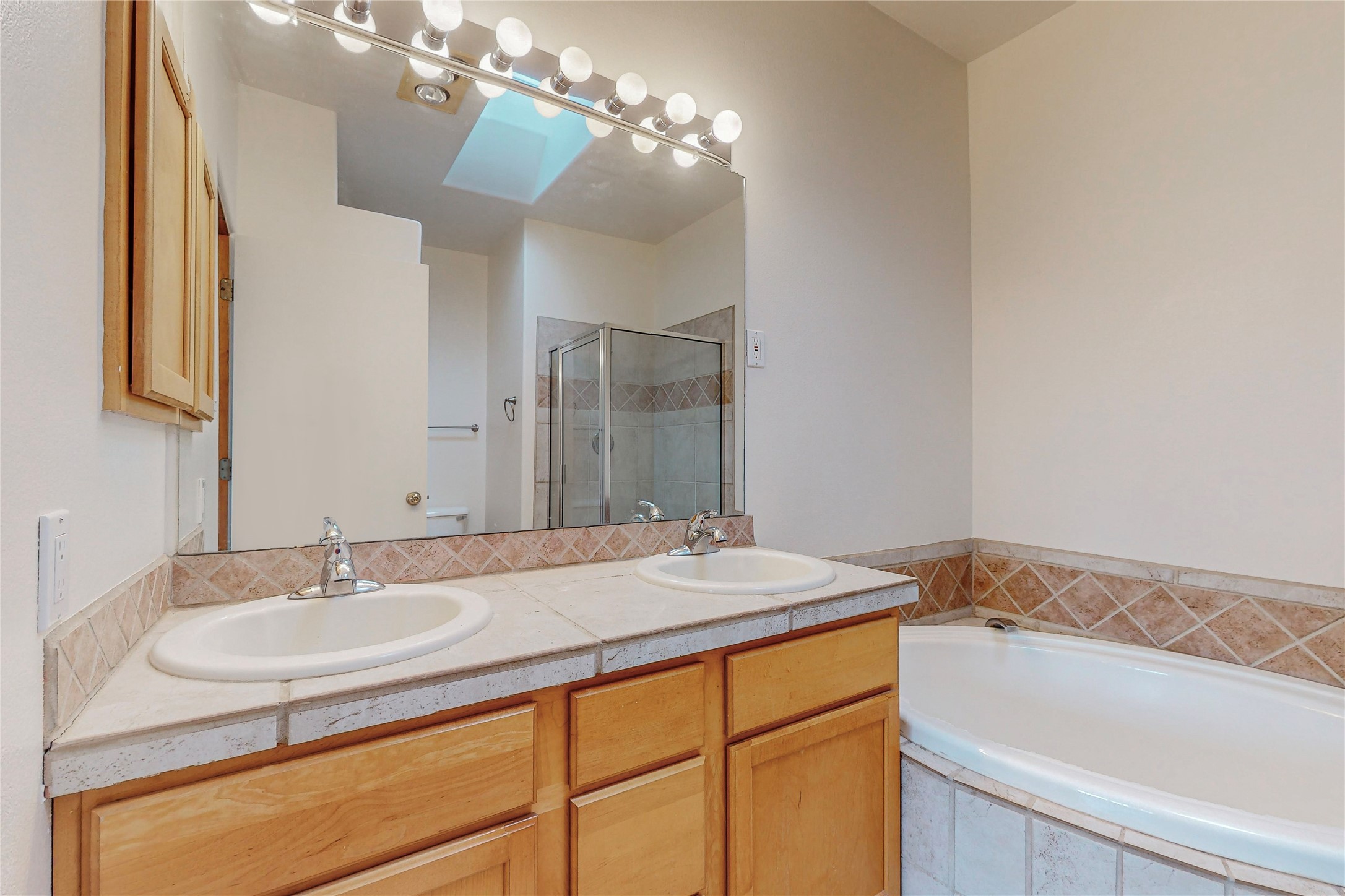 Open plan, split 3 bedroom, 2 bath home attached 800 sqft. 2 heated studios with huge high ceilings. Although small the high ceilings create a spacious feel. A sunburst design viga ceiling and corner living room fireplace opens to the kitchen and dining areas. The surrounding landscape is ready and invites your personal touches, and has sweeping mountain and sunset views. A large 2-car garage and plenty of guest parking adds convenience. Privately located on a cul de sac bordering a large greenbelt yet close to paved access roads leading to local shopping, restaurants, schools, senior center, and library. This home accesses all of Eldorado community activities and trails plus only minutes into Santa Fe.