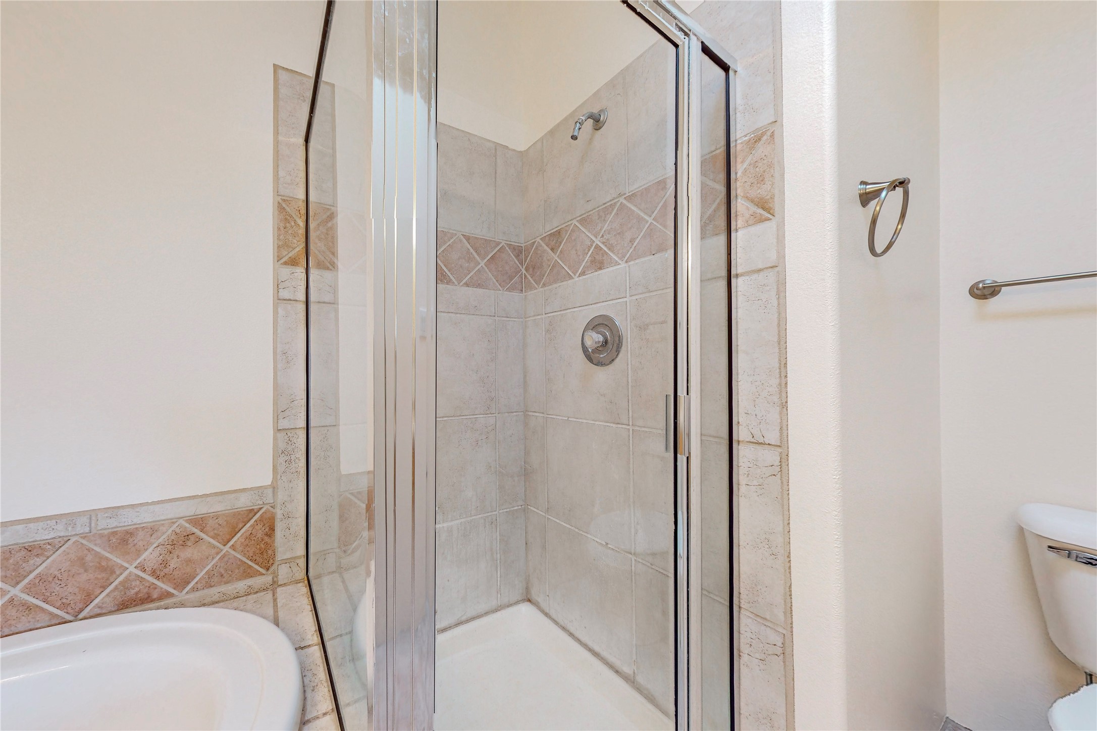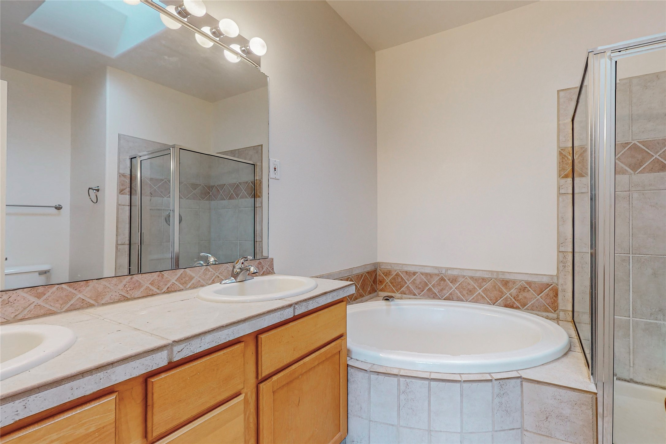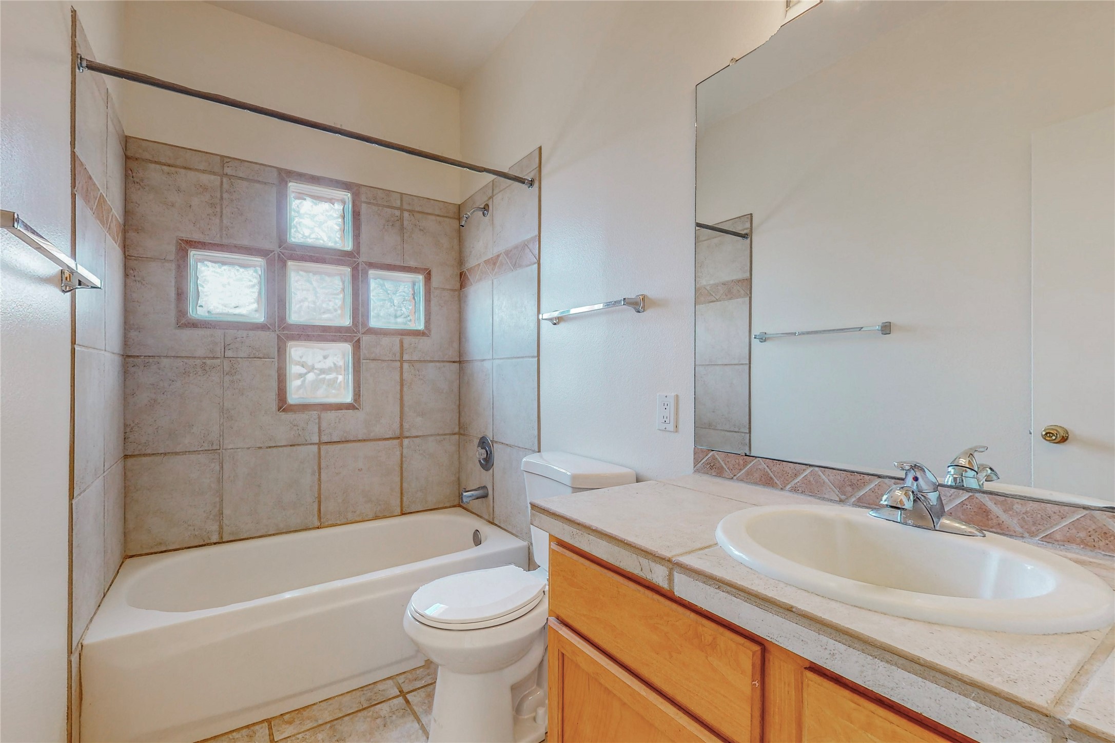 Open plan, split 3 bedroom, 2 bath home attached 800 sqft. 2 heated studios with huge high ceilings. Although small the high ceilings create a spacious feel. A sunburst design viga ceiling and corner living room fireplace opens to the kitchen and dining areas. The surrounding landscape is ready and invites your personal touches, and has sweeping mountain and sunset views. A large 2-car garage and plenty of guest parking adds convenience. Privately located on a cul de sac bordering a large greenbelt yet close to paved access roads leading to local shopping, restaurants, schools, senior center, and library. This home accesses all of Eldorado community activities and trails plus only minutes into Santa Fe.