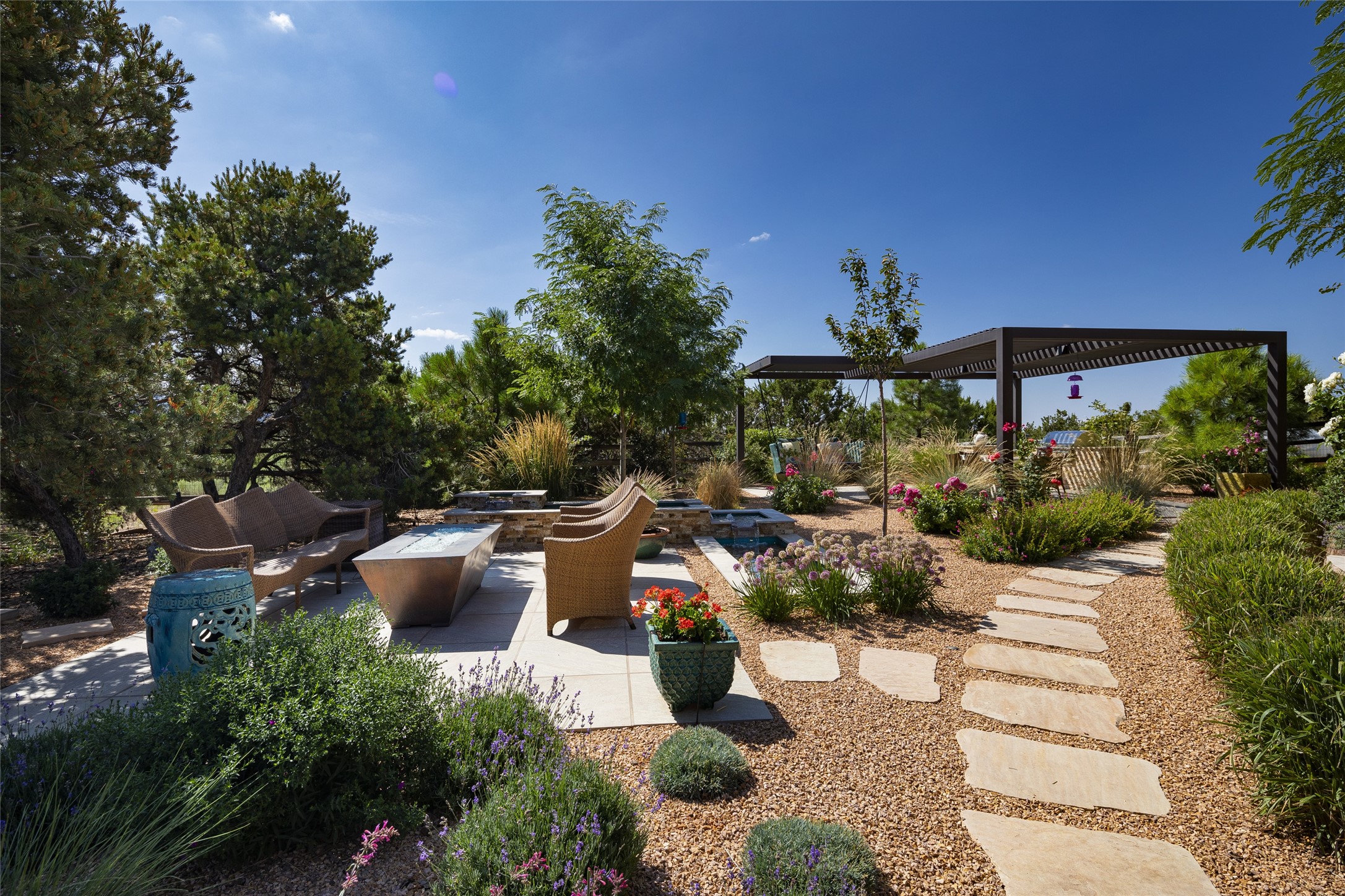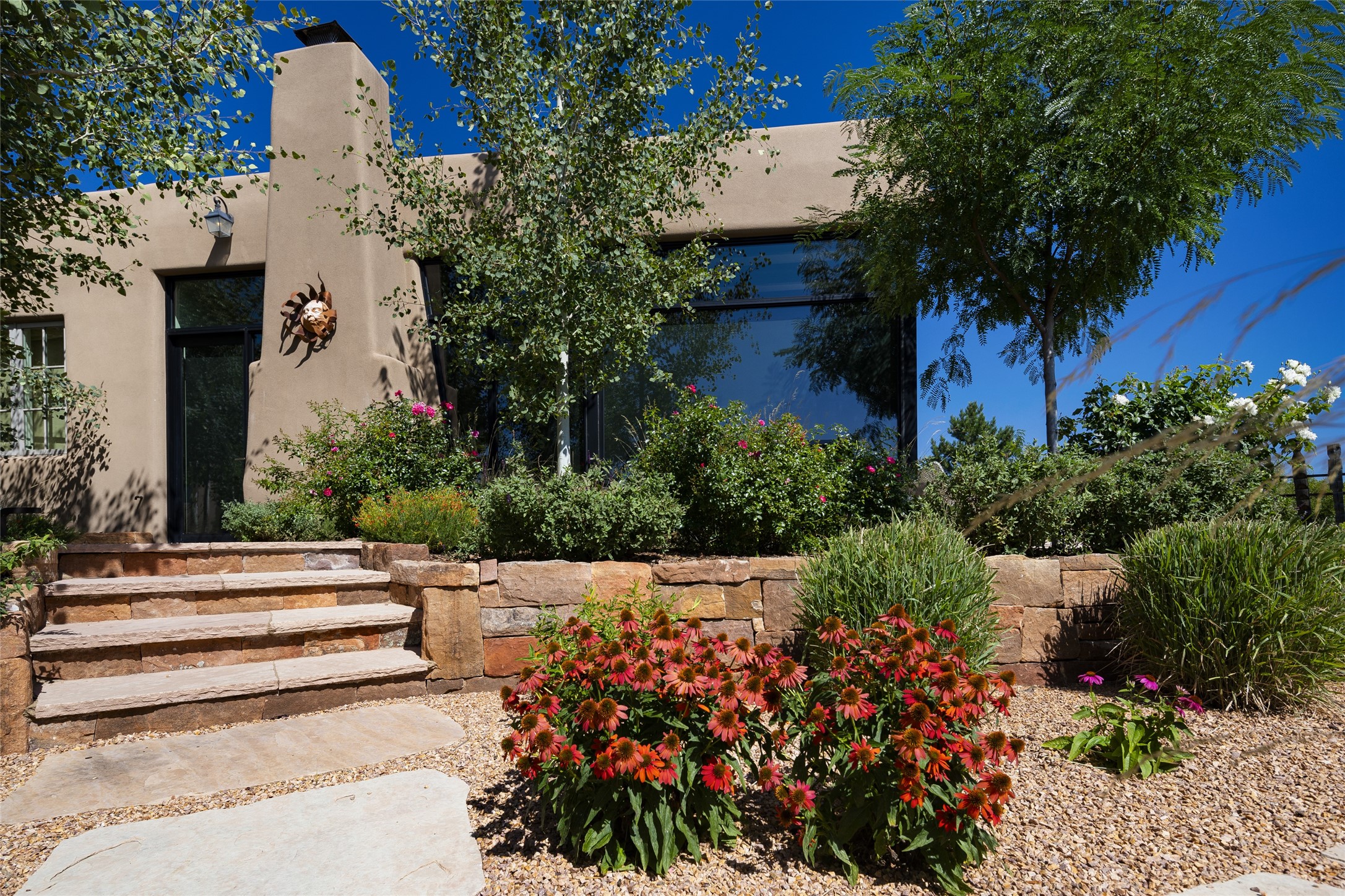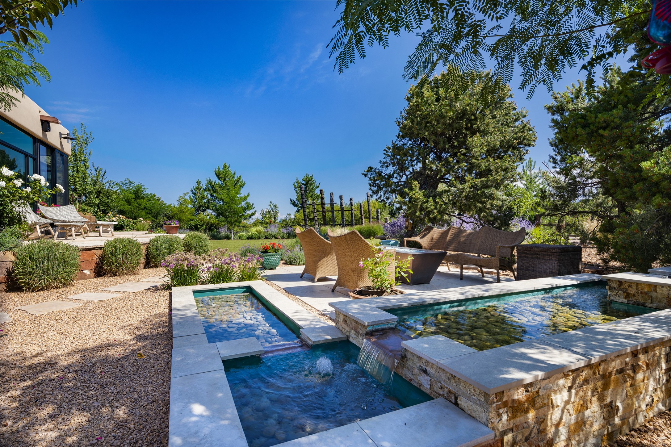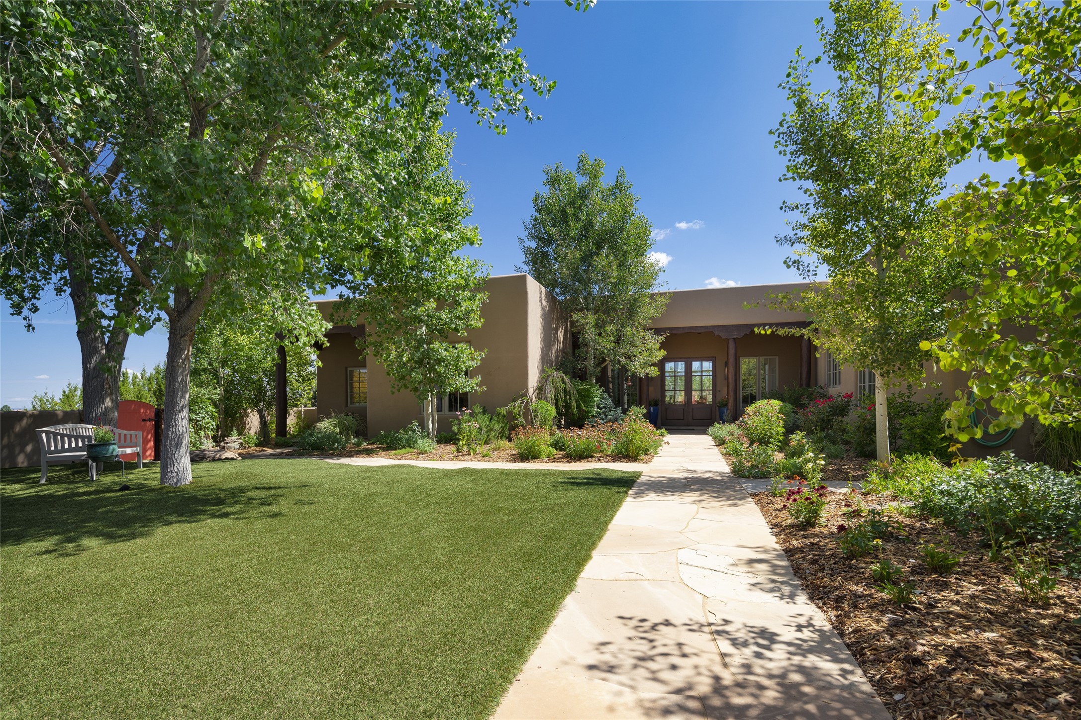 EXPERIENCE THE BEST-OF-THE-BEST IN THIS EXCITING SANTA FE PROPERTY WITH SWEEPING MOUNTAIN VIEWS LOCATED ON A RARE ELEVATED 5+ ACRE PARCEL ON COVETED TANO ROAD. Casa de la Luz is an open, airy, happy, single level home with natural light and lush gardens that enhance the home at every turn. Private gated entry and winding driveway are just the beginning. This exquisite residence has been renovated practically stem-to-stern with first class materials that feel livable, luxurious and relaxing. Dazzling white hand plastered walls, soaring ceilings and banks of windows take your eyes to the WOW views of mountain and sky! Elegant gates lead to the front courtyard with a water feature and impressive double doors that peak through the home to the Sangre de Cristo Mountains. The cook's kitchen is welcoming with plenty of counter space, high-end appliances and a den-like informal dining area. Entertain with style and grace at this stunning property which offers 3 bedrooms, each with an ensuite bathroom, and a separate office. The primary suite features a fireplace, a spa-like bathroom, a soaking tub, separate walk-in shower, and three oversized closets. The living room has soaring ceilings, a fireplace, and large windows that showcase the panoramic views. The sunroom is a perfect place to relax and enjoy the scenery, while the sitting room offers a cozy spot to read or watch TV. The property also includes a 3-car garage with epoxy floors and slat hanging units, a sleek laundry room, and a designer powder room with colors that subtly carry throughout the house. Fall in love with the outdoor living spaces filled with lush landscaping, water features, and mature trees, a covered patio with Lynx grill, and gated vegetable gardens where you can enjoy the peace and tranquility of nature, while being only minutes away from historic downtown Santa Fe. This is a rare opportunity to own a magnificent home in one of the most sought-after locations in Santa Fe. Live...Love...87506!