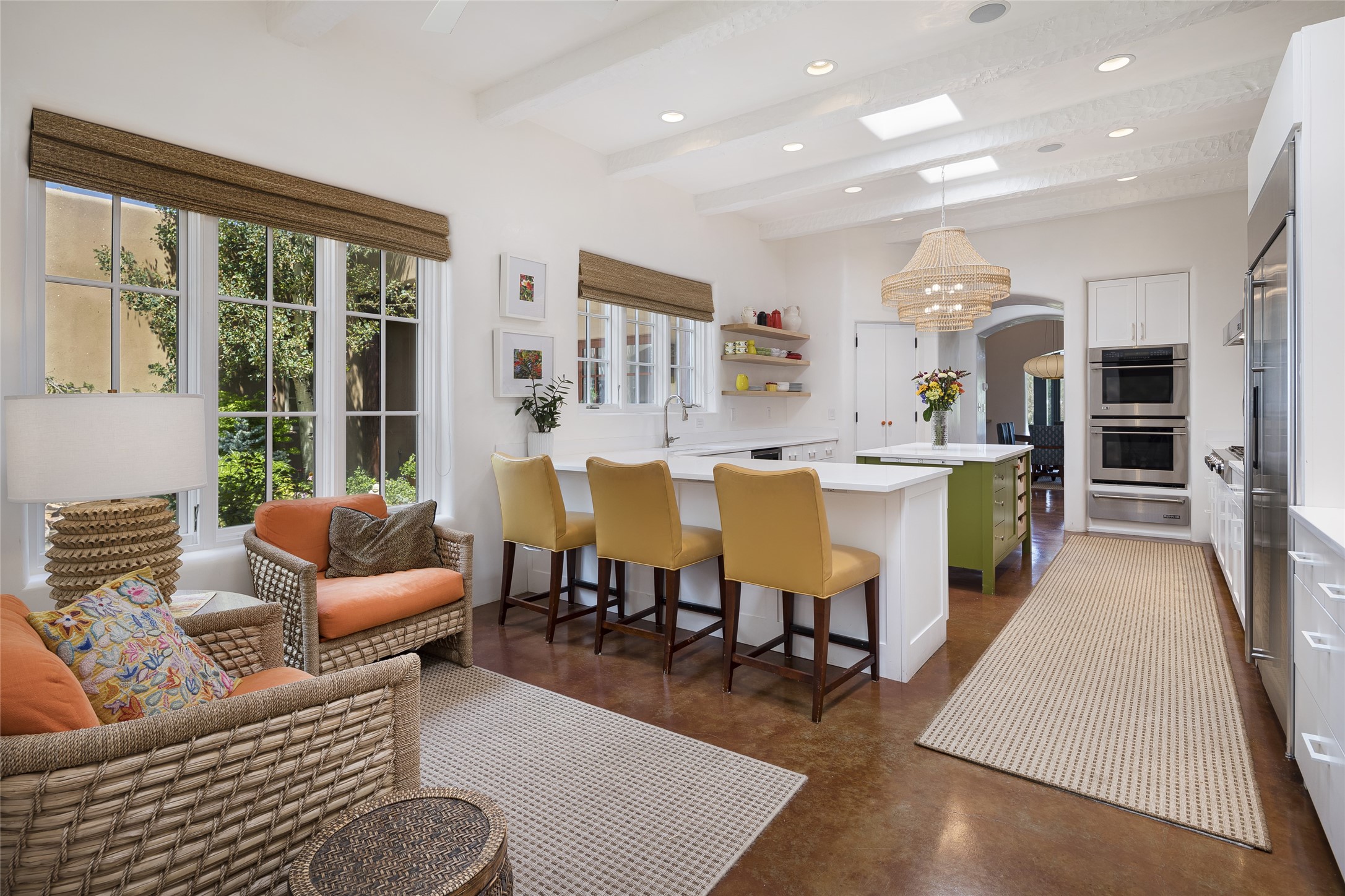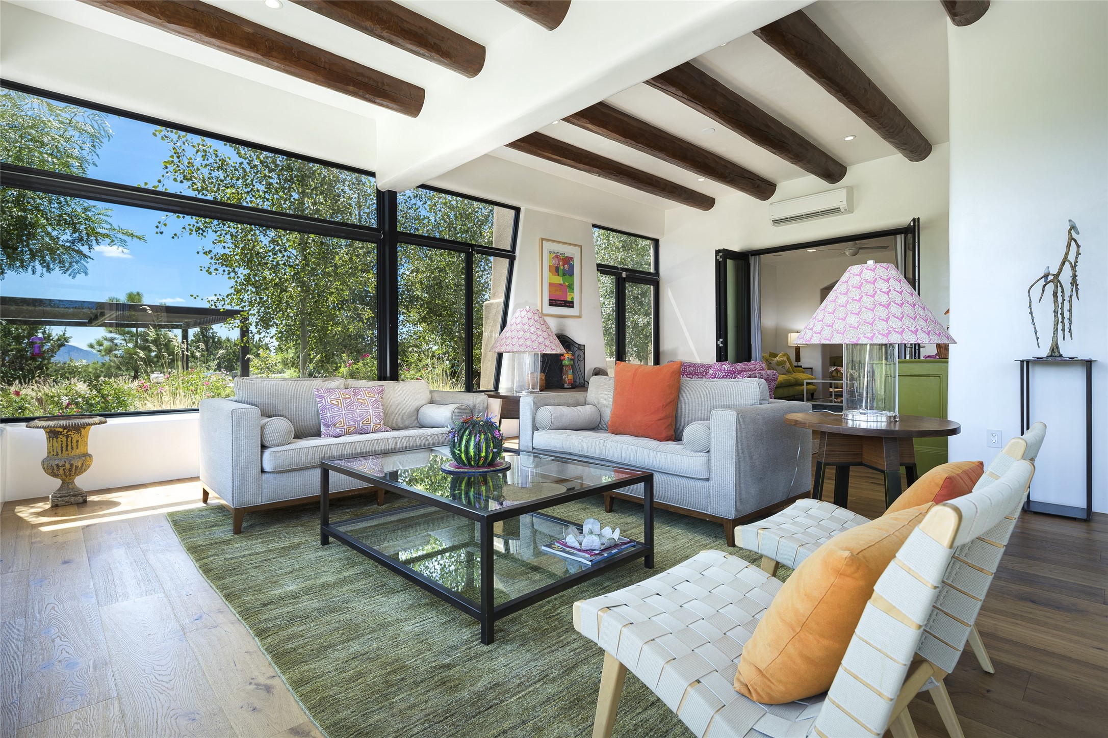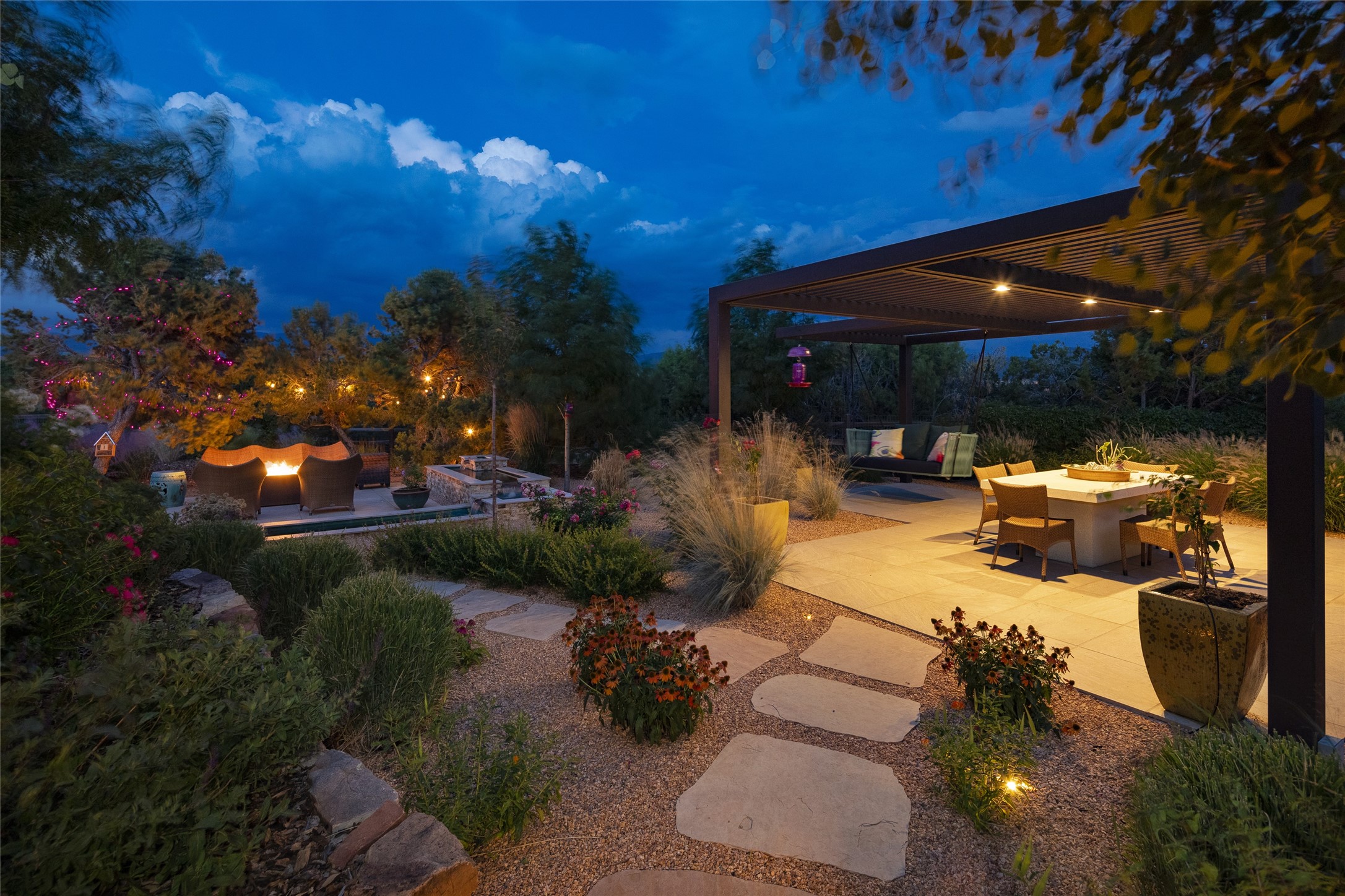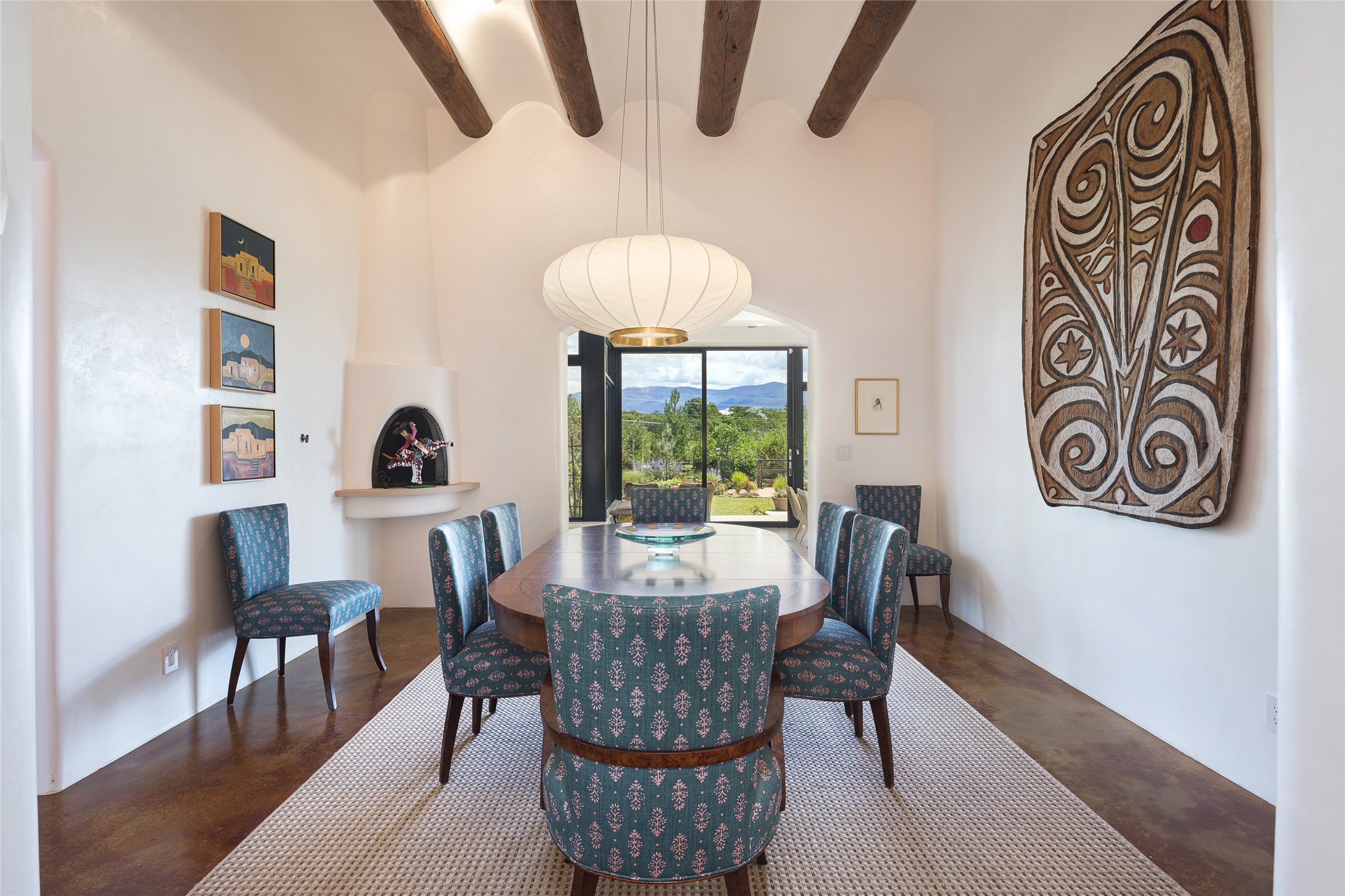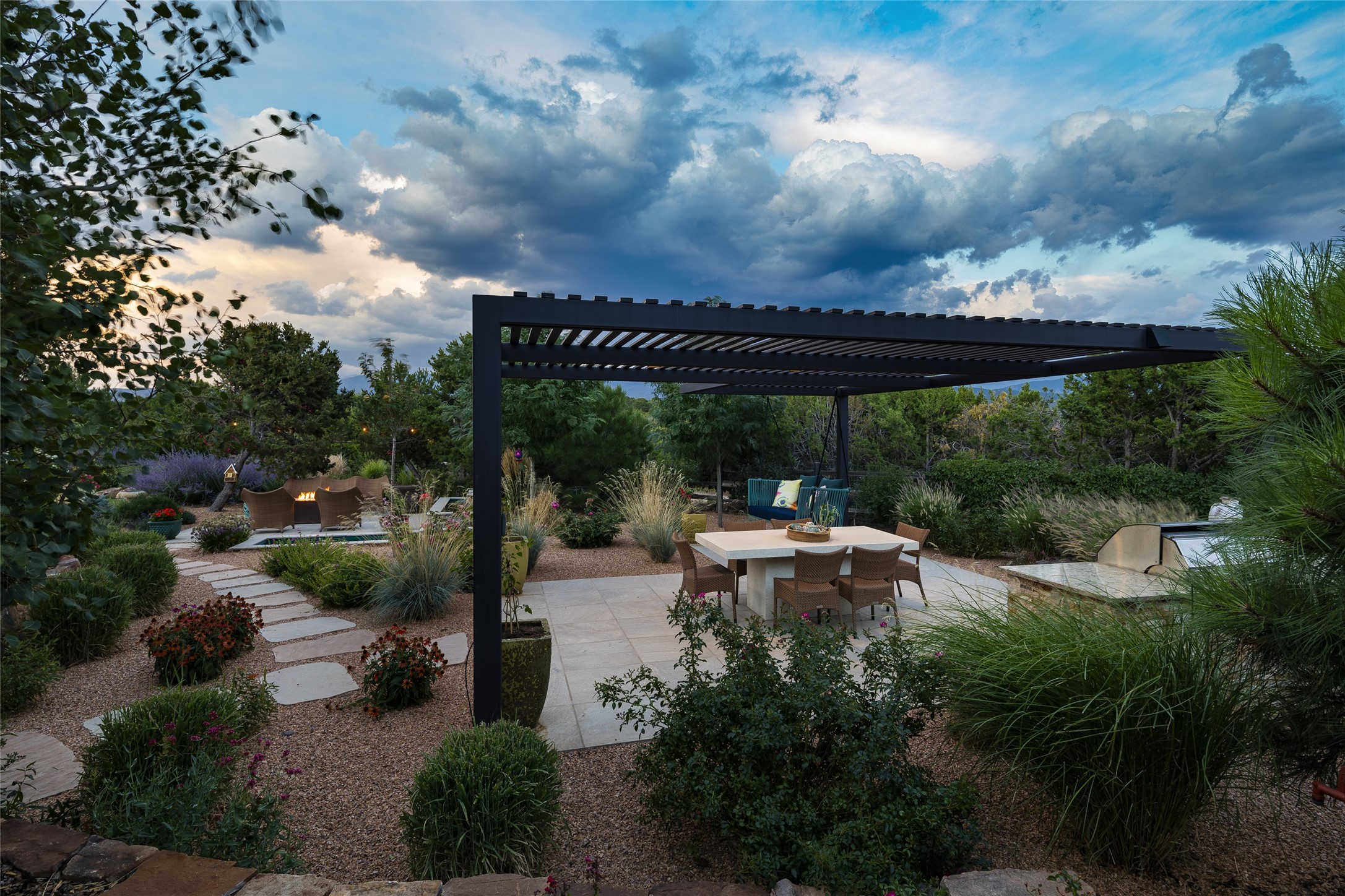 EXPERIENCE THE BEST-OF-THE-BEST IN THIS EXCITING SANTA FE PROPERTY WITH SWEEPING MOUNTAIN VIEWS LOCATED ON A RARE ELEVATED 5+ ACRE PARCEL ON COVETED TANO ROAD. Casa de la Luz is an open, airy, happy, single level home with natural light and lush gardens that enhance the home at every turn. Private gated entry and winding driveway are just the beginning. This exquisite residence has been renovated practically stem-to-stern with first class materials that feel livable, luxurious and relaxing. Dazzling white hand plastered walls, soaring ceilings and banks of windows take your eyes to the WOW views of mountain and sky! Elegant gates lead to the front courtyard with a water feature and impressive double doors that peak through the home to the Sangre de Cristo Mountains. The cook's kitchen is welcoming with plenty of counter space, high-end appliances and a den-like informal dining area. Entertain with style and grace at this stunning property which offers 3 bedrooms, each with an ensuite bathroom, and a separate office. The primary suite features a fireplace, a spa-like bathroom, a soaking tub, separate walk-in shower, and three oversized closets. The living room has soaring ceilings, a fireplace, and large windows that showcase the panoramic views. The sunroom is a perfect place to relax and enjoy the scenery, while the sitting room offers a cozy spot to read or watch TV. The property also includes a 3-car garage with epoxy floors and slat hanging units, a sleek laundry room, and a designer powder room with colors that subtly carry throughout the house. Fall in love with the outdoor living spaces filled with lush landscaping, water features, and mature trees, a covered patio with Lynx grill, and gated vegetable gardens where you can enjoy the peace and tranquility of nature, while being only minutes away from historic downtown Santa Fe. This is a rare opportunity to own a magnificent home in one of the most sought-after locations in Santa Fe. Live...Love...87506!