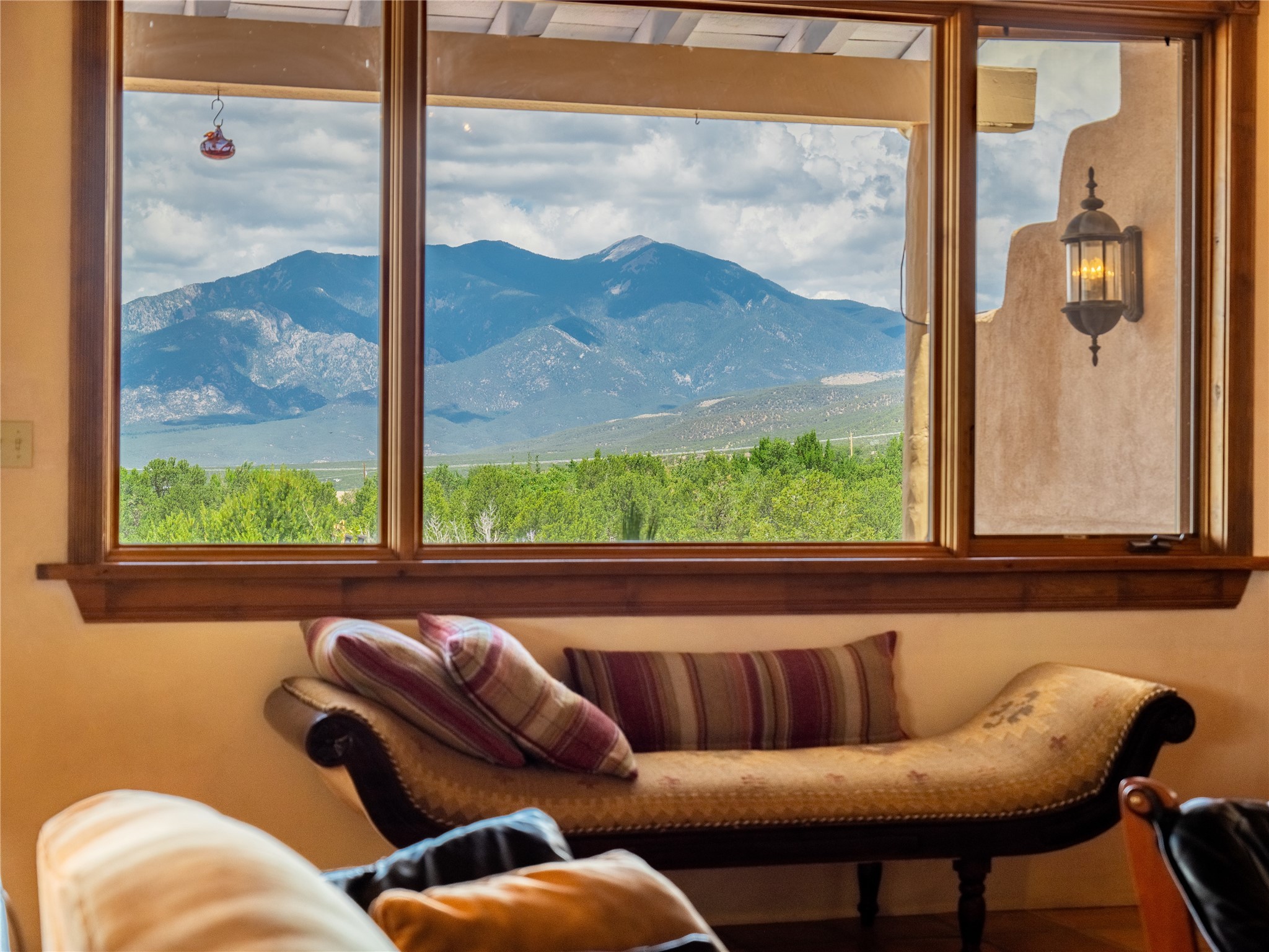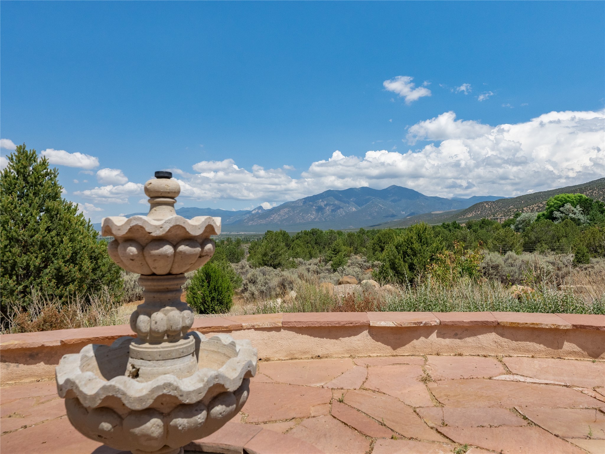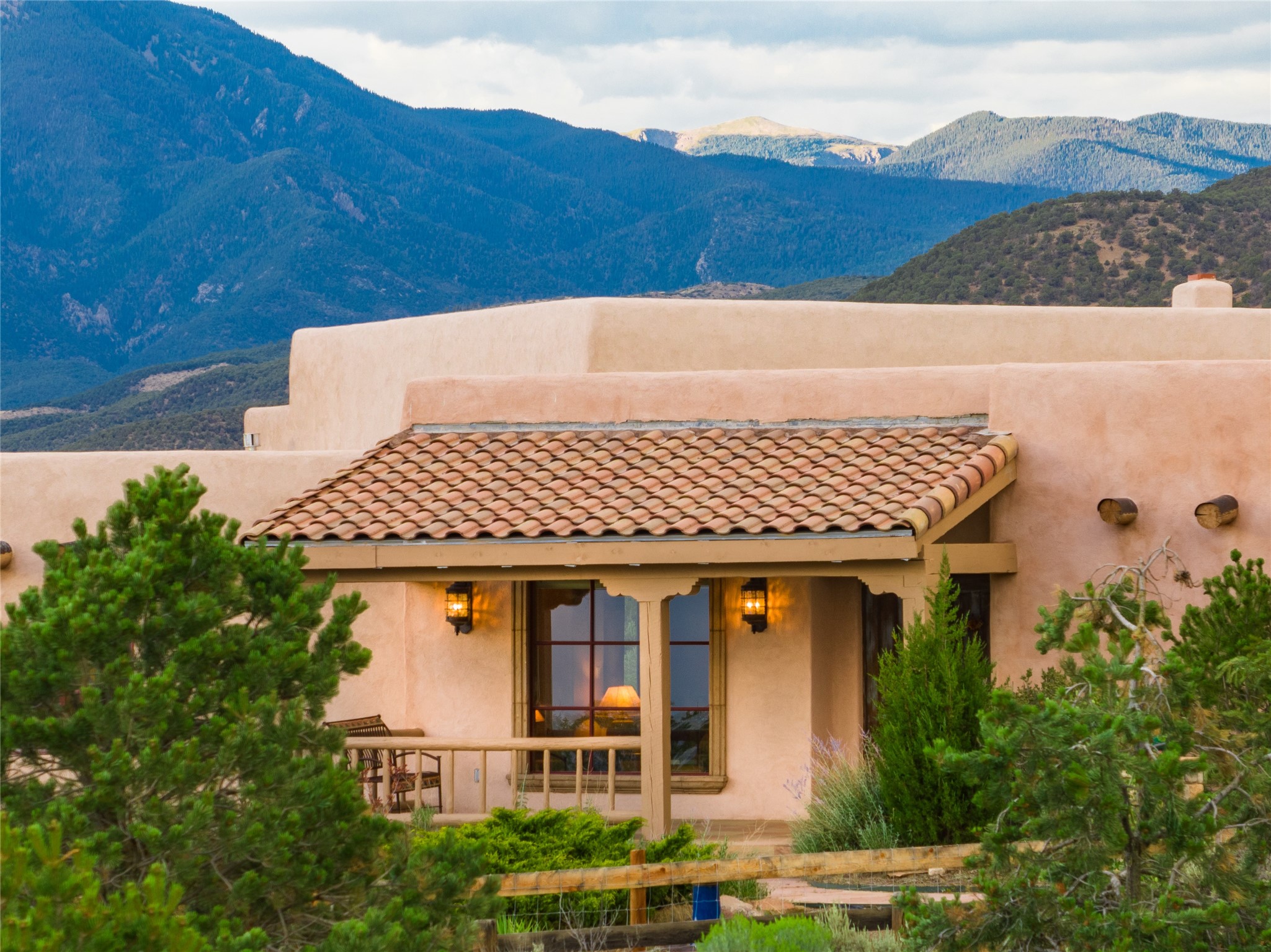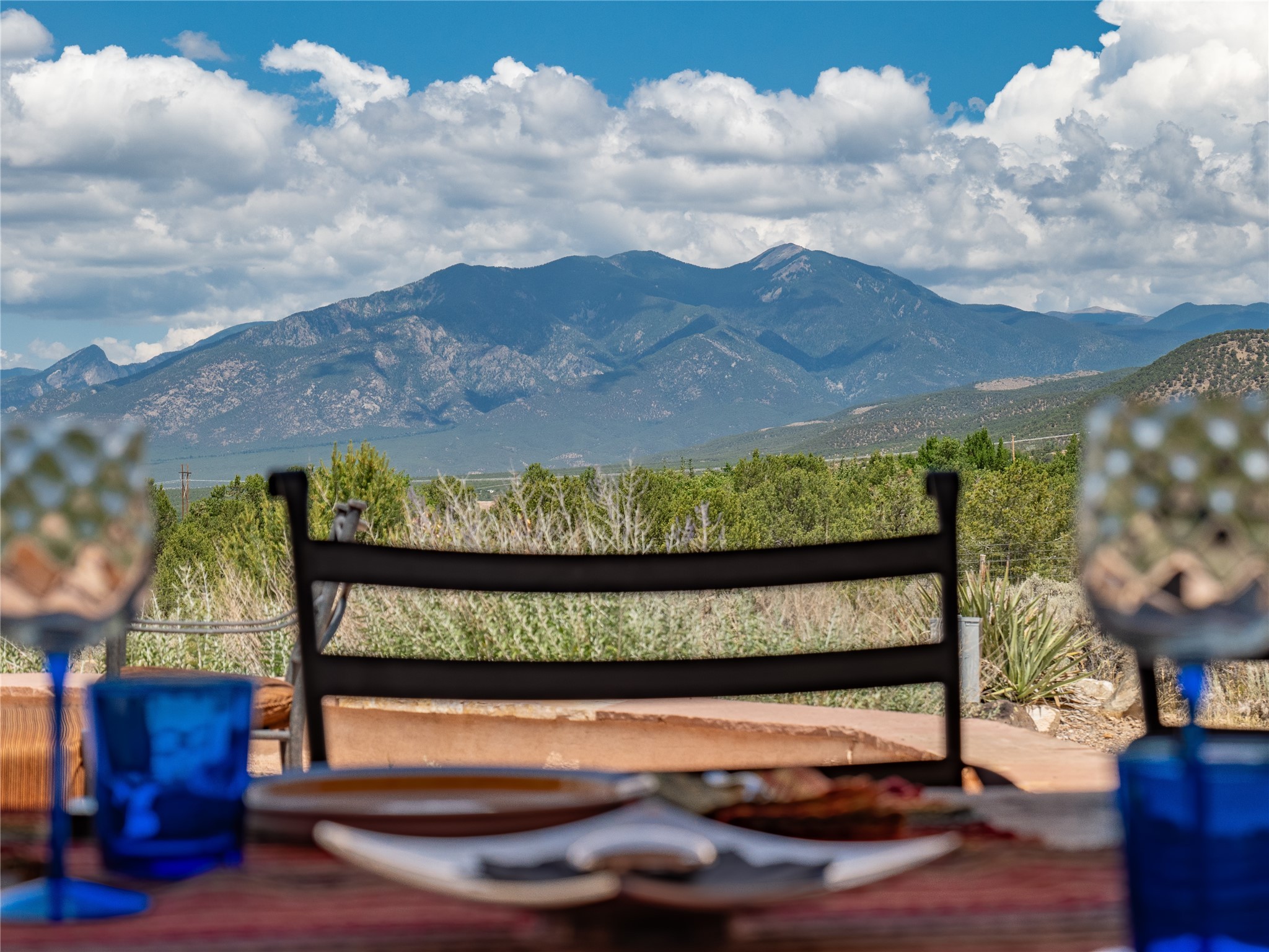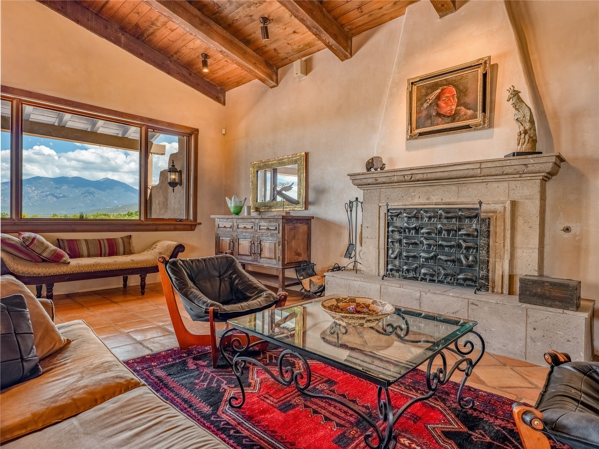 Come see this stunning Taos property before it's gone! Set on 3 acres in the Weimer neighborhood, the beautiful adobe-style home comes with excellent views of the Sangre de Cristo mountains. Inside, enjoy iconic Southwestern features such as saltillo tile floors, plaster walls, and large vigas throughout the entire home. Marvel at the unobstructed views of the mountains from the spacious living area with a vaulted ceiling, wood-burning fireplace, and access to the covered patio. The large kitchen offers beautiful wood cabinetry and tilework, a large pantry, and ample space for creating gourmet meals on the granite countertops. The primary bedroom has a kiva-style fireplace and the ensuite bathroom features a walk-in shower and large tub with luxury tiling and a massive walk-in closet. Two guest bedrooms with ensuite bathrooms offer plenty of room for the entire family. Additional features include a fourth bedroom that is currently setup as a billiards room and a laundry room with full size washer and dryer. An attached garage has room for two vehicles, and a separate outbuilding can store two more vehicles or be finished out as a studio or workshop. Enjoy the comforts of southwestern luxury with 1101 Hennings Street!