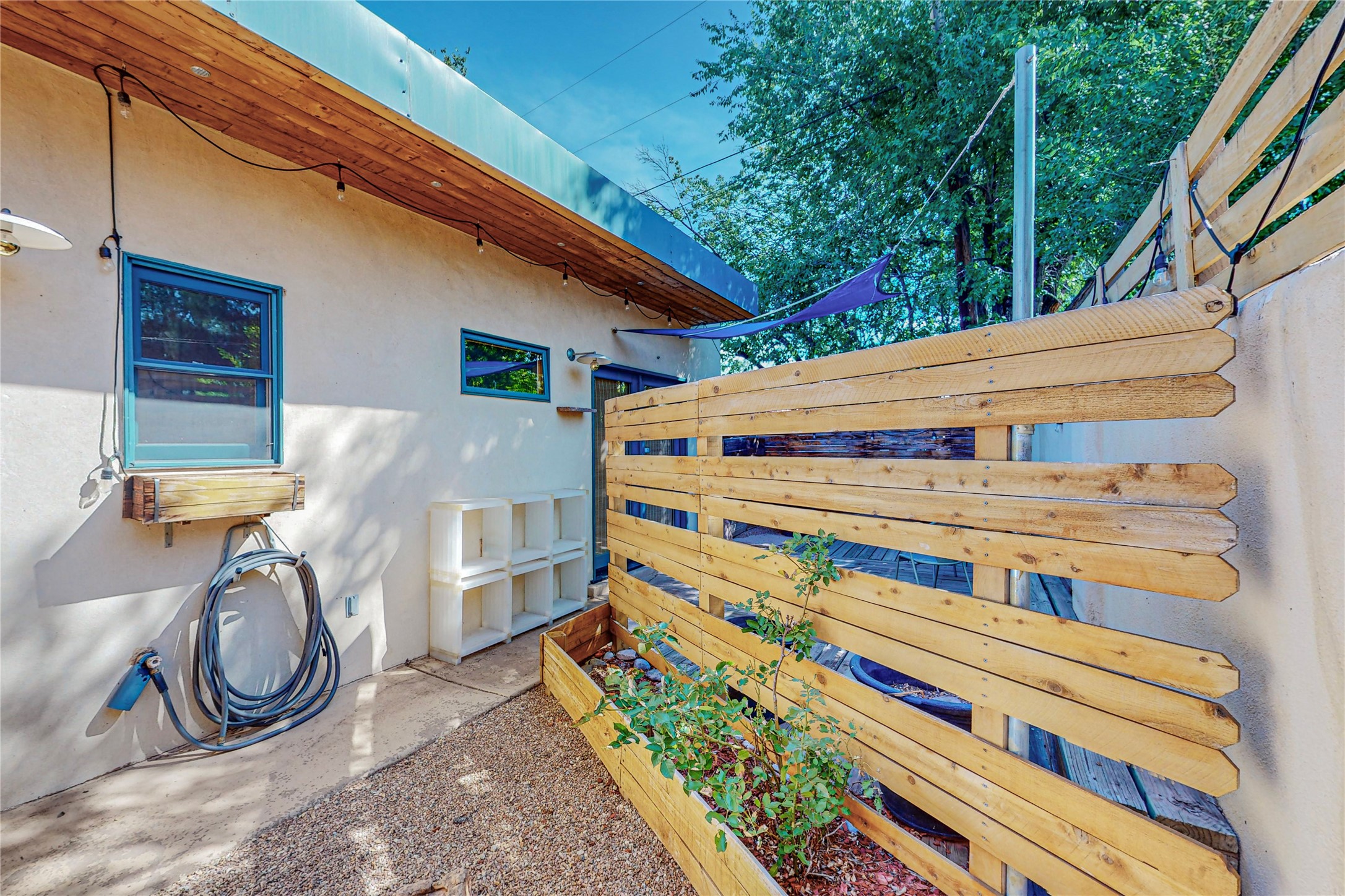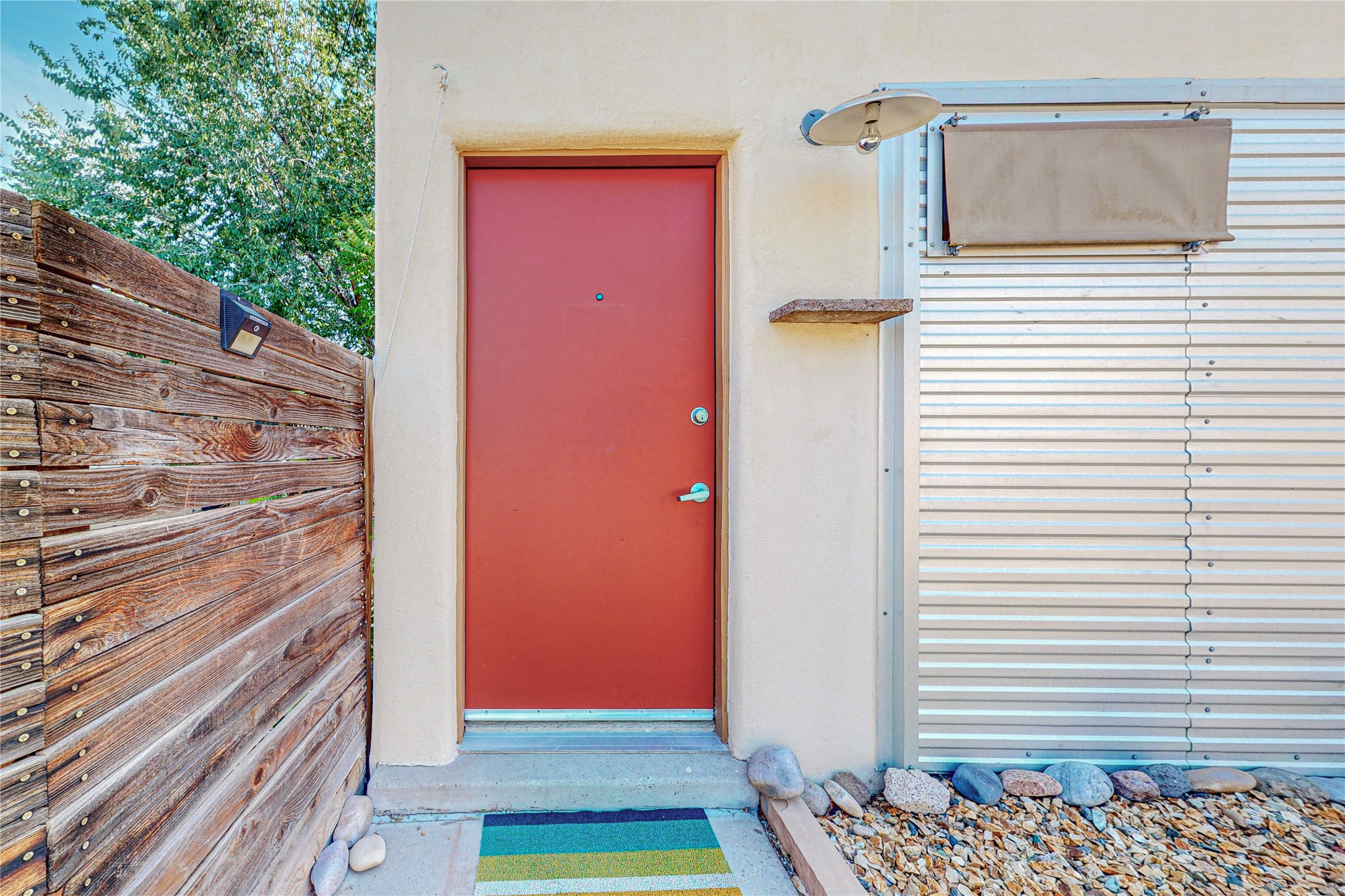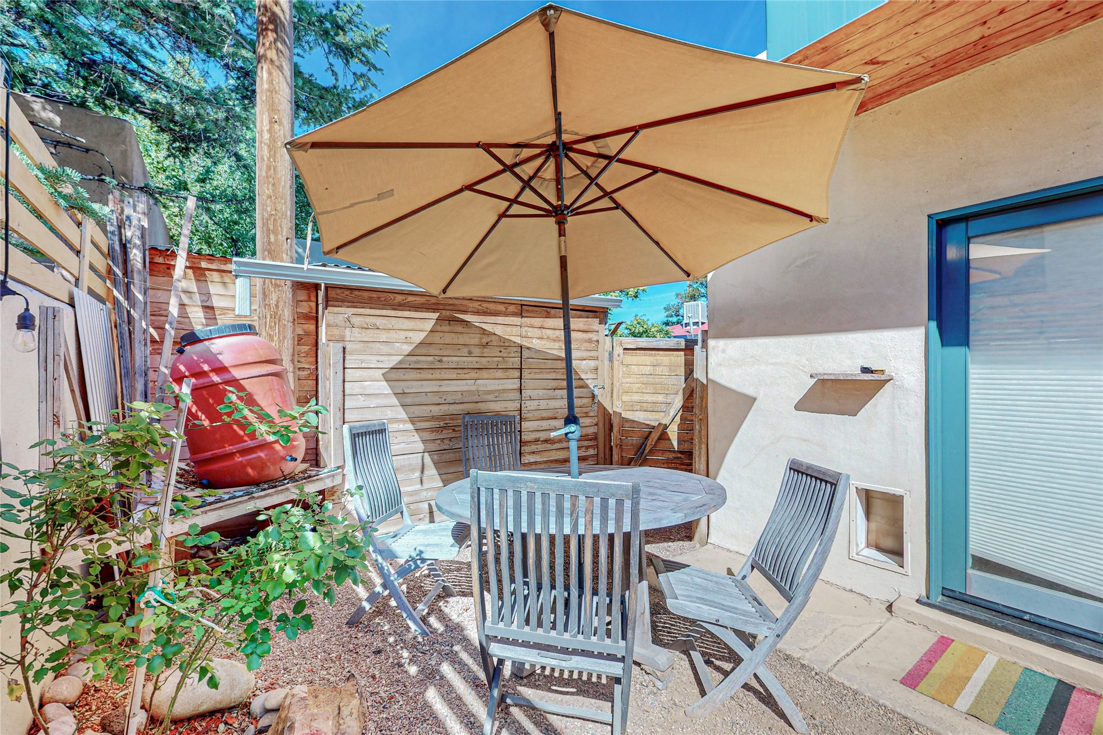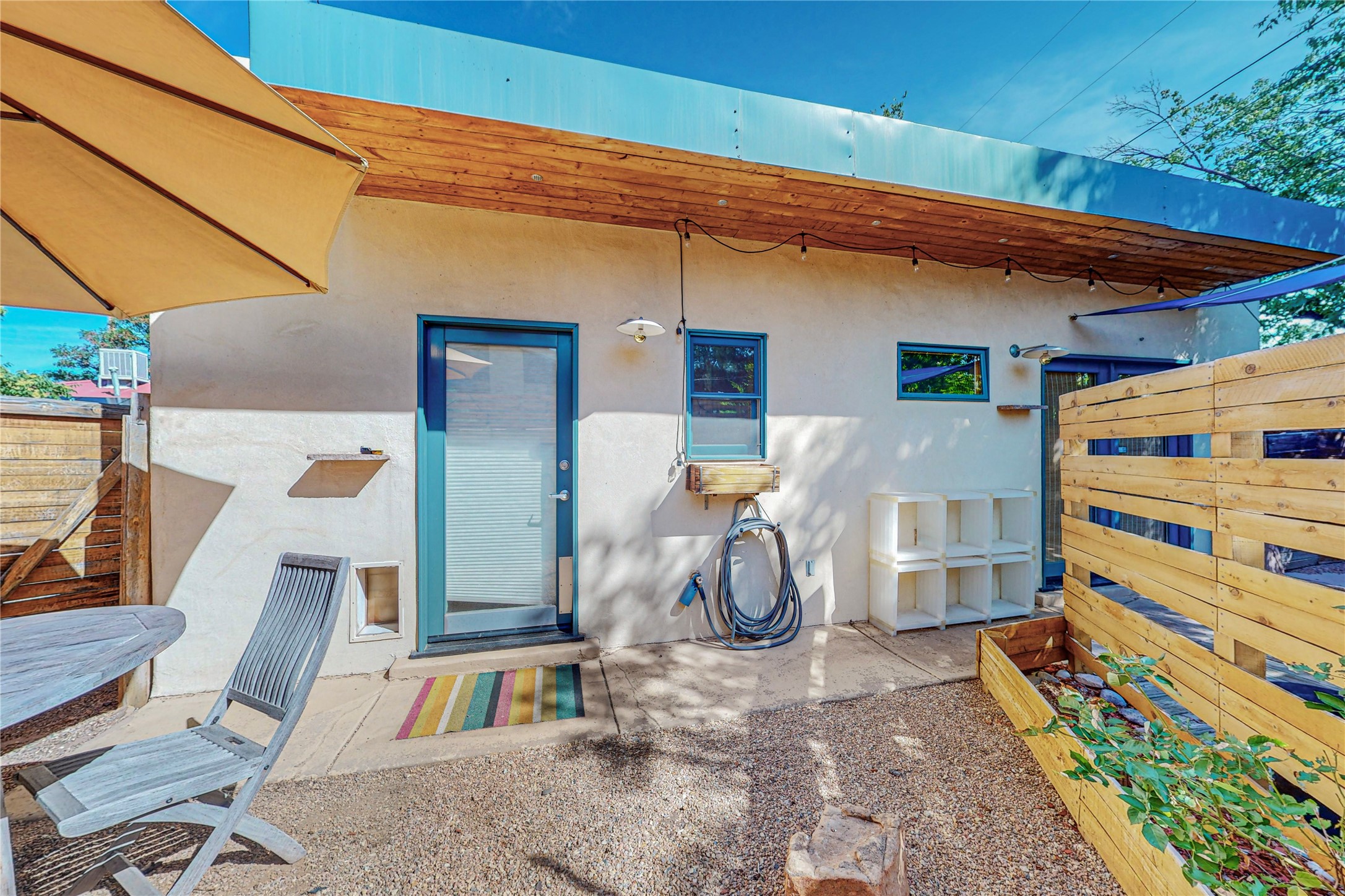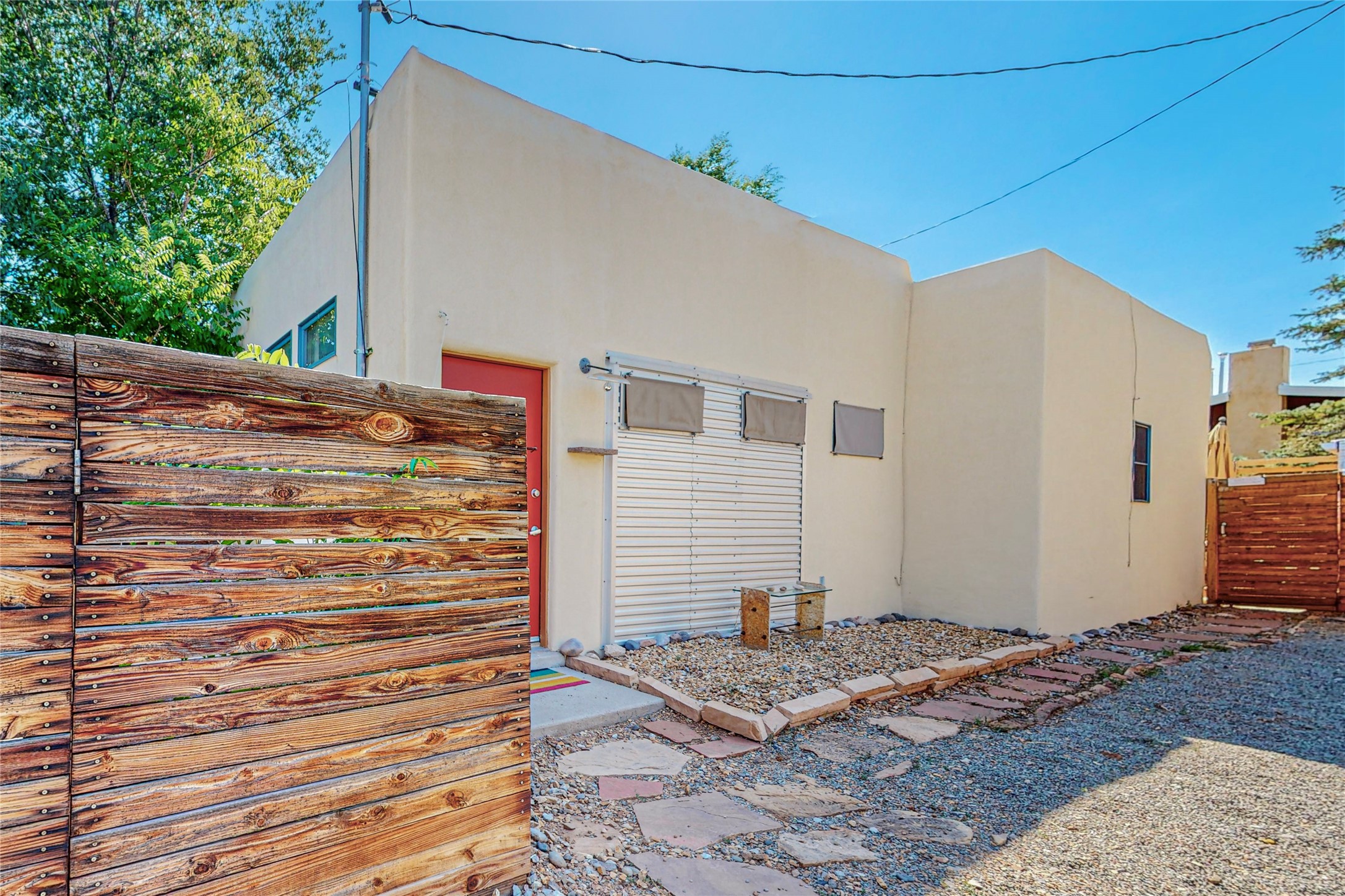 This private, freestanding condo enjoys modern finishes and is well set-back from the street, with off-street parking, for maximum privacy. Scandinavian design aesthetics by an award-winning designer conceived the contemporary floor plan, admitting tons of natural light through clerestory windows. Pine floors and double doors to the kitchen and bedroom allow a flowing open plan, or space separation if hosting a guest on the bonus Murphy bed. There are two separate, large terrace areas, inviting gardeners to cultivate and offering discrete seating areas for entertaining. Bedroom opens onto patio. A fantastic, serene location in Santa Fe's dynamic Midtown district, short distance to all amenities.