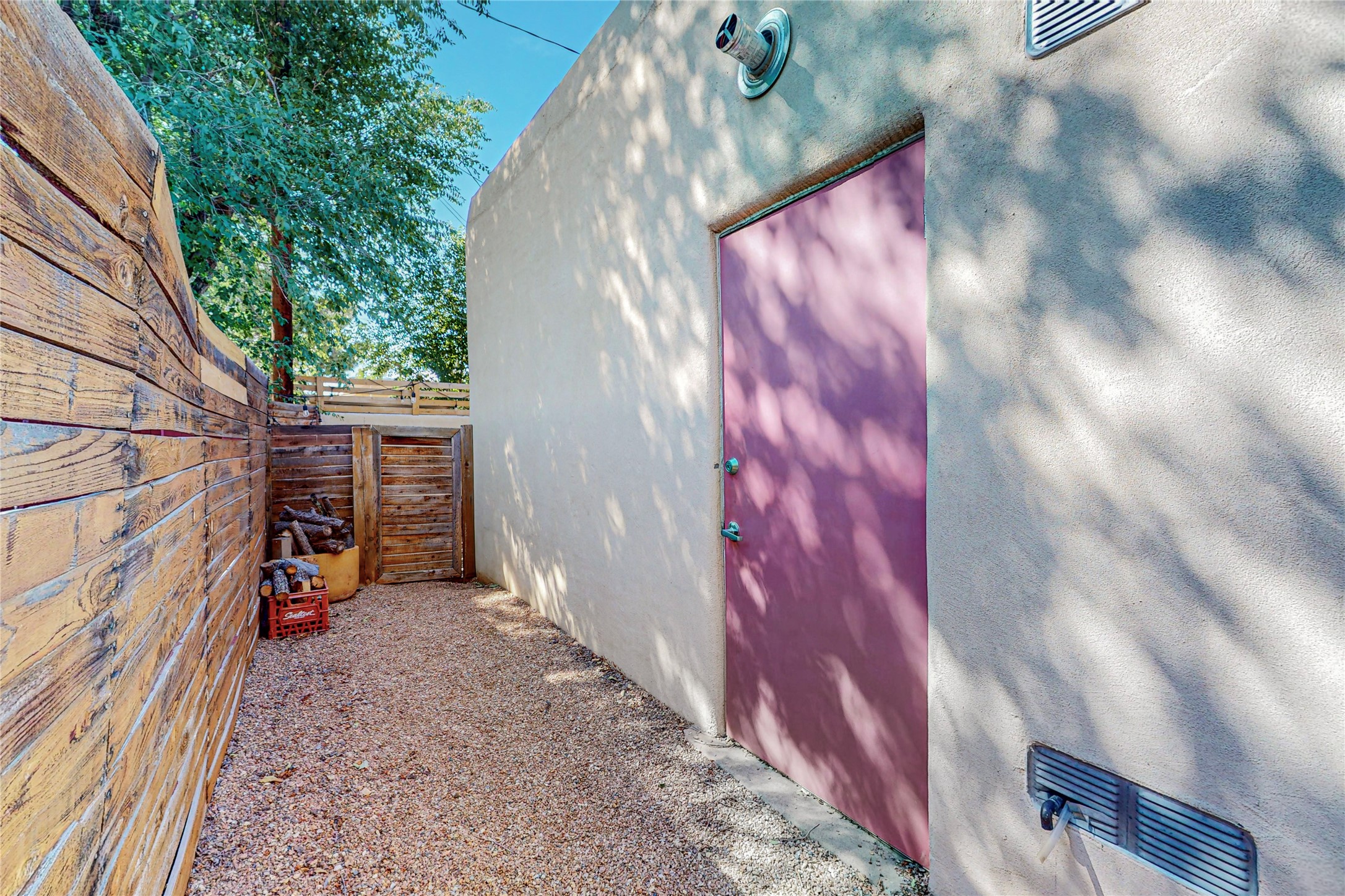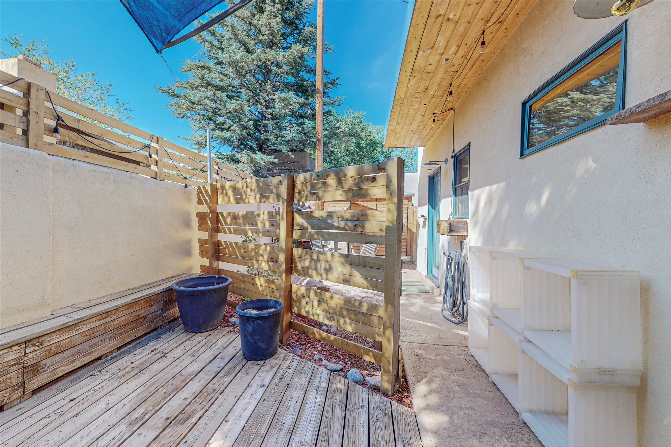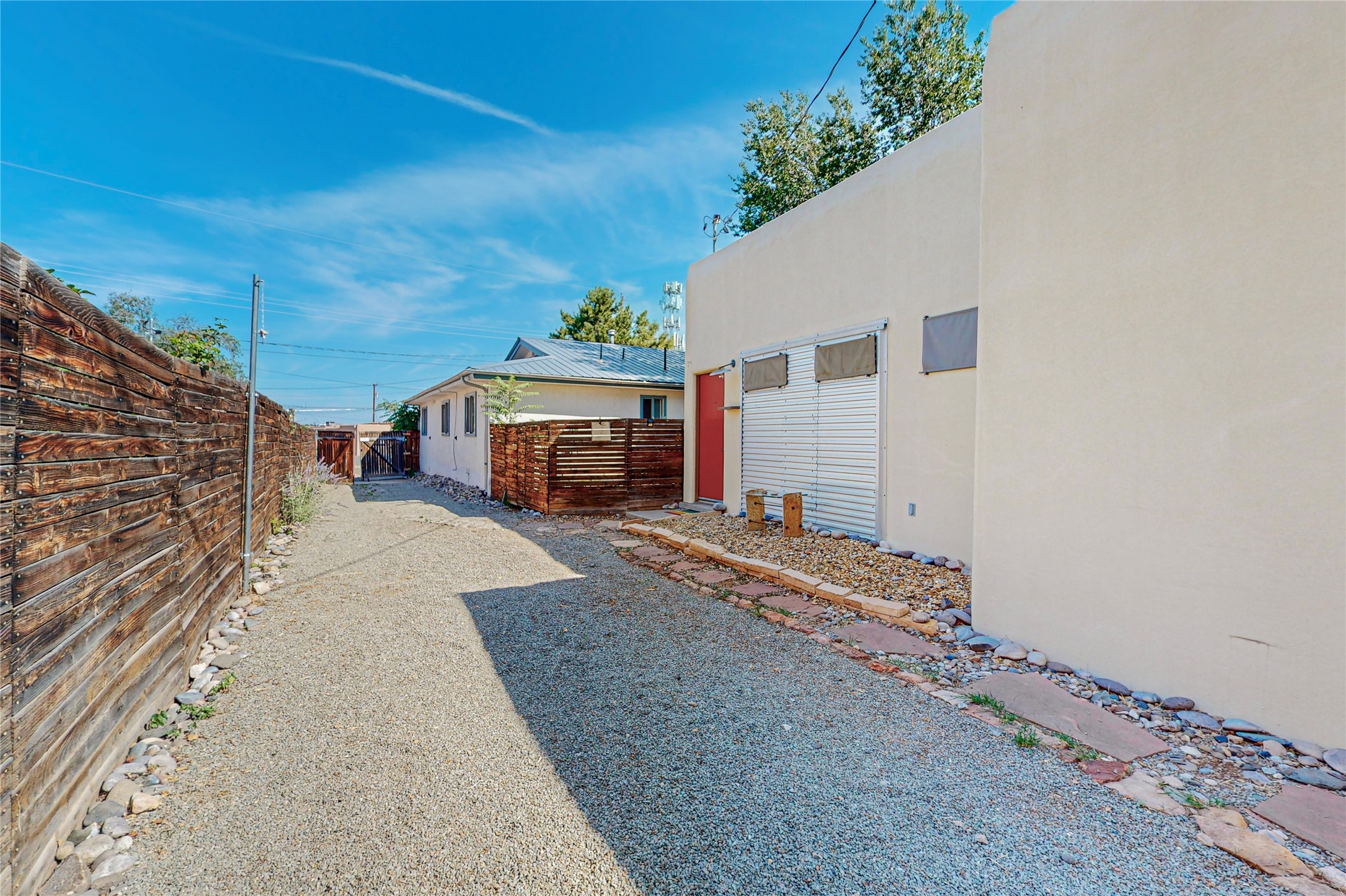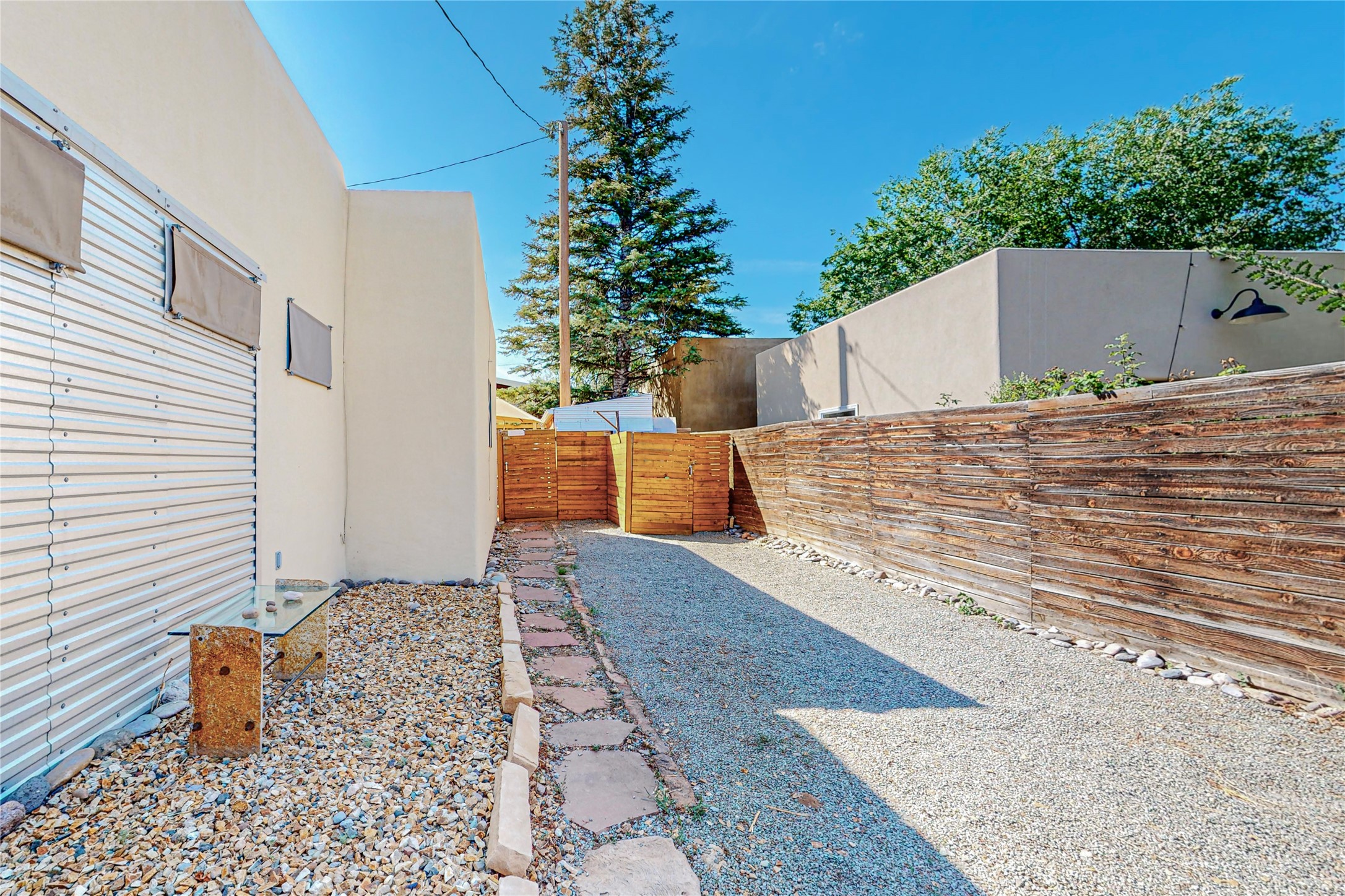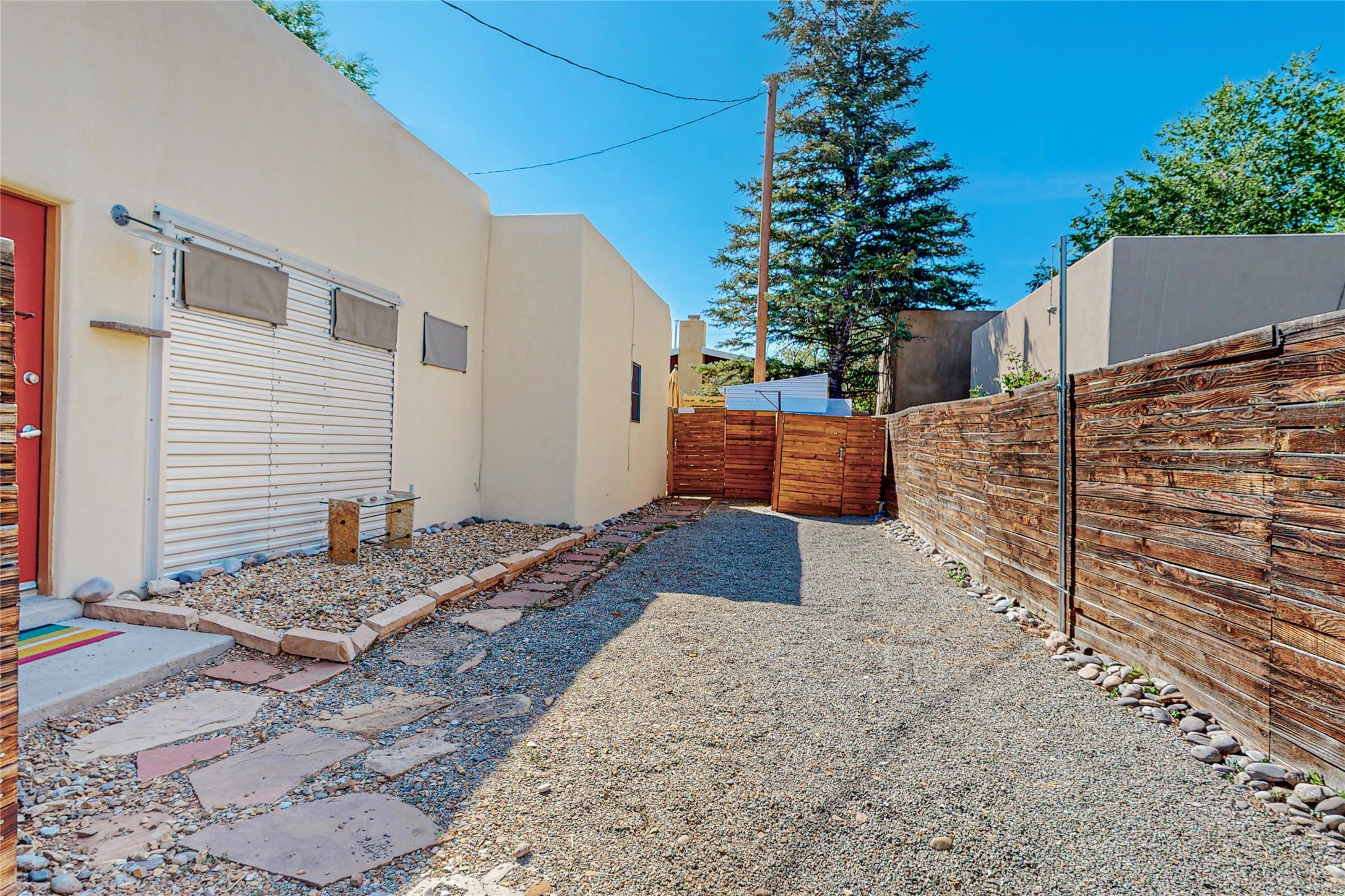 This private, freestanding condo enjoys modern finishes and is well set-back from the street, with off-street parking, for maximum privacy. Scandinavian design aesthetics by an award-winning designer conceived the contemporary floor plan, admitting tons of natural light through clerestory windows. Pine floors and double doors to the kitchen and bedroom allow a flowing open plan, or space separation if hosting a guest on the bonus Murphy bed. There are two separate, large terrace areas, inviting gardeners to cultivate and offering discrete seating areas for entertaining. Bedroom opens onto patio. A fantastic, serene location in Santa Fe's dynamic Midtown district, short distance to all amenities.
