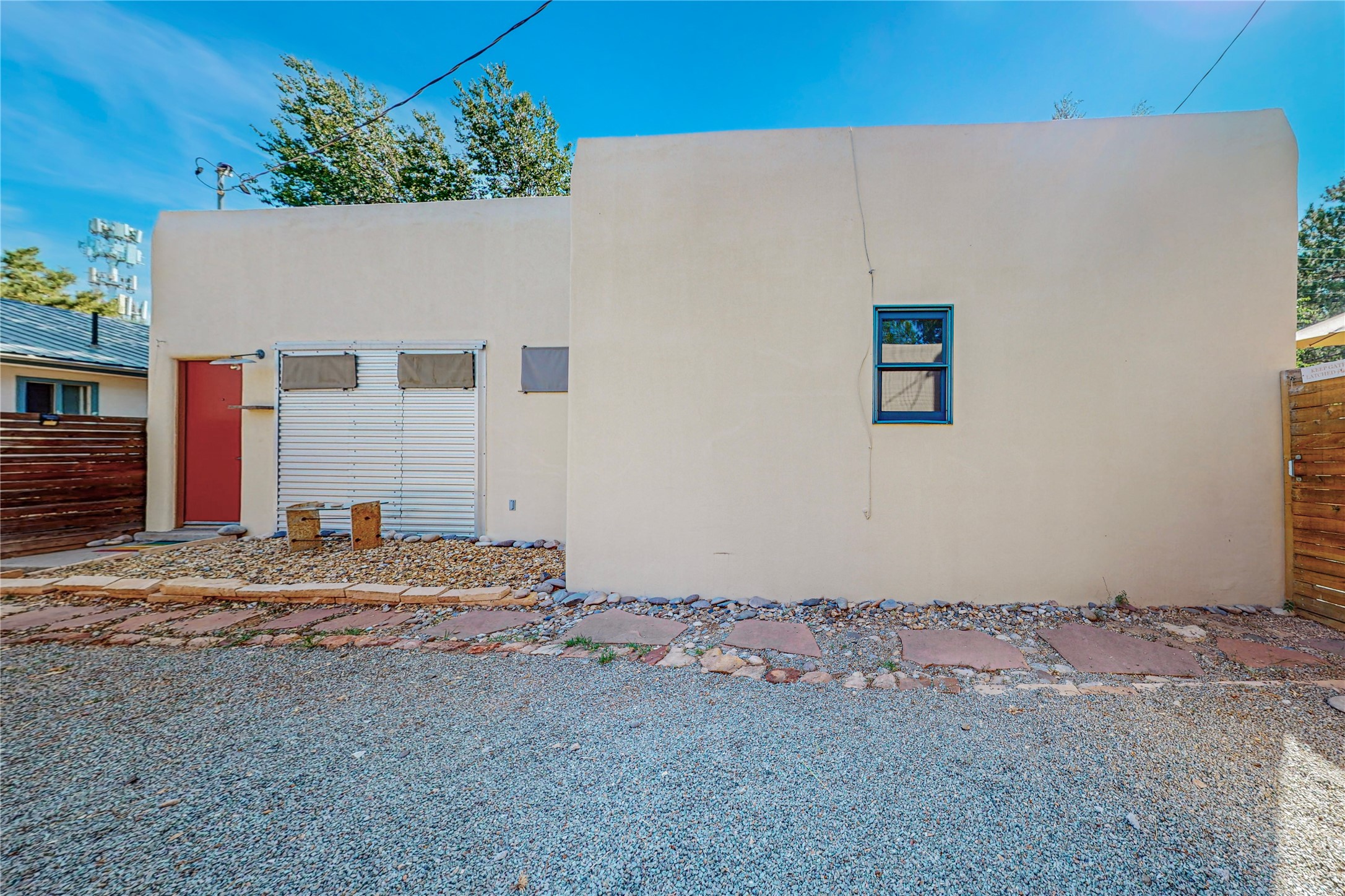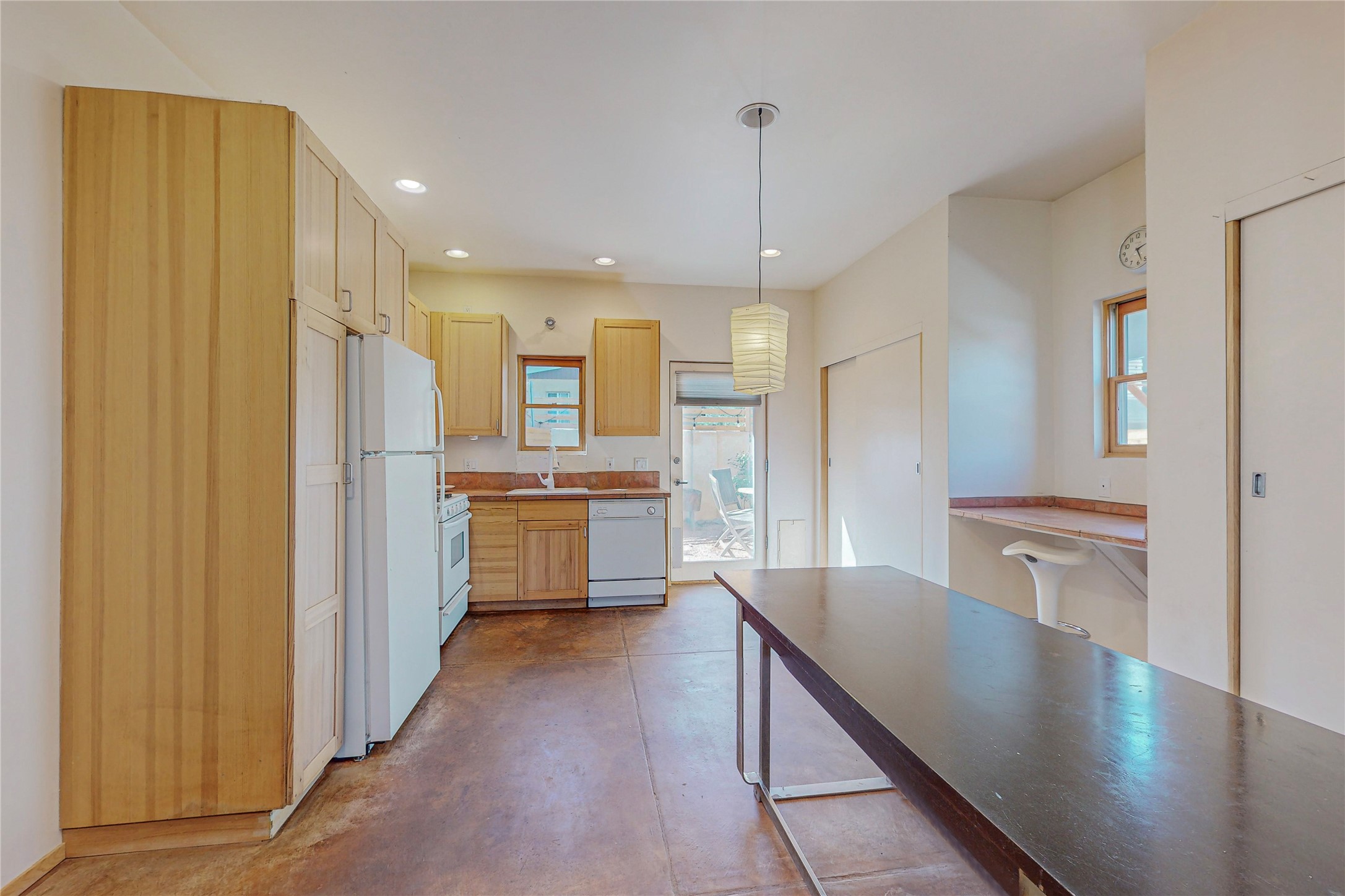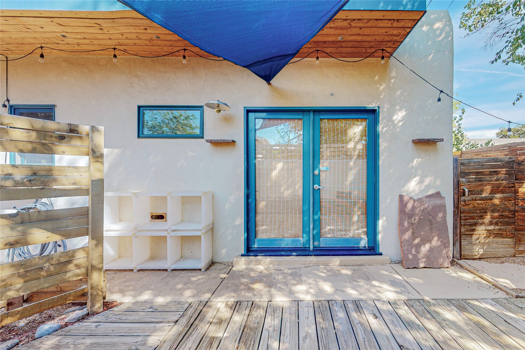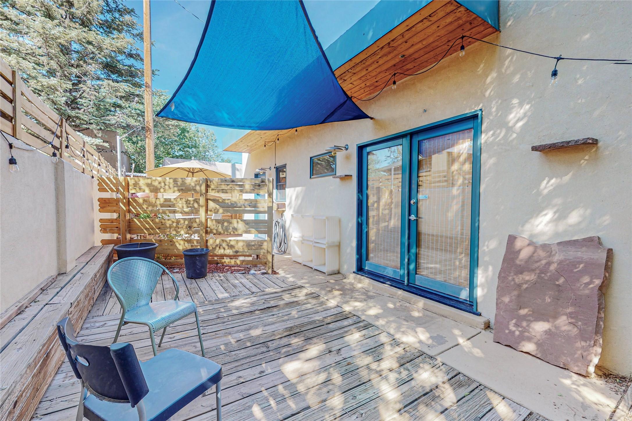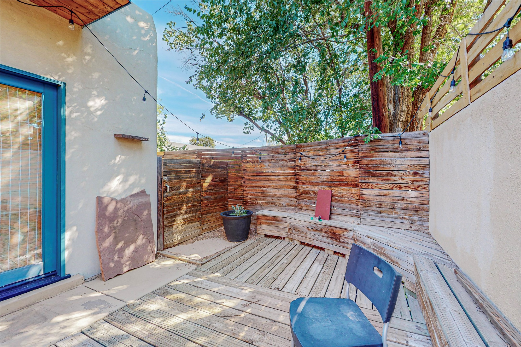This private, freestanding condo enjoys modern finishes and is well set-back from the street, with off-street parking, for maximum privacy. Scandinavian design aesthetics by an award-winning designer conceived the contemporary floor plan, admitting tons of natural light through clerestory windows. Pine floors and double doors to the kitchen and bedroom allow a flowing open plan, or space separation if hosting a guest on the bonus Murphy bed. There are two separate, large terrace areas, inviting gardeners to cultivate and offering discrete seating areas for entertaining. Bedroom opens onto patio. A fantastic, serene location in Santa Fe's dynamic Midtown district, short distance to all amenities.