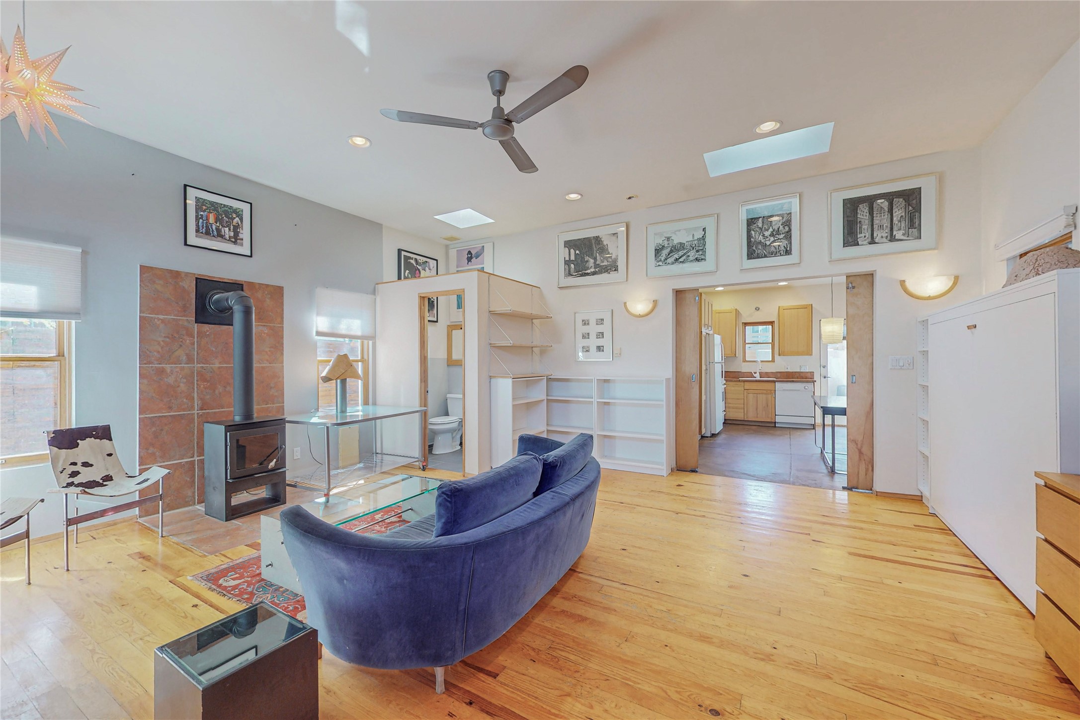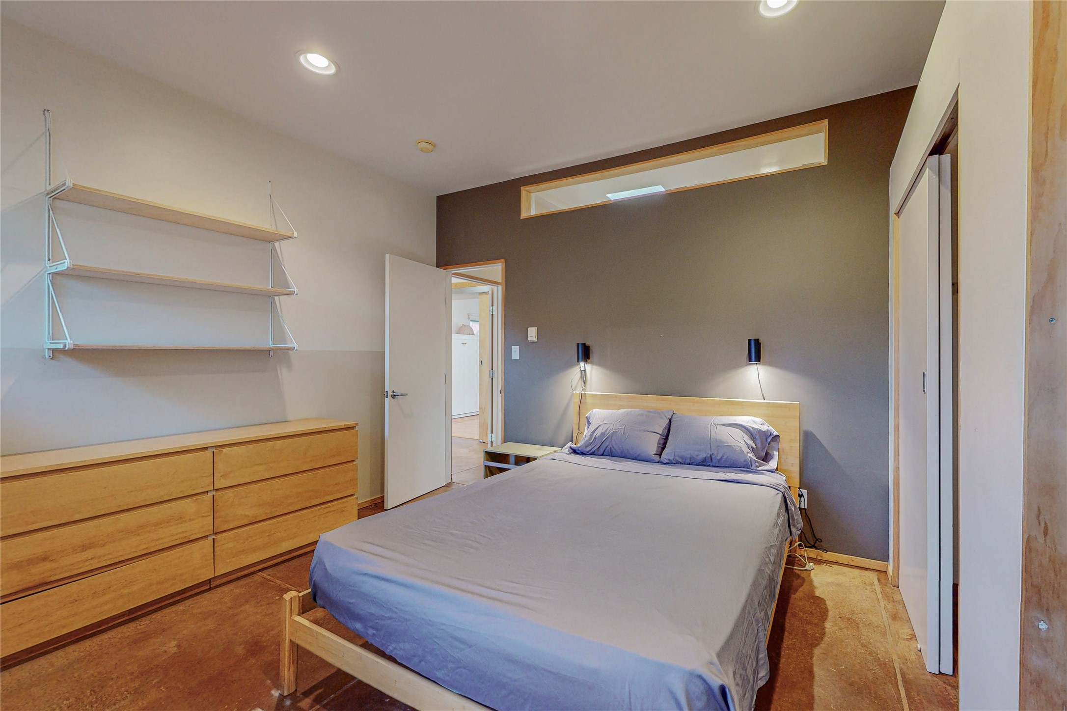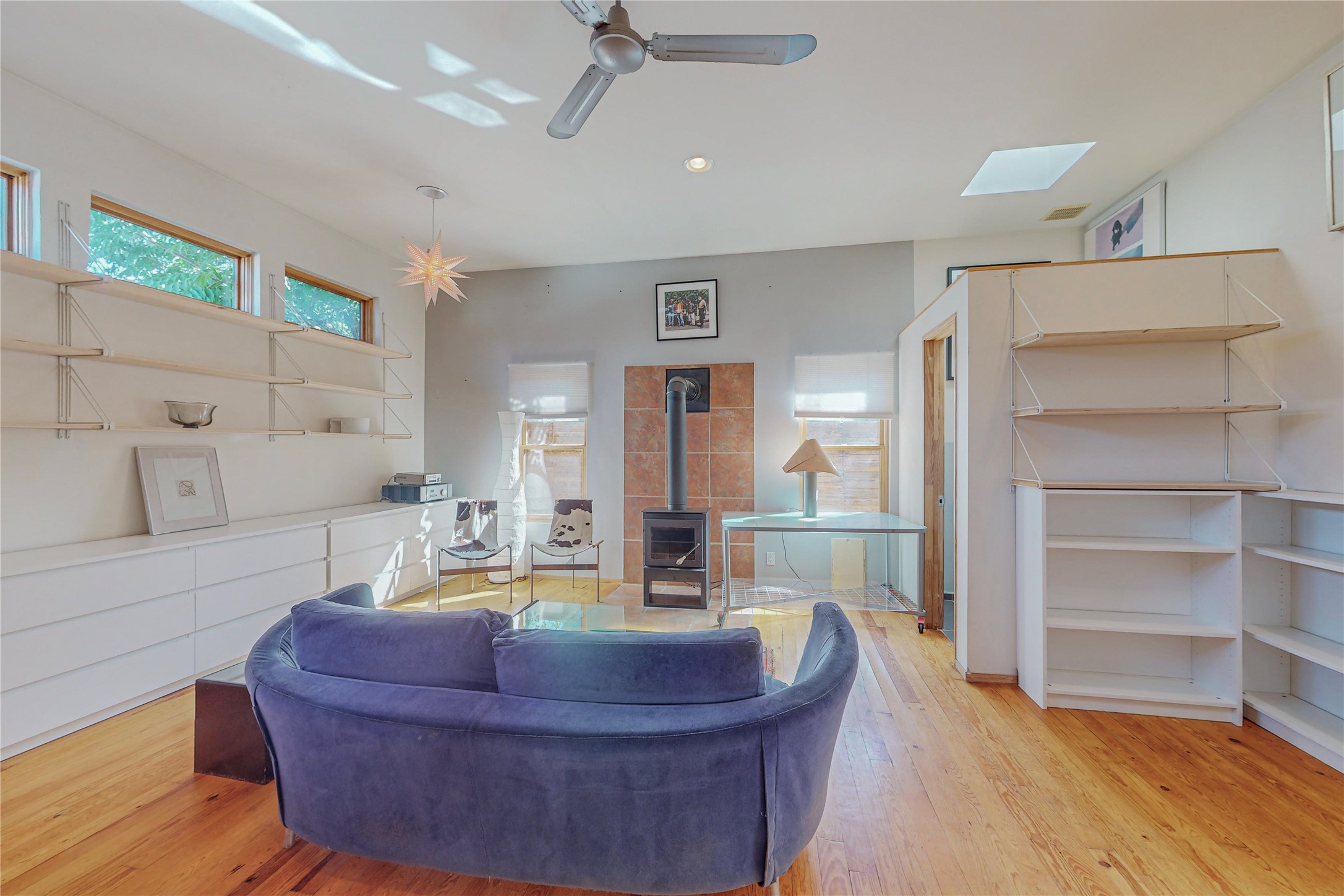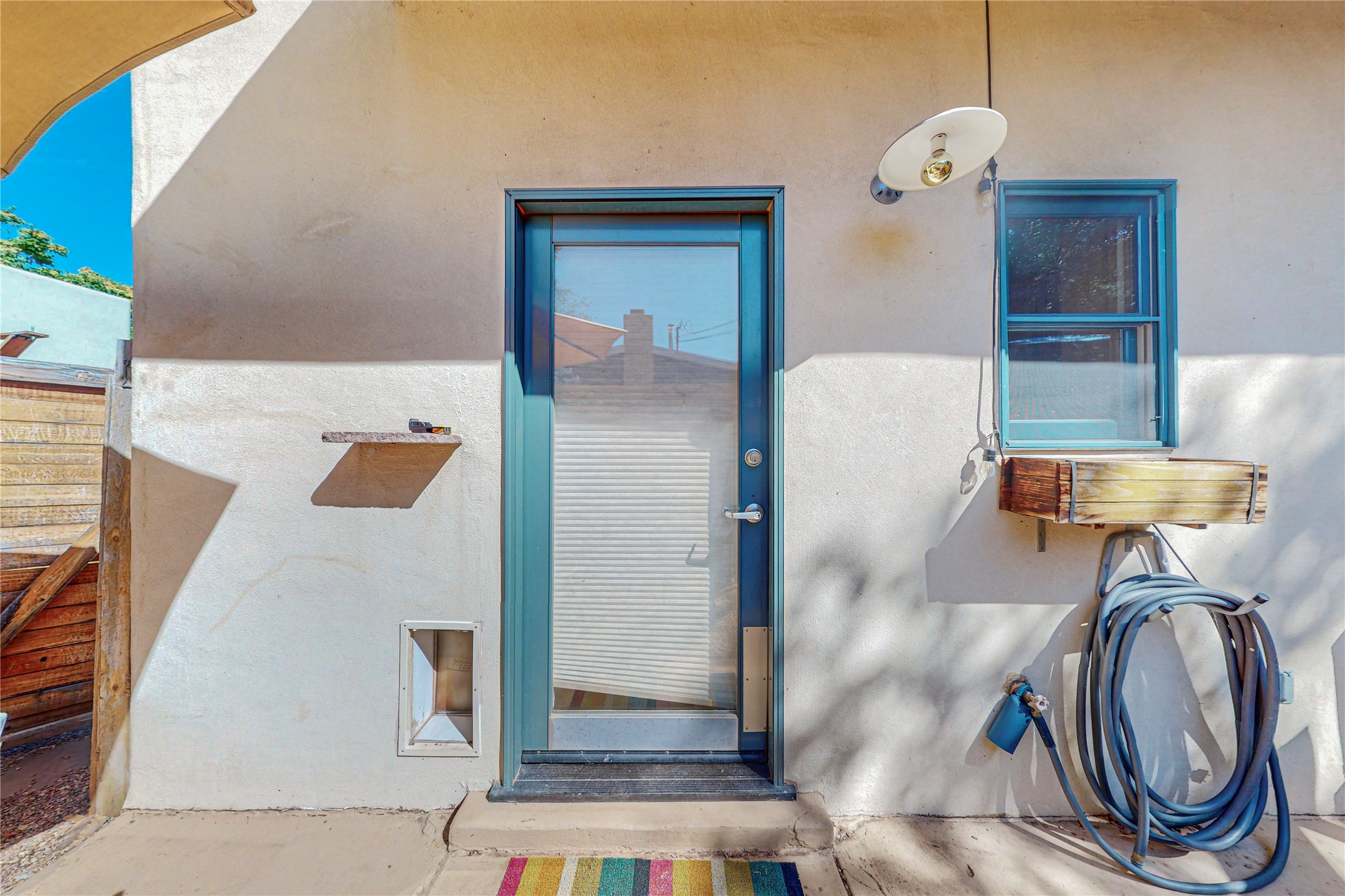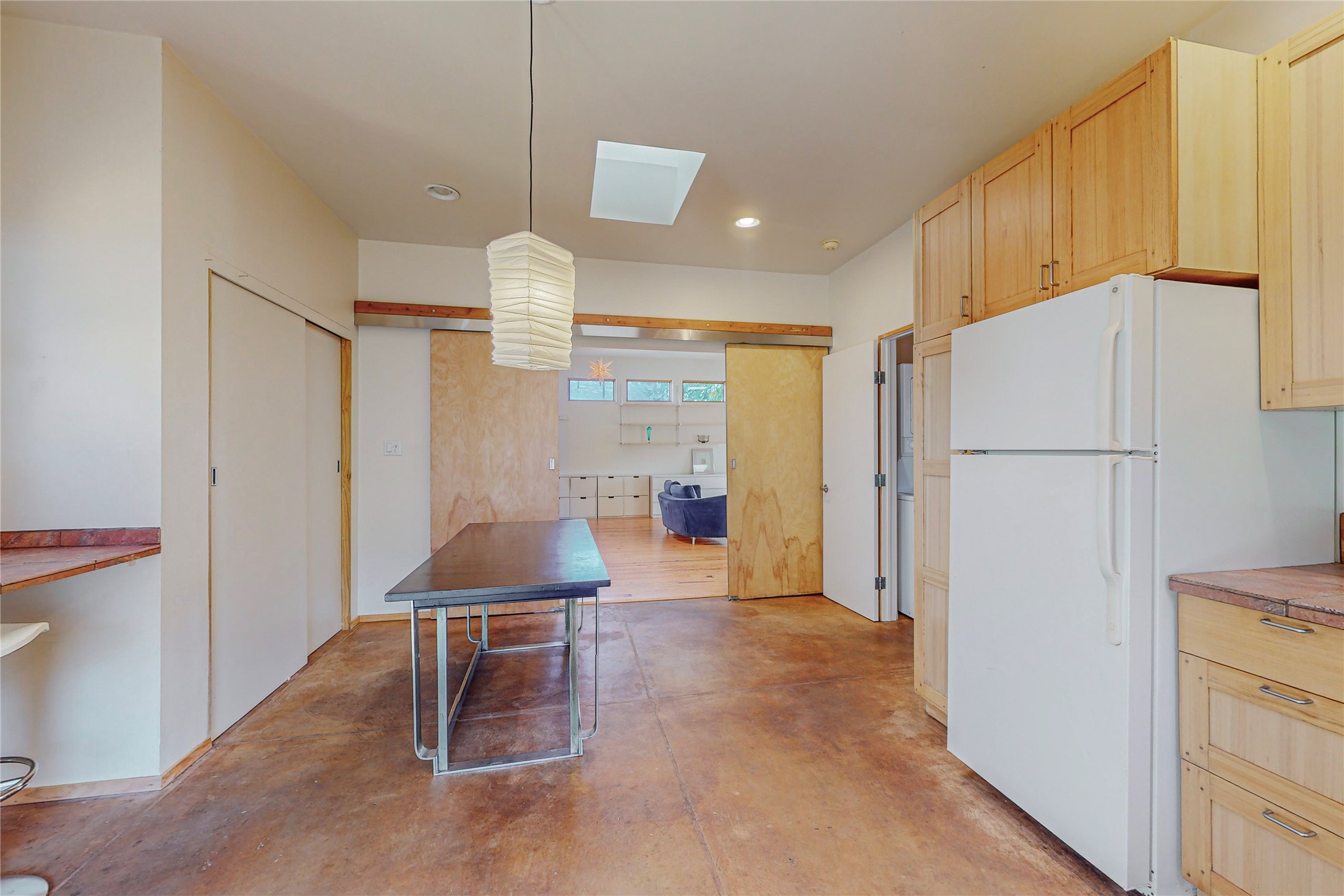 This private, freestanding condo enjoys modern finishes and is well set-back from the street, with off-street parking, for maximum privacy. Scandinavian design aesthetics by an award-winning designer conceived the contemporary floor plan, admitting tons of natural light through clerestory windows. Pine floors and double doors to the kitchen and bedroom allow a flowing open plan, or space separation if hosting a guest on the bonus Murphy bed. There are two separate, large terrace areas, inviting gardeners to cultivate and offering discrete seating areas for entertaining. Bedroom opens onto patio. A fantastic, serene location in Santa Fe's dynamic Midtown district, short distance to all amenities.