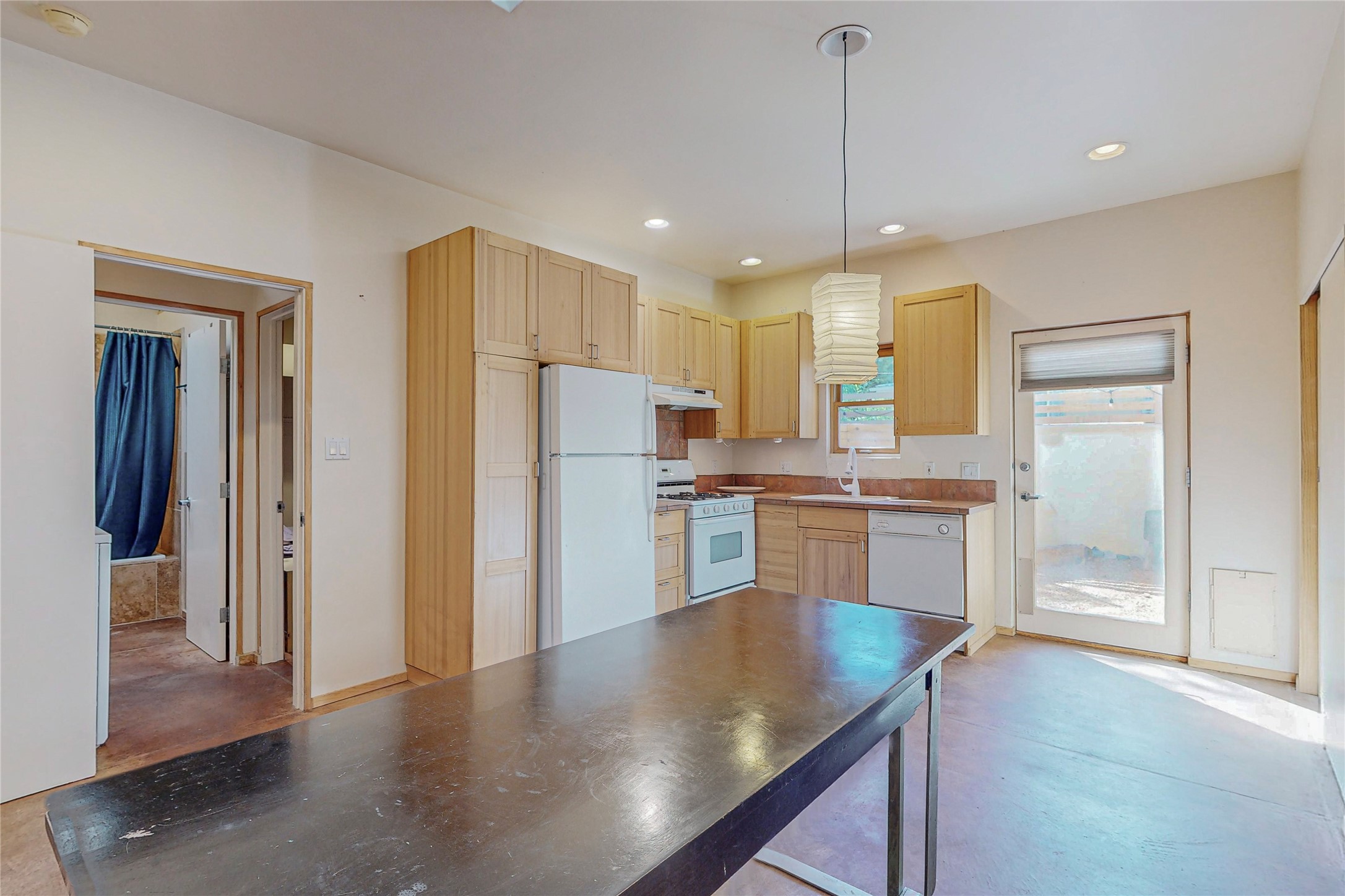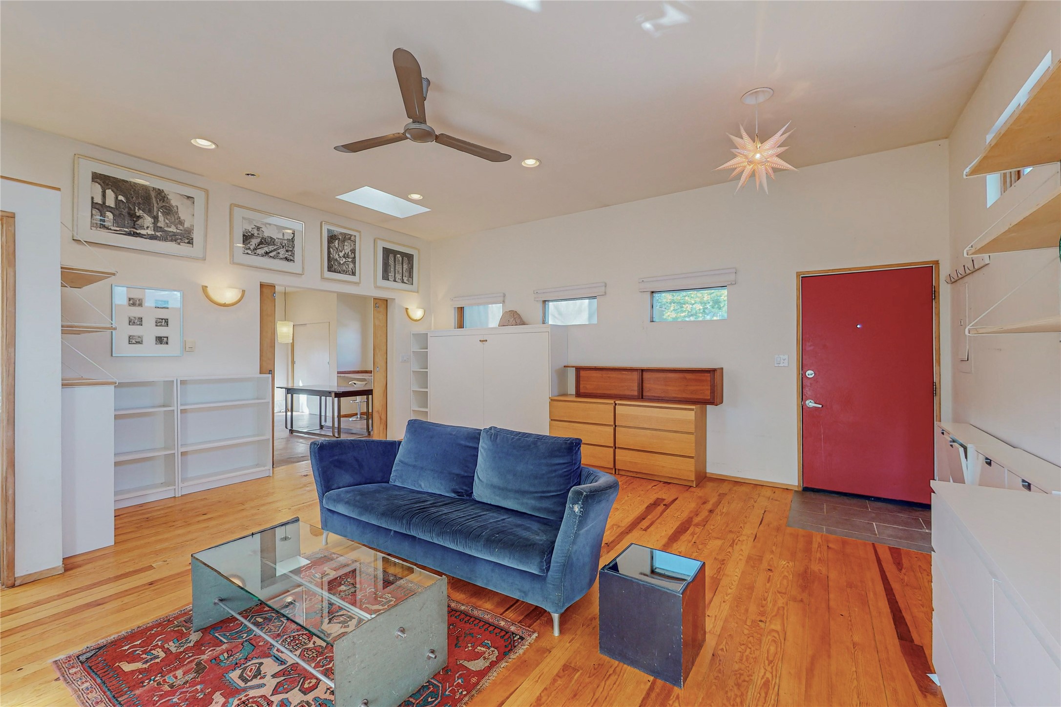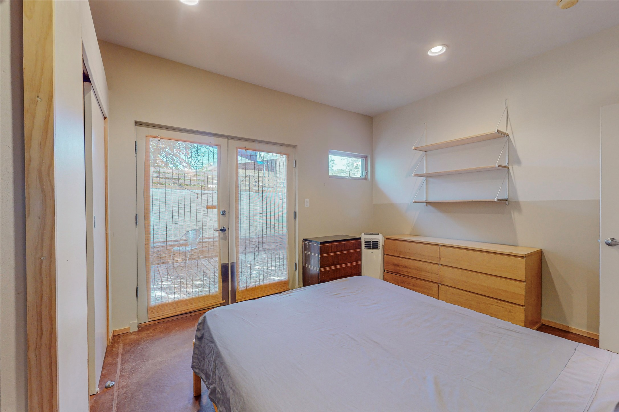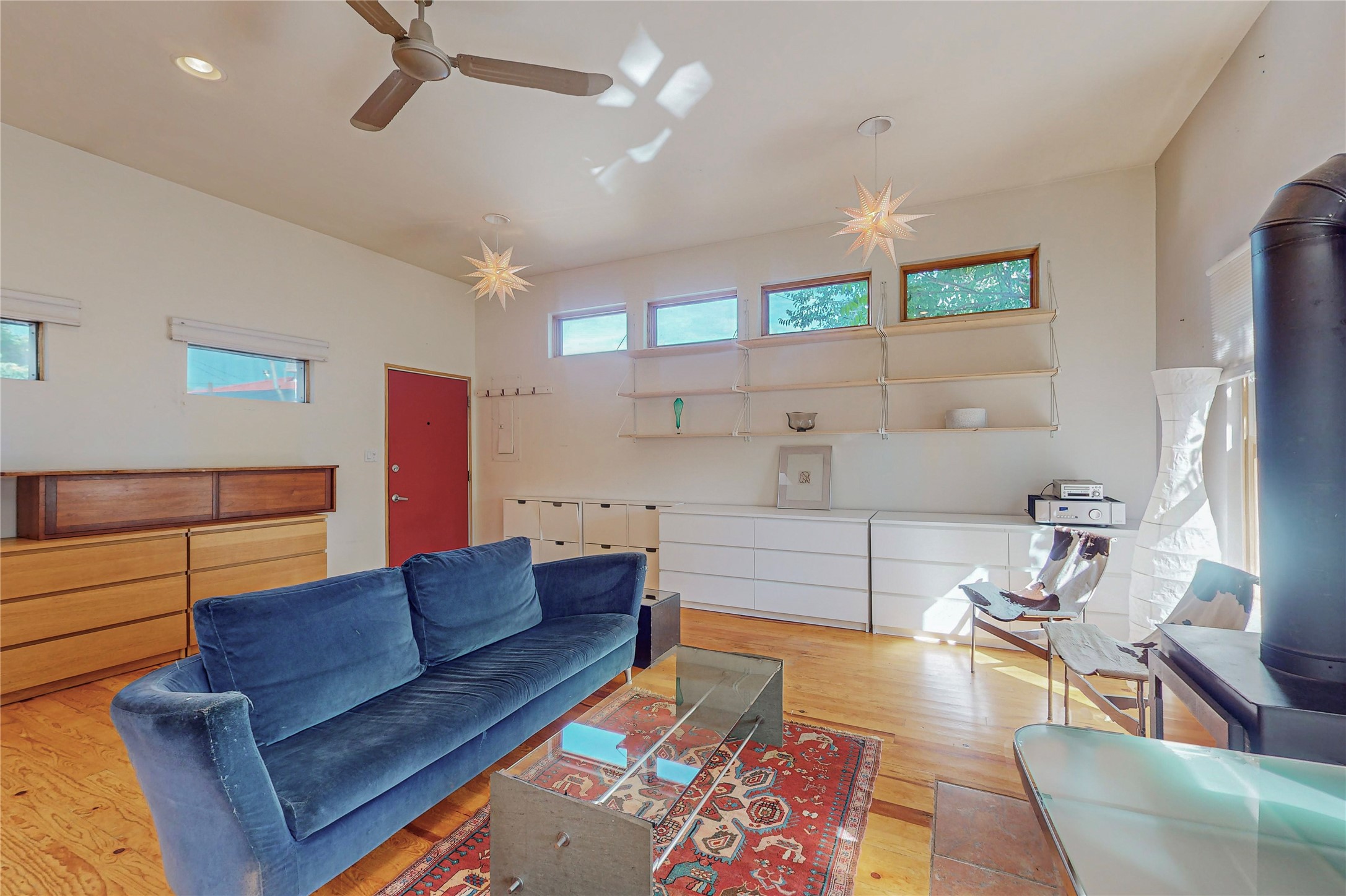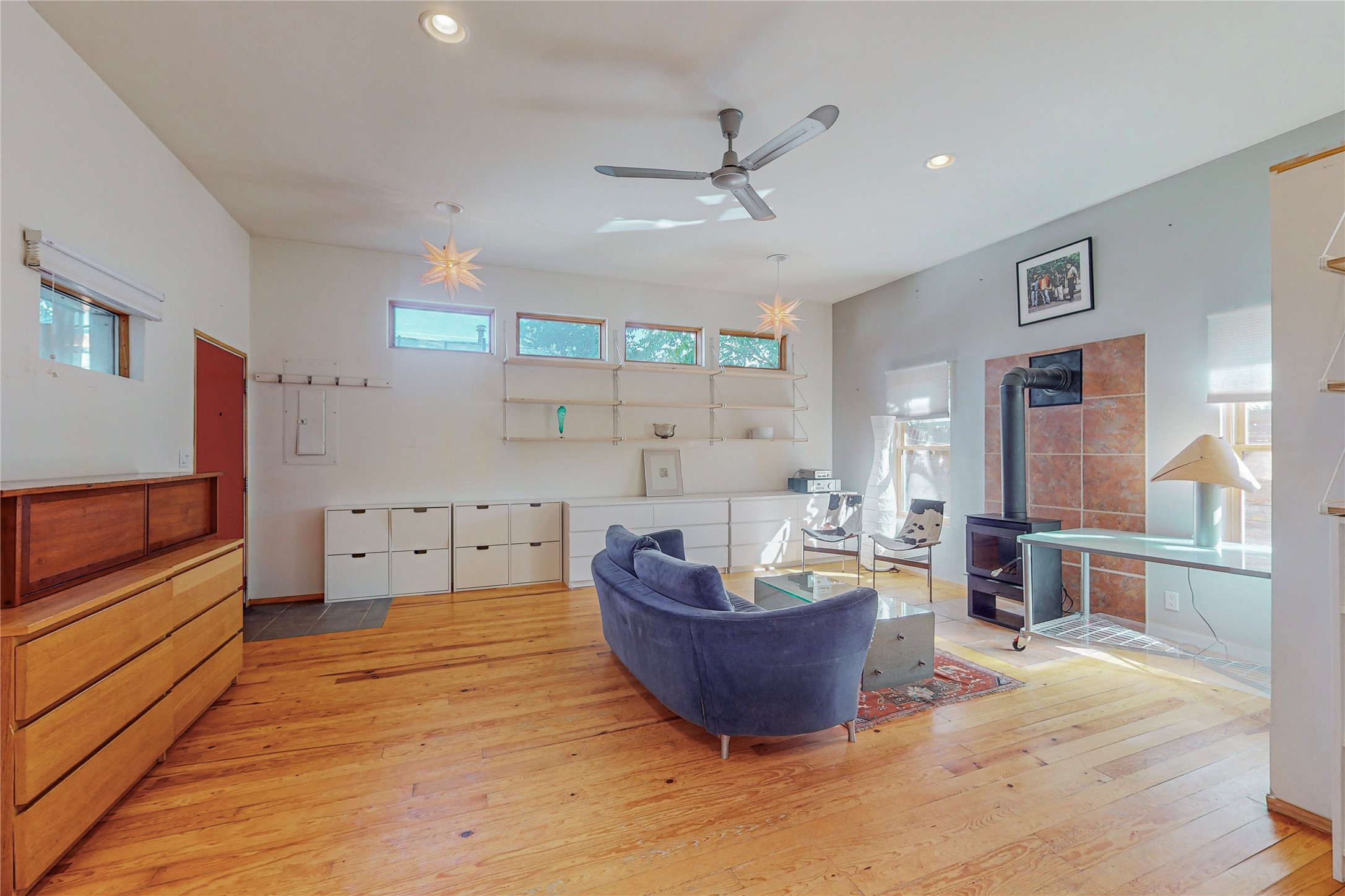 This private, freestanding condo enjoys modern finishes and is well set-back from the street, with off-street parking, for maximum privacy. Scandinavian design aesthetics by an award-winning designer conceived the contemporary floor plan, admitting tons of natural light through clerestory windows. Pine floors and double doors to the kitchen and bedroom allow a flowing open plan, or space separation if hosting a guest on the bonus Murphy bed. There are two separate, large terrace areas, inviting gardeners to cultivate and offering discrete seating areas for entertaining. Bedroom opens onto patio. A fantastic, serene location in Santa Fe's dynamic Midtown district, short distance to all amenities.