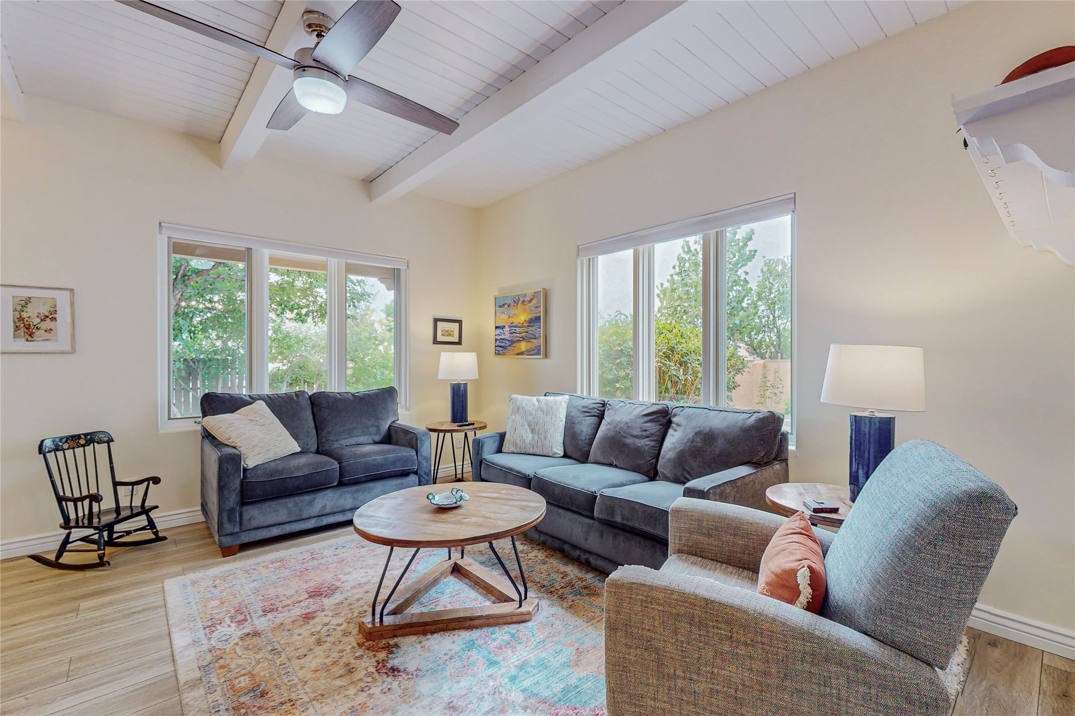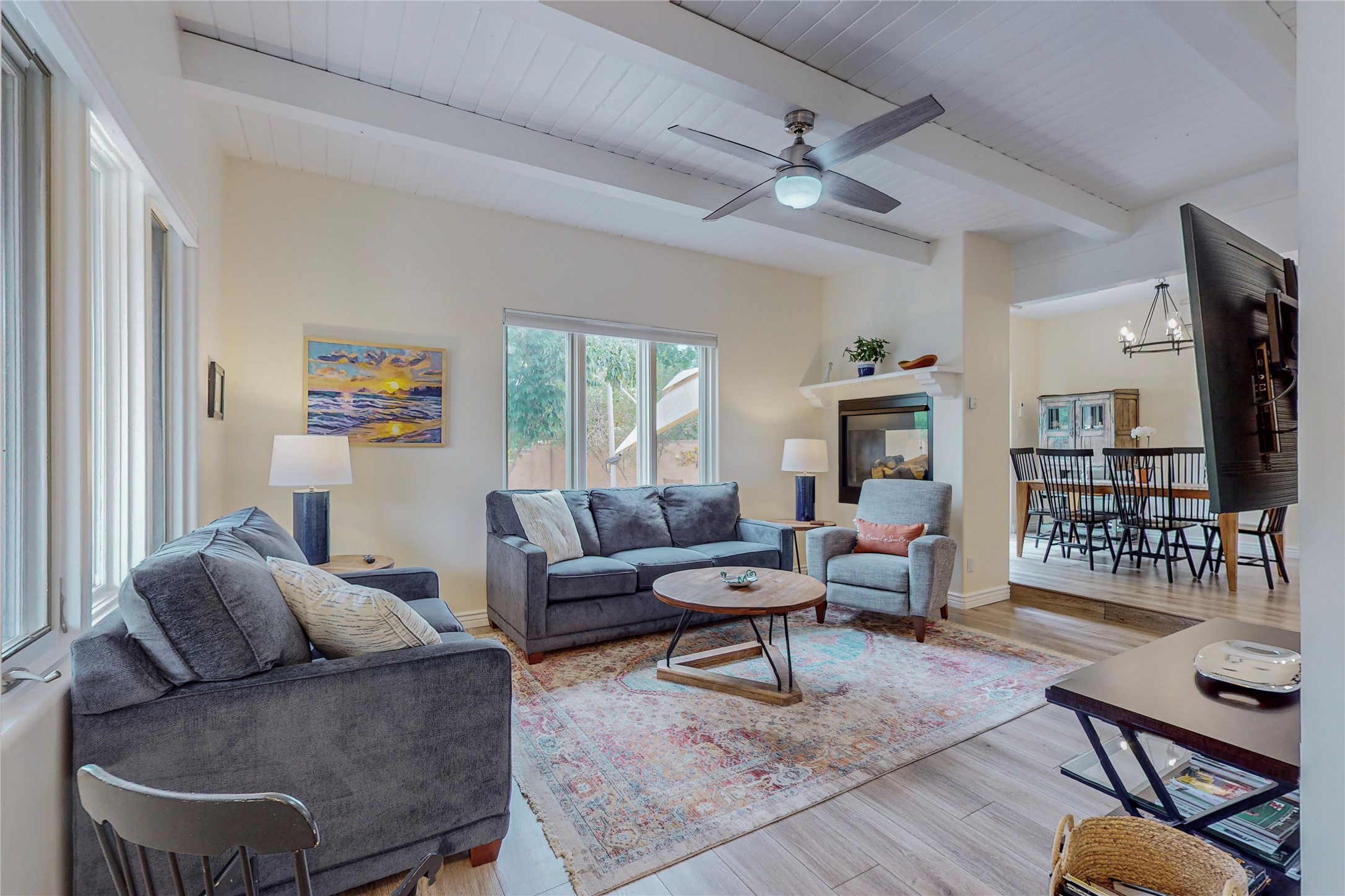 This 3 bed, 3 bath home is located on a quiet cul-de-sac in the desirable Pueblos Del Sol neighborhood. Recent updates include new flooring, new kitchen cabinets, new countertops and all new appliances. All the baths in the home have been updated. This owner has recently had new ductless (mini-split) HVAC units that both cool and heat added. Enjoy views of the Sangre de Cristo Mountains from the primary bedroom and western views from the upstairs guest bedroom. One fireplace that serves dining and living areas. Primary shower is a walk-in. There is one guest bedroom and full bath on the ground level.