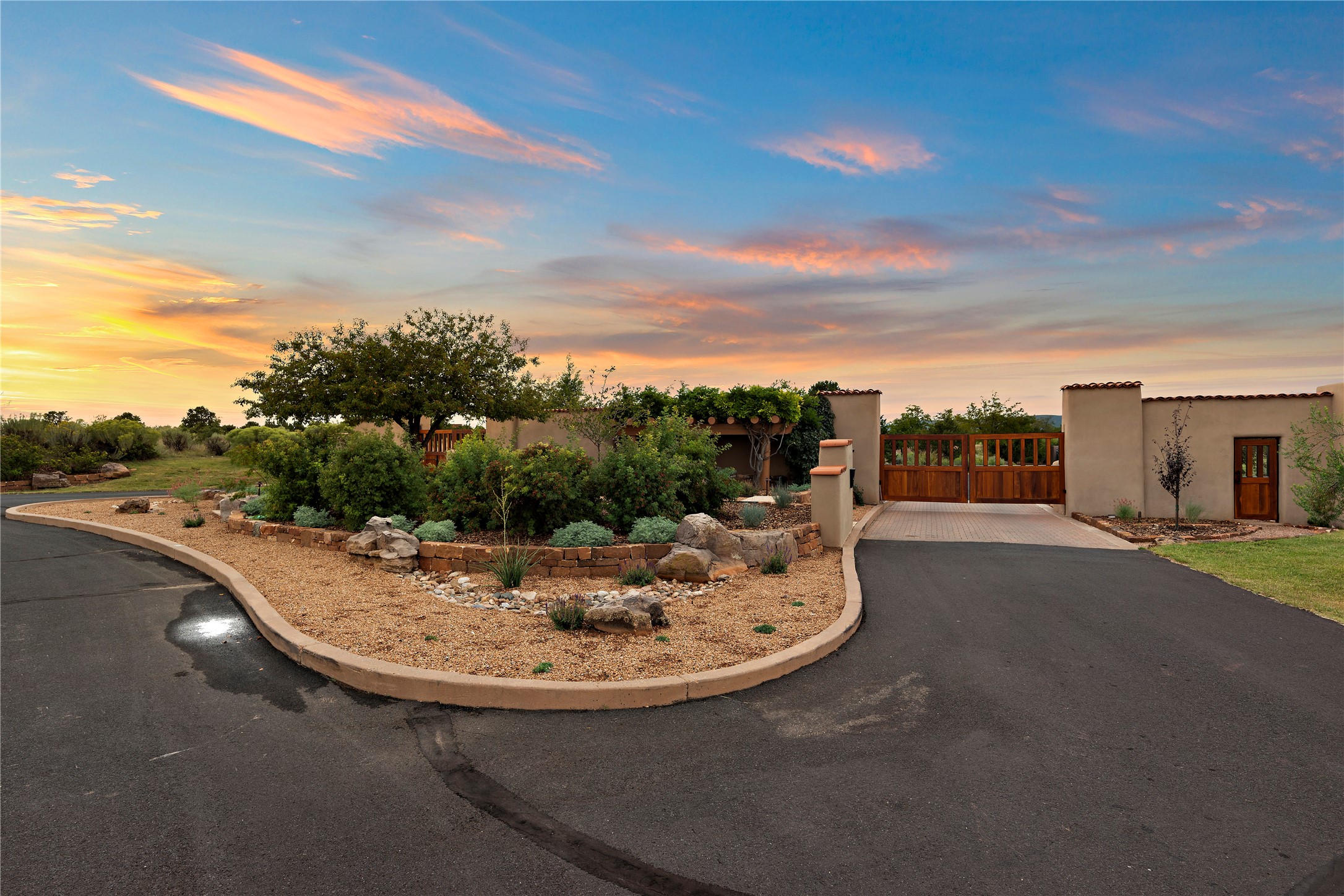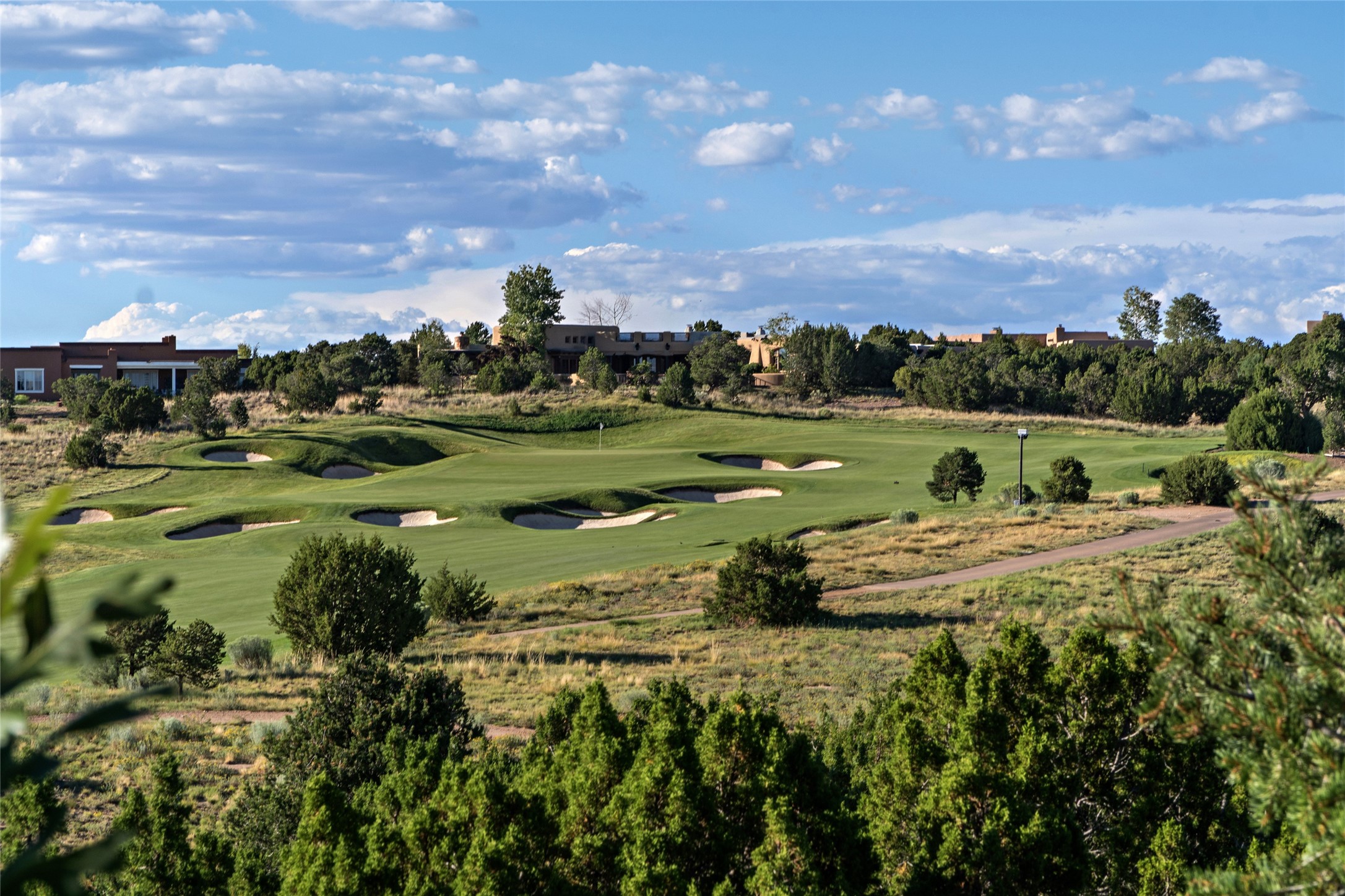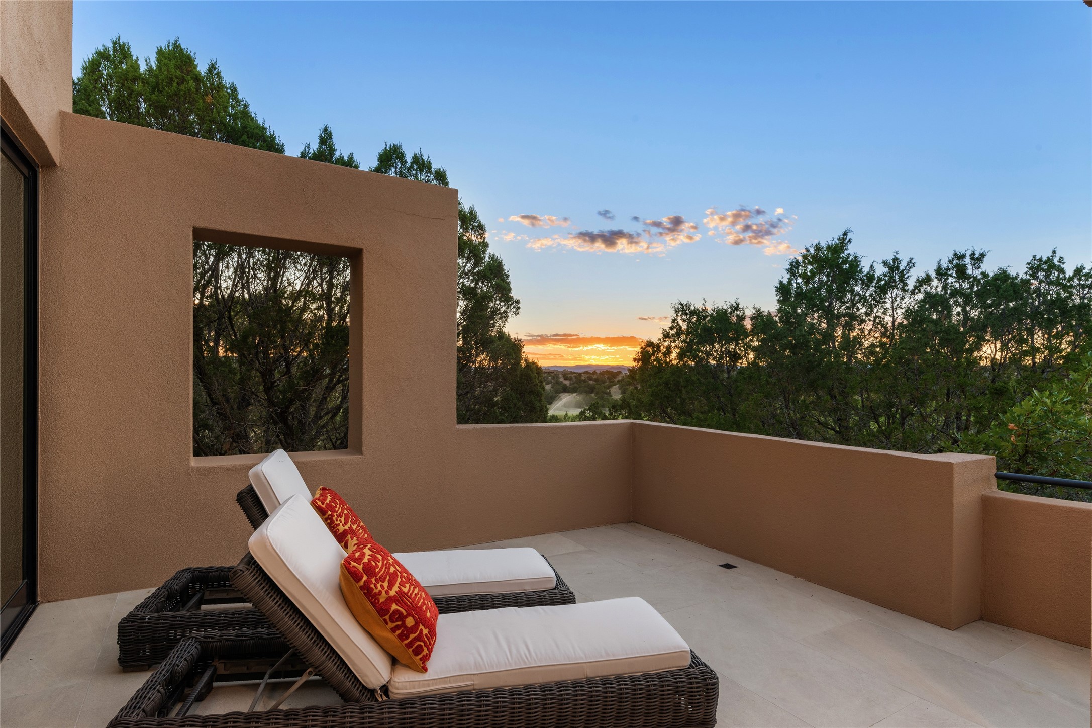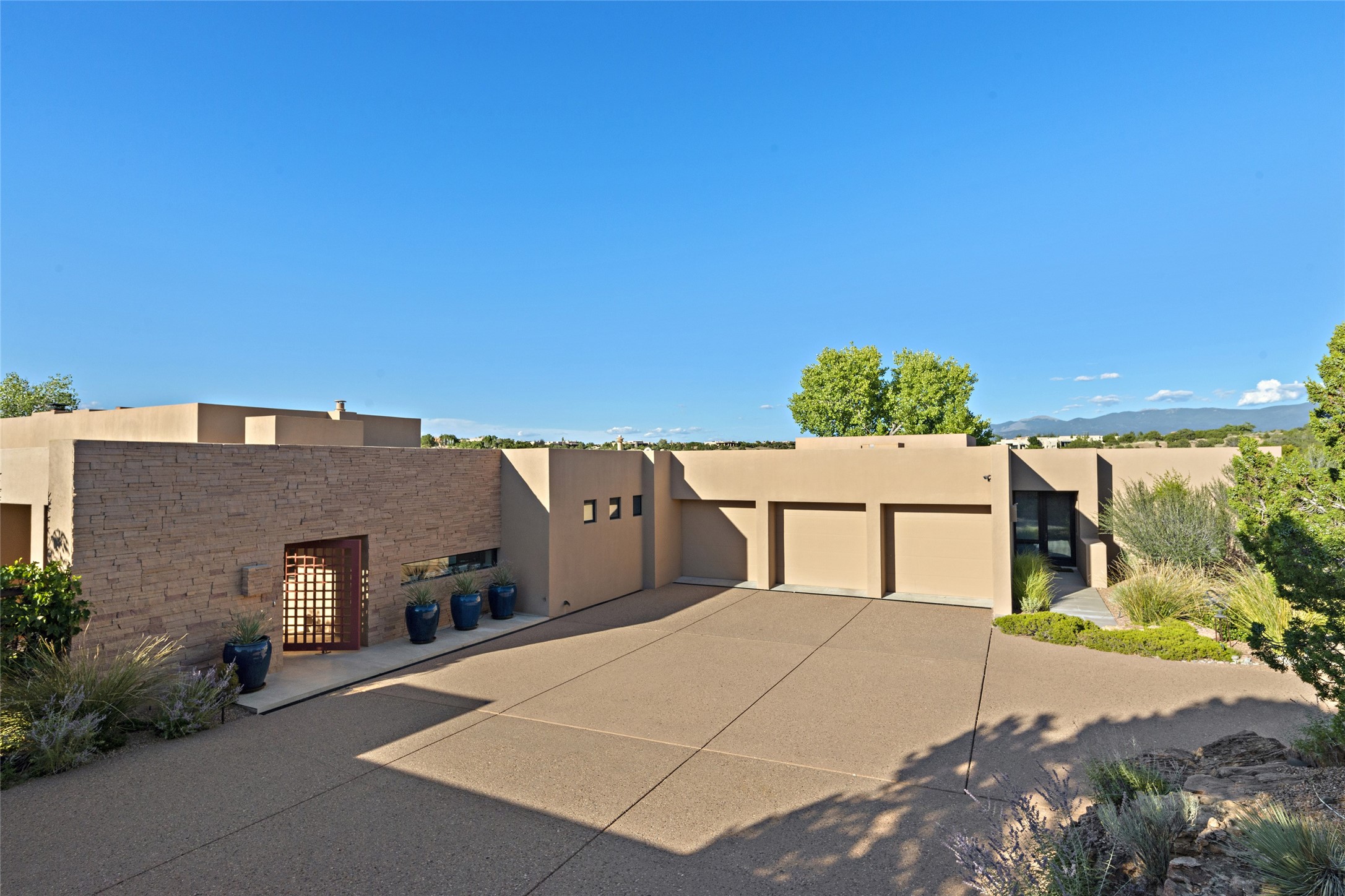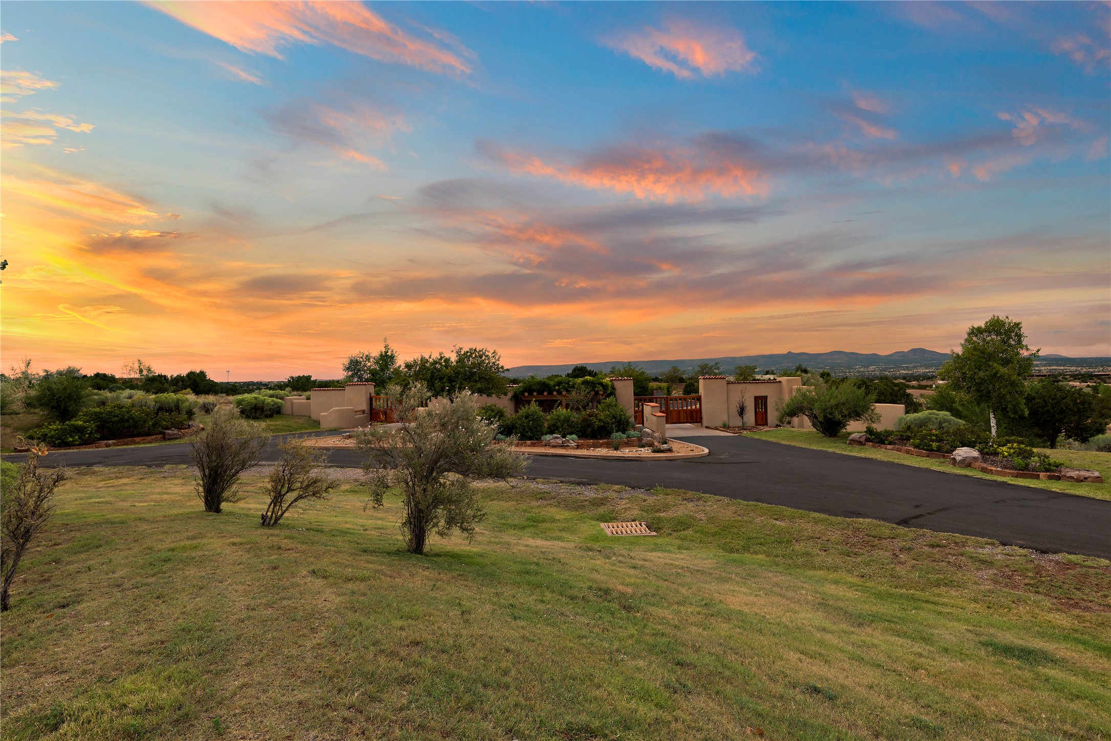 This sophisticated, soft-contemporary custom estate features dramatic architectural design with luxury finishes throughout and is beautifully sited overlooking the Sunset Golf Course in Las Campanas with impressive Jemez and Sangre de Cristo Mountain views. In the coveted Club Estates, and built by Doug McDowell, the 4296 sq. ft. main residence is entered through a private, gated and enclosed courtyard with mature landscape and hardscape accents. The home has been brilliantly re-imagined to combine today's contemporary living style with the inherent cues and warmth associated with Santa Fe. Thoughtfully planned for ease-of-entertaining and to maximize indoor/outdoor living, the renovation includes a sensational living room with high ceilings, vigas, a custom caf-style wet bar, fireplace, dining area and access to an incredible covered portal and elevated patio space with amazing views to the 17th hole. A spacious office is also well-suited as a media room with access to the patio. The large Chef's kitchen with center island offers professional grade appliances, a barista area, built-in wine cooler and a lovely corner breakfast area with views and patio access. There are two bedrooms in the main house situated for privacy. The owner's suite has been masterfully redone with portal access to capture Jemez mountain views and features a state-of-the-art spa bath area and generous walk-in closet with custom built-ins. The guest bedroom is ensuite with a separate entrance to the interior front courtyard. Luxury finishes include wood and natural stone flooring, quartzite stone and diamond plaster walls. The independent guest house maintains high-end finishes and offers 1067 sq. ft. to include a well-proportioned living/dining area, kitchenette, two bedrooms, modern bath and access to the main patio area. Total heated square footage is 5363. A 3-car garage, large storage room, private-gated drive and ample motor court complete the estate. 15 minutes to the Historical Plaza and the Santa Fe Airport. Memberships to the private Club at Las Campanas are optional and available for purchase upon approval. The Club offers two Signature Jack Nicklaus Golf Courses, Golf Performance Center, Hacienda Clubhouse, Spa & Fitness Center, Indoor and outdoor pools, pickleball and tennis courts, Log Cabin restaurant and a world-class equestrian center.