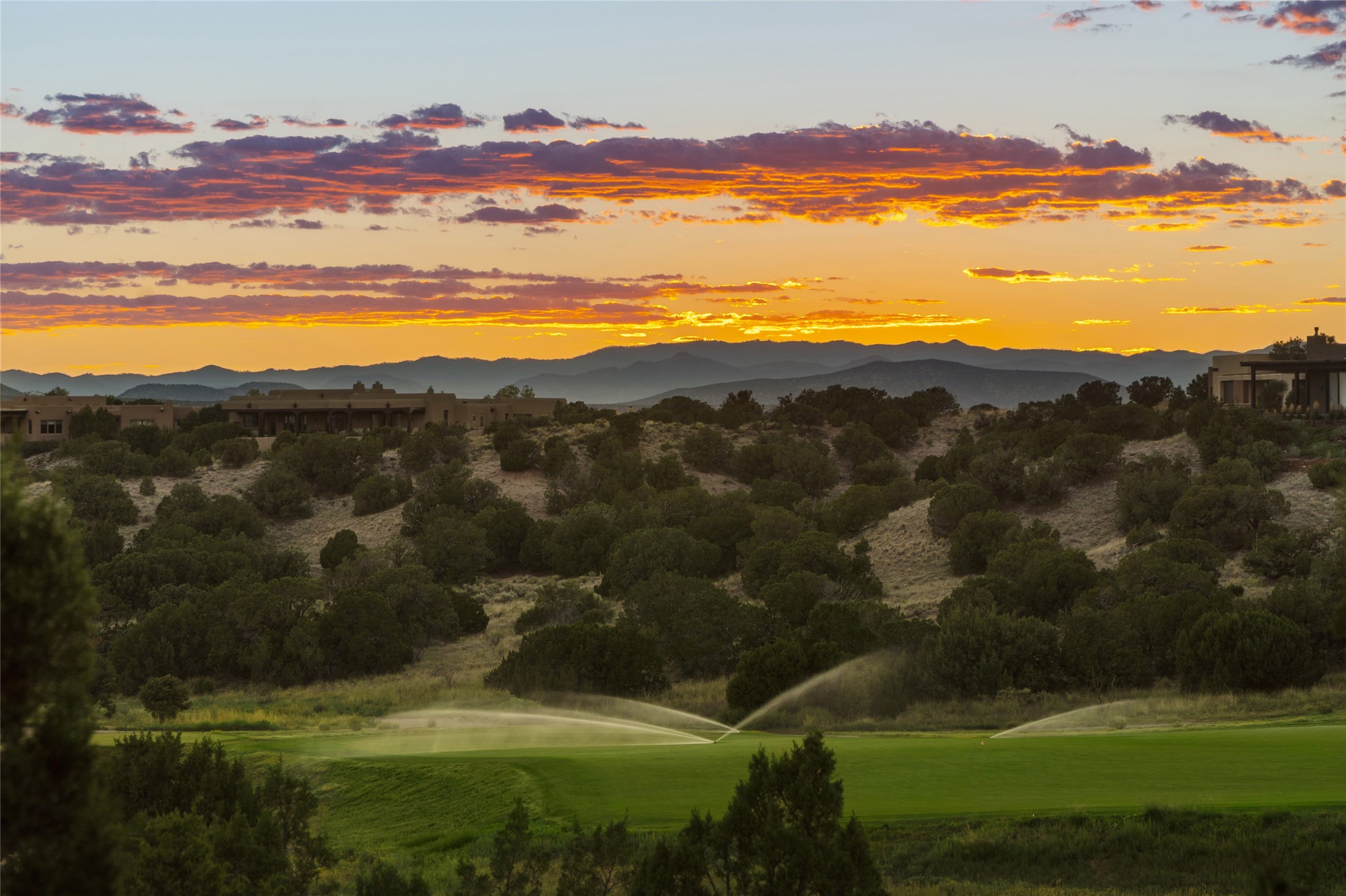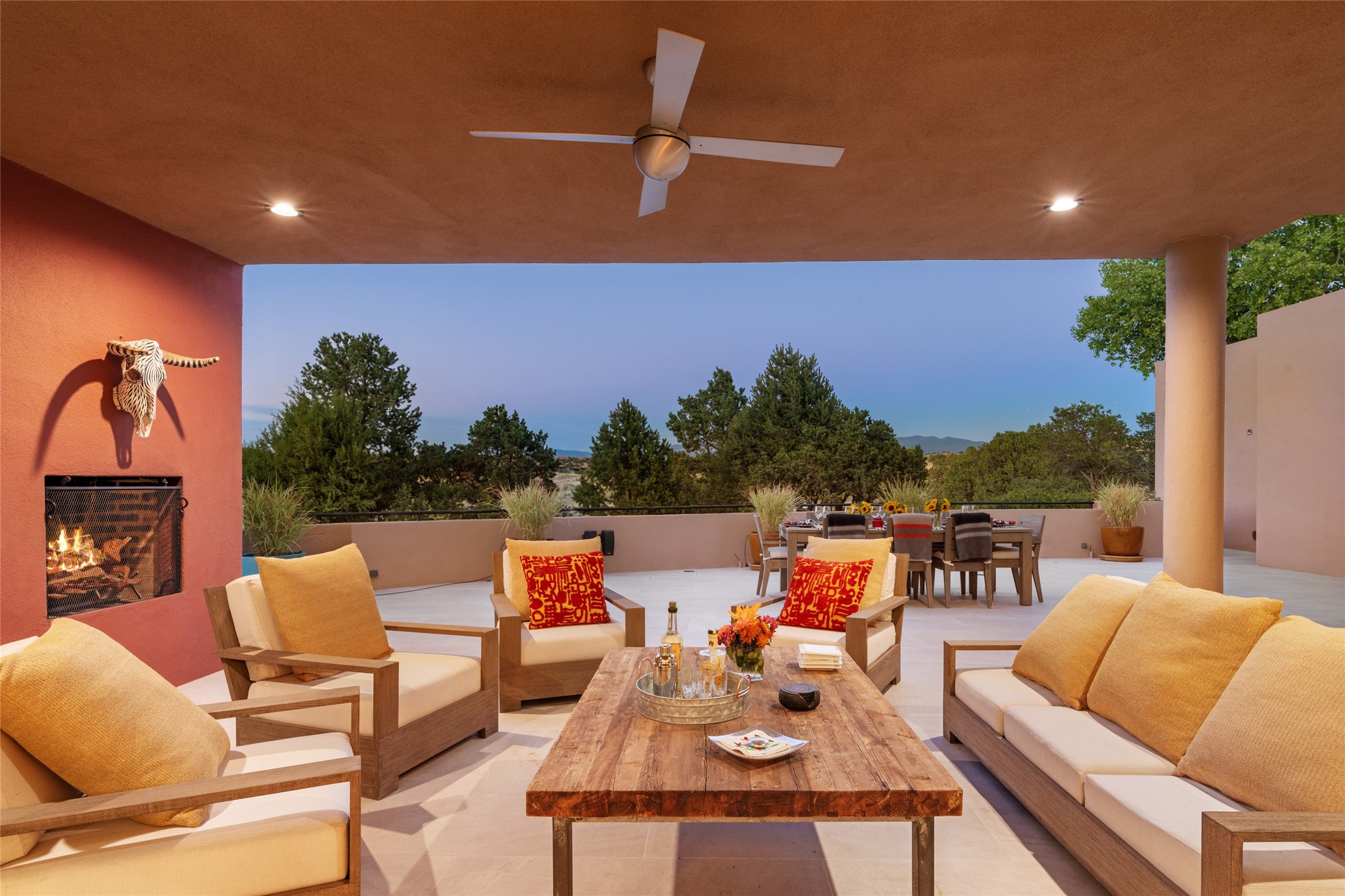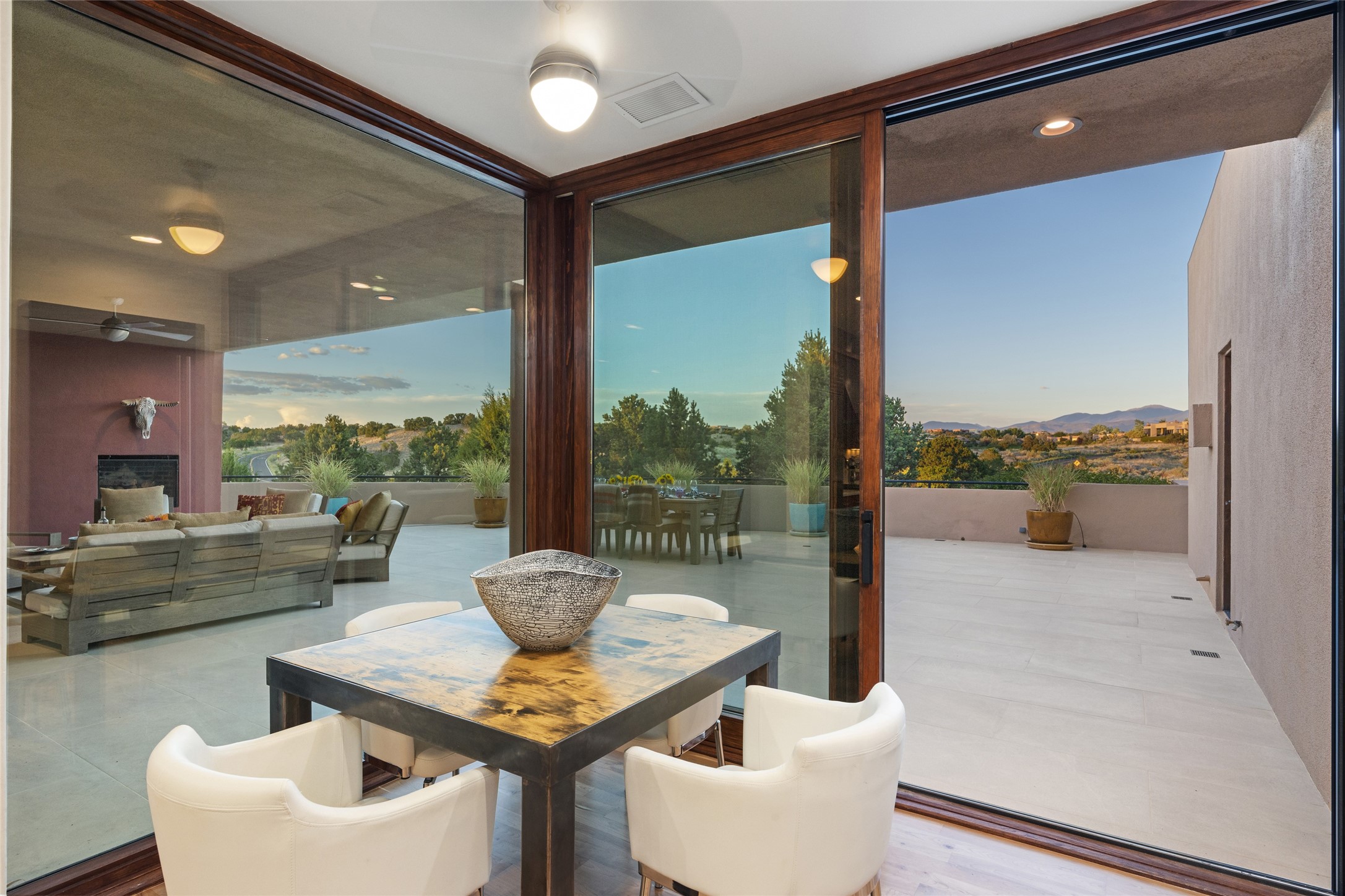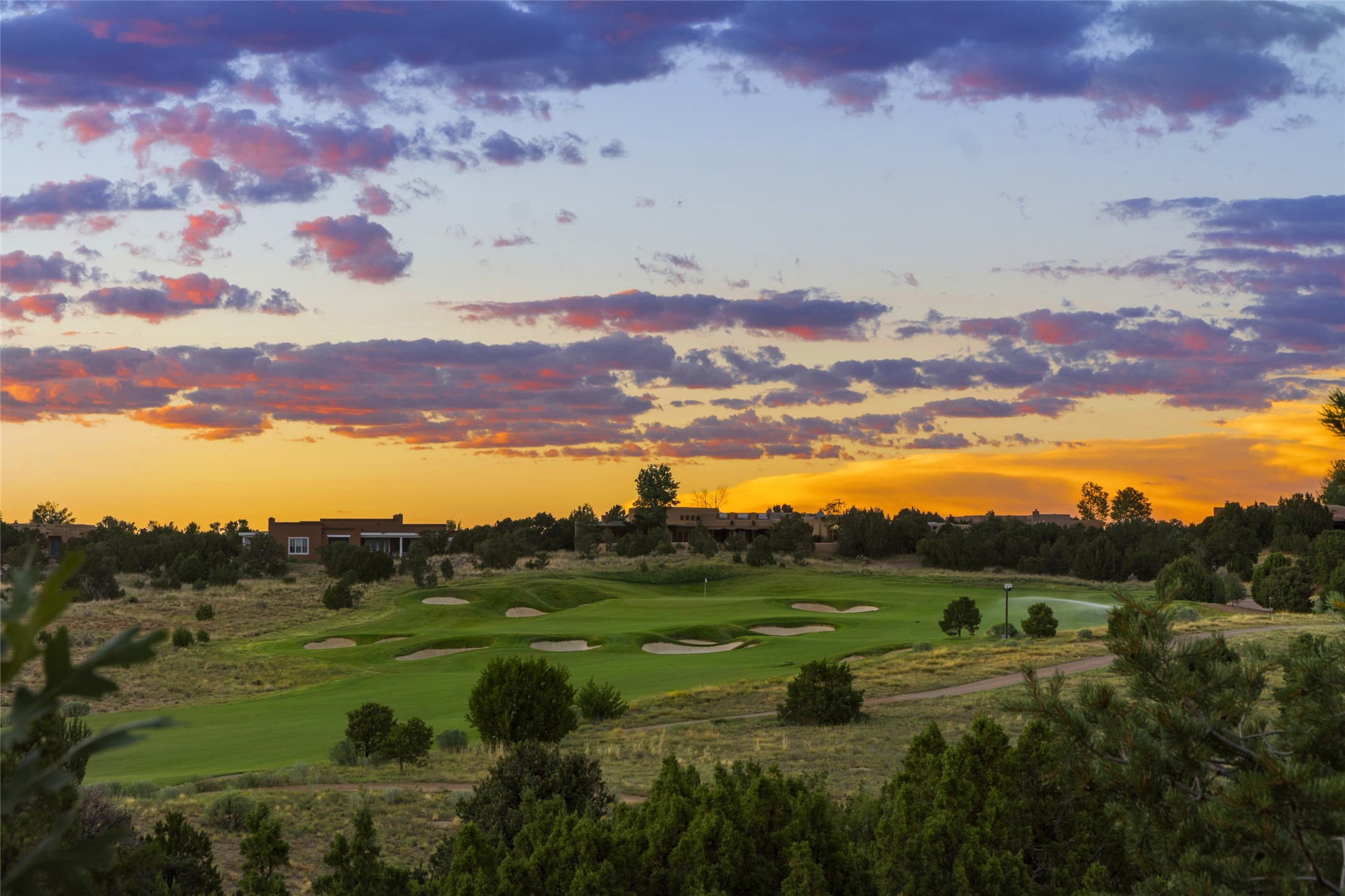 This sophisticated, soft-contemporary custom estate features dramatic architectural design with luxury finishes throughout and is beautifully sited overlooking the Sunset Golf Course in Las Campanas with impressive Jemez and Sangre de Cristo Mountain views. In the coveted Club Estates, and built by Doug McDowell, the 4296 sq. ft. main residence is entered through a private, gated and enclosed courtyard with mature landscape and hardscape accents. The home has been brilliantly re-imagined to combine today's contemporary living style with the inherent cues and warmth associated with Santa Fe. Thoughtfully planned for ease-of-entertaining and to maximize indoor/outdoor living, the renovation includes a sensational living room with high ceilings, vigas, a custom caf-style wet bar, fireplace, dining area and access to an incredible covered portal and elevated patio space with amazing views to the 17th hole. A spacious office is also well-suited as a media room with access to the patio. The large Chef's kitchen with center island offers professional grade appliances, a barista area, built-in wine cooler and a lovely corner breakfast area with views and patio access. There are two bedrooms in the main house situated for privacy. The owner's suite has been masterfully redone with portal access to capture Jemez mountain views and features a state-of-the-art spa bath area and generous walk-in closet with custom built-ins. The guest bedroom is ensuite with a separate entrance to the interior front courtyard. Luxury finishes include wood and natural stone flooring, quartzite stone and diamond plaster walls. The independent guest house maintains high-end finishes and offers 1067 sq. ft. to include a well-proportioned living/dining area, kitchenette, two bedrooms, modern bath and access to the main patio area. Total heated square footage is 5363. A 3-car garage, large storage room, private-gated drive and ample motor court complete the estate. 15 minutes to the Historical Plaza and the Santa Fe Airport. Memberships to the private Club at Las Campanas are optional and available for purchase upon approval. The Club offers two Signature Jack Nicklaus Golf Courses, Golf Performance Center, Hacienda Clubhouse, Spa & Fitness Center, Indoor and outdoor pools, pickleball and tennis courts, Log Cabin restaurant and a world-class equestrian center.