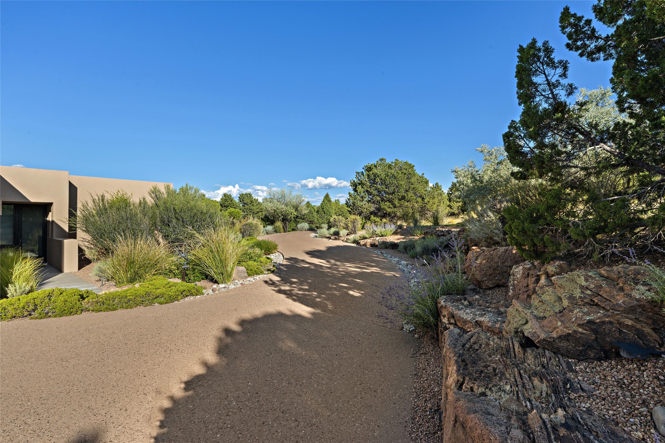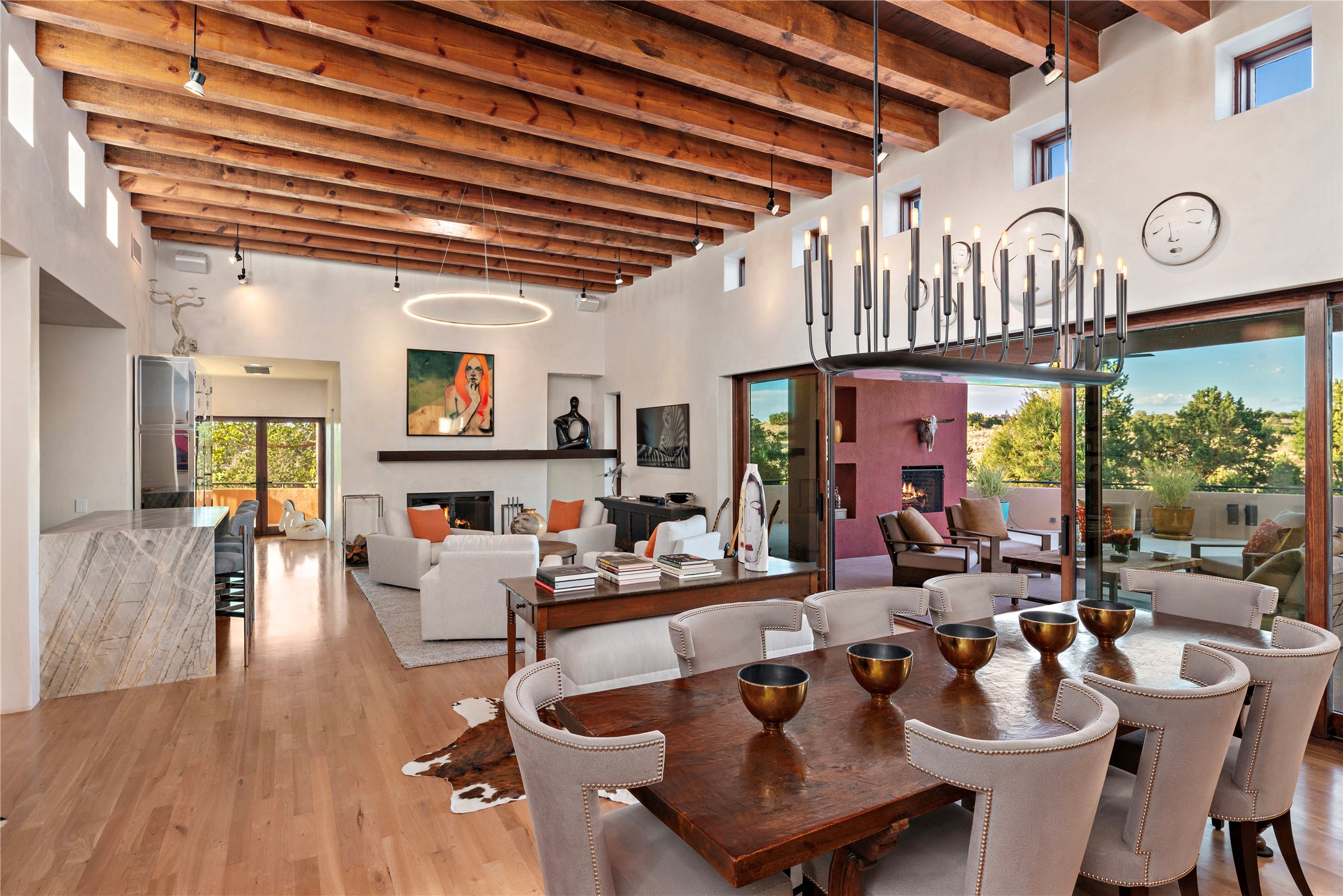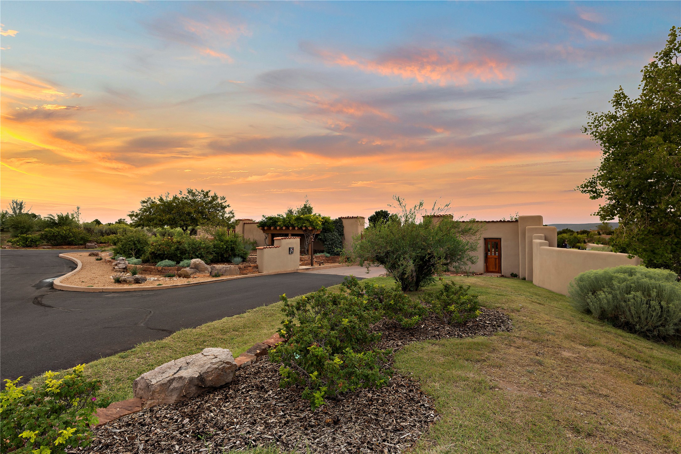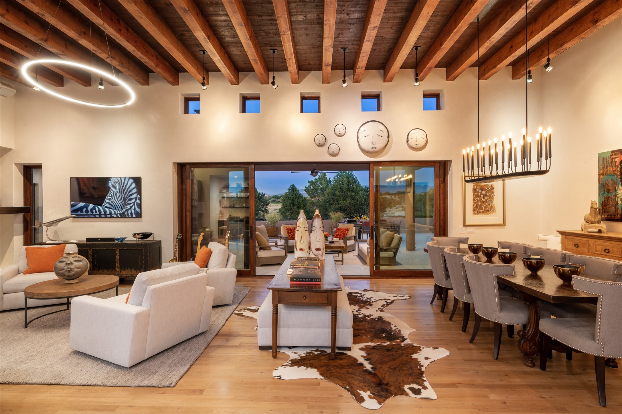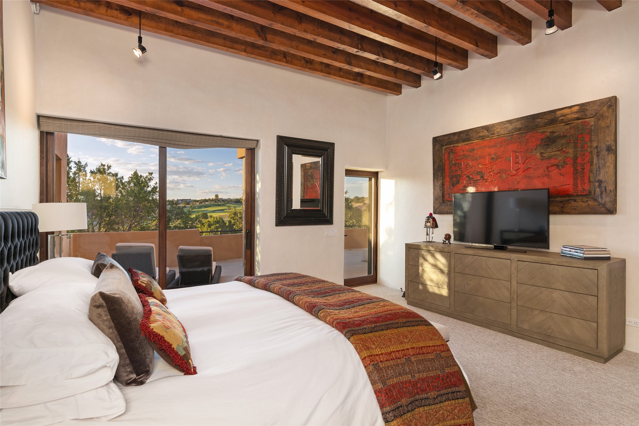 This sophisticated, soft-contemporary custom estate features dramatic architectural design with luxury finishes throughout and is beautifully sited overlooking the Sunset Golf Course in Las Campanas with impressive Jemez and Sangre de Cristo Mountain views. In the coveted Club Estates, and built by Doug McDowell, the 4296 sq. ft. main residence is entered through a private, gated and enclosed courtyard with mature landscape and hardscape accents. The home has been brilliantly re-imagined to combine today's contemporary living style with the inherent cues and warmth associated with Santa Fe. Thoughtfully planned for ease-of-entertaining and to maximize indoor/outdoor living, the renovation includes a sensational living room with high ceilings, vigas, a custom caf-style wet bar, fireplace, dining area and access to an incredible covered portal and elevated patio space with amazing views to the 17th hole. A spacious office is also well-suited as a media room with access to the patio. The large Chef's kitchen with center island offers professional grade appliances, a barista area, built-in wine cooler and a lovely corner breakfast area with views and patio access. There are two bedrooms in the main house situated for privacy. The owner's suite has been masterfully redone with portal access to capture Jemez mountain views and features a state-of-the-art spa bath area and generous walk-in closet with custom built-ins. The guest bedroom is ensuite with a separate entrance to the interior front courtyard. Luxury finishes include wood and natural stone flooring, quartzite stone and diamond plaster walls. The independent guest house maintains high-end finishes and offers 1067 sq. ft. to include a well-proportioned living/dining area, kitchenette, two bedrooms, modern bath and access to the main patio area. Total heated square footage is 5363. A 3-car garage, large storage room, private-gated drive and ample motor court complete the estate. 15 minutes to the Historical Plaza and the Santa Fe Airport. Memberships to the private Club at Las Campanas are optional and available for purchase upon approval. The Club offers two Signature Jack Nicklaus Golf Courses, Golf Performance Center, Hacienda Clubhouse, Spa & Fitness Center, Indoor and outdoor pools, pickleball and tennis courts, Log Cabin restaurant and a world-class equestrian center.