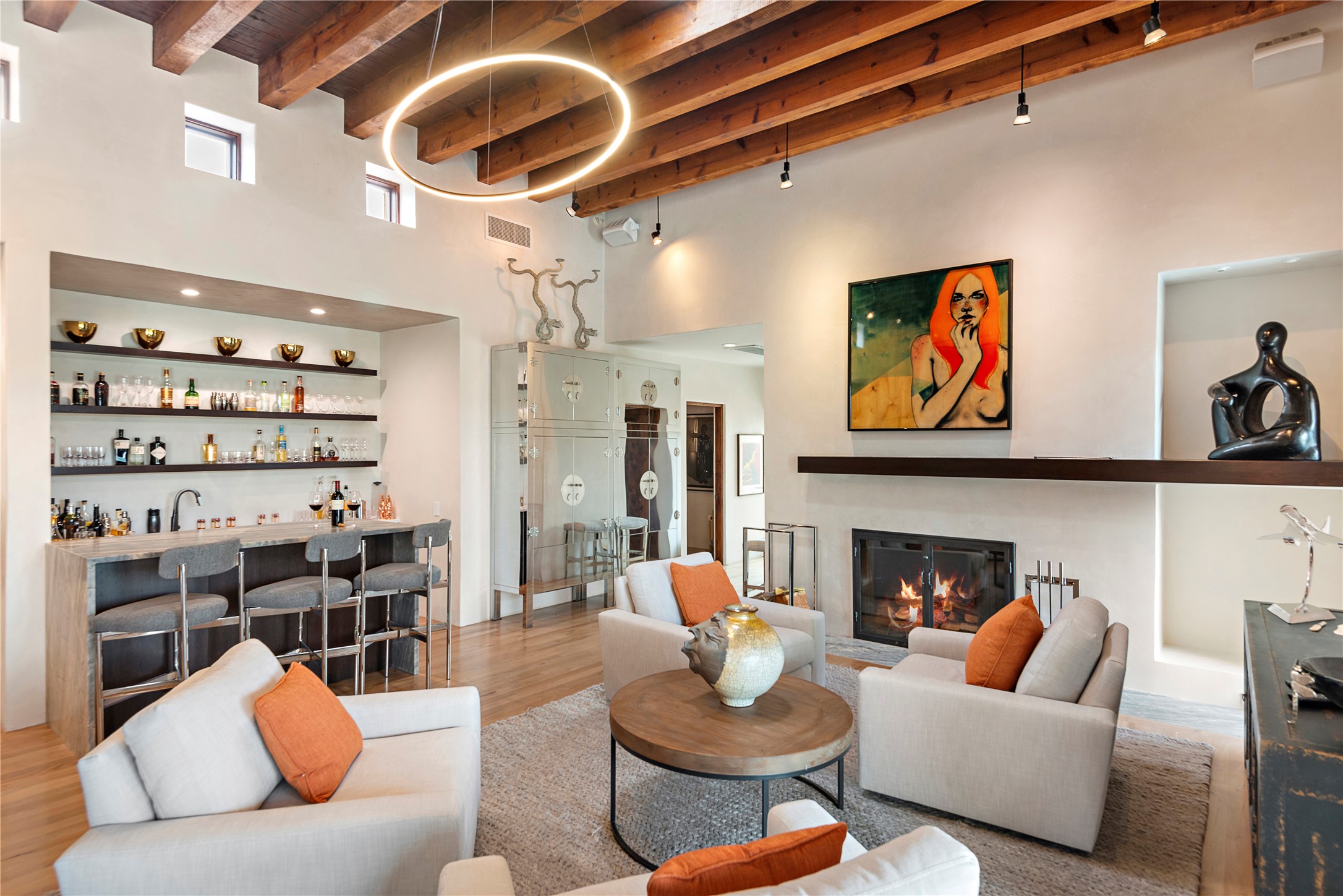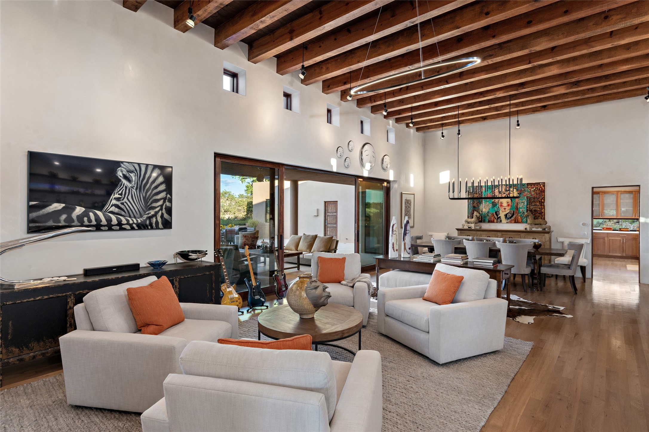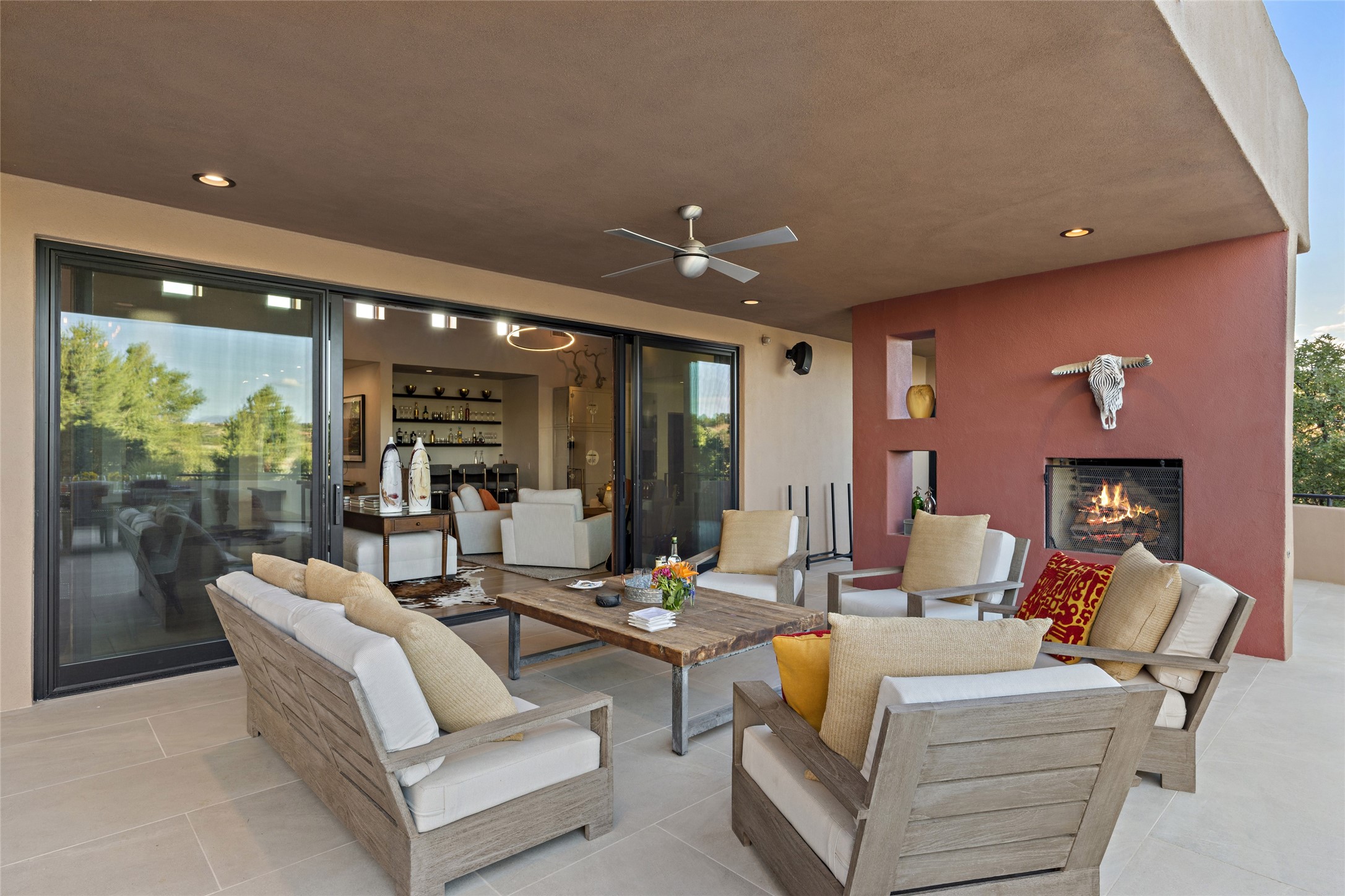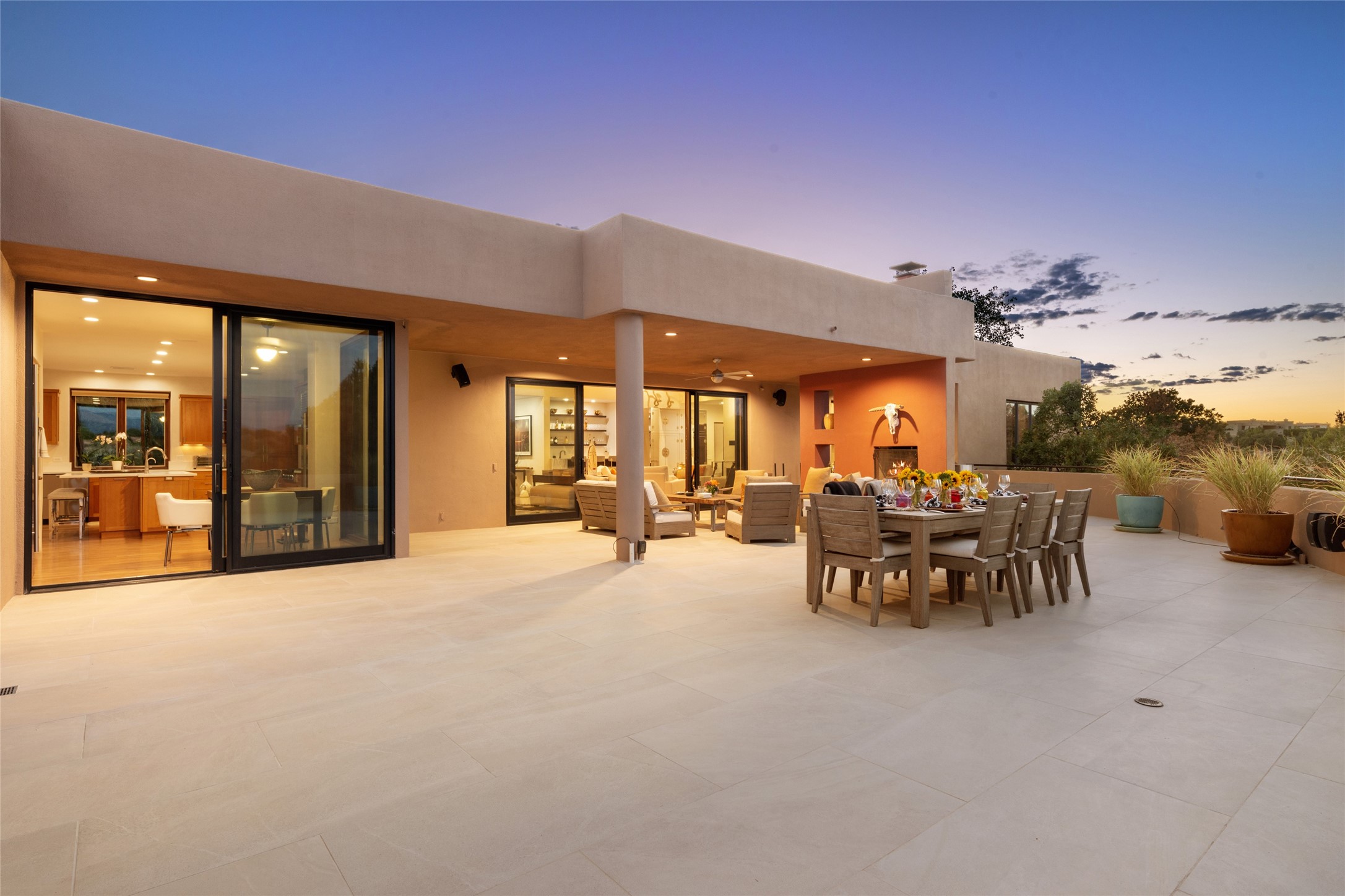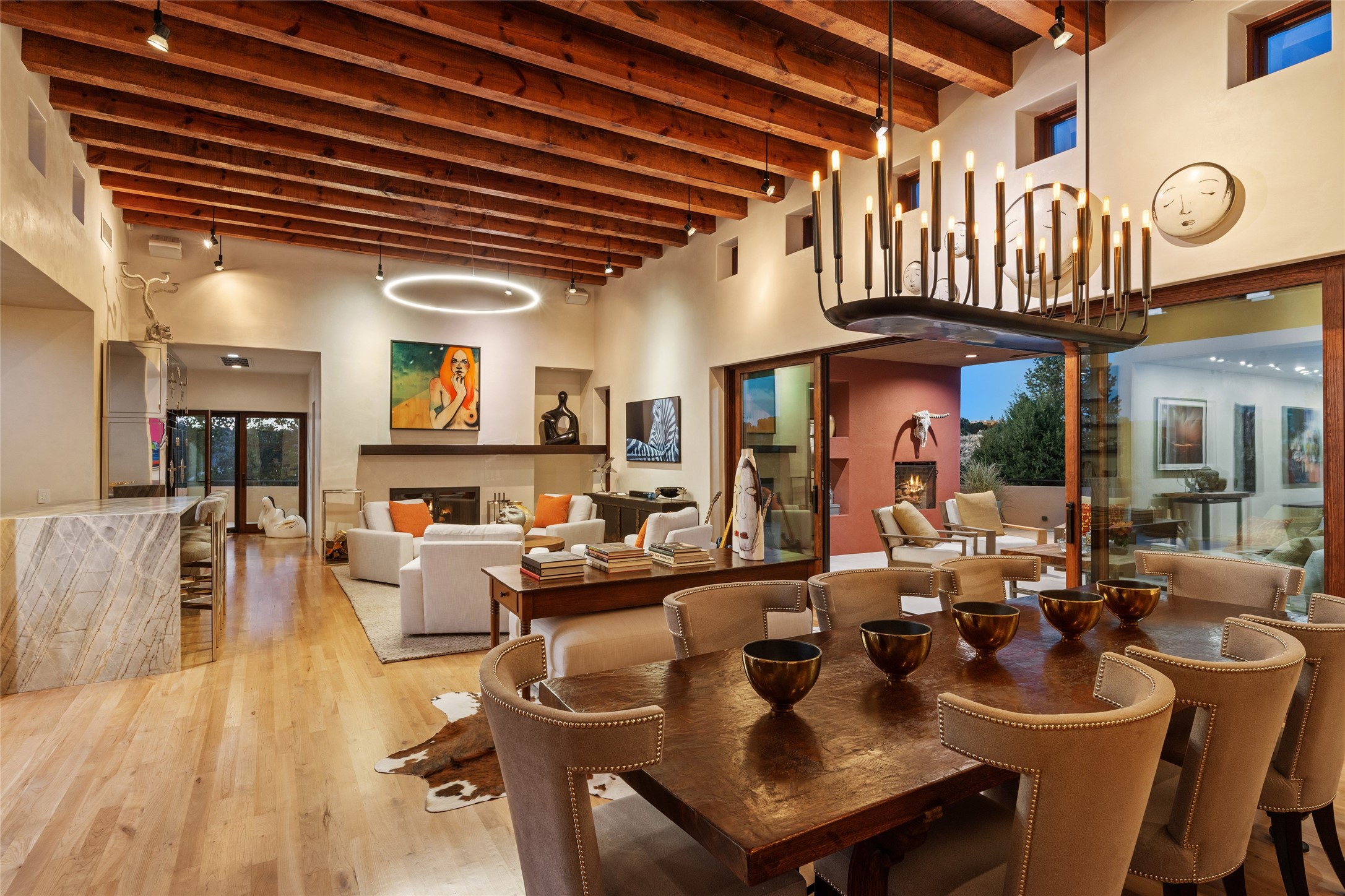 This sophisticated, soft-contemporary custom estate features dramatic architectural design with luxury finishes throughout and is beautifully sited overlooking the Sunset Golf Course in Las Campanas with impressive Jemez and Sangre de Cristo Mountain views. In the coveted Club Estates, and built by Doug McDowell, the 4296 sq. ft. main residence is entered through a private, gated and enclosed courtyard with mature landscape and hardscape accents. The home has been brilliantly re-imagined to combine today's contemporary living style with the inherent cues and warmth associated with Santa Fe. Thoughtfully planned for ease-of-entertaining and to maximize indoor/outdoor living, the renovation includes a sensational living room with high ceilings, vigas, a custom caf-style wet bar, fireplace, dining area and access to an incredible covered portal and elevated patio space with amazing views to the 17th hole. A spacious office is also well-suited as a media room with access to the patio. The large Chef's kitchen with center island offers professional grade appliances, a barista area, built-in wine cooler and a lovely corner breakfast area with views and patio access. There are two bedrooms in the main house situated for privacy. The owner's suite has been masterfully redone with portal access to capture Jemez mountain views and features a state-of-the-art spa bath area and generous walk-in closet with custom built-ins. The guest bedroom is ensuite with a separate entrance to the interior front courtyard. Luxury finishes include wood and natural stone flooring, quartzite stone and diamond plaster walls. The independent guest house maintains high-end finishes and offers 1067 sq. ft. to include a well-proportioned living/dining area, kitchenette, two bedrooms, modern bath and access to the main patio area. Total heated square footage is 5363. A 3-car garage, large storage room, private-gated drive and ample motor court complete the estate. 15 minutes to the Historical Plaza and the Santa Fe Airport. Memberships to the private Club at Las Campanas are optional and available for purchase upon approval. The Club offers two Signature Jack Nicklaus Golf Courses, Golf Performance Center, Hacienda Clubhouse, Spa & Fitness Center, Indoor and outdoor pools, pickleball and tennis courts, Log Cabin restaurant and a world-class equestrian center.