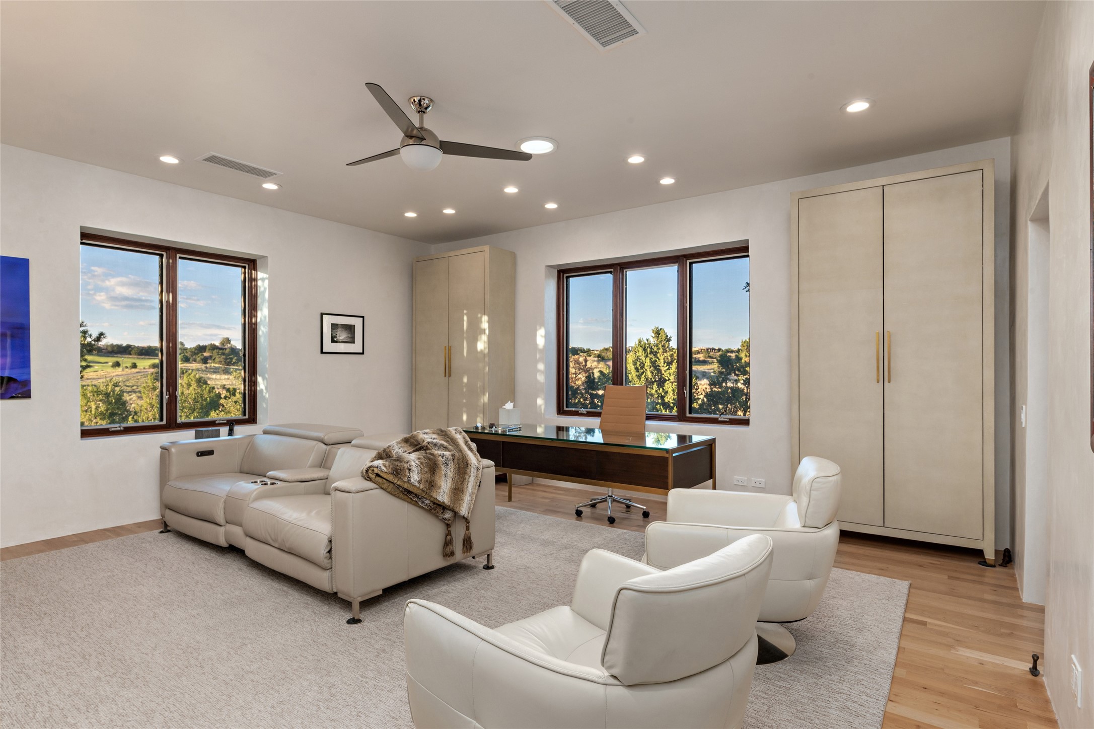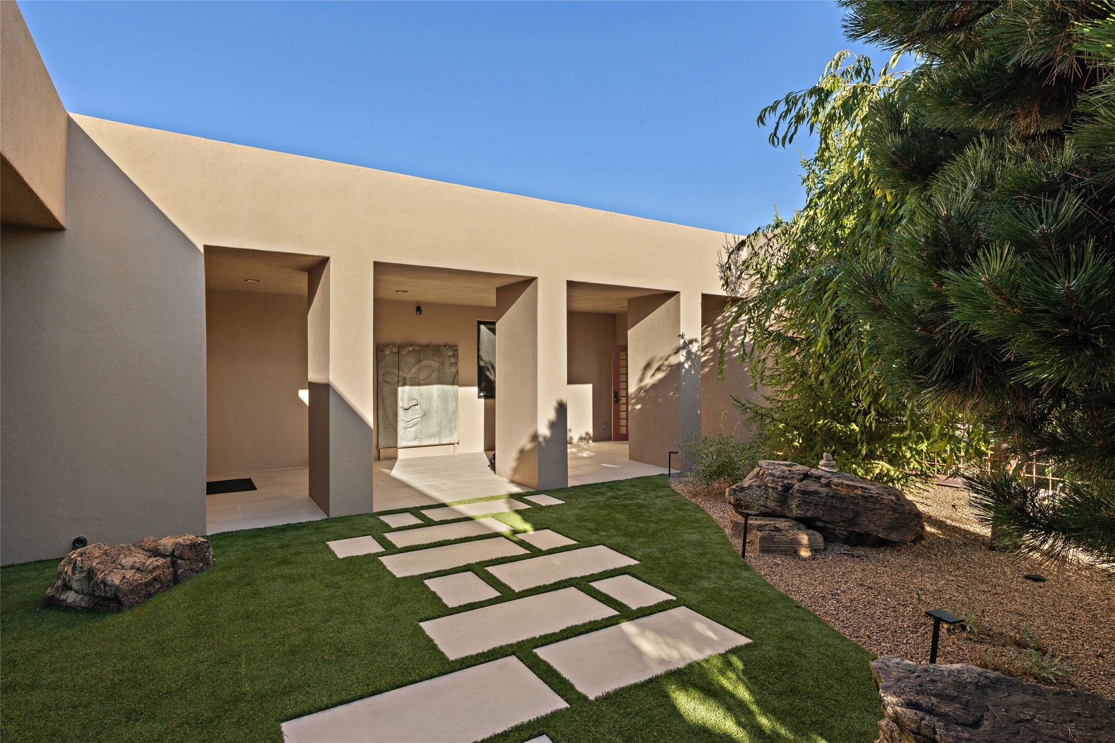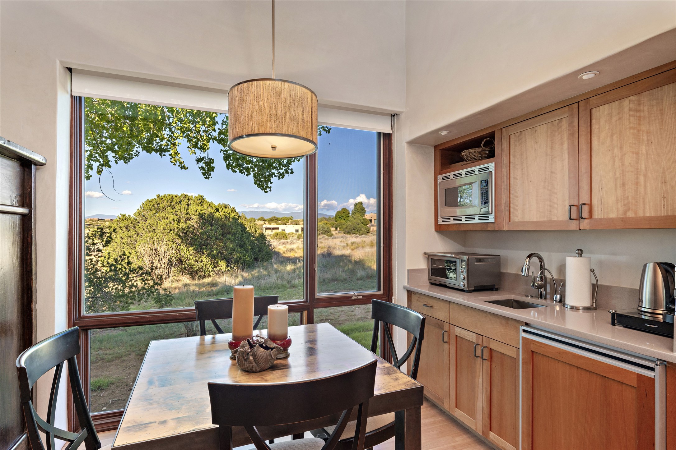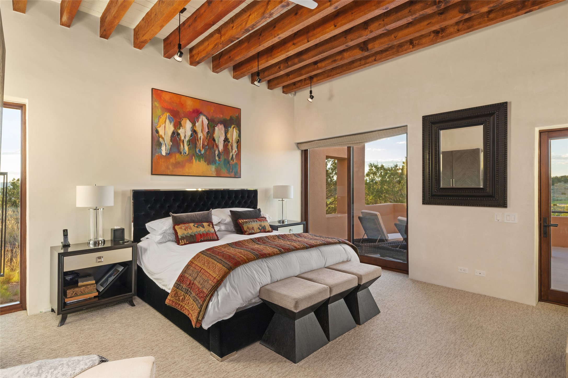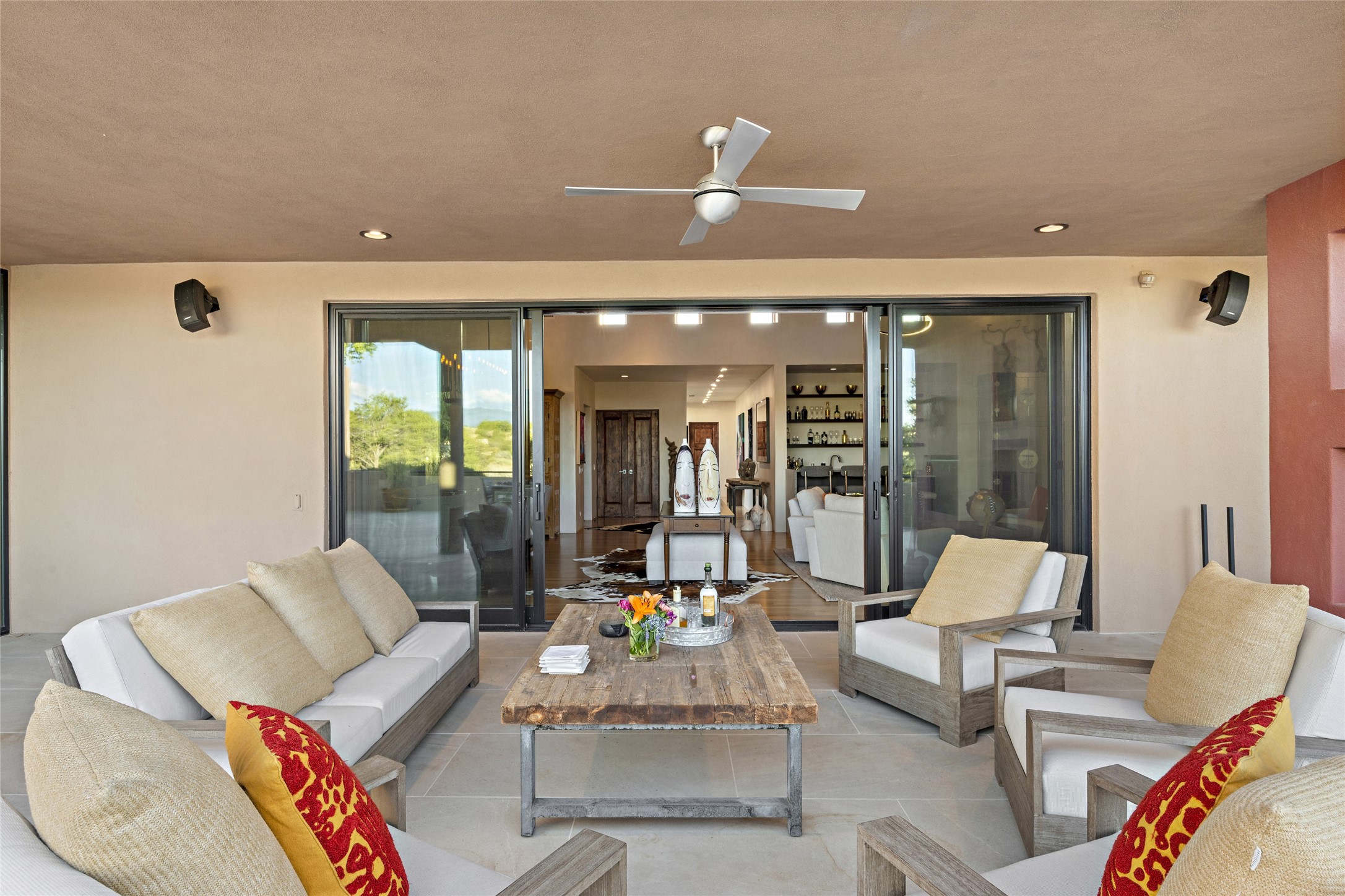 This sophisticated, soft-contemporary custom estate features dramatic architectural design with luxury finishes throughout and is beautifully sited overlooking the Sunset Golf Course in Las Campanas with impressive Jemez and Sangre de Cristo Mountain views. In the coveted Club Estates, and built by Doug McDowell, the 4296 sq. ft. main residence is entered through a private, gated and enclosed courtyard with mature landscape and hardscape accents. The home has been brilliantly re-imagined to combine today's contemporary living style with the inherent cues and warmth associated with Santa Fe. Thoughtfully planned for ease-of-entertaining and to maximize indoor/outdoor living, the renovation includes a sensational living room with high ceilings, vigas, a custom caf-style wet bar, fireplace, dining area and access to an incredible covered portal and elevated patio space with amazing views to the 17th hole. A spacious office is also well-suited as a media room with access to the patio. The large Chef's kitchen with center island offers professional grade appliances, a barista area, built-in wine cooler and a lovely corner breakfast area with views and patio access. There are two bedrooms in the main house situated for privacy. The owner's suite has been masterfully redone with portal access to capture Jemez mountain views and features a state-of-the-art spa bath area and generous walk-in closet with custom built-ins. The guest bedroom is ensuite with a separate entrance to the interior front courtyard. Luxury finishes include wood and natural stone flooring, quartzite stone and diamond plaster walls. The independent guest house maintains high-end finishes and offers 1067 sq. ft. to include a well-proportioned living/dining area, kitchenette, two bedrooms, modern bath and access to the main patio area. Total heated square footage is 5363. A 3-car garage, large storage room, private-gated drive and ample motor court complete the estate. 15 minutes to the Historical Plaza and the Santa Fe Airport. Memberships to the private Club at Las Campanas are optional and available for purchase upon approval. The Club offers two Signature Jack Nicklaus Golf Courses, Golf Performance Center, Hacienda Clubhouse, Spa & Fitness Center, Indoor and outdoor pools, pickleball and tennis courts, Log Cabin restaurant and a world-class equestrian center.