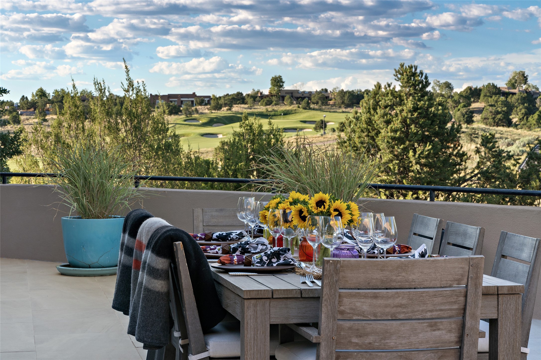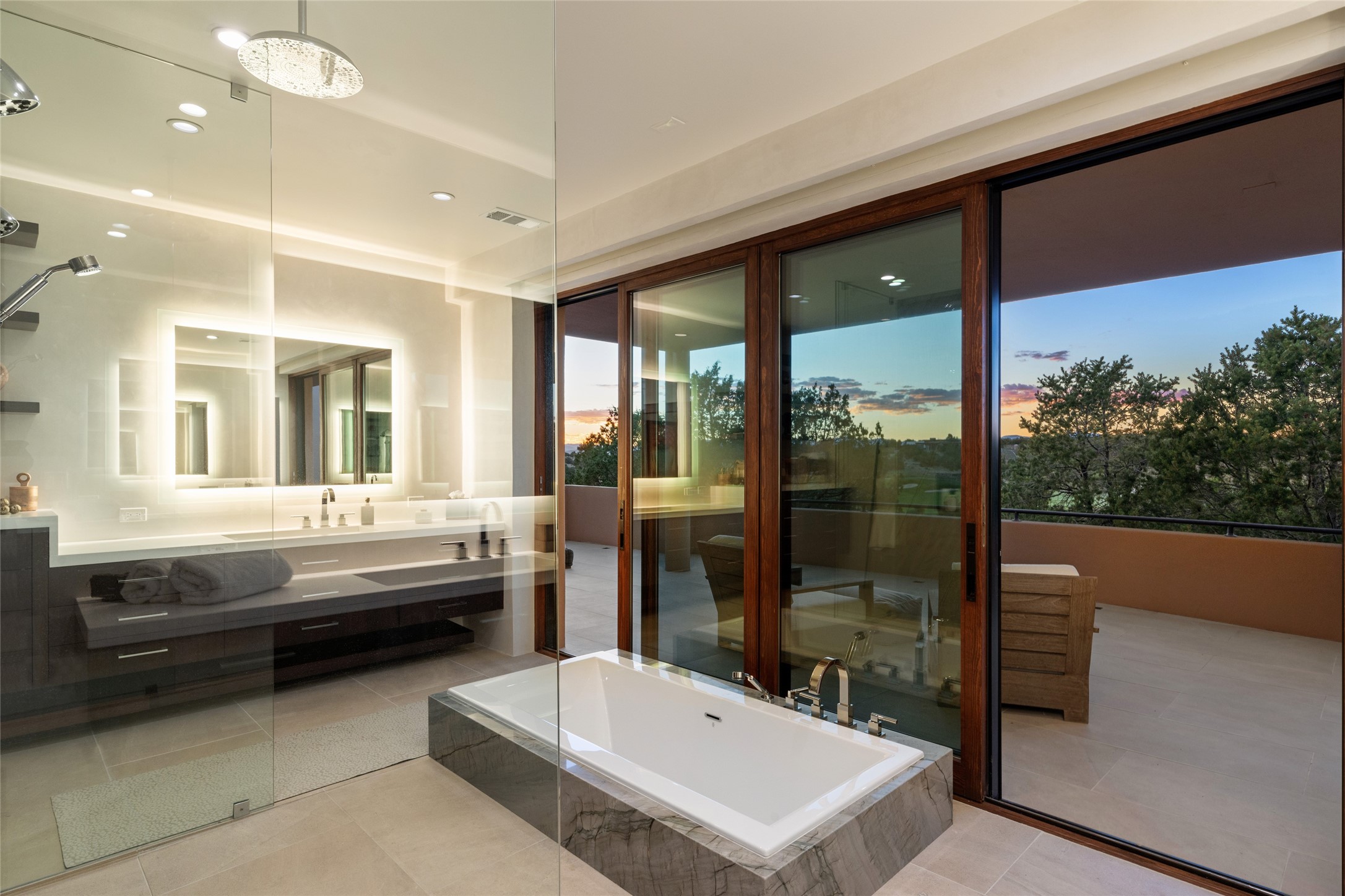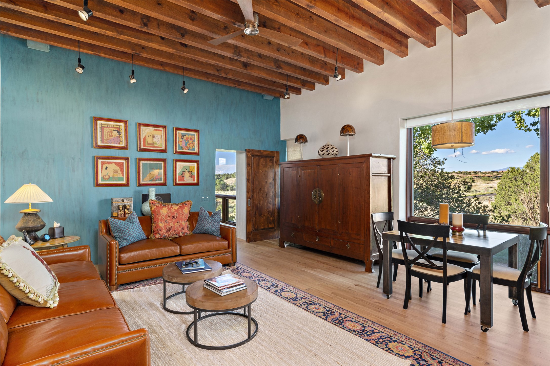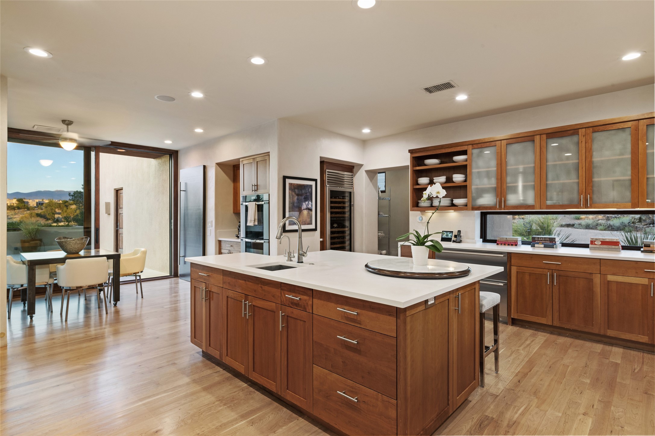 This sophisticated, soft-contemporary custom estate features dramatic architectural design with luxury finishes throughout and is beautifully sited overlooking the Sunset Golf Course in Las Campanas with impressive Jemez and Sangre de Cristo Mountain views. In the coveted Club Estates, and built by Doug McDowell, the 4296 sq. ft. main residence is entered through a private, gated and enclosed courtyard with mature landscape and hardscape accents. The home has been brilliantly re-imagined to combine today's contemporary living style with the inherent cues and warmth associated with Santa Fe. Thoughtfully planned for ease-of-entertaining and to maximize indoor/outdoor living, the renovation includes a sensational living room with high ceilings, vigas, a custom caf-style wet bar, fireplace, dining area and access to an incredible covered portal and elevated patio space with amazing views to the 17th hole. A spacious office is also well-suited as a media room with access to the patio. The large Chef's kitchen with center island offers professional grade appliances, a barista area, built-in wine cooler and a lovely corner breakfast area with views and patio access. There are two bedrooms in the main house situated for privacy. The owner's suite has been masterfully redone with portal access to capture Jemez mountain views and features a state-of-the-art spa bath area and generous walk-in closet with custom built-ins. The guest bedroom is ensuite with a separate entrance to the interior front courtyard. Luxury finishes include wood and natural stone flooring, quartzite stone and diamond plaster walls. The independent guest house maintains high-end finishes and offers 1067 sq. ft. to include a well-proportioned living/dining area, kitchenette, two bedrooms, modern bath and access to the main patio area. Total heated square footage is 5363. A 3-car garage, large storage room, private-gated drive and ample motor court complete the estate. 15 minutes to the Historical Plaza and the Santa Fe Airport. Memberships to the private Club at Las Campanas are optional and available for purchase upon approval. The Club offers two Signature Jack Nicklaus Golf Courses, Golf Performance Center, Hacienda Clubhouse, Spa & Fitness Center, Indoor and outdoor pools, pickleball and tennis courts, Log Cabin restaurant and a world-class equestrian center.