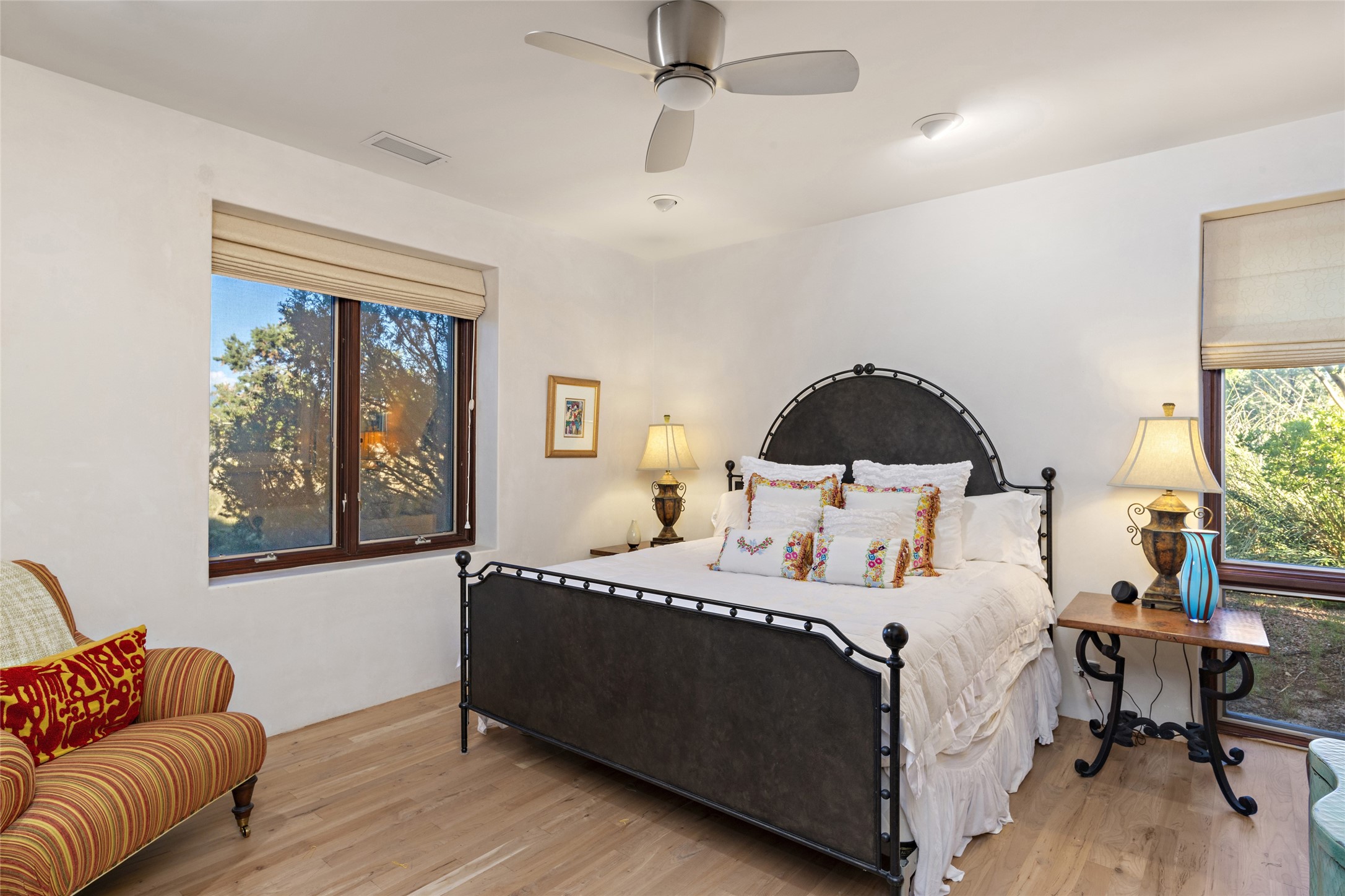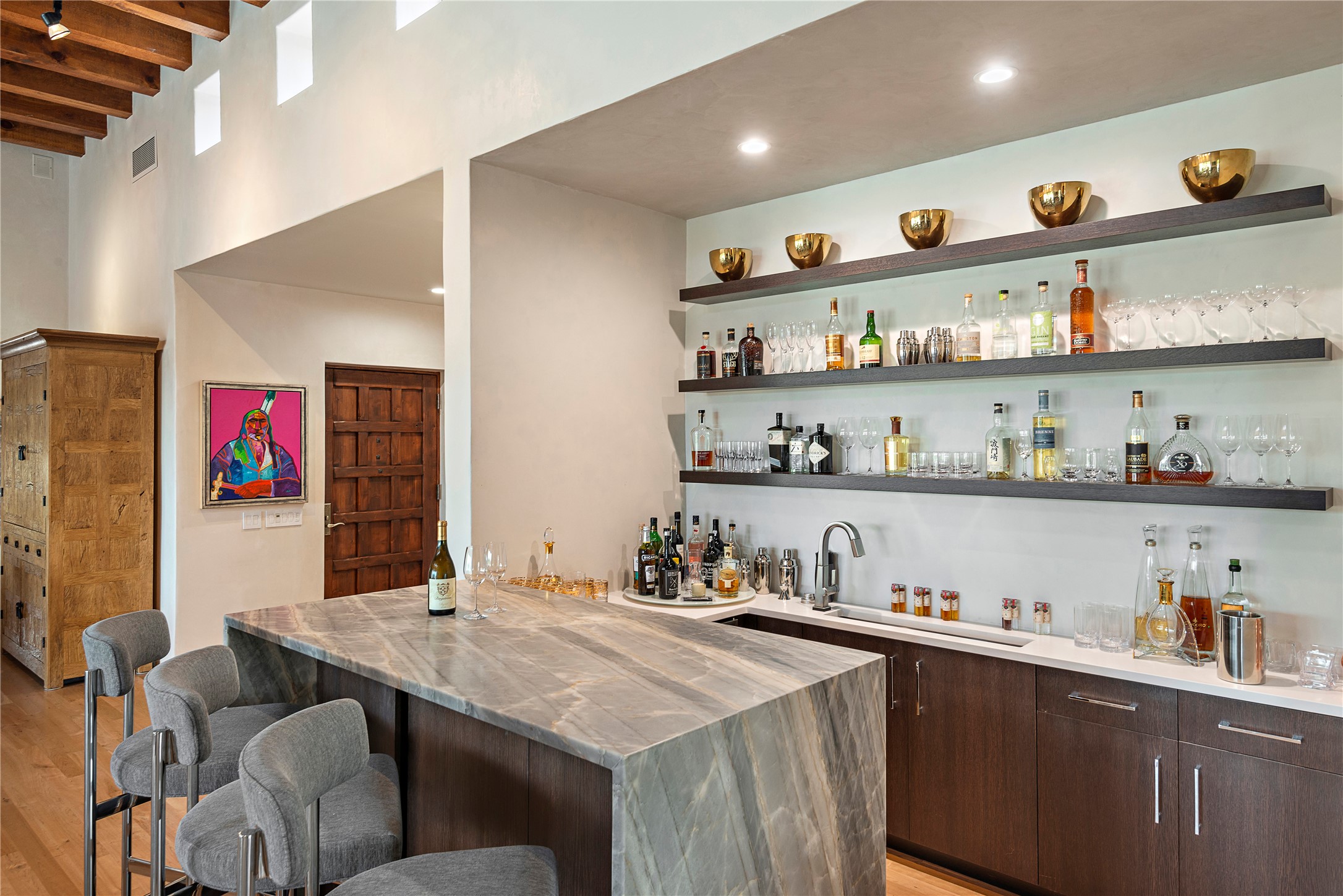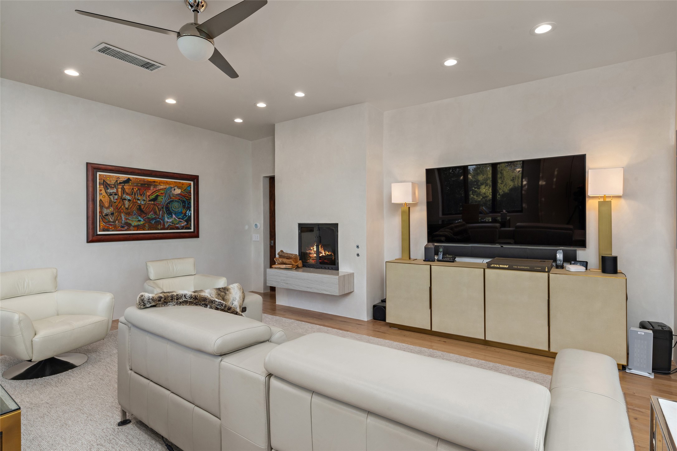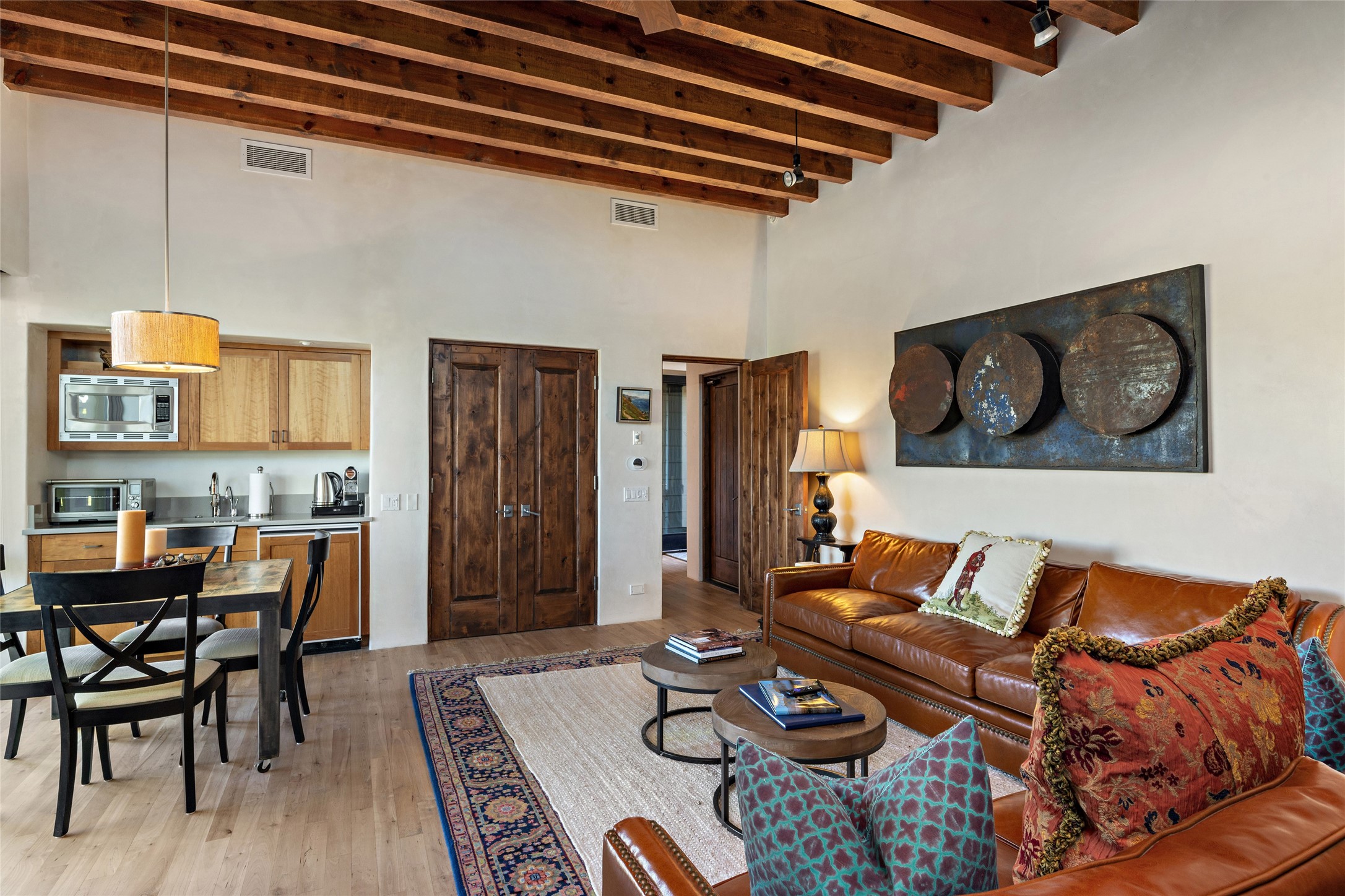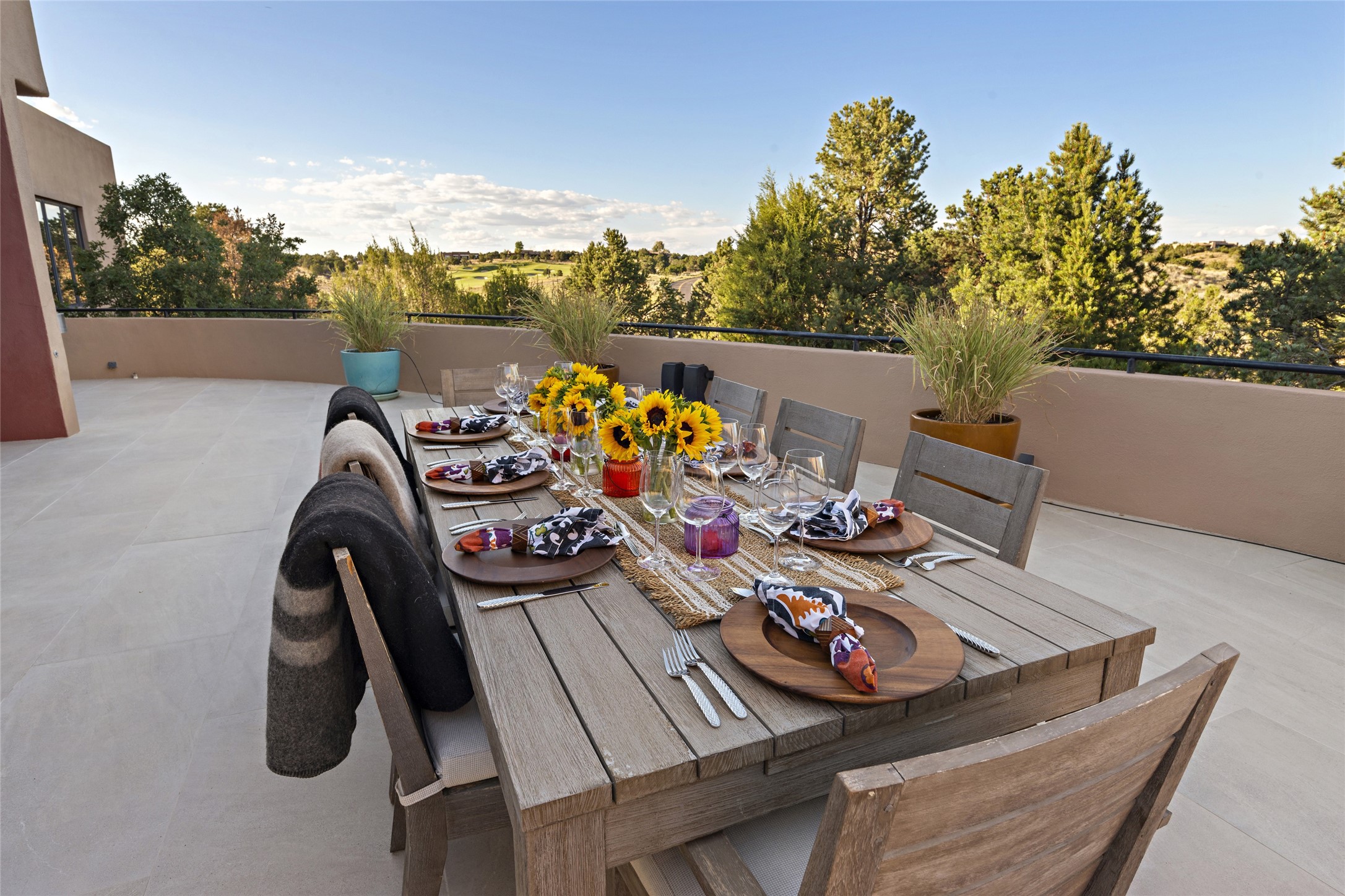This sophisticated, soft-contemporary custom estate features dramatic architectural design with luxury finishes throughout and is beautifully sited overlooking the Sunset Golf Course in Las Campanas with impressive Jemez and Sangre de Cristo Mountain views. In the coveted Club Estates, and built by Doug McDowell, the 4296 sq. ft. main residence is entered through a private, gated and enclosed courtyard with mature landscape and hardscape accents. The home has been brilliantly re-imagined to combine today's contemporary living style with the inherent cues and warmth associated with Santa Fe. Thoughtfully planned for ease-of-entertaining and to maximize indoor/outdoor living, the renovation includes a sensational living room with high ceilings, vigas, a custom caf-style wet bar, fireplace, dining area and access to an incredible covered portal and elevated patio space with amazing views to the 17th hole. A spacious office is also well-suited as a media room with access to the patio. The large Chef's kitchen with center island offers professional grade appliances, a barista area, built-in wine cooler and a lovely corner breakfast area with views and patio access. There are two bedrooms in the main house situated for privacy. The owner's suite has been masterfully redone with portal access to capture Jemez mountain views and features a state-of-the-art spa bath area and generous walk-in closet with custom built-ins. The guest bedroom is ensuite with a separate entrance to the interior front courtyard. Luxury finishes include wood and natural stone flooring, quartzite stone and diamond plaster walls. The independent guest house maintains high-end finishes and offers 1067 sq. ft. to include a well-proportioned living/dining area, kitchenette, two bedrooms, modern bath and access to the main patio area. Total heated square footage is 5363. A 3-car garage, large storage room, private-gated drive and ample motor court complete the estate. 15 minutes to the Historical Plaza and the Santa Fe Airport. Memberships to the private Club at Las Campanas are optional and available for purchase upon approval. The Club offers two Signature Jack Nicklaus Golf Courses, Golf Performance Center, Hacienda Clubhouse, Spa & Fitness Center, Indoor and outdoor pools, pickleball and tennis courts, Log Cabin restaurant and a world-class equestrian center.