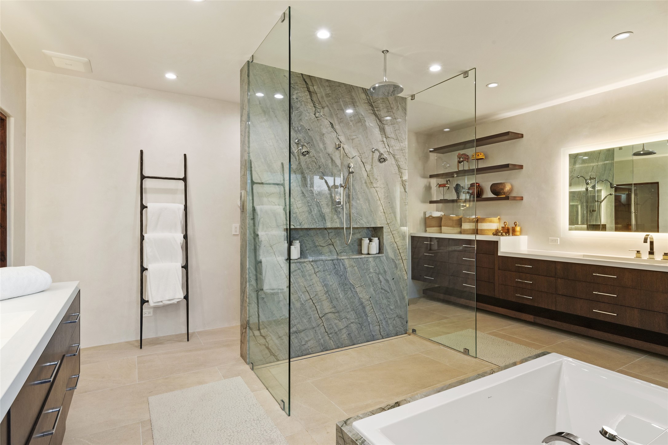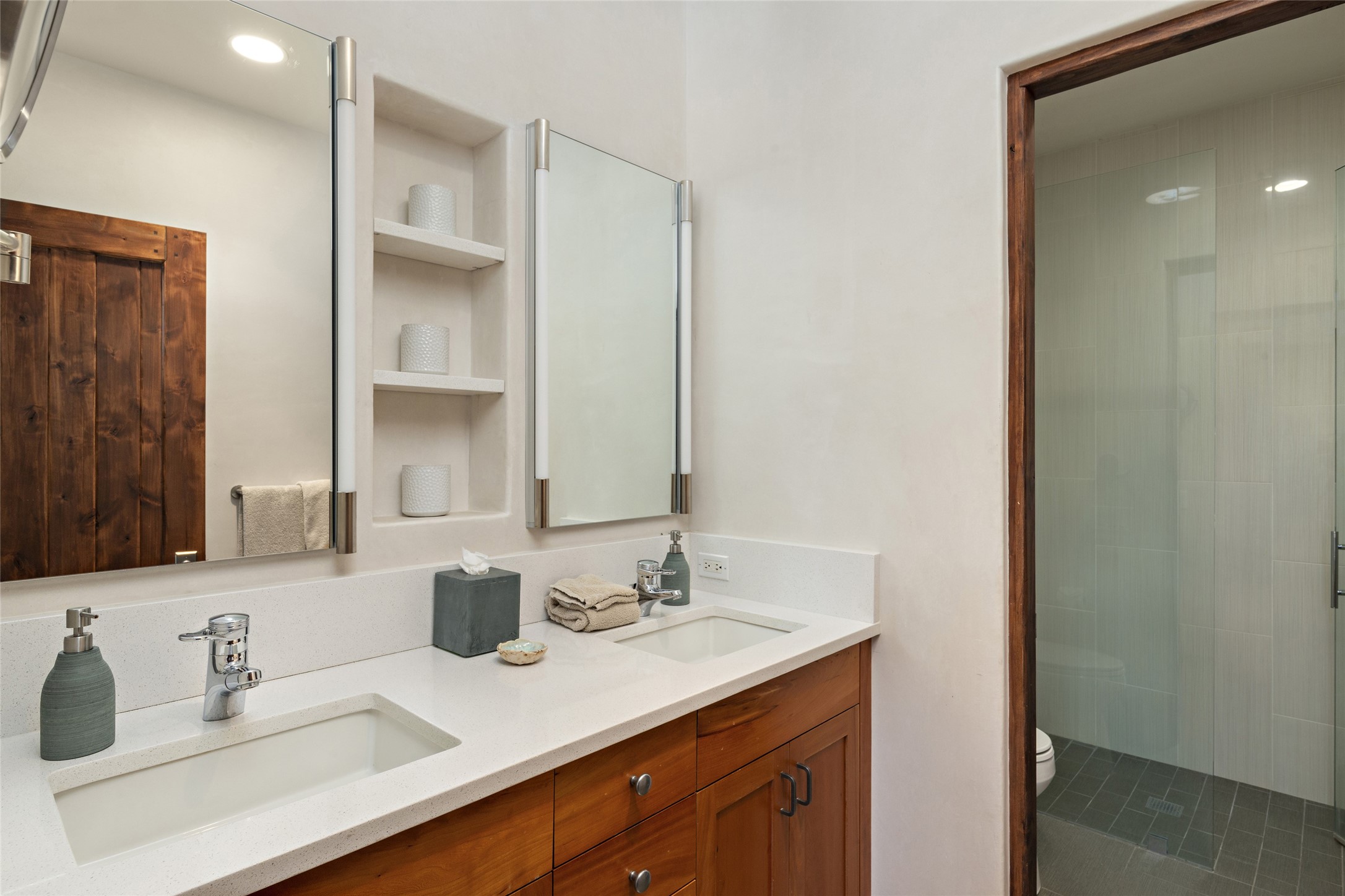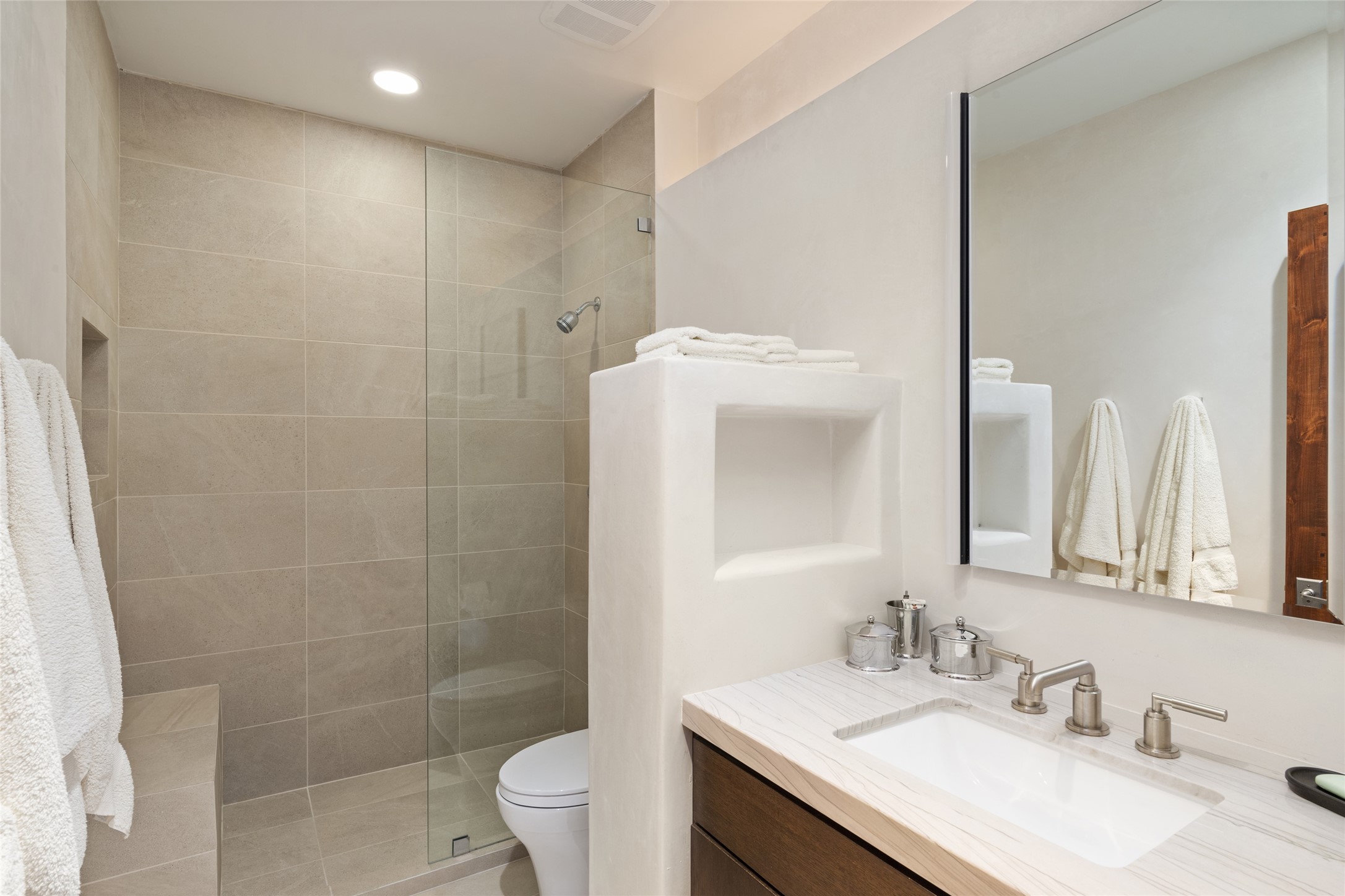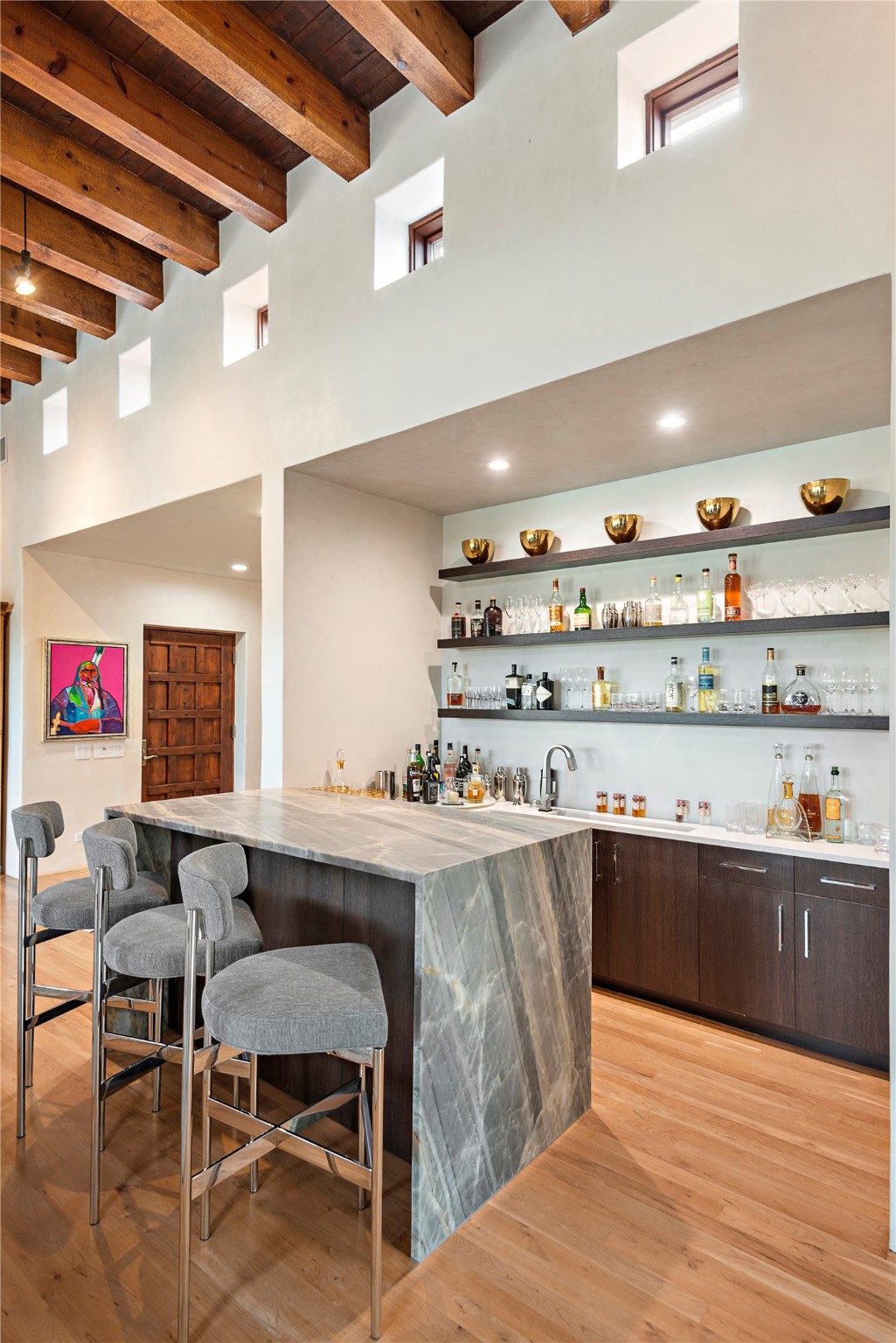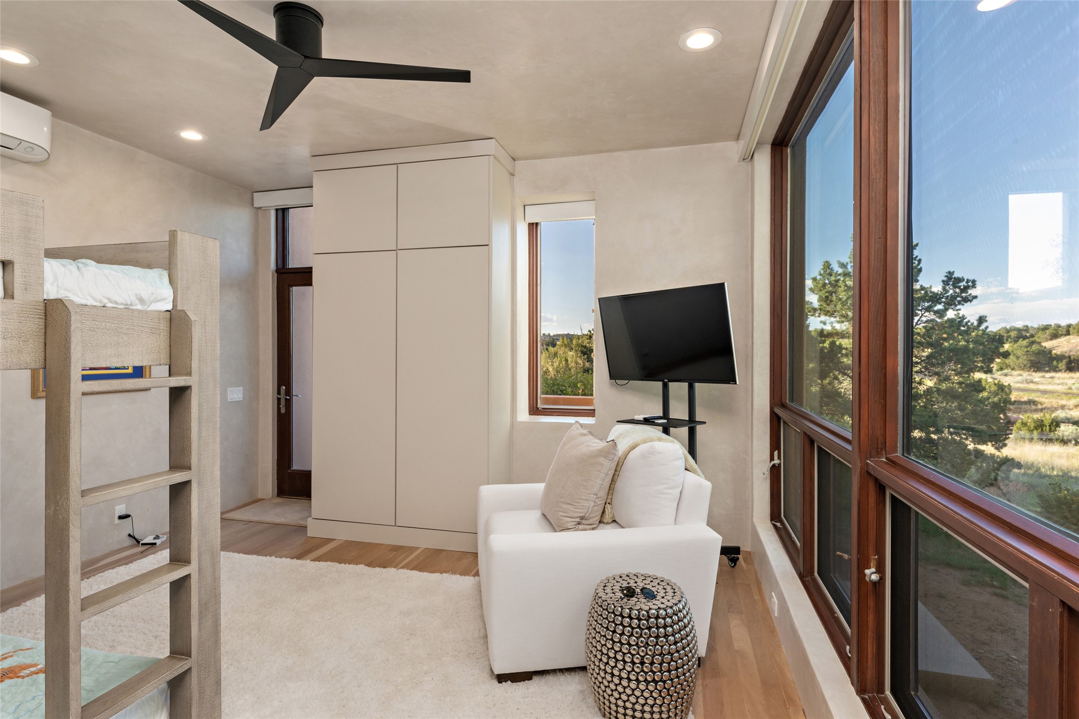 This sophisticated, soft-contemporary custom estate features dramatic architectural design with luxury finishes throughout and is beautifully sited overlooking the Sunset Golf Course in Las Campanas with impressive Jemez and Sangre de Cristo Mountain views. In the coveted Club Estates, and built by Doug McDowell, the 4296 sq. ft. main residence is entered through a private, gated and enclosed courtyard with mature landscape and hardscape accents. The home has been brilliantly re-imagined to combine today's contemporary living style with the inherent cues and warmth associated with Santa Fe. Thoughtfully planned for ease-of-entertaining and to maximize indoor/outdoor living, the renovation includes a sensational living room with high ceilings, vigas, a custom caf-style wet bar, fireplace, dining area and access to an incredible covered portal and elevated patio space with amazing views to the 17th hole. A spacious office is also well-suited as a media room with access to the patio. The large Chef's kitchen with center island offers professional grade appliances, a barista area, built-in wine cooler and a lovely corner breakfast area with views and patio access. There are two bedrooms in the main house situated for privacy. The owner's suite has been masterfully redone with portal access to capture Jemez mountain views and features a state-of-the-art spa bath area and generous walk-in closet with custom built-ins. The guest bedroom is ensuite with a separate entrance to the interior front courtyard. Luxury finishes include wood and natural stone flooring, quartzite stone and diamond plaster walls. The independent guest house maintains high-end finishes and offers 1067 sq. ft. to include a well-proportioned living/dining area, kitchenette, two bedrooms, modern bath and access to the main patio area. Total heated square footage is 5363. A 3-car garage, large storage room, private-gated drive and ample motor court complete the estate. 15 minutes to the Historical Plaza and the Santa Fe Airport. Memberships to the private Club at Las Campanas are optional and available for purchase upon approval. The Club offers two Signature Jack Nicklaus Golf Courses, Golf Performance Center, Hacienda Clubhouse, Spa & Fitness Center, Indoor and outdoor pools, pickleball and tennis courts, Log Cabin restaurant and a world-class equestrian center.