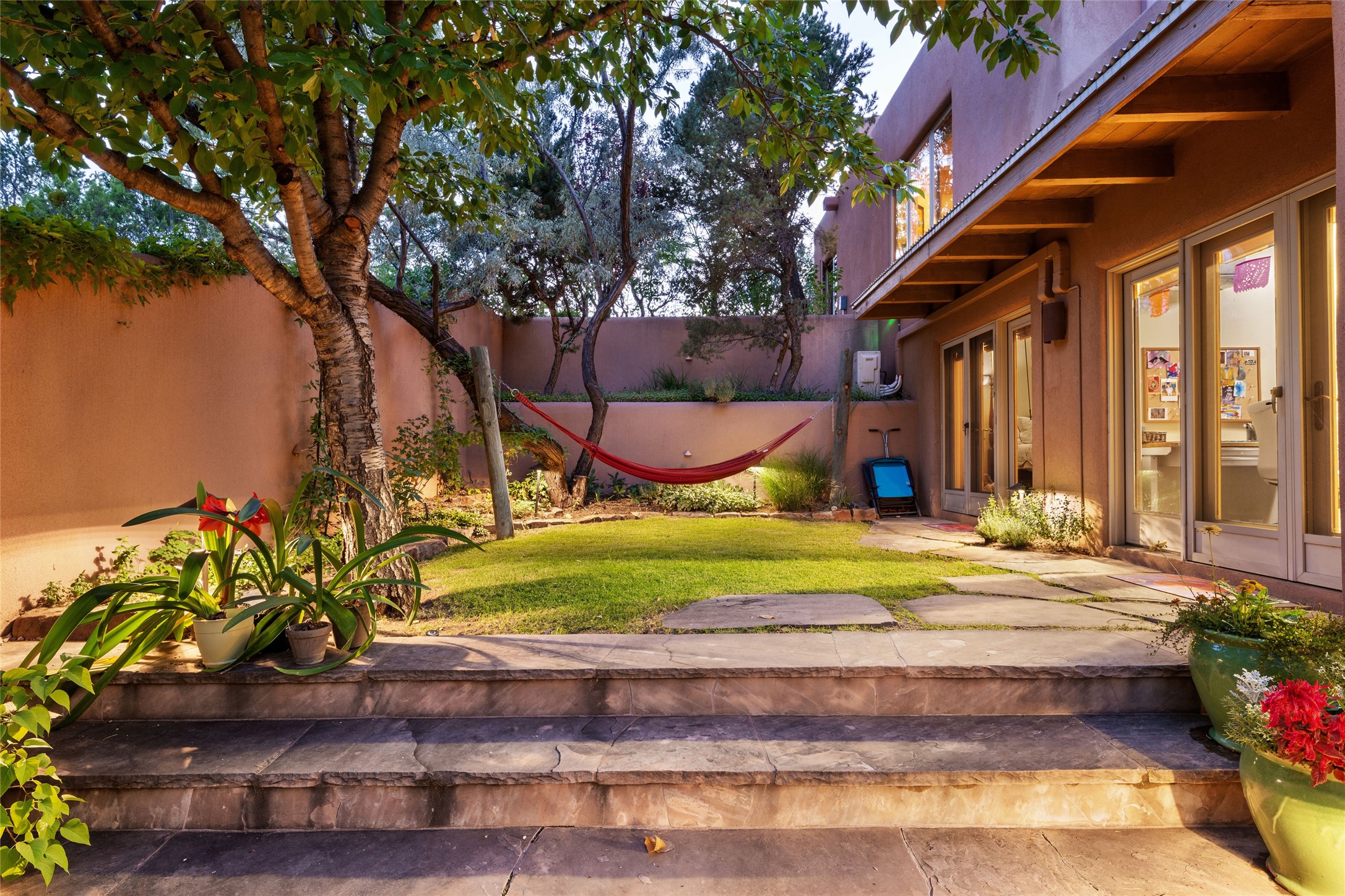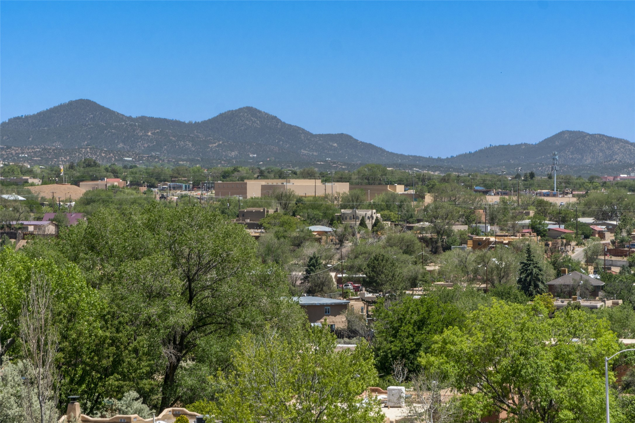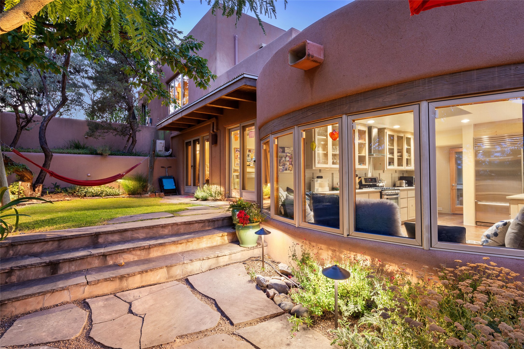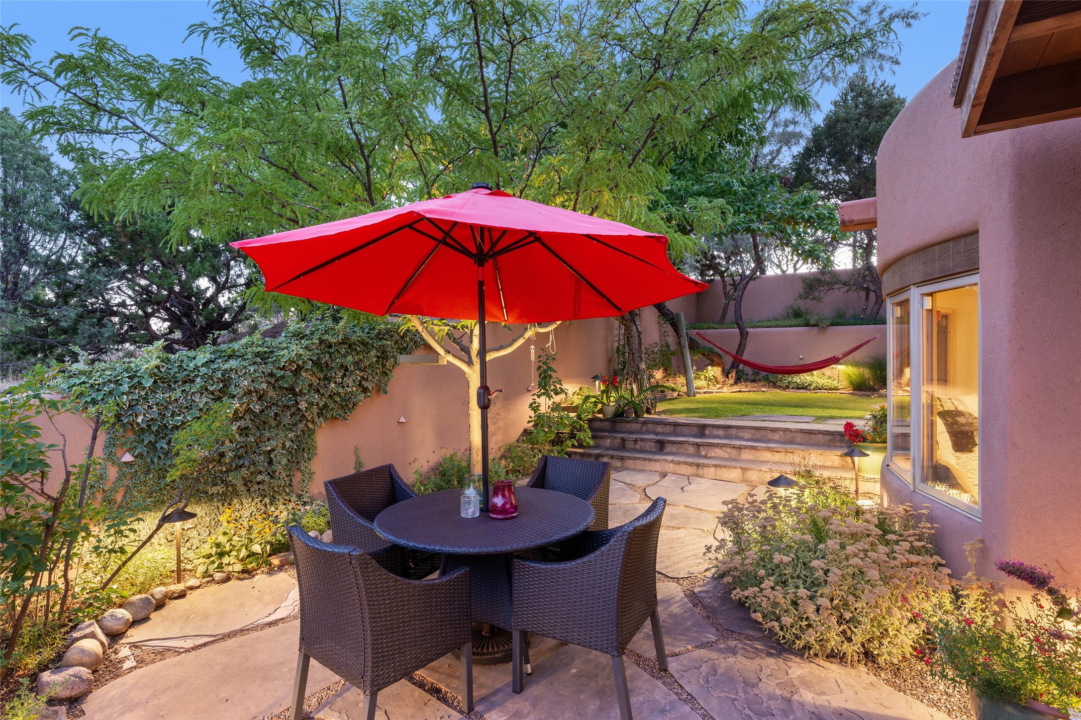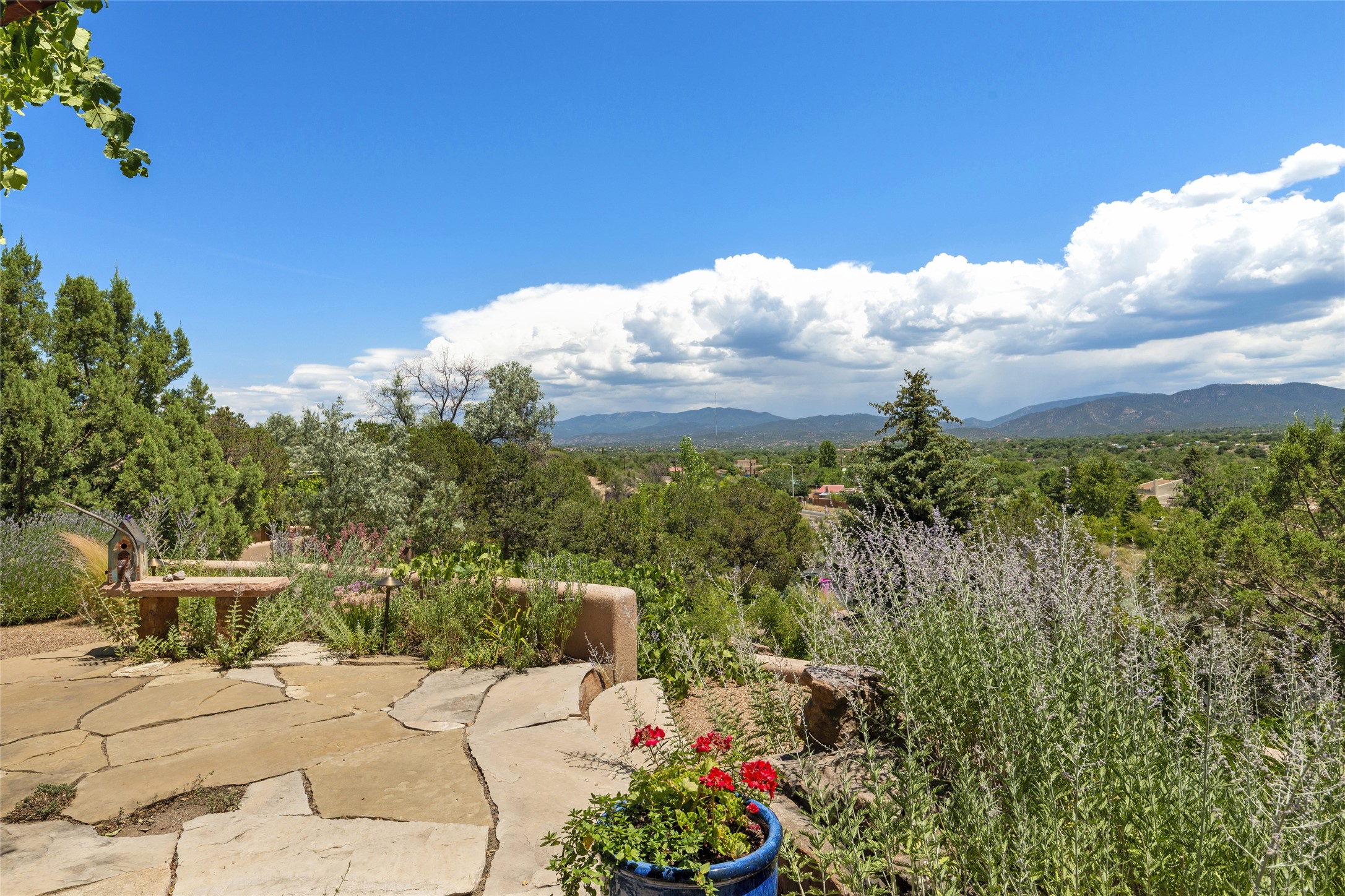 Hold your breath! You will be awed by the views, and enchanted by the gardens of this delightful, in-town property. The house was built by Michael Hurlocker, a Santa Fe builder, as his personal residence. He is well-known for his dedication to high quality design and construction. The light-filled interior is of gracious, ample proportions with many French doors leading to the gardens. Truly a home for easy living and entertaining in the spacious living and dining areas. The room-sized outside portal is pure magic, with grape and wisteria vines overhead and a view to the Sangre de Cristo Mountains to the east. A comfortable bay window seat graces the well-designed kitchen which has lots of counter space and cabinets. The primary suite is quietly situated at the top of the house, with large bedroom and splendid view deck, roomy bathroom and super-big walk-in closet. Two guest bedrooms both have French doors to the outside and are separately located from the main bedroom suite. One is currently used as a studio. And now for the bonus features - A home office with double doors in the main core of the house and a large storage room off the oversized, two-car garage. Landscape lighting has recently been installed and the gardens are on drip and sprinkler irrigation. Conveniently located in Las Lomas subdivision on 0.54 acres, this home is a delight, as also seen in the magical evening photographs!