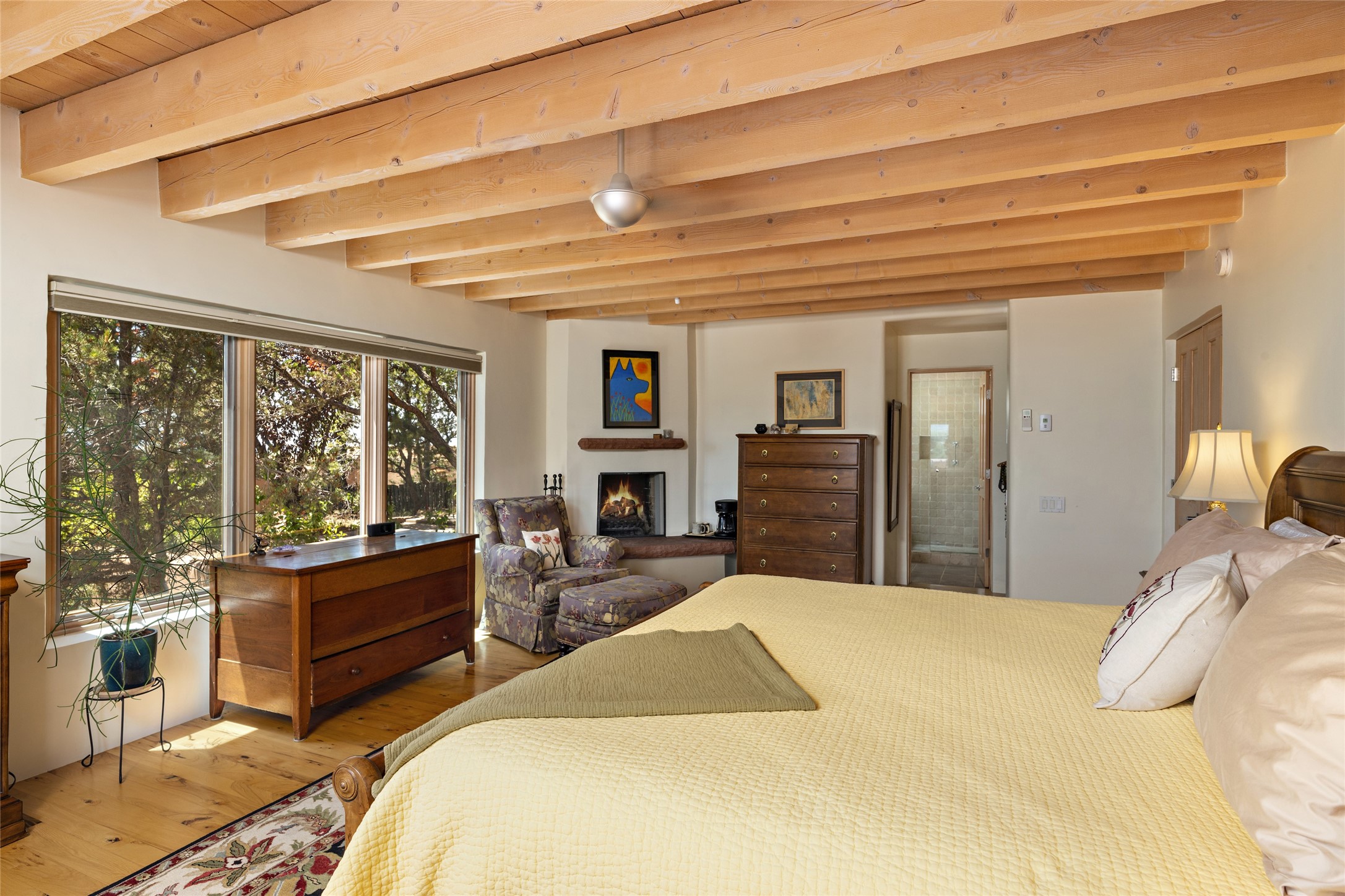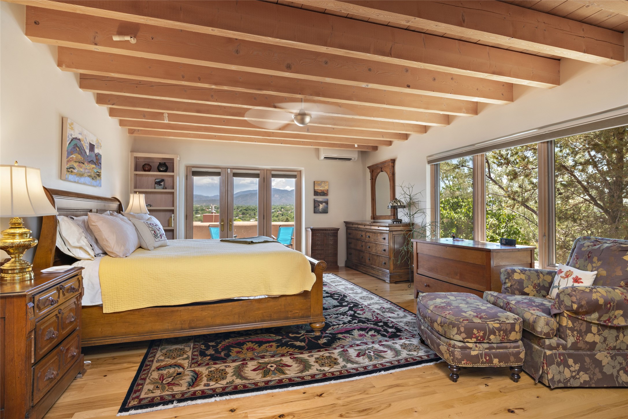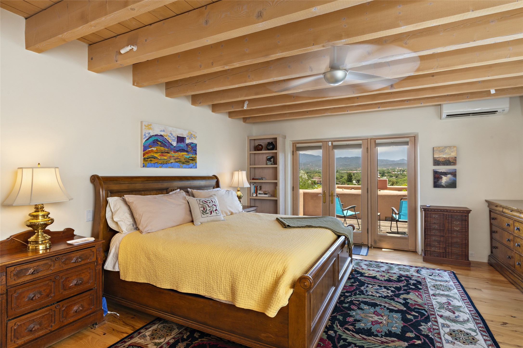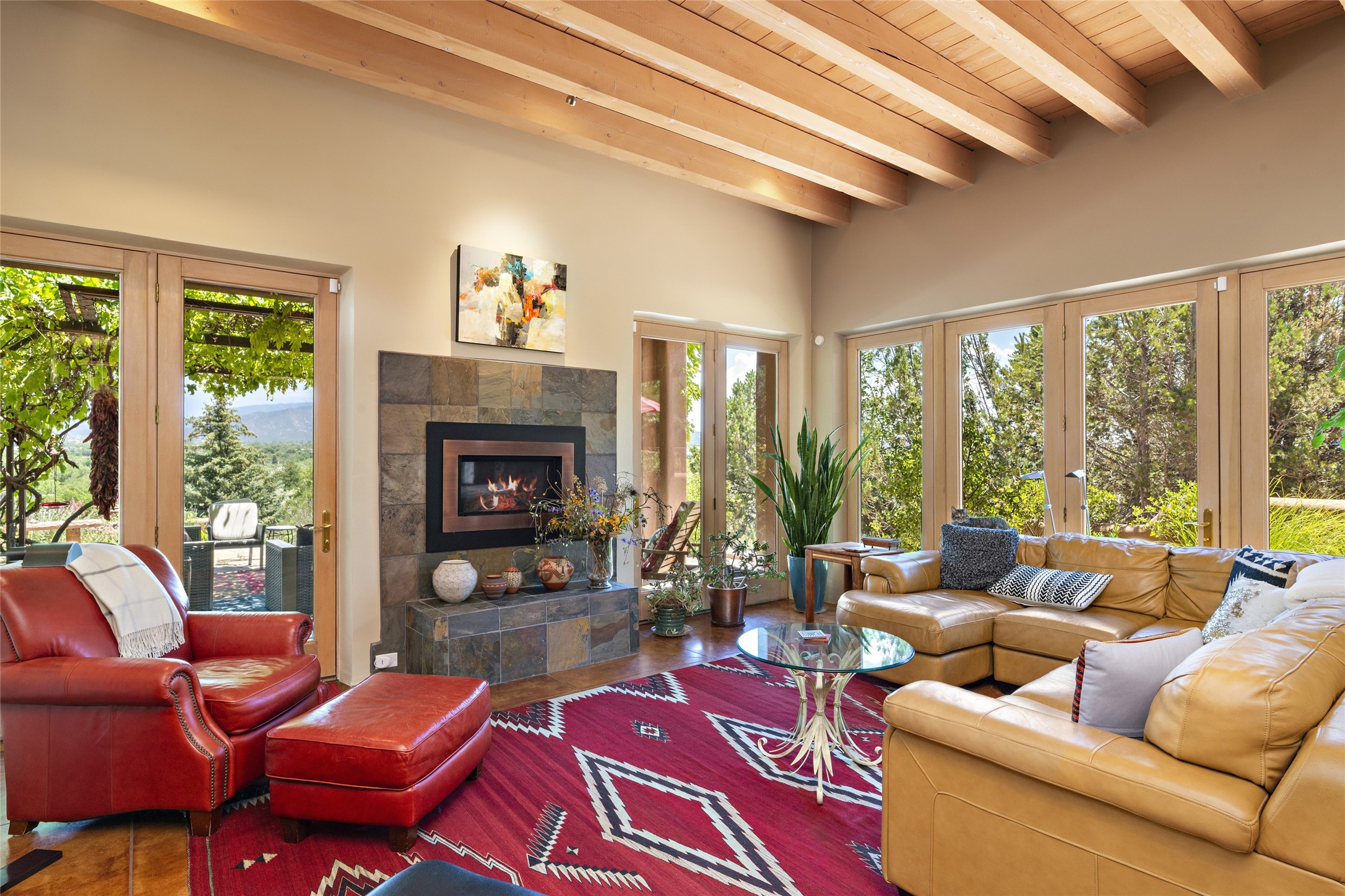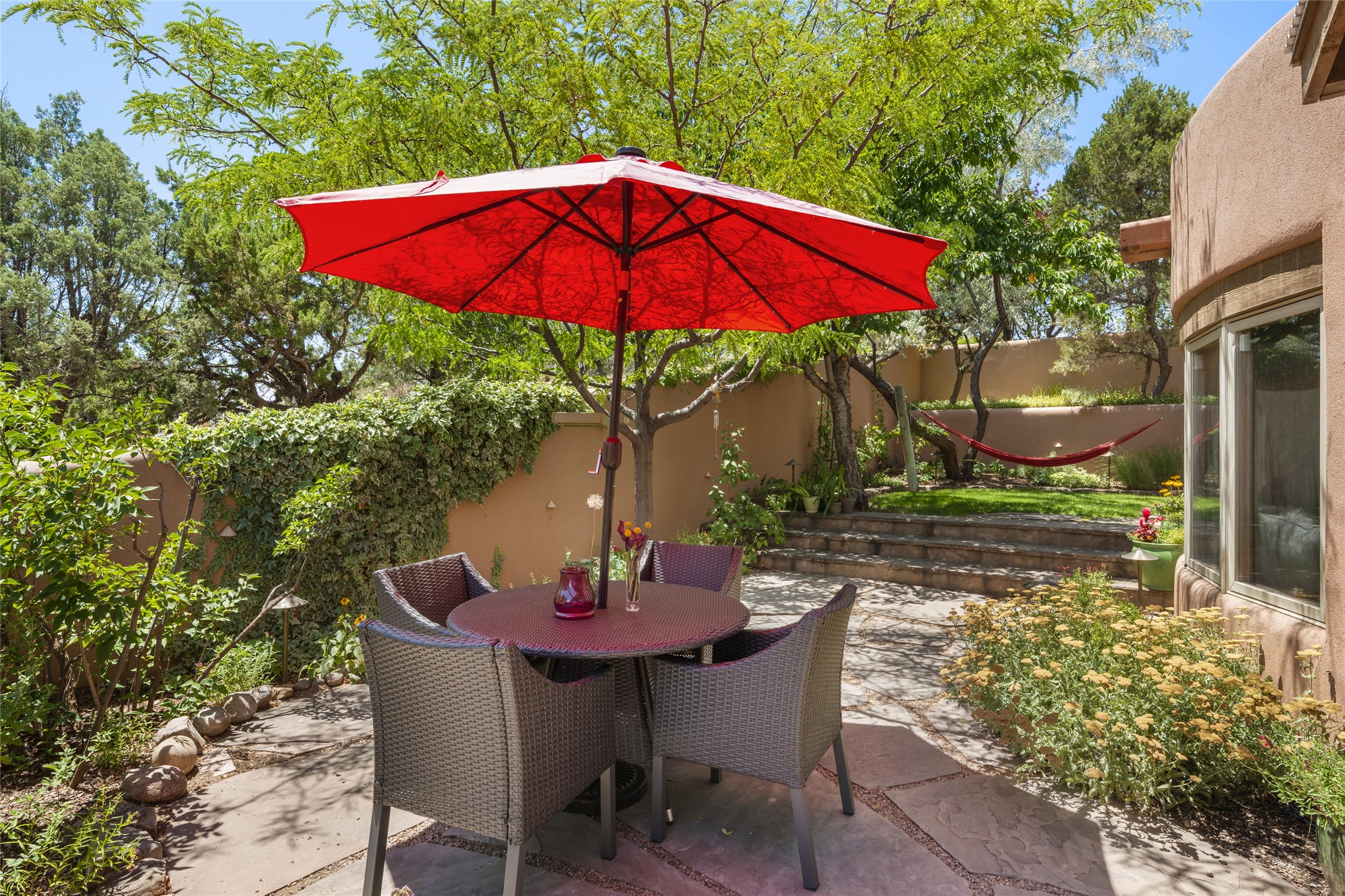 Hold your breath! You will be awed by the views, and enchanted by the gardens of this delightful, in-town property. The house was built by Michael Hurlocker, a Santa Fe builder, as his personal residence. He is well-known for his dedication to high quality design and construction. The light-filled interior is of gracious, ample proportions with many French doors leading to the gardens. Truly a home for easy living and entertaining in the spacious living and dining areas. The room-sized outside portal is pure magic, with grape and wisteria vines overhead and a view to the Sangre de Cristo Mountains to the east. A comfortable bay window seat graces the well-designed kitchen which has lots of counter space and cabinets. The primary suite is quietly situated at the top of the house, with large bedroom and splendid view deck, roomy bathroom and super-big walk-in closet. Two guest bedrooms both have French doors to the outside and are separately located from the main bedroom suite. One is currently used as a studio. And now for the bonus features - A home office with double doors in the main core of the house and a large storage room off the oversized, two-car garage. Landscape lighting has recently been installed and the gardens are on drip and sprinkler irrigation. Conveniently located in Las Lomas subdivision on 0.54 acres, this home is a delight, as also seen in the magical evening photographs!